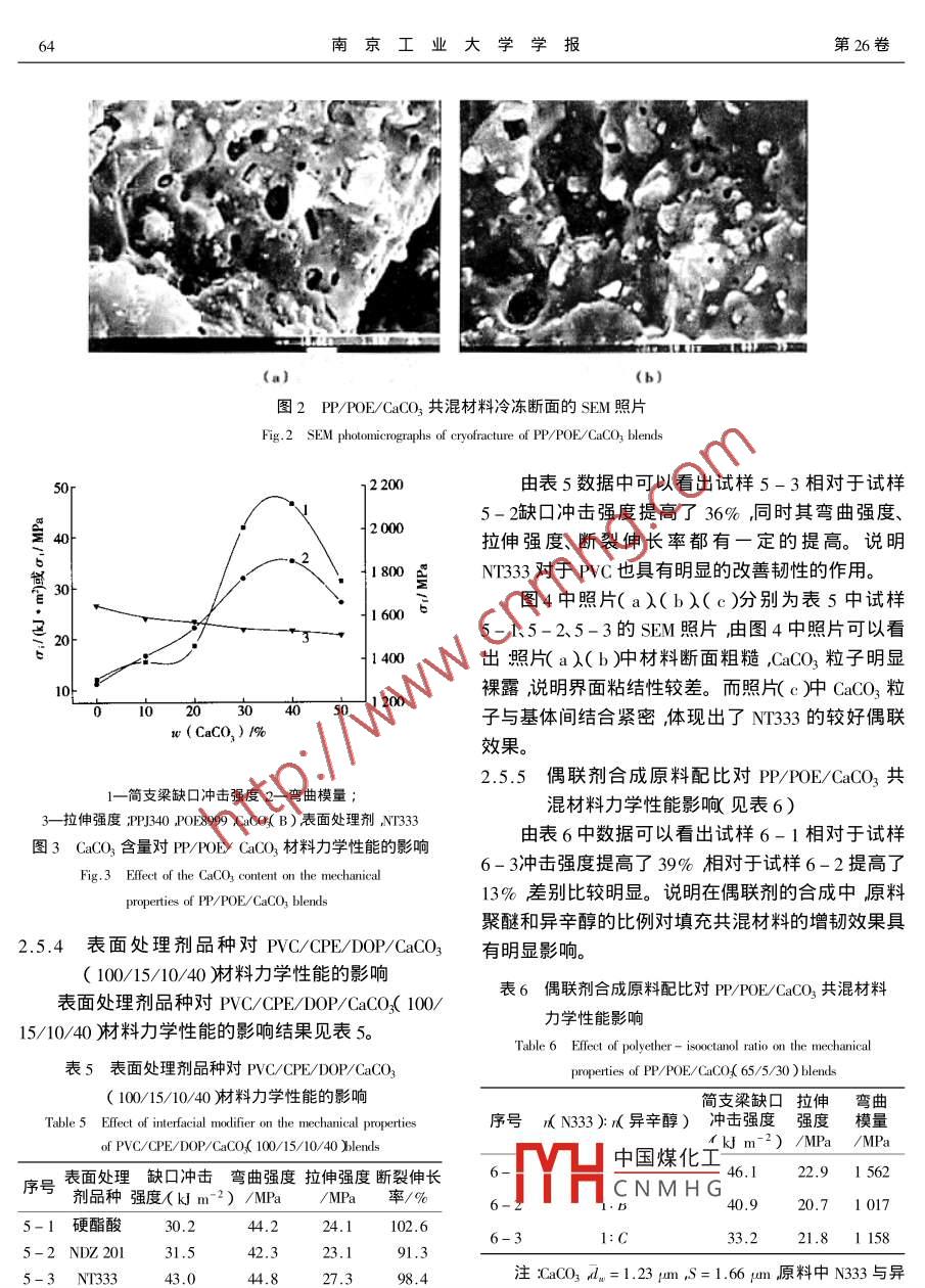 第26卷第6期南京工業(yè)大學(xué)學(xué)報(bào)Vol. 26 No.62004年11月JOURNAL OF NANJING UNIVERSITY OF TECHNOLOGYNov. 2004聚醚鈦酸酯合成及其對(duì)聚烯烴/CaCO3力學(xué)性能影響朱鳳娥宋艷江張?jiān)茽N(南京工業(yè)大學(xué)材料科學(xué)與工程學(xué)院江蘇南京210009)摘要:將一定比例聚醚和異辛醇相混合 采用傳統(tǒng)的Moor等反應(yīng)方法制得了具有不同相對(duì)分子質(zhì)量的聚醚基異辛基焦磷酸酯再與鈦酸異丙酯反應(yīng)獲得異丙基三(聚醚基異辛基焦磷酰氧基)鈦酸酯。經(jīng)此偶聯(lián)劑處理的CaCO3對(duì)于HDPE/CaCO3和PP/POE/CaCO3材料具有明顯增韌、增強(qiáng)作用。對(duì)PVC/CPE/DOP/CaCO3材料也具有明顯改善韌性的作用。經(jīng)SEM測(cè)定表明經(jīng)此偶聯(lián)劑處理的CaCO3與聚合物基體間的界面較模糊。偶聯(lián)劑中聚醚取代基的相對(duì)分子質(zhì)量和合成原料中聚醚與異辛醇的比例對(duì)材料增韌效果具有重要影響。關(guān)鍵詞:聚醚基鈦酸酯偶聯(lián)劑;HDPE ;PP PVC ;CaCO3增韌*中圖分類號(hào):TQ327.8文獻(xiàn)標(biāo)識(shí)碼:A文章編號(hào): 1671- 7643( 2004 )04 -0061 - 06近年來(lái)采用無(wú)機(jī)填料粒子增韌、增強(qiáng)聚合物以提高聚合物材料的缺口沖擊韌性、彎曲模量并降低材料制造成本已經(jīng)成為人們普遍關(guān)注的課題12。在此種改性方法中,無(wú)機(jī)填料粒子的表面特性及其1.1 主要原料在材料中的界面狀況至關(guān)重要。對(duì)此目前較為普遍聚醚N204(相對(duì)分子質(zhì)量為376 )聚醚N220的方法是采用硅烷、鈦酸酯、鋁酸酯等偶聯(lián)助劑或其(相對(duì)分子質(zhì)量為1750和聚醚N333(相對(duì)分子質(zhì)量它極性小分子物質(zhì)對(duì)填料進(jìn)行表面處理,以改善無(wú)為3 360 )為金陵石化公司塑料廠產(chǎn)品聚醚N330(相機(jī)填料粒子與聚合物的親和性。根據(jù)報(bào)導(dǎo)采用偶對(duì)分子質(zhì)量為4770 )為天津石化公司化工三廠產(chǎn)聯(lián)劑與反應(yīng)性彈性體齊聚物復(fù)合處理無(wú)機(jī)填料表面品鈦酸異丙酯和鈦酸酯偶聯(lián)劑NDZ201為南京曙可以較好地改善填充材料的界面粘結(jié)性緩沖材料光化工廠產(chǎn)品。P2Os 為工業(yè)級(jí);異辛醇為試劑級(jí)。成型冷卻收縮應(yīng)力,起到較好的增韌、增強(qiáng)作聚丙烯PPJ340 ,MI為每10 min 1.65 g高密度用3-6。然而在此類處理方法中反應(yīng)性彈性體齊聚聚乙烯HDPE5000S MI為每10 min 1.1 g為揚(yáng)子石物的種類、相對(duì)分子質(zhì)量及其反應(yīng)活性對(duì)增韌、增強(qiáng)油化工股份有限公司產(chǎn)品;乙烯-辛烯共聚物效果的影響很大35]選擇較為困難。因此,如在偶POE8999 ,MI為每10 min0.5 g ,為杜邦陶氏公司產(chǎn)聯(lián)劑合成過(guò)程中將與彈性體型齊聚物結(jié)構(gòu)類似的品,PVC SG59為徐州潤(rùn)博電化有限公司產(chǎn)品。柔性鏈型齊聚物與之反應(yīng),合成出一種柔性鏈型偶重質(zhì)超細(xì)研磨碳酸鈣:CaCO,( A ) ,平均顆粒直聯(lián)助劑用于改性填料表面增韌、增強(qiáng)聚合物是值徑d.=1.36 pm粒徑分布標(biāo)準(zhǔn)離差s=2.96 pum;得研究的問(wèn)題。CaCOL B):dw=1.23 pum ,S=1.66 μm工業(yè)級(jí)。.本文采用不同相對(duì)分子質(zhì)量的聚醚作為柔性鏈1.2 實(shí)驗(yàn) 方法型齊聚物將其與P2Os和鈦酸異丙酯反應(yīng),合 成出1.2.1 偶聯(lián)劑的合成及產(chǎn)物表征-種聚醚基鈦酸酯偶聯(lián)劑并且研究了此類助劑處反應(yīng)分兩步進(jìn)行:第一步采用傳統(tǒng)的Moor理超細(xì)CaCO3后對(duì)HDPE/CaCO3、PP/POE/CaCO3和中國(guó)煤化呈種的聚醚按一 定配比PVC/CPE/CaCO3材料力學(xué)性能的影響?;旆磻?yīng)即得到聚醚基異辛基YHCNMH導(dǎo)聚醚基異辛基焦磷酸.酯與鈦酸異丙酯反應(yīng)即得最終產(chǎn)物異丙基三(聚醚收稿日期20元10-30作者簡(jiǎn)介架鳳嫩1978- )女山東菏澤人碩士生主要研究方向?yàn)閺?fù)合材料的加工改性。62南京工業(yè)大學(xué)學(xué)報(bào)第26卷基異辛基焦磷酰氧基)鈦酸酯。根據(jù)聚醚品種N204 ,N220 ,N333 和N330的不同將所得最終產(chǎn)物分其中R為:一-CH2- -CH2- 或:一-CH2- -CH-別編號(hào)為NT204 ,NT220 ,NT333 和NT330。CH2聚醚基異辛基焦磷酸酯產(chǎn)物的轉(zhuǎn)化率測(cè)定:利其分子結(jié)構(gòu)中聚醚取代基和異辛醇取代基所占比例用酸堿滴定法測(cè)定產(chǎn)物焦磷酸酯的酸值并與理論酸由反應(yīng)物中原料配比決定。值比較故第-步反應(yīng)轉(zhuǎn)化率=產(chǎn)物實(shí)測(cè)酸值理論2.2原料配比對(duì)反應(yīng)轉(zhuǎn)化率的影響酸值。原料配比對(duì)反應(yīng)轉(zhuǎn)化率的影響結(jié)果見(jiàn)表1。鈦含量的測(cè)定:利用灼燒法將終產(chǎn)物在600 ~表1原料配比對(duì)反應(yīng)轉(zhuǎn)化率的影響650C灼燒1h根據(jù)殘留物質(zhì)量計(jì)算產(chǎn)物中的鈦含Table 1 Effect of composition of reaction mixture量[8]。on the percentage of conversion將原料、中間體及產(chǎn)物偶聯(lián)劑分別涂覆于KBr第一步反應(yīng)轉(zhuǎn)化率序號(hào)r( N33):n(異辛醇)鹽片上,FTTR550型(美國(guó)Nicolet 公司)紅外光譜儀/%分析。1-11:A67.71-21:B79.91.2.2 CaCO3表面處理1- 3.1:C107采用干法處理CaCO3 ,將偶聯(lián)劑及其它助劑按注反應(yīng)溫度55 C反應(yīng)時(shí)間8h,原料N333與異辛醇配方要求混勻,然后直接加入預(yù)先加熱干燥過(guò)的配比中A、B