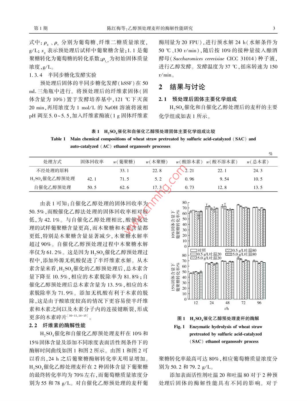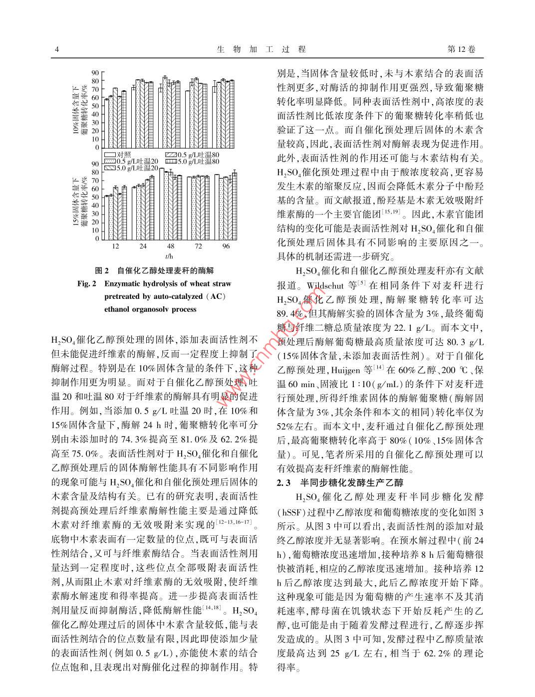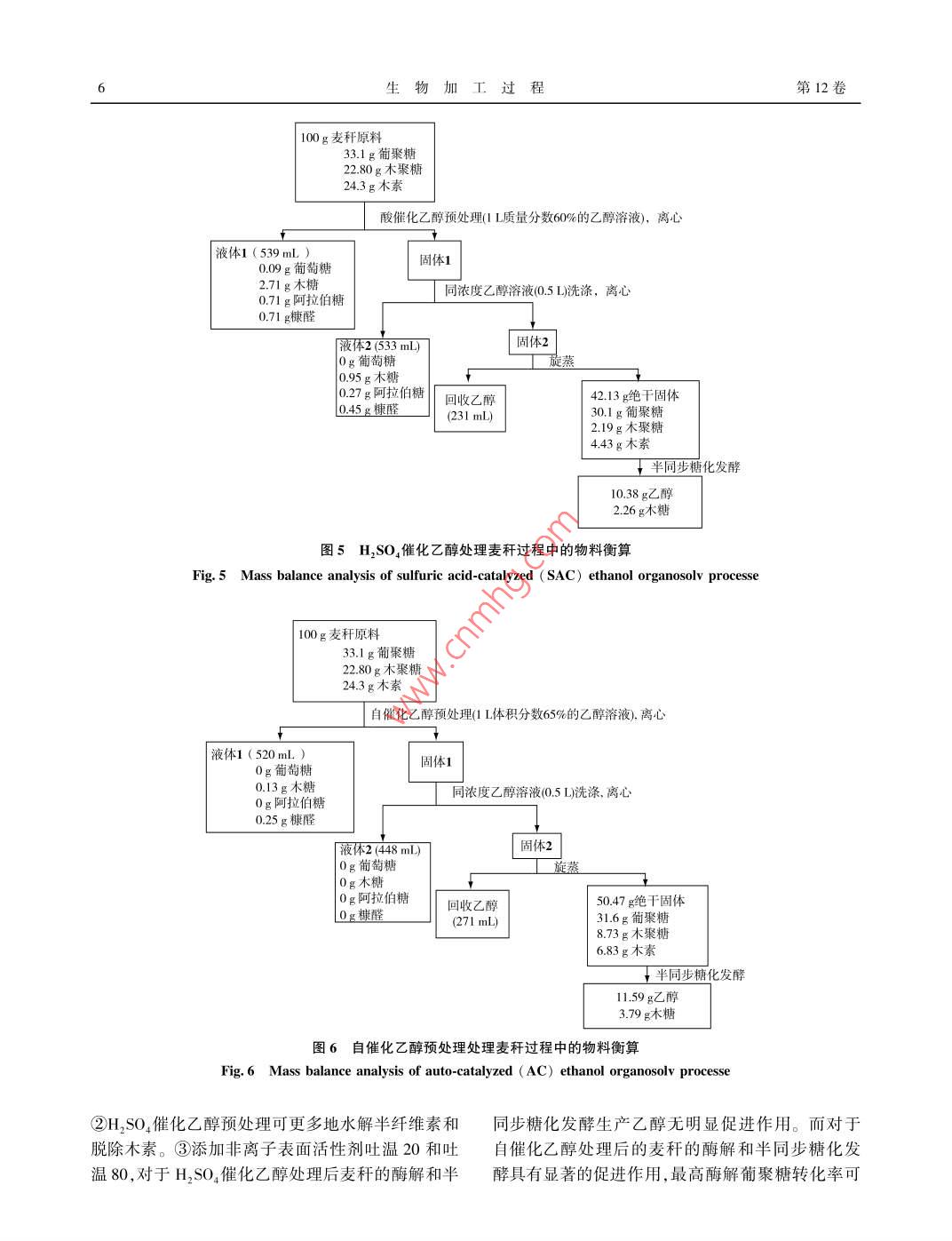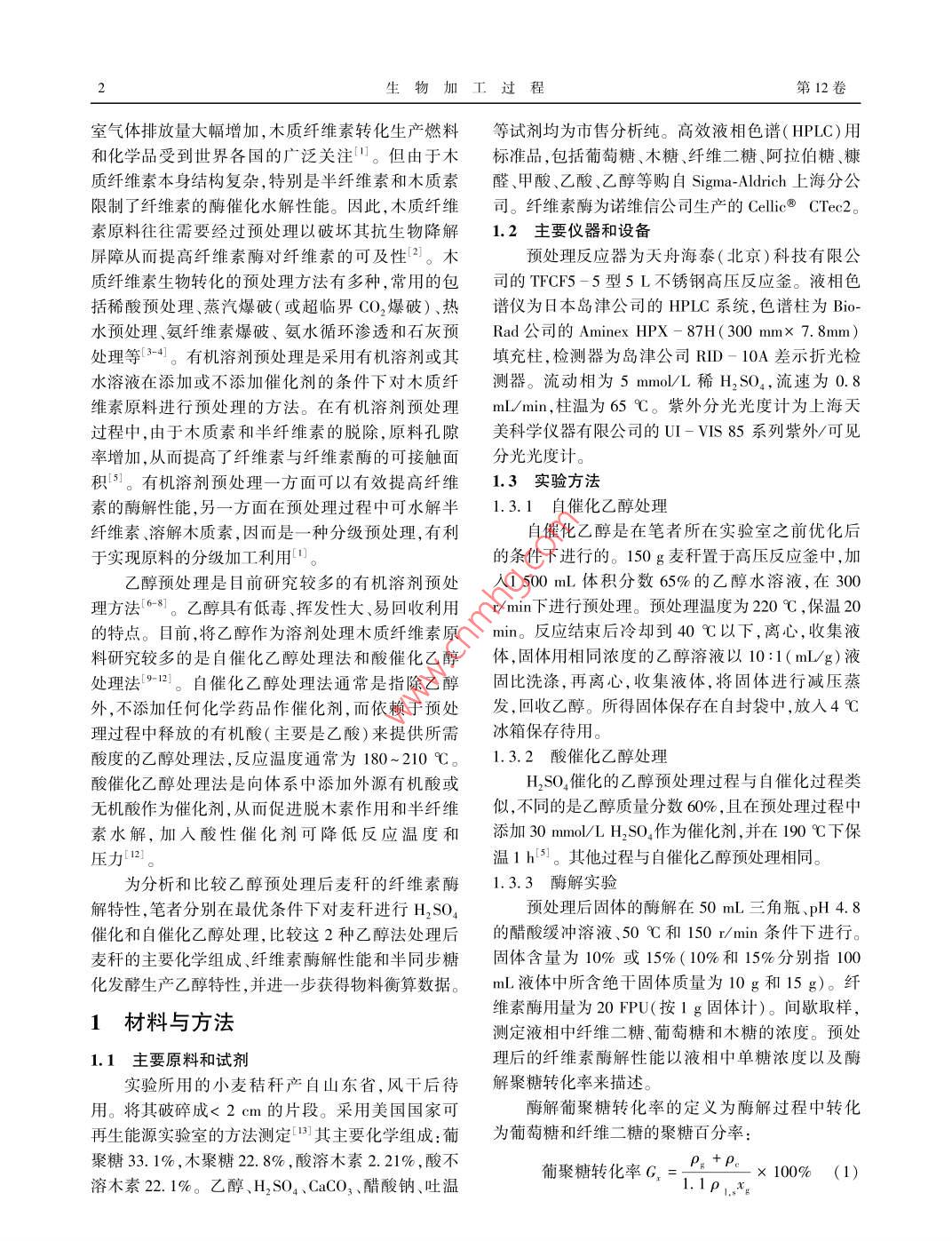 第12卷第1期生物加工過程Chinese Journal of Bioprocess EngineeringJan.2014doi:10.3969/j.isn.l672-3678.2014.01.001乙醇預(yù)處理麥稈的酶解性能研究陳紅梅,趙雪冰,劉德華(清華大學(xué)化工系應(yīng)用化學(xué)研究所,北京100084)摘要:采用H2SO催化和自催化乙醇法對麥稈進(jìn)行預(yù)處理,比較預(yù)處理后麥稈的主要化學(xué)組成、纖維素酶解性能和半同步糖化發(fā)酵生產(chǎn)乙醇特性,并進(jìn)行物料衡算。結(jié)果表明:HSO催化和自催化乙醇預(yù)處理過程中纖維素固體收率大于90%。添加非離子表面活性劑吐溫20和吐溫δ0沒有顯著提高HSO催化乙醇預(yù)處理后纖維素的酶解茼笥糖得率及半同步糖化發(fā)酵過程中♂醇的產(chǎn)量,而對自催化乙醇處理后麥稈的酶解和半冏步糖化發(fā)酵過程有定程度的促進(jìn)作用,相應(yīng)的酶解葡聚糖轉(zhuǎn)化率由72.7%提高到85.0%,而半冋步糖化發(fā)酵過程中乙醇質(zhì)量濃度提高了11.4%。物料衡算結(jié)果表明:酸催化和自催化乙醇預(yù)處理后萄聚糖回收率分別為9.0%和95.4%;半同步糖化發(fā)酵生產(chǎn)乙醇的得率分別為10.4和11.6g(按100g原料計(jì))關(guān)鍵詞:有機(jī)溶劑預(yù)處理;麥稈;酶解;半同步糖化發(fā)酵中圖分類號:TQ353文獻(xiàn)標(biāo)志碼:A文章編號:1672-3678(2014)01-0001-07Enzymatic digestibility of ethanol pretreated wheat strawCheN Hongmei. ZHAO Xuebing. LIU DehuaInstitute of Applied Chemistry, Department of Chemical Engineering, Tsinghua University, Beijing 100084, China)Abstract: Wheat straw was pretreated by sulfuric acid-catalyzed(SAC) and auto-catalyzed(AC) ethanolorganosolv processes. The main chemical compositions, cellulose digestibility and ethanol production byhemi-simultaneous saccharification and fermentation hSSF of pretreated solids were comparedthat SAC and AC pretreatments recovered more than 90% of cellulose as sophase. Addition of non-ionic surfactants Tween 20 and Tween 80 did not significantly improve theenzymatic digestibility and ethanol production of SAC-pretreated wheat straw. However, they showed somepositive effects on AC-pretreated wheat straw, with the corresponding enzymatic glucan conversionincreased from 72. 7%o to 85. 0%0 and ethanol concentration increased by 11. 4%0. Material balanceanalysis showed that glucan recoveries, as a solid phase, were 91.0% and 95. 4% for SAC and ACpretreatments, respectively. Corresponding ethanol yields were 10. 4 and 11.6 g per 100 g raw materialduring SSF process, respectively.Key words: organosolv pretreatment; wheat straw; enzymatic hydrolysis; hemi-simultaneoussaccharification and fermentation木質(zhì)纖維素是一種產(chǎn)量豐富、來源廣泛、廉價的可再生資源。近些年來,由于化石資源短缺和溫收稿日期:2013-11-22基金項(xiàng)目:國家重點(diǎn)基礎(chǔ)研究發(fā)展計(jì)劃(973計(jì)劃)(20CB707406)作者簡介:陳紅梅(1988—),女,江西贛州人,博士研究生,研究方向:木質(zhì)纖維素生物煉制;趙雪冰(聯(lián)系人),助理研究員,Eml: zhaoxu@生物加工過程第12卷室氣體排放量大幅增加,木質(zhì)纖維素轉(zhuǎn)化生產(chǎn)燃料等試劑均為市售分析純。高效液相色譜(HPLC)用和化學(xué)品受到世界各國的廣泛關(guān)注。但由于木標(biāo)準(zhǔn)品,包括葡萄糖、木糖、纖維二糖、阿拉伯糖、糠質(zhì)纖維素本身結(jié)構(gòu)復(fù)雜,特別是半纖維素和木質(zhì)素醛、甲酸、乙酸、乙醇等購自 Sigma- Aldrich上海分公限制了纖維素的酶催化水解性能。因此,木質(zhì)纖維司。纖維素酶為諾維信公司生產(chǎn)的 Ellice Ctec2。素原料往往需要經(jīng)過預(yù)處理以破壞其抗生物降解1.2主要儀器和設(shè)備屏障從而提高纖維素酶對纖維素的可及性2。木預(yù)處理反應(yīng)器為天舟海泰(北京)科技有限公質(zhì)纖維素生物轉(zhuǎn)化的預(yù)處理方法有多種,常用的包司的TFCF5-5型5L不銹鋼高壓反應(yīng)釜。液相色括稀酸預(yù)處理、蒸汽爆破(或超臨界CO爆破)、熱譜儀為日本島津公司的HPLC系統(tǒng),色譜柱為Bio-水預(yù)處理、氨纖維素爆破、氨水循環(huán)滲透和石灰預(yù)Rad公司的 Aminex hpx-87H(300mmx7.8mm)處理等3-。有機(jī)溶劑預(yù)處理是采用有機(jī)溶劑或其填充柱,檢測器為島津公司RD-10A差示折光檢水溶液在添加或不添加催化劑的條件下對木質(zhì)纖測器。流動相為5mmol/L稀H2SO4,流速為0.8維素原料進(jìn)行預(yù)處理的方法。在有機(jī)溶劑預(yù)處理mL/min,柱溫為65℃。紫外分光光度計(jì)為上海天過程中,由于木質(zhì)素和半纖維素的脫除,原料孔隙美科學(xué)儀器有限公司的UI-VS85系列紫外/可見率增加,從而提高了纖維素與纖維素酶的可接觸面分光光度計(jì)。積5。有機(jī)溶劑預(yù)處理一方面可以有效提高纖維1.3實(shí)驗(yàn)方法素的酶解性能,另一方面在預(yù)處理過程中可水解半1.3.1自催化乙醇處理纖維素、溶解木質(zhì)素,因而是一種分級預(yù)處理,有利自催化乙醇是在筆者所在實(shí)驗(yàn)室之前優(yōu)化后于實(shí)現(xiàn)原料的分級加工利用的條件下進(jìn)行的。150g麥稈置于高壓反應(yīng)釜中,加乙醇預(yù)處理是目前研究較多的有機(jī)溶劑預(yù)處人1500mL體積分?jǐn)?shù)65%的乙醇水溶液,在300理方法8。乙醇具有低毒、揮發(fā)性大、易回收利用r/min下進(jìn)行預(yù)處理。預(yù)處理溫度為220℃,保溫20的特點(diǎn)。目前,將乙醇作為溶劑處理木質(zhì)纖維素原min。反應(yīng)結(jié)束后冷卻到40℃以下,離心,收集液料研究較多的