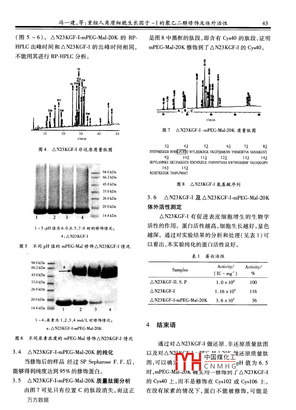 第26卷 第4期重慶理工大學(xué)學(xué)報(bào)(自然科學(xué))2012年4月Vol.26No.4Jourmal of Chongqing University of Technology( Natural Science)Apr. 2012重組人角質(zhì)細(xì)胞生長(zhǎng)因子-I的聚乙二醇修飾及體外活性馮一建',陳勇”,張?jiān)鰸?黃 程',李紅亮',胡春蘭”,范 開(kāi)',2(1.重慶理工大學(xué)藥學(xué)與生物工程學(xué)院,重慶400054 ;2.重慶富進(jìn)生物醫(yī)藥有限公司,重慶400041)摘要:研究大腸桿菌表達(dá)的重組人角質(zhì)細(xì)胞生長(zhǎng)因子-I型N端缺失突變體( ON23KGF-I)的mPEG-馬來(lái)酰亞胺( mPEG-maleimide、mPEG-Mal)修飾 工藝及修飾位點(diǎn)和初步體外生物活性。首先修飾得到聚乙二醇化的ON23KGF-I,然后對(duì)ON23KGF-I作還原和非還原質(zhì)量肽圖,確定其各肽段,對(duì)ON23KGF-I-m PEG-Mal-20K做還原質(zhì)量肽圖,確定修飾位點(diǎn)。最后,通過(guò)BAF-3細(xì)胞對(duì)O N23KGF-I國(guó)際標(biāo)準(zhǔn)品、ON23KCF-I、ON23KGF-I-m PEG-Mal-20K測(cè)活。結(jié)果表明,在尿素環(huán)境下,mPEG-MAI被均一修飾在ON23KGF-I的Cys40位。與國(guó)際活性標(biāo)準(zhǔn)品相比,ON23KGF-I的活性保留了116%, △N23KGF-I-m PEG-Mal-20K 的活性保留了36%。關(guān)鍵詞:重組人角質(zhì)細(xì)胞生長(zhǎng)因子;質(zhì)量肽圖;聚乙二醇修飾中圖分類(lèi)號(hào):Q78文獻(xiàn)標(biāo)識(shí)碼:A文章編號(hào):1674 - 8425(2012)04 - 0040 - 05Study on PEGylation of Recombinant Keratinocyte GrowthFactor-I and Activity in vitroFENG Yi-jian' ,CHEN Yong2 ,ZHANG Zeng- tao',HUANG Cheng',LI Hong-liang' , HU Chun-lan2, FAN Kail2(1. School of Pharmaceutical and Biological Engineering, Chongqing University of Technology ,Chongqing 400054, China; 2. Chongqing Fagen Biopharmaceutical Co. Ltd. , Chongqing 400041, China)Abstract : The research studied the PEGylation of mPEG -maleimide( mPEC -Mal ) of recombinant ke-ratinocyte growth factor-I mutant deleted on N-terminus( O N23KGF-I) expressed in E. coli, and i-dentified the modified site and preliminary biological activity in vitro. Firstly, get the Pegylated0N23KGF-I; Then, identify all the segments of the peptide by the reduced and non- reduced peptidemass mapping ( PMM). Next, identify the modifed site of △23 KCF-I-mPEG-Mal-20K by the reduced中國(guó)煤化工收稿日期:2012-01 -15基金項(xiàng)目:國(guó)家科技重大專(zhuān)項(xiàng)資助項(xiàng)目( 2012ZX09103MYHCNMH G科學(xué)基金資助項(xiàng)目(CSTC207BB5412)作者簡(jiǎn)介:馮- -建( 1986- -) ,男,碩士研究生,主要從事微生物與生化藥學(xué)研究;通訊作者范開(kāi)(1963- -) ,男,教授,碩士生導(dǎo)師,主要從事細(xì)胞生物學(xué)和腫瘤學(xué)研究。馮一建,等:重組人角質(zhì)細(xì)胞生長(zhǎng)因子-I的聚乙二醇修飾及體外活性41PMM. Lastly, measure the activity of AN23KGF- I international standard product, AN23KGF-I,ON23 KGF-I-mPEG-Mal-20K with BAF-3 cell line. And mPEG-Mal-20K is modified uniformly onCys40 when urea exists. In contrast to ON23 KGF-I international standard product, the activity ofAN23KGF-I keeps about 116%,and the AN23 KGF-I-m PEG-Mal-20K keeps about 36%.Key words : keratinocyte growth factor; peptide mass mapping( PPM) ; PEGylation人角質(zhì)細(xì)胞生長(zhǎng)因子( keratinocyte growth fac-tor, KGF)是具有肝素結(jié)合特性的成纖維細(xì)胞生長(zhǎng)1 儀器與材料因子( fibroblast growth factor , FGF)家族中的一員,分為KGF-I(FGF-7)和KGF-II ( FGF-10)2種亞2487型高效液相色譜系統(tǒng)與紫外檢測(cè)器型。成熟的KGF-I由163個(gè)氨基酸組成,包括( Waters); ESI-Q-TOF micro 型質(zhì)譜儀及Massl-位于1.15.40、102和106位的5個(gè)半胱氨酸殘基。ynx4. 0液質(zhì)聯(lián)用分析軟件( Waters) ;AKTA Purifier天然的KGF-I不穩(wěn)定,在溫和的溫度下也容易聚純化系統(tǒng)(GE Health); 色譜柱SC300A C8(4. 6合。已經(jīng)證實(shí)KGF-I的N端23個(gè)氨基酸殘基缺mm x 150 mm,5μm) ;ulimate° XB-C18(4. 6 mm x失后的截短形重組人KGF-I (以下稱(chēng)O N23KGF-250 mm ,5μm) ;半胱氨酸(分析純) ;胱氨酸(分析1)的穩(wěn)定性得到提高,同時(shí)體內(nèi)外生物學(xué)作用保純) ; mPEG-Mal-20K(北京鍵凱科技有限公司生產(chǎn)); Trypsin singles ( Sigma,貨號(hào)17575); 乙腈持不變[23]。在國(guó)外,經(jīng)大腸桿菌表達(dá)的△N23KGF-I(商品( Sigma ,色譜純) ;實(shí)驗(yàn)用水為Milli-Q超純水。名Kepivance)在臨床上用于腫瘤放療、化療后的BAF-3細(xì)胞株,齊魯制藥生產(chǎn)??谇徽衬p傷或粘膜炎的治療和保護(hù)。2方法△N23KGF-I的半衰期較短,約為4.5 h,需要在放療或化療前后連續(xù)給藥6 d,用藥量為60 μg/( kg2.1 ON23KGF-I 的重組制備●d)。為了實(shí)現(xiàn)延長(zhǎng)其體內(nèi)半衰期,進(jìn)--步降低大腸桿菌菌體經(jīng)IPTG誘導(dǎo)表達(dá)△N23KGF-I。免疫原性以及達(dá)到改6次連續(xù)給藥1次的目的,在檸檬酸三納/Tris的緩沖體系中,用常規(guī)的化學(xué)可以對(duì)ON23KGF-I進(jìn)行聚乙二醇修飾。0N23KGF-I的N末端是KGF發(fā)揮生物學(xué)作破菌法破菌,再用SP Sepharose F. F.純化,然后在用的重要區(qū)域,對(duì)ON23KGF-I的N末端進(jìn)行PEG△N23KGF-樣品中補(bǔ)加半胱氨酸-胱氨酸,摩爾濃修飾后其體外生物活性降低明顯,所以不能對(duì)度分別為10 mmol/L和1mmol/L,在pH值為8.0,30 C下反應(yīng)0.5 h,之后在含1 mmol/L的Tris透,△N23KGF-I進(jìn)行N末端修飾[4]。而0 N23KGF-I析液中透析復(fù)性過(guò)夜。用Heparin Sepharose6 F.含有17個(gè)賴(lài)氨酸殘基,對(duì)其定點(diǎn)修飾不能保證其F.含鹽洗脫復(fù)性樣品,再通過(guò)SDS-PAGE和RP