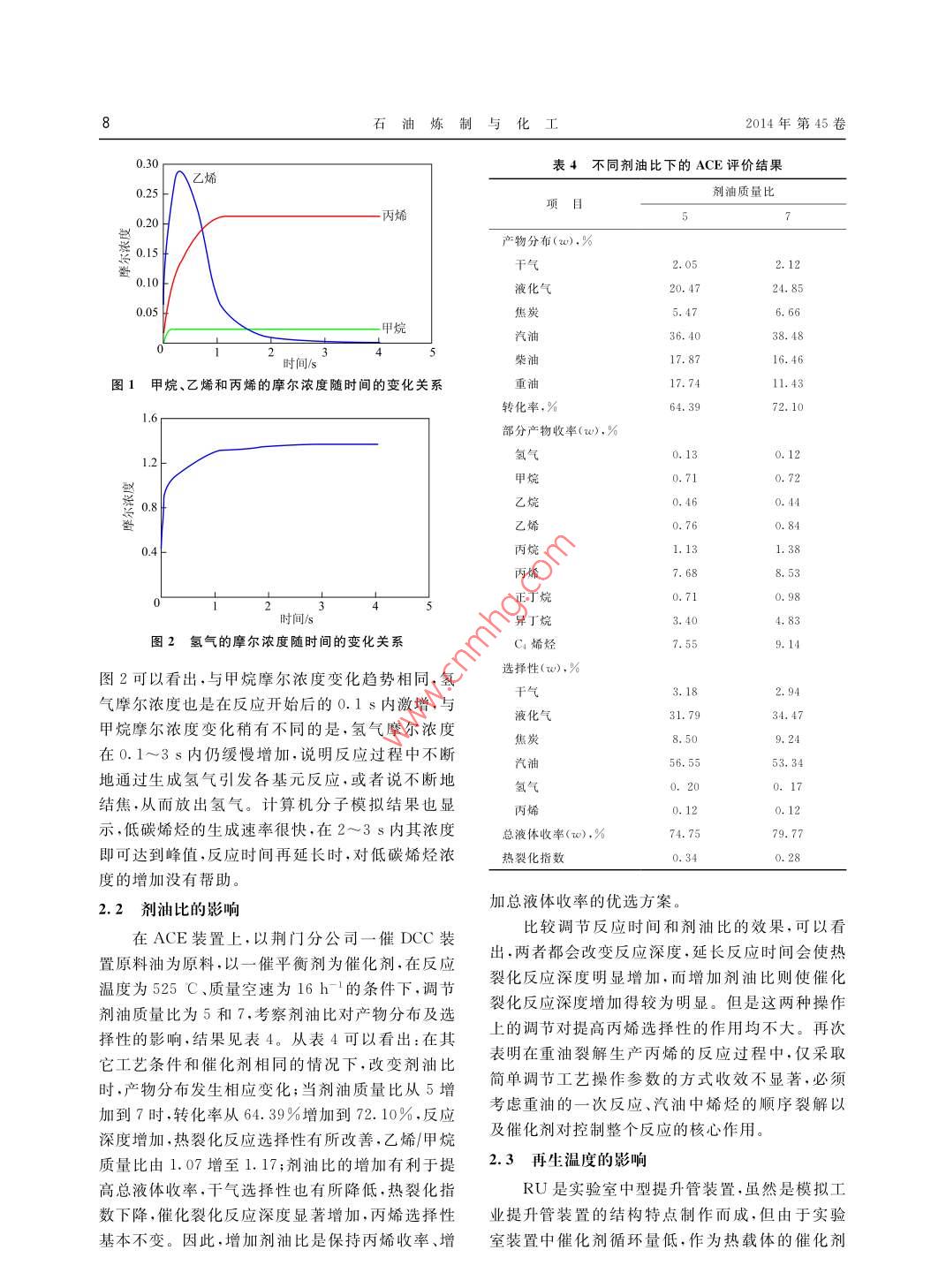 石油煉制與化工2014年3月基礎(chǔ)研究PETROLEUM PROCESSING AND PETROCHEMICALS第45卷第3期多產(chǎn)低碳烯烴工藝參數(shù)的變化對產(chǎn)品選擇性的影響許昀', 田輝平,劉宇鍵',朱亞東2(1.中國石化石油化工科學(xué)研究院,北京100083; 2.中國石化荊門分公司)摘要:針對中國石化荊門分公司現(xiàn)有兩套催化裂化裝置(- - 催和二催)的目的產(chǎn)品不同(一催多產(chǎn)低碳烯烴,二催保持較高的液體收率和汽油產(chǎn)率),希望通過調(diào)整工藝參數(shù)滿足要求。通過實(shí)驗(yàn)考察了反應(yīng)時(shí)間、劑油比和再生溫度對產(chǎn)物分布和選擇性的影響。結(jié)果表明:延長反應(yīng)時(shí)間,熱裂化反應(yīng)深度會顯著增加,干氣選擇性和氫氣產(chǎn)率明顯增加,熱裂化指數(shù)明顯上升;增加劑油比是保持丙烯收率、增加總液體收率的優(yōu)選方案;較高的初始油劑接觸溫度有利于低碳烯烴的生成,但如果以汽油、柴油為目的產(chǎn)物,則應(yīng)該適當(dāng)降低再生溫度和油劑的.初始接觸溫度,而不是降低反應(yīng)溫度。關(guān)鍵詞:低碳烯烴操作參數(shù)反應(yīng)時(shí)間劑油比再生溫度中國石化荊門分公司(簡稱荊門分公司)現(xiàn)有合油,催化劑為中國石化石油化工科學(xué)研究院(簡兩套催化裂化裝置。第一套催化裂化裝置(簡稱稱石科院)研發(fā)的多產(chǎn)低碳烯烴催化劑OEP-1.反-催)為DCC- II型,規(guī)模為0.8 Mt/a,由原1 Mt/a應(yīng)溫度為620C,考察高溫再生、小劑油比操作方蠟油催化裂化燒焦罐式高效再生裝置改造而來,案和低溫再生、大劑油比操作方案對產(chǎn)物分布和.主要特點(diǎn)為:①采用全提升管零床層反應(yīng)器,反應(yīng)選擇性的影響。溫度低于DCC-I型工藝,與常規(guī)FCC接近;②直2結(jié)果與討論立加長提升管,提升管停留時(shí)間為5s。第二套(簡稱二催)為重油催化裂化裝置,在原0.8 Mt/a重油2.1反應(yīng)時(shí)間的影響催化裂化裝置的基礎(chǔ)上改造而成,反應(yīng)時(shí)間為3s。在ACE裝置上.以荊門分公司一催DCC裝置兩套裝置反應(yīng)溫度均為530C,-.催采用高再生.原料油(性質(zhì)見表1)為原料,以一催平衡劑為催化溫度(700~710 C)、小劑油比(劑油質(zhì)量比為劑,在反應(yīng)溫度為525 C、劑油質(zhì)量比為7的條件6.5)操作方案,二催采用低再生溫度(660 ~下,通過改變空速來調(diào)節(jié)反應(yīng)時(shí)間,考察反應(yīng)時(shí)間670 C)、大劑油比(劑油質(zhì)量比為7)操作方案。對產(chǎn)物分布及選擇性的影響,結(jié)果見表2。從表2荊門分公司希望一.催多產(chǎn)低碳烯烴,二催保持高可以看出:在其它工藝條件和催化劑相同的情況液體收率和汽油產(chǎn)率,并且希望通過調(diào)整工藝操下,只改變空速(即反應(yīng)時(shí)間)時(shí),產(chǎn)物分布發(fā)生相作參數(shù)滿足上述要求。本課題在實(shí)驗(yàn)室考察了反應(yīng)變化;質(zhì)量空速從16 h-'降到5 h-'時(shí),反應(yīng)時(shí)應(yīng)時(shí)間、劑油比和再生溫度對產(chǎn)物選擇性的影響,.間相應(yīng)由1.6s 延長到5.0 s,轉(zhuǎn)化率從72. 1%增:以期為指導(dǎo)工業(yè)生產(chǎn)提供基礎(chǔ)數(shù)據(jù)。加到76.3%,增加了4.2百分點(diǎn),重油裂化能力增實(shí)驗(yàn)強(qiáng),隨著反應(yīng)時(shí)間的延長,反應(yīng)深度增加;但從產(chǎn)試驗(yàn)在ACE-MODEL R + Multi- Mode(簡稱物選擇性上看,隨反應(yīng)時(shí)間的延長,丙烯選擇性稍ACE)實(shí)驗(yàn)室小型評價(jià)裝置和小型提升管流化裂有增加,而熱裂化反應(yīng)深度增加得更為顯著,干氣化實(shí)驗(yàn)裝置(簡稱RU)上進(jìn)行。ACE試驗(yàn)原料油選擇性明顯增加,氫氣產(chǎn)率及選擇性亦增加近1倍,為荊門分公司一催DCC裝置原料油,催化劑為荊門收稿日期: 2013-07 10;修改稿收到日期: 2013-10-22。分公司- -催DCC裝置平衡劑,反應(yīng)溫度為525 C,主要考察劑油比和反應(yīng)時(shí)間對產(chǎn)物分布和選擇性作者簡介:許昀(1975- ).女,博士,高級工程師、從事催化裂化催化劑的研制與開發(fā)工作。的影響,劑油比分別為7和5,質(zhì)量空速分別為通訊聯(lián)系人:許昀,E mail:xuyun. ripp@ sinopec. com。4h-和16h-'。RU試驗(yàn)原料油為大慶VGO混基金項(xiàng)目:中國石油化工股份有限公司合同項(xiàng)目(106023)。第3期午昀,等.多產(chǎn)低碳烯烴工藝參數(shù)的變化對產(chǎn)品選擇性的影響7表1原料油性質(zhì)熱裂化指數(shù)(指產(chǎn)品中干氣與異構(gòu)C.烴的質(zhì)量項(xiàng)目數(shù)據(jù)比)明顯上升,總液體收率不但沒有增加,還稍有密度(20 C>)/(kg. m-3)920.3下降。由于DCC工藝專用催化劑含有擇形分子折射率(70 C)1. 4982篩,因此采用延長反應(yīng)時(shí)間來裂化汽油中的烯烴凝點(diǎn)/C2.四組分組成(w).%得到高丙烯收率的操作要非常慎重,需要選擇合飽和烴61.6適的反應(yīng)時(shí)間。芳烴26.0重油制低碳烯烴工藝的反應(yīng)溫度普遍高于膠質(zhì)11.4瀝青質(zhì)1.0普通FCC工藝,因此必須深入研究催化反應(yīng)和熱殘?zhí)?%3.14裂化反應(yīng)。石科院長期研究重油制低碳烯烴工黏度(80 C>)(mm2●s-1)18. 86藝04,認(rèn)為熱裂化反應(yīng)與催化裂化反應(yīng)一.樣,反相對分子質(zhì)量416w(堿性氮).%0.115應(yīng)過程復(fù)雜,且具有選擇性,并提出以產(chǎn)物中乙w0(碳),%86.48烯與甲烷的質(zhì)量比作為簡單的熱裂化選擇性衡w(氫),%12. 17量