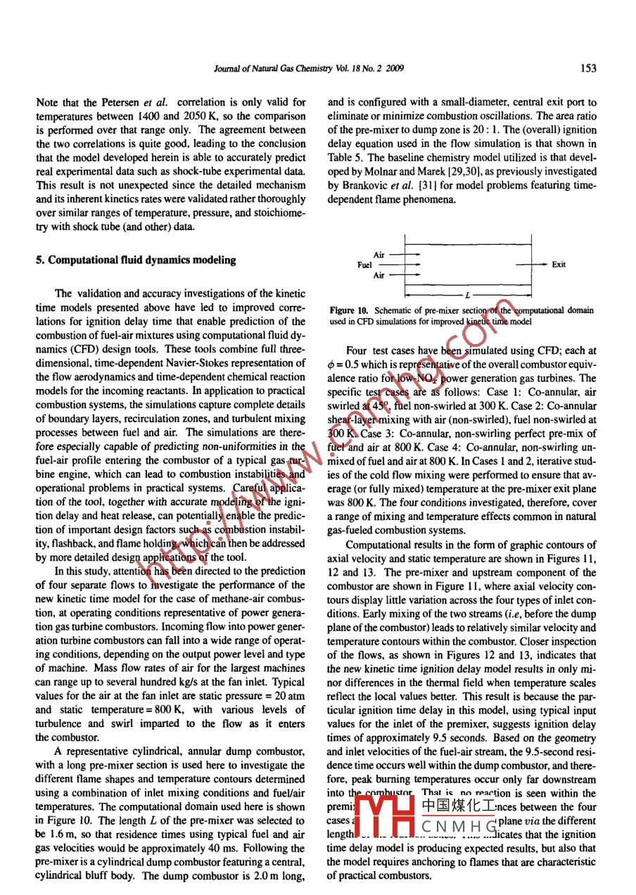0.98). The correlation re- Similarly, the oxygen concentration also slows down ignitionsults expressed in the fuel-to-air ratio form are summarized in at lean conditions but speeds up ignition at rich conditions,Table 4. Note that increasing f/a always has a retarding effect although to a larger degree than seen in the CHa exponent.on ignition(i.e, longer ignition delay times), particularly forTable 5. CH4/Air mixture ignition delay time correlations expressedthe fuel-rich casesas functions of the fuel-lean and -rich cases in the molefraction form. T is in seconds, P is in atm,T and (E/R)are in KTign=AXx. x xo, x P xexpIE/RT]zER(K)產(chǎn)2Lean227×10-80.1551434-0901205360990Rch413×10-1-0.187-2099-0.931200060985Overall 2.37x I00.1040030-0915202640987To investigate the validity and accuracy of the modelsesented herein, comparison to previous efforts would bebeneficial. Petersen et al. [46] presented a comprehensive correlation of ignition delay time data for similar con-ditions studied herein: temperatures(1400 to 2050 K), pres-sures(I to 480 atm), o(0.5 to 2.0); and concentrations up toCH4]=36×10-5 molem3,[O2]=3.6×10-5 mol/cm3,and[M]=3.6x10>molcm. The correlation is given by the folowing expression:Tigm=4.05e-5ICH4J033[O2]-1.05exp( 51.8/RT]Where Tign is the ignition delay time in seconds, the activationenergy(51.8 kcal/mol) is in kcal/ mol, and R is the universalo Fuel lean correlationgas constant. The overall pressure dependence is P-o.72.ThePetersen et al. [46] correlation was based on shock-tubeture ignition data. Figure 9 presents this studys overall corre-102101010310210lation in comparison to the Petersen et al. [46] correlationFigure 8. Fuel rich and fuel lean methane ignition delay time correlations(a)fuel rich,(b)fuel leano High-Tregion corelation nTable 4. CH,/Air mixture ignition delay time correlationsexpressed in the fuel-to-air ratio form. T is in seconds,P is in atm, T and (E/R)are in KAx(f/a)x P*xexpIE/RTIER(K0900205350104.19×10-90.238093119899Overall230×10900960915202640.987Additional correlations for methane ignition delay times中國煤化工are given in Table 5 as a function of mole fraction, temperature, and pressure for fuel-lean and-rich cases as in molnarCNMHG 1010 10and Marek [29, 30]. When this correlation is applied the re-F.(Petersen co. )(us)sults achieved are similar to the results obtained from the cor- Figure 9. This study's high-temperature region comelation in comparisonrelations in Table 4. It is for the user to decide which of thewith Petersen et al. correlation [46]Natural Gas Chemistry VoL 18 NoNote that the Petersen et al. correlation is only valid for and is configured with a small-diameter, central exit port totemperatures between 1400 and 2050 K, so the comparison eliminate or minimize combustion oscillations. The area ratiois performed over that range only. The agreement between of the pre-mixer to dump zone is 20: 1. The(overall)ignitionthe two correlations is quite good, leading to the conclusion delay equation used in the flow simulation is that shown inthat the model developed herein is able to accurately predict Table 5. The baseline chemistry model utilized is that develreal experimental data such as shock-tube experimental data. oped by Molnar and Marek [29, 301, as previously investigatedThis result is not unexpected since the detailed mechanism by Brankovic et al. [311 for model problems featuring time.and its inherent kinetics rates were validated rather thoroughly dependent flame phenomenaover similar ranges of temperature, pressure, and stoichiome-try with shock tube(and other)data5. Computational fluid dynamics modelingThe validation and accuracy investigations of the kinetictime models presented above have led to improved corre- Figure 10. Schematic of pre-mixer section of the computational domainlations for ignition delay time that enable prediction of the used in CFD simulations for improved kinetic time modelcombustion of fuel-air mixtures using computational fluid dnamics(CfD)design tools. These tools combine full three-Four test cases have been simulated using CFD; each atdimensional, time-dependent Navier-Stokes representation of o=0.5 which is representative of the overall combustor equivthe flow aerodynamics and time-dependent chemical reaction alence ratio for low-NO power generation gas turbines. Themodels for the incoming reactants. In application to practical specific test cases are as follows: Case 1: Co-annular,aircombustion systems, the simulations capture complete details swirled at 45 fuel non-swirled at 300 K Case 2: Co-annularof boundary layers, recirculation zones, and turbulent mixing shear-layer mixing with air(non-swirled), fuel non-swirled atprocesses between fuel and air. The simulations are there- 300 K Case 3: Co-annular, non-swirling perfect pre-mix offore especially capable of predicting non-uniformities in the fuel and air at 800 K. Case 4: Co-annular, non-swirling unfuel-air profile entering the combustor of a typical gas tur- mixed of fuel and air at 800 K In Cases l and 2, iterative studbine engine, which can lead to combustion instabilities and ies of the cold flow mixing were performed to ensure that avoperational problems in practical systems. Careful applica- erage(or fully mixed)temperature at the pre-mixer exit planetion of the tool, together with accurate modeling of the igni- was 800 K. The four conditions investigated, therefore, covertion delay and heat release, can potentially enable the predic- a range of mixing and temperature effects common in naturaltion of important design factors such as combustion instabil- gas-fueled combustion systemsity, flashback, and flame holding, which can then be addressedComputational results in the form of graphic contours ofby more detailed design applications of the toolxial velocity and static temperature are shown in Figures 11or In this study, attention has been directed to the prediction 12 and 13. The pre-mixer and upstream component of then