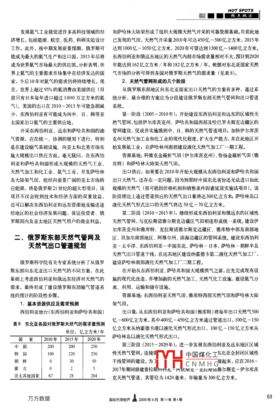 我點(diǎn)地區(qū)■■俄羅斯東部天然氣資源及天然氣管網(wǎng)規(guī)劃武冠軍張延萍編譯俄羅斯國立石油與天然氣大學(xué))(中國石油管道公司)摘要發(fā)展東西伯利亞和俄遠(yuǎn)東地區(qū)的油氣工業(yè)是俄羅斯2020年前能源戰(zhàn)略的重要組成部分。該地區(qū)天然氣資源豐富,且劫探程度相對(duì)不高。預(yù)計(jì)到2030年俄羅斯東部總的夭然氣儲(chǔ)量增長量將不少于12萬億立方米,其中,在東西伯利亞和薩哈共和國(西伯利亞地臺(tái))增長8萬億立方米,遠(yuǎn)東增長4萬億立方米。從東西伯利亞薩哈共和國、薩哈林島大陸架以管道和液化天然氣形式向亞太地區(qū)和美國太平洋沿岸出口的夭然氣在2020-2025年前可能達(dá)到800億一900億立方米/年,樂觀估計(jì)將達(dá)到1100億~1200億立方米/年。此外,東西伯利亞還將成為世界最大的氦氣生產(chǎn)地和出口地。餓21世紀(jì)的這一超大型建設(shè)碩目,需要巨大的投贇。俄羅斯科學(xué)院油氣地質(zhì)研究院的專家系統(tǒng)分析了俄東部天然氣岀口的多種方案,提岀了餓東部天然氣管網(wǎng)分三階段建設(shè)的實(shí)施方案關(guān)鍵詞俄羅斯東西伯利亞天然氣管道建設(shè)資源狀況勘探開發(fā)東西伯利亞陸地天然氣原始總資源量平均拗探程度為、俄羅斯東部天然氣資源情況及開釆現(xiàn)狀7.8%,遠(yuǎn)東地區(qū)為6.71%,海洋大陸架(拉普捷夫海、東西伯利亞海、楚科奇海、白令海、鄂霍茨克海、日本海)以俄羅斯東西伯利亞和遠(yuǎn)東地區(qū)的天然氣儲(chǔ)量主要集中在及太平洋東堪察加部分平均為4.92%。盡管勘探程度較低克拉斯諾雅爾斯克邊疆區(qū)(包括專區(qū))、薩哈共和國(雅庫但區(qū)域內(nèi)已經(jīng)發(fā)現(xiàn)了系列超大規(guī)模的天然氣田:埃文基自治特)、伊爾庫茨克州和薩哈林州。這些區(qū)域已證實(shí)儲(chǔ)量只占遠(yuǎn)專區(qū)的尤魯布琴一托霍莫油氣集中帶(尤魯布琴一托霍莫?dú)鈻|地區(qū)原始可采資源量的小部分,發(fā)現(xiàn)新的大天然氣田的可田和庫尤姆賓氣田)及索賓氣田;伊爾庫茨克州的科維克金能性非常高。北薩哈林含油氣區(qū)是鄂霍茨克海域資源和探明氣田和上浧瓊斯克氣田;薩哈共和國(雅庫特)的塔拉坎氣可采儲(chǔ)量最多的地區(qū),現(xiàn)有油氣田64個(gè)。北薩哈林邊界地帶田和恰揚(yáng)金氣田;薩哈林島大陸架的畢頓一阿斯托赫氣田發(fā)現(xiàn)了大批可工業(yè)開發(fā)的油氣資源(包括其大陸架和西堪察奧塔布圖海氣田、恰伊瓦氣田和倫斯基氣田(見表2)。加),大陸架區(qū)探明并經(jīng)評(píng)估的油氣儲(chǔ)量主要集中在幾個(gè)特根據(jù)薩哈林海洋石油公司科研設(shè)計(jì)院的研究,在遠(yuǎn)東海大型的氣田中。域做進(jìn)一步地質(zhì)勘探工作的基礎(chǔ)上還可以發(fā)現(xiàn)250多個(gè)油氣1.資源基礎(chǔ)群,可采儲(chǔ)量總計(jì)超過100億噸油氣當(dāng)量,當(dāng)然,這需要相在東西伯利亞和遠(yuǎn)東陸地和水域進(jìn)行的地質(zhì)勘探工作相當(dāng)數(shù)額的投資。目前,已發(fā)現(xiàn)油氣田的勘探和預(yù)開發(fā)工作的對(duì)較少,尋找油氣礦產(chǎn)還處于初期階段,可信度等級(jí)高的天投資就已達(dá)到250億美元左右。近年來在已發(fā)現(xiàn)油氣田(科然氣儲(chǔ)量在原始總資源量結(jié)構(gòu)中比例不大(見表1)維克金氣田、尤魯布琴一托霍莫?dú)馓锏?的補(bǔ)充勘探中增加根據(jù)俄羅斯科學(xué)院石油天然氣地質(zhì)研究院的評(píng)估,東西了相當(dāng)多的儲(chǔ)量。根據(jù)2003年出版的資料,經(jīng)過補(bǔ)充勘探,伯利亞及遠(yuǎn)東陸地和水域油氣原始可采資源量大約為850科維中國煤化工13萬5億立方米據(jù)俄羅億~900億噸油當(dāng)量,其中:石油200億~220億噸,伴生氣斯科CNMHG5,科維克金地區(qū)和其毗1.5萬億~2萬億立方米,氣田氣58萬億~61萬億立方米,鄰量不少于3萬億立方凝析油30億~50億噸米;尤魯布琴一托霍莫區(qū)域天然氣儲(chǔ)量約1.5萬億~2萬億2005年4月第13卷第4期正國際石油經(jīng)濟(jì)HOT SPOTS表1東西伯利亞和遠(yuǎn)東地區(qū)天然氣原始總資源量構(gòu)成單位:億立方米原始總資源量「探明可采儲(chǔ)量已評(píng)估儲(chǔ)量前景資源量勘探程度,%東西伯利亞和薩哈共和國(雅庫特)3318227487克拉斯諾雅爾斯克邊疆區(qū)(秦梅爾自治專區(qū))126286367610172.6克拉斯諾雅爾斯克邊疆區(qū)(埃文基自治專區(qū))7194克拉斯諾雅爾斯克邊疆區(qū)(自治專區(qū)外圍)伊爾庫茨克州薩哈共和國(雅庫特)1015121707844112.2東(陸地)1715馬加丹州楚科奇自治專區(qū)35078堪察加州481645903.3科里亞克自治專區(qū)薩哈林州(陸地)3620阿穆爾州哈巳羅夫斯克邊疆區(qū)濱海邊疆區(qū)大陸架1503107397包括薩哈林部分*數(shù)據(jù)統(tǒng)計(jì)時(shí)間截止到2002年1月1日表2東西伯利亞和遠(yuǎn)東地區(qū)大氣田儲(chǔ)量°單位:億立方米探明儲(chǔ)量地區(qū)氣田名稱已評(píng)估儲(chǔ)量總計(jì)占地區(qū)總數(shù),%克拉斯諾雅爾斯克邊疆區(qū)索賓氣田7.8(埃文基自治專區(qū))尤魯布琴一托霍莫?dú)馓锒爬锼姑鳉馓?032.8伊爾庫茨克州亞拉克金氣田科維克金氣田41.0塔斯一尤良赫斯氣田1027中巴杜奧賓氣田薩哈共和國(雅庫特)塔拉坎氣田恰揚(yáng)金氣田3797上維留恰氣田恰伊瓦氣田1139奧塔布圖海氣田薩哈