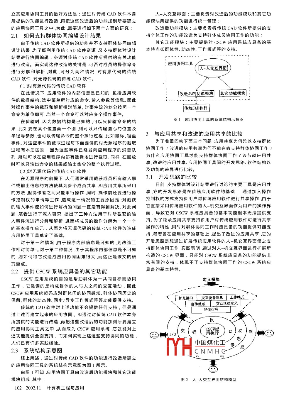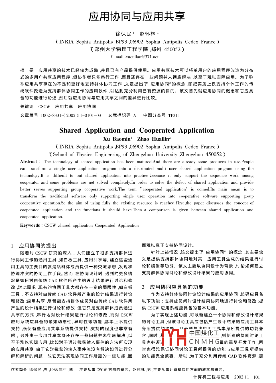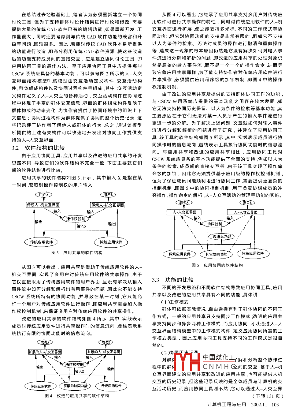 應(yīng)用協(xié)同與應(yīng)用共享徐保民1趙懷林2(INRIA Sophia Antipolis BP93 06902 Sophia Antipolis Cedex France(鄭州大學(xué)物理工程學(xué)院鄭州450052)E-mailxucuilan@@371.net摘要應(yīng)用共享的技術(shù)已經(jīng)較為成熟并且已有產(chǎn)品提供使用。應(yīng)用共享技術(shù)可以將單用戶的應(yīng)用程序改造為分布式的多用戶共享應(yīng)用程序但協(xié)作者只能串行工作而且還存在一些問題并未徹底解決,以至于難以實(shí)際應(yīng)用。為了彌補(bǔ)應(yīng)用共享存在的不足和更好地支持群體協(xié)同工作,文章提出了應(yīng)用協(xié)同”的概念即把實(shí)質(zhì)上僅支持個(gè)體工作的傳統(tǒng)軟件改造為支持群體協(xié)同工作的應(yīng)用軟件以達(dá)到充分利用已有資源旳目的。該文首先就應(yīng)用協(xié)同的概念和它應(yīng)具備的功能進(jìn)行論述然后就應(yīng)用協(xié)同與應(yīng)用共享之間的差異進(jìn)行比較。關(guān)鍵詞CSCW應(yīng)用共享應(yīng)用協(xié)同文章編號1002-8331(2002)1-0101-03文獻(xiàn)標(biāo)識碼A中圖分類號TP31lShared Application and Cooperated ApplicationXu baomin! Zhao huailin2(INRIA Sophia Antipolis , BP93 06902 Sophia Antipolis Cedex FranceSchool of Physics Engineering of Zhengzhou University Zhengzhou 450052)Abstract: The technology of shared application has been matured. And there are already some produces in use. Peoplecan transform a single user application program into a distributed multi user shared application program using thetechnology. It is difficult to put shared application into practice because it only support the sequence work amongcooperator and some problems are not solved completely. In order to solve the defect of shared application and providebetter serves supporting group cooperative work.The term cooperated applietransform the traditional software only supporting single user operation into cooperative software supporting groupof using fully the existing resource is reached. First the paper discusses the concept ofcooperated appliefunctions it should have. Then a comparison is given between shared application andKeywords: CSCW shaplication Cooperated Application1應(yīng)用協(xié)同的提出而難以真正支持協(xié)同設(shè)計(jì)隨著對CSCW研究的深入,人們建立了很多支持群體進(jìn)針對上述情況,該文提出了應(yīng)用協(xié)同”的概念其主要含行協(xié)同工作的通用工具如白板工具、應(yīng)用共享等。建立這些通義是提供支持群體協(xié)同地對某一應(yīng)用工具生成的結(jié)果進(jìn)行討用工具的主要目的就是給群體成員提供一種交流思想發(fā)現(xiàn)和論和編輯等功能。該文主要以協(xié)同設(shè)計(jì)為背景討論如何建立協(xié)調(diào)沖突的協(xié)同工作手段。然而在協(xié)同設(shè)計(jì)時(shí)遇到的更多情支持群體協(xié)同討論和修改設(shè)計(jì)結(jié)果的應(yīng)用協(xié)同。況是如何對由傳統(tǒng)CAD軟件所產(chǎn)生的設(shè)計(jì)結(jié)果進(jìn)行討論和修改對此需求現(xiàn)有的協(xié)同工具大都存在一定的局限性如白板2應(yīng)用協(xié)同應(yīng)具備的功能工具,不支持對由傳統(tǒng)CAD軟件所產(chǎn)生的設(shè)計(jì)結(jié)果進(jìn)行討論作為支持群體協(xié)同討論設(shè)計(jì)結(jié)果的應(yīng)用協(xié)同起碼應(yīng)具備和修改應(yīng)用共享盡管能支持群體成員對由傳統(tǒng)CAD軟件所以下功能:支持成員間對設(shè)計(jì)結(jié)果協(xié)同地進(jìn)行討論和修改湜提產(chǎn)生的設(shè)計(jì)結(jié)果進(jìn)行討論和修改但它只是支持群體成員通過供CSCW應(yīng)用系統(tǒng)應(yīng)具備的基本功能共享的方式,串行地對設(shè)計(jì)結(jié)果進(jìn)行討論和修改而對CSCW為了實(shí)現(xiàn)上述功能可以新建立一個(gè)協(xié)同和修改設(shè)計(jì)結(jié)果應(yīng)用系統(tǒng)應(yīng)具備的諸如動(dòng)態(tài)性、異時(shí)性等功能基本上不提供的討論工具但該討論工具應(yīng)包括產(chǎn)生設(shè)計(jì)結(jié)果的應(yīng)用工具本支持既使有些應(yīng)用共享系統(tǒng)提供支持攴持的程度也非常有身所提供兇而應(yīng)陽T具本身所提供的功能兼限,另外由于應(yīng)用共享本身還存在一些問題井未徹底解決以容同時(shí)中國煤化工則新建的協(xié)同討論工至于難以實(shí)際應(yīng)用比如對于通過截獲輸入事件的方法所實(shí)現(xiàn)具也必須CNMHG量的重復(fù)開發(fā)工作同的應(yīng)用共享由于它對截獲的輸入事件流沒有解決如何進(jìn)行分時(shí)也很難保證協(xié)同討論工具所提供的功能與應(yīng)用工具所提供解和解析的問題,故它無法實(shí)現(xiàn)協(xié)同工作所需的一些功能因的功能完全兼容。所以,為了充分利用傳統(tǒng)CAD軟件資源建作者簡介徐保民男1966年生博士主要從事CSCW方向的研究。趙懷林男主要從事計(jì)算機(jī)應(yīng)用方面的教學(xué)與研究。計(jì)算機(jī)工程與應(yīng)用2002.11101立其應(yīng)用協(xié)同工具的最好方法是:通過對傳統(tǒng)CAD軟件本身人-人交互界面:主要負(fù)責(zé)對改造后的功能模塊和其它功所提供的功能進(jìn)行改造再把這些改造后的功能加到所要建立能模塊所提供的功能進(jìn)行統(tǒng)一管理的應(yīng)用協(xié)同工具之中為此需要進(jìn)行如下兩個(gè)方面的研究改造后功能模塊:主要負(fù)責(zé)將傳統(tǒng)CAD軟件所提供的支2.1如何支持