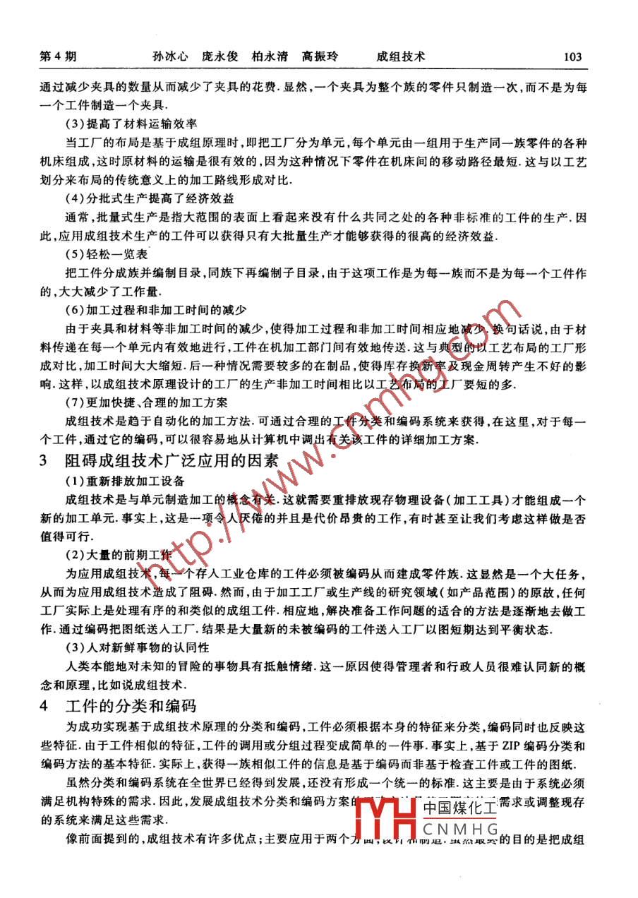 第22卷第4期河北建筑工程學(xué)院學(xué)報(bào)Vol.22No.4.2004年12月JOURNA OF HEBEI INSTITUTE OF ARCHITECTURAL ENCINEERINCDecember 2004成組技術(shù)孫冰心'龐永俊'柏永清'高 振玲21河北建筑工程學(xué)院;2華北航天工業(yè)學(xué)院摘要通過對成組技術(shù)概念的介紹,使大家了解到基于成組技術(shù)得到的工件加工工藝方法相比過去傳統(tǒng)的加工工藝方法具有無法比擬的優(yōu)越性.從而為成組技術(shù)的推廣創(chuàng)造了條件.關(guān)鍵詞機(jī)械加工;工 藝路線;新思路;成組技術(shù);對比.中圖號(hào)TP20引言成組技術(shù)是制造業(yè)的一個(gè)新技術(shù),它涉及到具有相似或相關(guān)屬性零件的標(biāo)識(shí)和分組,應(yīng)用成組技術(shù)可使產(chǎn)品的設(shè)計(jì)和制造變的更容易更經(jīng)濟(jì).這種新的生產(chǎn)技術(shù)在1920年形成于美國,一個(gè)叫FrederickTaylor的人提出了這種需要特殊操作的分組零件的想法.他的這-觀點(diǎn)在20世紀(jì)早期就得到了JonesandLamson機(jī)加工公司的認(rèn)同,他們利用了原始的成組技術(shù)形式來布置機(jī)械加工設(shè)備.他們使用成組技術(shù)的方法就是以產(chǎn)品來劃分加工部門,而不是以工藝或縮短路徑來劃分加工部門.今天,通過優(yōu)化構(gòu)造分類、編碼系統(tǒng)、軟件支持的應(yīng)用,利用工件的相似性使成組技術(shù)得到了實(shí)現(xiàn).1適應(yīng)成組技術(shù)發(fā)展的原因由于日益增長的國際競爭和快速變化的市場需求使現(xiàn)代制造工業(yè)正面臨著許多挑戰(zhàn).在下面例舉的這些挑戰(zhàn)只有在成組技術(shù)中才能解決.(1)工業(yè)生產(chǎn)傾向于產(chǎn)品品種更加楚多樣而每種產(chǎn)品生產(chǎn)的數(shù)量減少,以此來滿足當(dāng)今社會(huì)不斷增長的個(gè)性化需求.換句話說,工廠中分批式生產(chǎn)的產(chǎn)品占有率越來越高,預(yù)計(jì)將來占全部產(chǎn)品的75%是小批量的.(2)介于以上原因,傳統(tǒng)意義上的加工部門(以加工工藝分類的部門) ,生產(chǎn)效率變得非常的低.因?yàn)樵诟鱾€(gè)機(jī)械加工部門間產(chǎn)生產(chǎn)品加工路徑的浪費(fèi).(3)為了縮短非加工時(shí)間,整合設(shè)計(jì)和制造階段加工路徑就顯得十分必要,以便于在國際市場競爭中占據(jù)有利形勢.2成組技術(shù)的優(yōu)點(diǎn)(1)產(chǎn)品設(shè)計(jì)的優(yōu)勢從產(chǎn)品設(shè)計(jì)的角度,成組技術(shù)主要的優(yōu)點(diǎn)是它能夠使產(chǎn)品設(shè)計(jì)者避免“重新發(fā)明輪子”的重復(fù)工作。換句話說,由于成組技術(shù)設(shè)計(jì)的易保存和易調(diào)用性使得它消除了重復(fù)設(shè)計(jì)同一個(gè)產(chǎn)品的可能性.一旦要求設(shè)計(jì)的某個(gè)零件被確定,該零件首先被編碼,然后檢索存儲(chǔ)于計(jì)算機(jī)存貯器中的該公司的設(shè)計(jì)庫,找出與這個(gè)碼相匹配的已有設(shè)計(jì),這樣便可以節(jié)省設(shè)計(jì)工作的大量時(shí)間.如果工件的設(shè)計(jì)未包括在公司的計(jì)算機(jī)存儲(chǔ)文件中,與需求接近的設(shè)計(jì)就會(huì)被調(diào)出并被放大以滿足要求.成組技術(shù)的另一個(gè)優(yōu)點(diǎn)是它促進(jìn)了設(shè)計(jì)特征的標(biāo)準(zhǔn)化,這樣使得加工設(shè)備和工件夾具標(biāo)準(zhǔn)化程度大大提高.(2)刀具和裝置的標(biāo)準(zhǔn)化中國煤化工有相關(guān)性的工件稱為-族,這使得為每一族工件設(shè)計(jì)YHCNMHG個(gè)工件使用.這樣收稿日期:2004 -05-10作者簡介:女,1972年,講師,張家口市,075024第4期孫冰心龐永俊柏永清高振玲成組技術(shù)103通過減少夾具的數(shù)量從而減少了夾具的花費(fèi).顯然,一個(gè)夾具為整個(gè)族的零件只制造-次, 而不是為每一個(gè)工件制造一個(gè)夾具.(3)提高了材料運(yùn)輸效率當(dāng)工廠的布局是基于成組原理時(shí),即把工廠分為單元,每個(gè)單元由一組用于生產(chǎn)同-族零件的各種機(jī)床組成,這時(shí)原材料的運(yùn)輸是很有效的,因?yàn)檫@種情況下零件在機(jī)床間的移動(dòng)路徑最短.這與以工藝劃分來布局的傳統(tǒng)意義上的加工路線形成對比.(4)分批式生產(chǎn)提高了經(jīng)濟(jì)效益通常,批量式生產(chǎn)是指大范圍的表面上看起來沒有什么共同之處的各種非標(biāo)準(zhǔn)的工件的生產(chǎn).因此,應(yīng)用成組技術(shù)生產(chǎn)的工件可以獲得只有大批量生產(chǎn)才能夠獲得的很高的經(jīng)濟(jì)效益.(5)輕松一覽表把工件分成族并編制目錄,同族下再編制子目錄,由于這項(xiàng)工作是為每一族而不是為每-個(gè)工件作的,大大減少了工作量.(6)加工過程和非加工時(shí)間的減少由于夾具和材料等非加工時(shí)間的減少,使得加工過程和非加工時(shí)間相應(yīng)地減少.換句話說,由于材料傳遞在每-一個(gè)單元內(nèi)有效地進(jìn)行,工件在機(jī)加工部門間有效地傳送.這與典型的以工藝布局的工廠形成對比,加工時(shí)間大大縮短.后一種情況需要較多的在制品,使得庫存換新率及現(xiàn)金周轉(zhuǎn)產(chǎn)生不好的影響.這樣,以成組技術(shù)原理設(shè)計(jì)的工廠的生產(chǎn)非加工時(shí)間相比以工藝布局的工廠要短的多.(7)更加快捷、合理的加工方案成組技術(shù)是趨于自動(dòng)化的加工方法.可通過合理的工件分類和編
