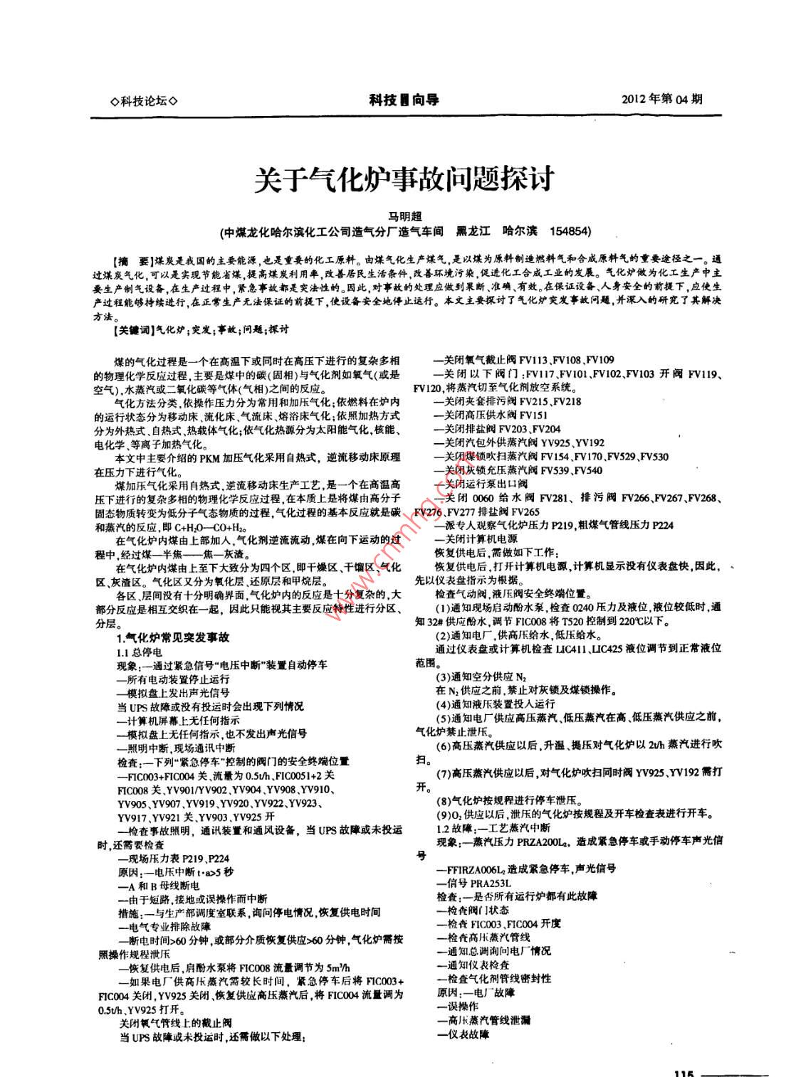 ◇科技論壇◇科技向?qū)?012年第04期關(guān)于氣化爐事故問題探討馬明超(中煤龍化哈爾濱化工公司造氣分廠造氣車間黑龍江哈爾濱154854)【摘要】煤炭是我國的主要能源,也是重要的化工原料。由煤氣生產(chǎn)煤氣是以煤為原料制造燃料氣和合成原料氣的重要途徑之一。通過煤炭氣化,可以是實現(xiàn)節(jié)能省煤,提高煤炭利用率,改善居民生活條件,改善環(huán)境污染,促進(jìn)化工合成工業(yè)的發(fā)展。氣化爐做為化工生產(chǎn)中主要生產(chǎn)制氣設(shè)備,在生產(chǎn)過程中,緊急事故都是突法性的。因此對事故的處理應(yīng)做到果斷準(zhǔn)確有效。在保證設(shè)備、人身安全的前提下,應(yīng)使生中無法保證的前提下,使設(shè)備安全地停止運(yùn)行。本文主要探討了氣化爐突發(fā)事故問題,并深入的研究了其解決產(chǎn)過程能夠持續(xù)進(jìn)行,在正常生產(chǎn)無法保方法【關(guān)鍵詞】氣化爐;突發(fā);事故;問題探討煤的氣化過程是一個在高溫下或同時在高壓下進(jìn)行的復(fù)雜多相一關(guān)閉氧氣截止閥FV113、FV108FV109的物理化學(xué)反應(yīng)過程,主要是煤中的碳(固相)與氣化劑如氧氣(或是關(guān)閉以下閥門:V17、V101、FV102、FV103開閥FV119、空氣)水蒸汽或二氧化碳等氣體(氣相)之間的反應(yīng)。F120,將蒸汽切至氣化劑放空系統(tǒng)。氣化方法分類依操作壓力分為常用和加壓氣化依燃料在爐內(nèi)一關(guān)閉夾套排污閥FV215、FV218的運(yùn)行狀態(tài)分為移動床流化床、氣流床、熔浴床氣化;依照加熱方式一關(guān)閉高供水閥Fv5分為外熱式、自熱式、熱載體氣化;依氣化熱源分為太陽能氣化,核能、電化學(xué)等離子加熱氣化。一關(guān)閉排鹽0一關(guān)閉汽包外供蒸汽閥v925、Yv192本文中主要介紹的PKM加壓氣化采用自熱式,逆流移動床原理關(guān)閉煤鎖吹掃蒸汽閥F5在壓力下進(jìn)行氣化式逆流移動床生產(chǎn)工藝是一個在高溫高煤加氣化采用自熱式,逆流移動生產(chǎn)工藝,是一個在商一關(guān)閉運(yùn)行泵出口閥壓下進(jìn)行的復(fù)雜多相的物理化學(xué)反應(yīng)過程,在本質(zhì)上是將煤由高分子一關(guān)閉0060給水閥FV281、排污閥V266、FV267、FV268、固態(tài)物質(zhì)轉(zhuǎn)變?yōu)榈头肿託鈶B(tài)物質(zhì)的過程,氣化過程的基本反應(yīng)就是碳FV276、FV277排鹽閥FV265和蒸汽的反應(yīng),即C+h2O-CO+H2派專人觀察氣化爐壓力P219,粗煤氣管線壓力P224在氣化爐內(nèi)煤由上部加人,氣化劑逆流流動煤在向下運(yùn)動的過關(guān)閉計算機(jī)電源恢復(fù)供電后,需做如下工作在氣化爐內(nèi)煤由上至下大致分為四個區(qū)即干燥區(qū)干餾區(qū)氣化恢復(fù)供電后,打開計算機(jī)電源,計算機(jī)顯示沒有儀表盤快,因此,區(qū)灰渣區(qū)。氣化區(qū)又分為氧化層還原層和甲烷層。十分復(fù)雜的大檢查氣動閥液壓閥安全終端位置。先以儀表盤指示為根據(jù)。各區(qū)層間沒有十分明確界面,氣化爐內(nèi)的反應(yīng)是部分反應(yīng)是相互交織在一起,因此只能視其主要反應(yīng)特性進(jìn)行分區(qū)、(1)通知現(xiàn)場啟動酚水泵,檢查0240力及液位,液位較低時,通分層。知32#供應(yīng)酚水,調(diào)節(jié)FIC008將T520控制到220℃以下。1.氣化爐常見突發(fā)事故(2)通知電廠,供高壓給水,低壓給水。1.1總停通過儀表盤或計算機(jī)檢查LIC、LC425液位調(diào)節(jié)到正常液位現(xiàn)象:一通過緊急信號“電壓中斷”裝置自動停車范圍一所有電動裝置停止運(yùn)行(3)通知空分供應(yīng)N2模擬盤上發(fā)出聲光信號在N2供應(yīng)之前,禁止對灰鎖及煤鎖操作。當(dāng)UPS故障或沒有投運(yùn)時會出現(xiàn)下列情況(4)通知液壓裝置投入運(yùn)行一計算機(jī)屏幕上無任何指示(5)通知電廠供應(yīng)高壓蒸汽低壓蒸汽在高、低壓蒸汽供應(yīng)之前,一模擬盤上無任何指示,也不發(fā)出聲光信號氣化爐禁止泄壓。一照明中斷,現(xiàn)場通訊中斷,現(xiàn)(6)高壓蒸汽供應(yīng)以后,升溫提壓對氣化爐以2蒸汽進(jìn)行吹檢查:一下列緊急停車控制的閥門的安全終端位置掃00002(7)高壓蒸汽供應(yīng)以后,對氣化爐吹掃同時閥YV925、YV192需打 FIC008yv90/yv902yv904、yv908、Y910、開YV905、YV907YV919、YV920、YV922、YV923、(8)氣化爐按規(guī)程進(jìn)行停車泄壓v917、yv921關(guān)Y903YV925開(9)O2供應(yīng)以后,泄壓的氣化爐按規(guī)程及開車檢查表進(jìn)行開車。檢查事故照明,通訊裝置和通風(fēng)設(shè)備,當(dāng)UPS故障或未投運(yùn)1.2故障:工藝蒸汽中斷時還需要檢查現(xiàn)象:蒸汽壓力PRZA200L,造成緊急停車或手動停車聲光信號原因:一電中斷15秒006l造成緊急停車,聲光信號一A和B母線斷電一信號PRA253一由于短路調(diào)度室聯(lián)系,詢問停電情況恢復(fù)供電時間誤操作而中斷檢查:一是否所有運(yùn)行爐都有此故障一檢查閥門狀態(tài)門狀一電氣專業(yè)排除故障一檢查FIC03、FIC004開度斷電時間>60分鐘,或部分介質(zhì)恢復(fù)供應(yīng)>60分鐘,氣化爐需按一檢查高樂蒸汽管線照操作規(guī)程泄壓一通知總調(diào)詢問電廠情況一恢復(fù)供電后,啟酚水泵將FIC008流量調(diào)節(jié)為5m一通知儀表檢查如果電廠供高壓蒸汽需較長時間,緊急停車后將FC003+一檢查氣化劑管線密封性FC004關(guān)閉,YV925關(guān)閉、恢復(fù)供應(yīng)高壓蒸汽后