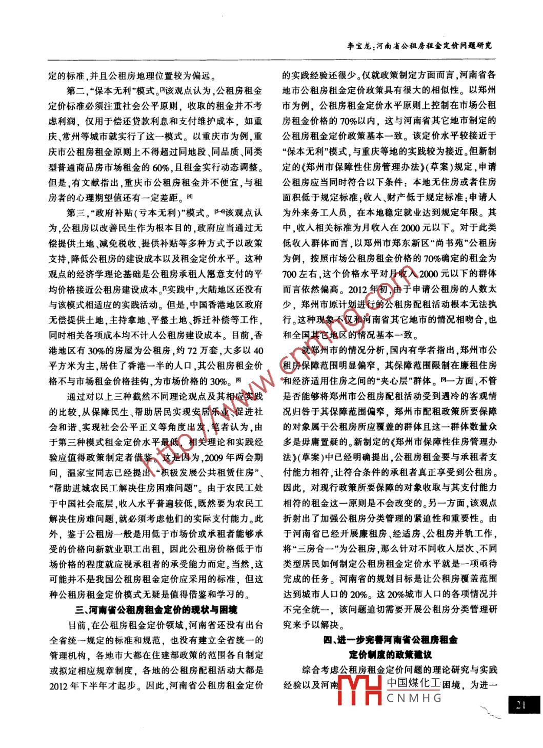 2014.02總第441期doi10.396/.sn.10060 -2025.2014.02.06河南省公租房租金定價(jià)問(wèn)題研究李寶龍(洛陽(yáng)理工學(xué)院工程管理系,河南洛陽(yáng)471023)[摘要]公租房租金定價(jià)問(wèn)題是理論研究和實(shí)踐探索的一個(gè)熱門(mén)話題。開(kāi)展河南省公租房租金定價(jià)問(wèn)題研究對(duì)于解決人口大省的住房難問(wèn)題以及助推中原經(jīng)濟(jì)區(qū)建設(shè)具有重要意義。在對(duì)公租房租金定價(jià)問(wèn)題理論研究和實(shí)踐探索進(jìn)行歸納總結(jié)及論證分析的基礎(chǔ)上,闡述了河南省公租房租金定價(jià)的現(xiàn)狀與因境,提出了完善河南省公租房租金定價(jià)制度的政策建議。[關(guān)鍵詞]公租房租金分層次定價(jià) 分類(lèi)定價(jià)[中圖分類(lèi)號(hào)]F726 (文獻(xiàn)標(biāo)識(shí)碼]A [文章編 號(hào)]1006- 2025(2014)02- 0020-04一、引言夠承受的價(jià)格向新就業(yè)職工出租。河南省住房和城鄉(xiāng)隨著我國(guó)社會(huì)經(jīng)濟(jì)的快速發(fā)展,社會(huì)保障性住房建設(shè)廳統(tǒng)計(jì)數(shù)據(jù)顯示,截止到2012年8月底,全省各事業(yè)也進(jìn)入到了一個(gè)新的時(shí)期。目前,河南省政府專(zhuān)門(mén)地實(shí)際落實(shí)公租房項(xiàng)目17萬(wàn)套。加強(qiáng)對(duì)河南省公租房出臺(tái)了《關(guān)于加快發(fā)展公共租賃住房的意見(jiàn)》,重點(diǎn)發(fā)定價(jià)問(wèn)題的研究,可以為河南省公租房?jī)r(jià)格決策提供展公共租賃住房。在河南省社會(huì)保障性住房領(lǐng)域,廉租有益的參考。住房、經(jīng)濟(jì)適用住房、公共租賃住房已經(jīng)開(kāi)展并軌工二、公租房租金定價(jià)向題的理論研究與實(shí)踐探索作,即“三房合一”。今后,在住房保障體系中,將不再有目前,國(guó)內(nèi)外公租房租金定價(jià)理論研究和實(shí)踐探經(jīng)濟(jì)適用住房這-品種;但對(duì)已取得經(jīng)濟(jì)適用住房購(gòu)索模式主要可以歸納為以下三種:房資格證的市民,還會(huì)做到“應(yīng)保盡保"。在“三房合一”第一,“保本微利"模式。|該觀點(diǎn)認(rèn)為,公租房租金以后,社會(huì)保障性住房只租不售,申請(qǐng)人不用再針對(duì)某定價(jià)標(biāo)準(zhǔn)不僅要確保公租房建設(shè)成本收回,還應(yīng)確保-類(lèi)房屋提出申請(qǐng),而是由政府根據(jù)申請(qǐng)人家庭情況一定的盈利從而支持公租房后續(xù)建設(shè),如北京、上海、審核其是否具備保障性住房人住條件,并根據(jù)申請(qǐng)人廈門(mén)、廣州等城市就實(shí)行了這一模式。以北京市為例,收入情況,分別給予不同租房補(bǔ)貼。顯然,今后社會(huì)保其公租房租金為市場(chǎng)租金價(jià)格的80% ,收取租金以“保障性住房的發(fā)展方向可以籠統(tǒng)歸納為公共租賃住房本微利"為原則,主要用于補(bǔ)償建設(shè)和運(yùn)營(yíng)成本。但以.(即公租房)。公租房一般是指面向中低收入家庭廉租2012年7月北京市朝陽(yáng)區(qū)首個(gè)公租房項(xiàng)目為例,其公房之外的保障性租賃住房,以低于市場(chǎng)價(jià)或承租者能租房租金達(dá)到了市場(chǎng)價(jià)格的85%,高于北京市建委制[收稿日期]2013-12-09[基金項(xiàng)目]本文系河南省教育廳人文社會(huì)科學(xué)研究重點(diǎn)項(xiàng)目“公共租賃住房建設(shè)中的融資問(wèn)題研究"(編號(hào):2012- ZD -071,主持人:李寶龍)的期中研究成果。中國(guó)煤化工[作者簡(jiǎn)介)李宣龍(1911-).男,漢,河南洛陽(yáng),洛陽(yáng)理工學(xué)院講師,博士,主要碼YHCNMH G20李寶龍:河南省公租房租金定價(jià)問(wèn)題研究定的標(biāo)準(zhǔn),并且公租房地理位置較為偏遠(yuǎn)。的實(shí)踐經(jīng)驗(yàn)還很少。僅就政策制定方面而言,河南省各第二,“保本無(wú)利”模式。該觀點(diǎn)認(rèn)為,公租房租金地市公租房租金定價(jià)政策具有很大的相似性。以鄭州定價(jià)標(biāo)準(zhǔn)必須注重社會(huì)公平原則,收取的租金并不考市為例,公租房租金定價(jià)水平原則上控制在市場(chǎng)公租慮利潤(rùn),僅用于償還貸款利息和支付維護(hù)成本,如重房租金價(jià)格的70%以?xún)?nèi),這與河南省其它地市制定的慶、常州等城市就實(shí)行了這一-模式。以重慶市為例,重公租房租金定價(jià)政策基本- -致。 該定價(jià)水平較接近于慶市公租房租金原則上不得超過(guò)同地段、同品質(zhì)、同類(lèi)“保本無(wú)利"模式,與重慶等地的實(shí)踐較為接近。但新制型普通商品房市場(chǎng)租金的60%,且租金實(shí)行動(dòng)態(tài)調(diào)整。定的《鄭州市保障性住房管理辦法》(草案)規(guī)定,申請(qǐng)但是,有文獻(xiàn)指出,重慶市公租房租金并不便宜,與租公租房應(yīng)當(dāng)同時(shí)符合以下條件:本地?zé)o住房或者住房房者的心理期望值還有一-定差距。用面積低于規(guī)定標(biāo)準(zhǔn);收人、財(cái)產(chǎn)低于規(guī)定標(biāo)準(zhǔn);申請(qǐng)人第三,“政府補(bǔ)貼(虧本無(wú)利)”模式。(56該觀點(diǎn)認(rèn)為外來(lái)務(wù)工人員,在本地穩(wěn)定就業(yè)達(dá)到規(guī)定年限。其為,公租房以改善民生作為根本目的,政府應(yīng)當(dāng)通過(guò)無(wú)中,收人相關(guān)標(biāo)準(zhǔn)為月收入在2000元以下。對(duì)于此類(lèi)償提供土地減免稅收