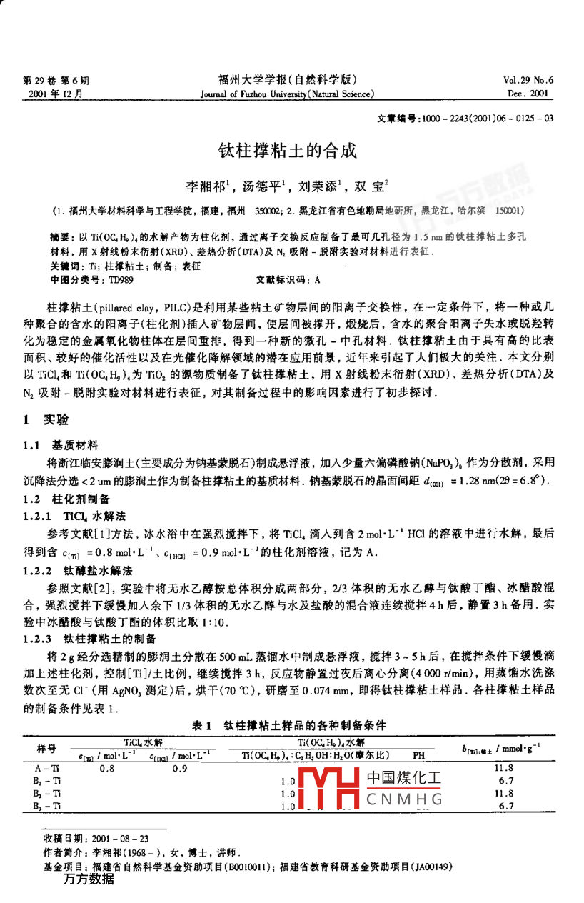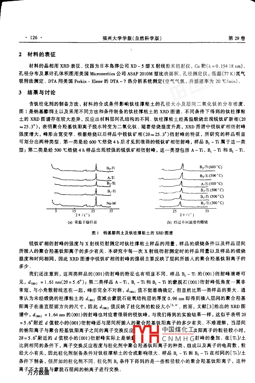 第29卷第6期福州大學(xué)學(xué)報(bào)(自然科學(xué)版)Vol.29 No.6 .2001年12月Journal of Fuzhou University( Natural Science)Dec.2001文章編號(hào):1000 - 2243(2001)06 -0125 - 03鈦柱撐粘土的合成李湘祁',湯德平',劉榮添',雙寶(1.福州大學(xué)材料科學(xué)與工程學(xué)院,福建,福州30002; 2.黑龍江省有色地勒局地研所,黑龍江,哈爾濱10001)摘要:以Ti(OC4 H )4的水解產(chǎn)物為柱化劑,通過離子交換反應(yīng)制備了最可幾孔徑為1.5 nm的鈦柱撐粘土多孔材料,用X射線粉末術(shù)射(XRD)、差熱分析(DTA)及N2吸附-脫附實(shí)驗(yàn)對(duì)材料進(jìn)行表征.關(guān)鍵詞: T;柱撐粘土;制備;表征中圈分類號(hào): TD989文獻(xiàn)標(biāo)識(shí)碼: A柱撐粘土(pillared clay, PILC)是利用某些粘土礦物層間的陽(yáng)離子交換性,在一定條件下,將一種或幾種聚合的含水的陽(yáng)離子(柱化劑)插人礦物層間,使層間被撐開,煅燒后,含水的聚合陽(yáng)離子失水或脫羥轉(zhuǎn)化為穩(wěn)定的金屬氧化物柱體在層間重排,得到一種新的微孔-中孔材料.鈦柱撐粘土由于具有高的比表面積、較好的催化活性以及在光催化降解領(lǐng)域的潛在應(yīng)用前景,近年來(lái)引起了人們極大的關(guān)注.本文分別以TiC,和Ti(OC,H),為TiO2的源物質(zhì)制備了鈦柱撐粘土,用X射線粉末街射(XRD)、差熱分析(DTA)及N2吸附-脫附實(shí)驗(yàn)對(duì)材料進(jìn)行表征,對(duì)其制備過程中的影響因素進(jìn)行了初步探討.1實(shí)驗(yàn)1.1基 質(zhì)材料將浙江臨安膨潤(rùn)土(主要成分為鈉基蒙脫石)制成懸浮液,加入少量六偏磷酸鈉(NePO.)。作為分散劑,采用沉降法分選<2 um的膨潤(rùn)土作為制備柱撐粘土的基質(zhì)材料.鈉基蒙脫石的晶面間距dc) =1.28 nm(20=6.8 ).1.2 柱化劑制備1.2.1 TiC, 水解法參考文獻(xiàn)[1]方法,冰水浴中在強(qiáng)烈攪拌下,將TCI,滴入到含2mol.L-' HCI的溶液中進(jìn)行水解,最后得到含CIm! =0.8mol'L'、C(1Ho] =0.9 mol':L-'的柱化劑溶液,記為A.1.2.2鈦醇鹽 水解法參照文獻(xiàn)[2],實(shí)驗(yàn)中將無(wú)水乙醇按總體積分成兩部分,2/3體積的無(wú)水乙醇與鈦酸丁酯、冰醋酸混,合,強(qiáng)烈攪拌下緩慢加人余下1/3 體積的無(wú)水乙醇與水及鹽酸的混合液連續(xù)攪拌4h后,靜置3h備用.實(shí)驗(yàn)中冰醋酸與鈦酸丁酯的體積比取1:10.1.2.3鈦柱撐粘土的制 備將2 g經(jīng)分選精制的膨潤(rùn)土分散在500 mL蒸餾水中制成懸浮液,攪拌3~5h后,在攪拌條件下緩慢滴加上述柱化劑,控制[Ti]土比例,繼續(xù)攪拌3h,反應(yīng)物靜置過夜后離心分離(4000 r/min),用蒸餾水洗滌數(shù)次至無(wú)CI~ (用AgNO, 測(cè)定)后,烘干(70 C),研磨至0.074 mm,即得鈦柱撐粘土樣品.各柱撐粘土樣品的制備條件見表1.表1鈦柱撐粘土樣 品的各種制備條件TiCL水解Ti(OC FL).水解樣號(hào)CmL ! mol:LFIBal i mol.LTT(OC H).:CH 0H:H,O(摩爾比)PHbrn)土1 mmol'g~'A-T0.80.911.8B-T中國(guó)煤化工6.7B-Ti:MYHCNMHG收稿日期: 2001 -08-23作者簡(jiǎn)介:李湘祁(1968-),女,博士,講師.基金項(xiàng)目:福建省自然科學(xué)基金資助項(xiàng)目(B0010011);福建省教育科研基金資肋項(xiàng)目(JA00149)福州大學(xué)學(xué)報(bào)(自然科學(xué)版)第29卷2材料 的表征材料的晶相用XRD表征.儀器為日本島津公司XD-5型X射線粉末衍射儀,Cu靶(λ=0.154 18 nm).孔徑分布及累計(jì)孔體積圖用美國(guó)Micromeitics 公司ASAP 2010M型比表面積、孔徑測(cè)定儀,低溫(77 K)氮?dú)馕椒y(cè)定. DTA用美國(guó)Perkin - Elmer 的DTA -7熱分析系統(tǒng)測(cè)定(空氣氣氛,升溫速率為20 C/min).3結(jié)果與討論含鈦柱化劑的制備方法、材料的合成條件影響鈦柱撐粘土的孔徑大小及層間二氧化鈦的分布密度.圖1是鈉基膨潤(rùn)土以及采用不同方法和條件制備的鈦柱撐粘土的XRD圖譜.不同條件下得到的鈦柱撐粘土的XRD圖譜存在較大差異,反應(yīng)出材料層間孔結(jié)構(gòu)的不同.鈦柱撐粘土經(jīng)高溫煅燒出現(xiàn)銳鈦礦新相(20≈25.3°),表明聚合羥基鈦陽(yáng)離子脫水轉(zhuǎn)變?yōu)槎趸?隨著焙燒溫度升高, XRD圖譜中銳鈦礦相行射峰強(qiáng)度增大,峰形由寬變窄.根據(jù)焙燒以后樣品中銳鈦礦相(20≈25.3° )術(shù)射峰的特征,所研究的樣品明顯可劃分出兩種類型.第一類是經(jīng)600 C焙燒4 h后才見到很弱的銳鈦礦相衍射峰,樣品B,- Ti屬于這一類型;第二類是經(jīng)500 C焙燒4h樣品出現(xiàn)較強(qiáng)的銳鈦礦相衍射峰,這一類型包括A-Ti、B,-Ti和B-T.I B._TiB-71(600*C)By-T(500"C)B2-TiA-T(S00*C)BI-TiB-T:(500"C)Br-Ti (500'C)Bi(300*C)52日1("}站35220/(°)(舊)常溫干F燥樣品(b)經(jīng)過不同溫度的煅燒圖1鈉基膨潤(rùn)土及鈦柱撐粘土的XRD圖譜銳鈦礦相衍射峰的強(qiáng)度與x射線街射測(cè)定時(shí)鈦柱撐粘土樣品的用量、樣品的煅燒條件以及樣品層間所插人的聚合羥基鈦陽(yáng)離子的多少有關(guān).本研究中每一次X射線衍射測(cè)定時(shí)的樣品用量以及樣品的煅燒溫度和時(shí)間相同,因此XRD圖譜中銳鈦礦相行射峰的強(qiáng)弱主要反映了層間所插人的聚合羥基鈦陽(yáng)離子的多少我們還注意到,這兩類樣品的(001)衍射峰的特征也有明顯不同.樣品B- Ti的(001)衍射峰清晰可見,d0o) =1.61 nm(20=5.6°); 第二類樣品A-Ti、B-Ti和B, - Ti的蒙脫石(001)衍射峰低角度一翼非常短,與小角散射線連在-起,峰形完全不對(duì)稱,dar值不能準(zhǔn)確確定,但顯然比第一類樣品的要大.通常認(rèn)為未經(jīng)煅燒的柱撐粘