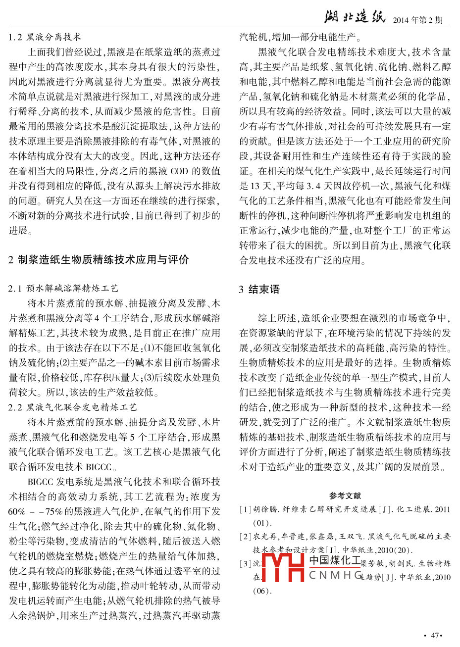 湖壯選統(tǒng)2014年第2期制漿造紙生物質(zhì)精煉技術唐黎標(杭州市造紙有限公司310004)摘要制漿造紙是高耗能、高污染的行業(yè)。隨著社會的飛速發(fā)展,人們對于紙張的依賴逐步減弱造紙廠的社會地位已經(jīng)變得岌岌可危,所以必須對制漿造紙技術進行合理性改革,生物質(zhì)精煉技術是種近幾年新出現(xiàn)的技術,它可以將傳統(tǒng)的制漿造紙企業(yè)轉(zhuǎn)型為生物精煉企業(yè),實現(xiàn)產(chǎn)業(yè)結構的多樣化,生產(chǎn)內(nèi)容的多元化,使造紙廠不再局限于對紙制品的制造,也逐漸生產(chǎn)一些生物質(zhì)材料、化學能源等,從而告別生產(chǎn)結構的單一性,減少能源的消耗,降低高濃度廢水的排放。目前制漿造紙生物質(zhì)精煉技術已經(jīng)成為造紙企業(yè)發(fā)展的必然趨勢。文章分析了制漿造紙生物質(zhì)精煉技術,以供造紙人員參考關鍵詞制漿造紙;生物質(zhì);精煉制漿造紙是高耗能、高污染的行業(yè)。隨著社會的和黑液氣化聯(lián)合化學合成技術。飛速發(fā)展,人們對于紙張的依賴逐步減弱,造紙廠的社會地位已經(jīng)變得岌岌可危,所以必須對制漿造紙技1制漿造紙生物質(zhì)精煉的基礎技術術進行合理性改革,生物質(zhì)精煉技術是一種近幾年新出現(xiàn)的技術,它可以將傳統(tǒng)的制漿造紙企業(yè)轉(zhuǎn)型為生1.1木片抽提液的發(fā)酵技術物精煉企業(yè),實現(xiàn)產(chǎn)業(yè)結構的多樣化,生產(chǎn)內(nèi)容的多雖然通過色譜層析法可以在木材等原材料中提元化,使造紙廠不再局限于對紙制品的制造,也逐漸取各種糖類和乙醇,但是這種提取的技術難度比較生產(chǎn)一些生物質(zhì)材料、化學能源等,從而告別生產(chǎn)結高,生產(chǎn)成本比較高,不能被廣泛的使用,而且所提取構的單一性,減少能源的消耗,降低高濃度廢水的排出來的物質(zhì),研究意義比較低。所以說,目前木片抽放。目前制漿造紙生物質(zhì)精煉技術已經(jīng)成為造紙企提液的手段大部分都用在對乙醇的發(fā)酵上,市場對乙業(yè)發(fā)展的必然趨勢。醇的需求還是比較大的,利用木片抽取液的發(fā)酵技生物質(zhì)精煉是通過運用蒸煮、燃燒、分離等手段術,不僅可以批量的提取低濃度的乙醇,而且經(jīng)過后對生物質(zhì)原材料進行深層次的加工技術,從而改變生期的簡單加工,還能生產(chǎn)無水乙醇。物質(zhì)原材料的固有形態(tài),慢慢向氣態(tài)、液態(tài)轉(zhuǎn)變。制在進行木片抽提液的發(fā)酵技術時,需要用到某些漿造紙技術的第一道工序就是對造紙原料進行蒸煮,乙醇酶微生物但是這些微生物并不能直接作用于乙在蒸煮的過程中,會產(chǎn)生大量的廢水,也就黑液,黑液醇,而是會先對六碳糖產(chǎn)生反應,而乙醇發(fā)酵的先決的成分會對生態(tài)環(huán)境造成破壞,生物質(zhì)精煉技術就是條件是五碳糖的抽取。根據(jù)實驗發(fā)現(xiàn),有一種發(fā)酵單為了對黑液進行轉(zhuǎn)化而存在的。細胞可以對各種糖類都產(chǎn)生發(fā)酵作用,這就解決了普當前,木材蒸煮前的提取技術以預水解提取為通淀λ中國煤化工缺陷。新發(fā)現(xiàn)的發(fā)酵主,采用低濃度堿液或者酸液提取工藝;蒸煮后黑液菌可LCNMHG脖提高了發(fā)酵的效率轉(zhuǎn)化技術包括黑液分離技術、黑液氣化聯(lián)合發(fā)電技術和質(zhì)量收稿日期:2014-04-25湖壯選統(tǒng)014年第2期1.2黑液分離技術汽輪機,增加一部分電能生產(chǎn)上面我們曾經(jīng)說過,黑液是在紙漿造紙的蒸煮過黑液氣化聯(lián)合發(fā)電精練技術難度大,技術含量程中產(chǎn)生的高濃度廢水,其本身具有很大的污染性,高,其主要產(chǎn)品是紙漿、氫氧化鈉、硫化鈉、燃料乙醇因此對黑液進行分離就顯得尤為重要。黑液分離技和電能,其中燃料乙醇和電能是當前社會急需的能源術簡單點說就是對黑液進行深加工,對黑液的成分進產(chǎn)品,氫氧化鈉和硫化鈉是木材蒸煮必須的化學品行稀釋、分離的技術,從而減少黑液的危害性。目前所以具有較高的經(jīng)濟效益。同時,該法可以大量的減最常用的黑液分離技術是酸沉淀提取法,這種方法的少有毒有害氣體排放,對社會的可持續(xù)發(fā)展具有一定技術原理主要是消除黑液排除的有毒氣體,對黑液的的貢獻。但是該方法還處于一個工業(yè)應用的研究階本體結構成分沒有太大的改變。因此,這種方法還存段,其設備耐用性和生產(chǎn)連續(xù)性還有待于實踐的驗在著相當大的局限性,分離之后的黑液COD的數(shù)值證。在相關的煤氣化生產(chǎn)實踐中,最長延續(xù)運行時間并沒有得到相應的降低,沒有從源頭上解決污水排放是13天,平均每3.4天因故停機一次,黑液氣化和煤的問題。研究人員在這一方面還在繼續(xù)的進行探索,氣化的工藝條件相當,黑液氣化也有可能經(jīng)常發(fā)生間不斷對新的分離技術進行試驗,目前已得到了初步的斷性的停機,這種間斷性停機將嚴重影響發(fā)電機組的進展。正常運行,減少電能的產(chǎn)量,也對整個工廠的正常運轉(zhuǎn)帶來了很大的困擾。所以到目前為止,黑液氣化聯(lián)2制漿造紙生物質(zhì)精練技術應用與評價合發(fā)電技術還沒有廣泛的應用2.1預水解堿溶解精煉工藝3結束語將木片蒸煮前的預水解、抽提液分離及發(fā)酵、木片蒸煮和黑液分離等4個工序結合,形