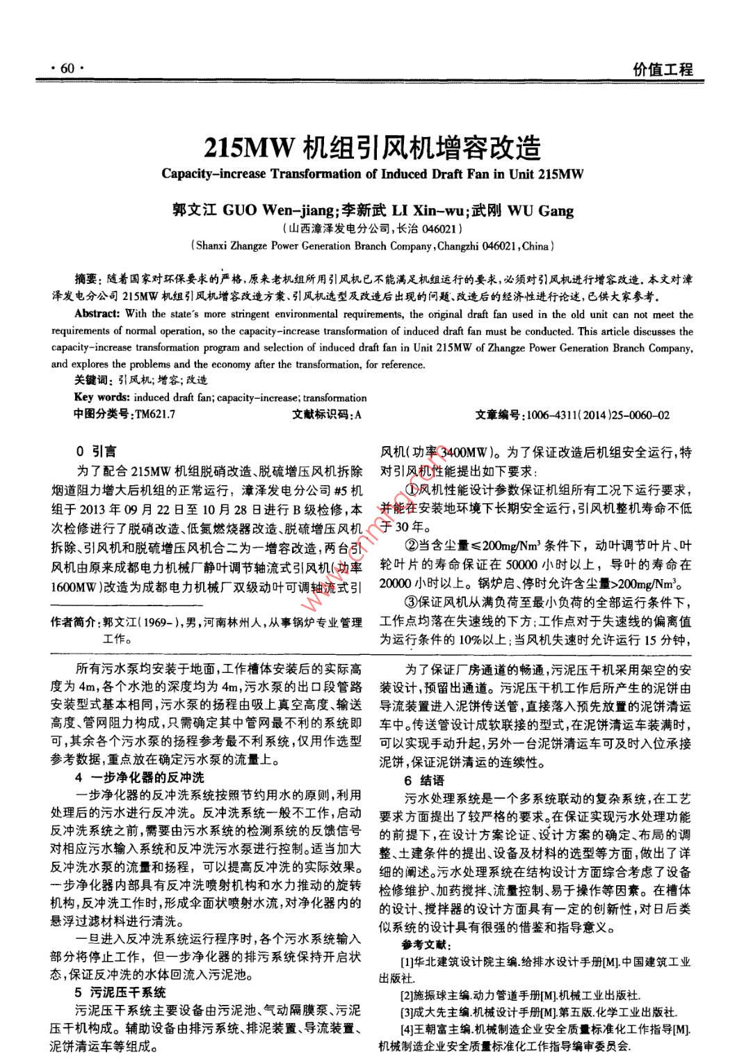 Value Engineering59污水處理系統(tǒng)設(shè)計(jì)Design of Sewage Treatment System李偉 LI Wei(中航沈飛民用飛機(jī)有限責(zé)任公司,沈陽(yáng)110850)AVIC SAC Commercial Aircraft Company Limited, Shenyang 110850, China)摘要:為滿足生產(chǎn)線建線需要,按照技術(shù)條件和要求,根據(jù)國(guó)家有關(guān)污水排放標(biāo)準(zhǔn),對(duì)污水處理系統(tǒng)進(jìn)行設(shè)計(jì)Abstract: In order to meet the needs of the production line, according to the technical conditions and requirements, this paper designsthe sewage treatment system in accordance with the relevant national sewage discharge standards關(guān)鍵詞:污水排放標(biāo)準(zhǔn);污水處理系統(tǒng);設(shè)計(jì)Key words: sewage discharge standards; sewage treatment system; design中圖分類號(hào):U6649+2文獻(xiàn)標(biāo)識(shí)碼:A文章編號(hào):10064311(2014)25-0059020引言轉(zhuǎn)速有利于絮凝劑與槽液進(jìn)行化學(xué)反應(yīng)后生成的絮狀物污水處理系統(tǒng)是為了滿足新建生產(chǎn)線的需要而進(jìn)行不被攪拌槳打散,同時(shí)對(duì)槽液與藥劑的均勻混合具有輔設(shè)計(jì)的。綜合考慮生產(chǎn)線的各類污水生產(chǎn)線的排放量使助作用。用要求、工作環(huán)境等因素,以此為依據(jù),進(jìn)行槽體、攪拌器、由于槽體深度為2500mm,攪拌軸不能懸空設(shè)計(jì),否污水泵等的設(shè)計(jì)和選型,實(shí)現(xiàn)了設(shè)計(jì)科學(xué)合理。此外,污水則容易造成攪拌槳未端出現(xiàn)大幅擺動(dòng),從而易于損壞減速處理系統(tǒng)實(shí)現(xiàn)了自動(dòng)化運(yùn)行和手動(dòng)運(yùn)行兩種模式,具有易機(jī)及其附件。因此,利用水泵軸封的原理,在槽底設(shè)計(jì)水下于操作性和系統(tǒng)運(yùn)行可靠性的特點(diǎn)。兩套運(yùn)行系統(tǒng)相對(duì)獨(dú)軸承的限位結(jié)構(gòu),將攪拌軸末端插入水下軸承限位結(jié)構(gòu)立,在自動(dòng)運(yùn)行系統(tǒng)失靈或切換至手動(dòng)運(yùn)行系統(tǒng)時(shí),可以中。經(jīng)過(guò)設(shè)計(jì),水下軸承由限位座和密封套組成,水下軸承進(jìn)行各個(gè)污水處理系統(tǒng)的獨(dú)立操作,滿足使用要求。與攪拌軸的裝配具有限位、密封以及可檢修拆卸的功能。限1槽體設(shè)計(jì)位座預(yù)先安裝于槽體底部,與槽體形成整體,實(shí)現(xiàn)防腐涂槽體初級(jí)設(shè)計(jì)中,按照污水處理流程和處理量,初步層全覆蓋,不露出槽體底板本體。攪拌槳設(shè)計(jì)成上下分段確定槽體的外形尺寸,將各個(gè)槽體按工藝流程進(jìn)行排布,的雙層結(jié)構(gòu),實(shí)現(xiàn)槽液攪拌的均勻性。同時(shí),降低攪拌槳工滿足污水處理線需要總的安裝線長(zhǎng)度寬度、平臺(tái)的架設(shè)作時(shí)對(duì)攪拌軸的軸向扭矩,降低了攪拌器減速機(jī)的負(fù)荷,等條件要求。提高了攪拌器運(yùn)行的平穩(wěn)性。按槽液的流量設(shè)計(jì)溢流口,上道工藝槽與下道工藝槽22未加入絮凝劑而加入酸、堿、還原劑、鈣鹽等介質(zhì)之間也采用此方法進(jìn)行合理處理壓縮了大量槽體安裝空的污水槽采用相對(duì)高轉(zhuǎn)速比的攪拌器,攪拌槳轉(zhuǎn)速控制間保證了槽體在有限的空間范圍內(nèi)得到合理的布置。同在介于120pm150m之間。此類槽內(nèi)的槽液因不生成時(shí),按照合并槽體的分布位置,從便于檢查的角度思考,分絮狀物,只要求槽液與藥劑的快速混合和保證槽液的均別設(shè)立檢修平臺(tái)通道。槽體內(nèi)設(shè)計(jì)了經(jīng)過(guò)加藥攪拌、處理后的槽液導(dǎo)流桊勻性。置,延長(zhǎng)了槽液駐留時(shí)間,同時(shí)對(duì)槽體的尺寸設(shè)計(jì)提供了由于槽體深度為2500mm,同理,參考加入絮凝劑的充足的安裝空間。主要工藝槽體結(jié)構(gòu),采用優(yōu)質(zhì)碳污水槽的結(jié)構(gòu)型式,設(shè)計(jì)了水下軸承,保證運(yùn)行的平穩(wěn)性。Q235-A,方管進(jìn)行加強(qiáng),內(nèi)表面采用潛艇外表面防腐涂按照液位分為雙層布置安裝。為了保證槽液的快速混合,層,外表面底層采用鐵紅底漆防銹涂層,外層采用瀝青提高污水處理效率,將攪拌槳設(shè)計(jì)成渦扇型槳葉結(jié)構(gòu)。涂層。23加藥槽的攪拌器設(shè)計(jì),因只要求槽液得到快速均加藥及配藥槽采用耐腐蝕的PP板制作,碳鋼方管加勻攪拌降低工藝槽的等待時(shí)間,因此,采用相對(duì)高轉(zhuǎn)速比強(qiáng),外包薄壁PP板的攪拌器,攪拌槳轉(zhuǎn)速控制在介于120mpm-150rm之間。2攪拌器設(shè)計(jì)由于加藥槽的容積較小,深度不大,槽液攪拌過(guò)程中根據(jù)槽液攪拌性質(zhì)的不同分為三類。為減少安裝空生成的對(duì)攪拌軸的扭矩不大,其攪拌槳設(shè)計(jì)為懸空的單層間,減速機(jī)設(shè)計(jì)均為立式安裝。渦扇型槳葉結(jié)構(gòu)。2.1加入絮凝劑的污水槽采用低轉(zhuǎn)速比的攪拌器,攪3污水泵的選型拌槳轉(zhuǎn)速控制在介于7pm-10pm之間。攪拌槳設(shè)計(jì)成對(duì)依據(jù)生產(chǎn)線各類污水的排放量和污水的吸程、管網(wǎng)阻稱于攪拌軸排布、立式攪拌槳葉,而不采用渦旋槳葉。低力輸送高度來(lái)確定污水泵的選型。參考各個(gè)對(duì)應(yīng)污水泵的流程和揚(yáng)程,并根據(jù)污水的酸堿腐蝕性進(jìn)行污水泵的選作者簡(jiǎn)介:李偉(1974-),男,遼寧新民人,畢業(yè)于沈陽(yáng)航空工