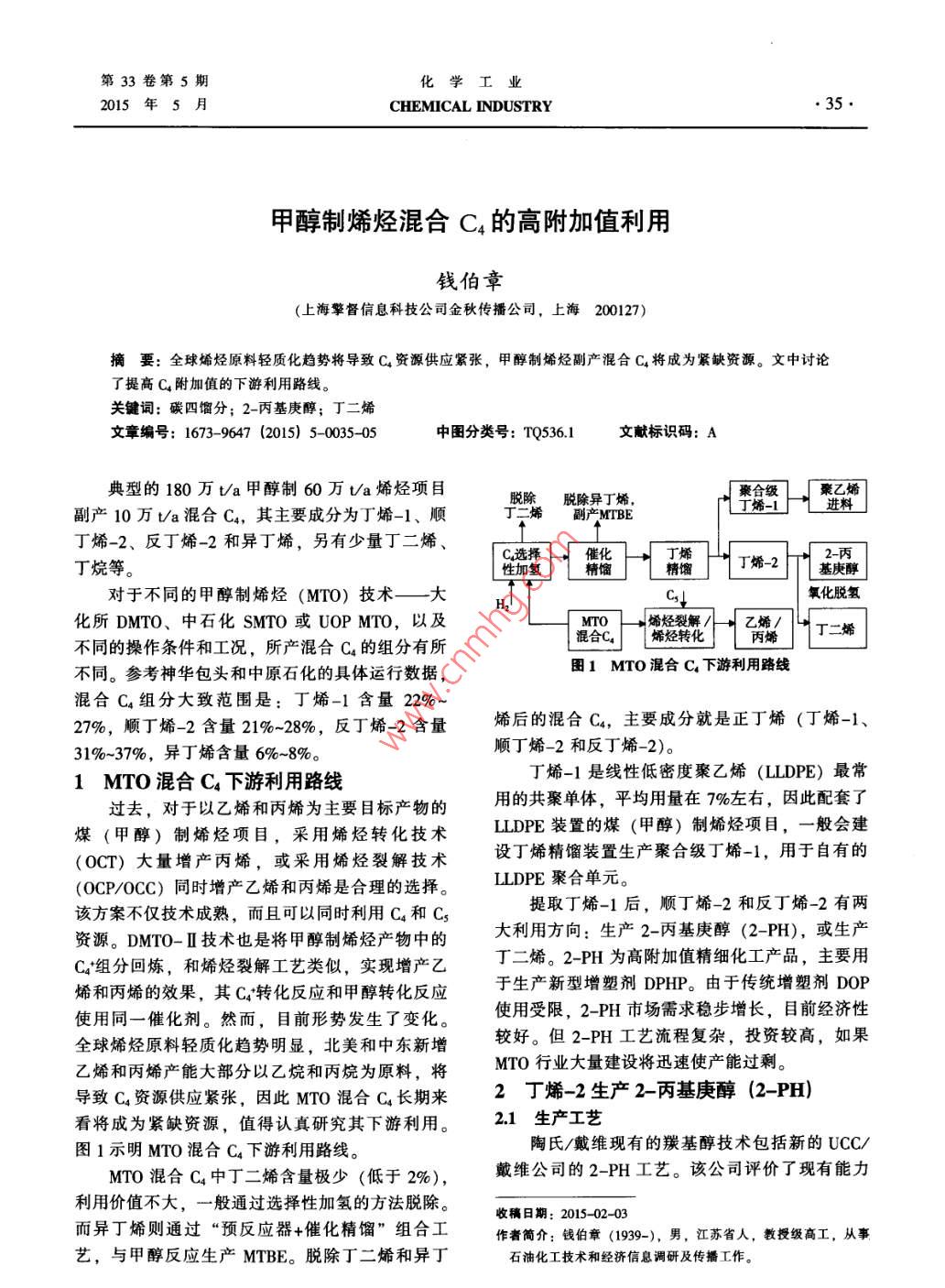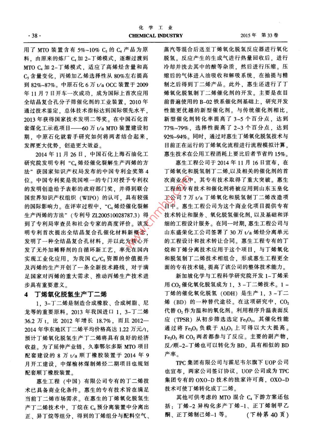 第33卷第5期化學(xué)工業(yè)2015年5月CHEMICAL INDUSTRY●. 35.甲醇制烯烴混合C4的高附加值利用錢伯章(上海擎督信息科技公司金秋傳播公司,上海200127)摘要:全球煽烴原料輕質(zhì)化趨勢將導(dǎo)致C.資源供應(yīng)緊張,甲醇制烯烴副產(chǎn)混合c,將成為緊缺資源。文中討論了提高C4附加值的下游利用路線。關(guān)鍵詞:碳四餾分; 2-丙基庚醇;丁二烯文章編號: 1673- -9647 (2015) 5-0035-05中圖分類號: TQ536.1文獻(xiàn)標(biāo)識碼: A典型的180萬t/a甲醇制60萬Va烯烴項目.脫除脫除異丁烯,副產(chǎn)10萬V/a混合Co,其主要成分為丁烯-1、順副產(chǎn)MTBE丁烯-2、反丁烯-2和異丁烯,另有少量丁二烯、丁烷等。性加袋丁烯-22-丙基庚醇對于不同的甲醇制烯烴(MTO) 技術(shù)-大HCs↓氧化脫氫化所DMTO、中石化SMTO或UOP MTO,以及烯烴裂解/不同的操作條件和工況,所產(chǎn)混合Cs的組分有所混合C4 烯烴轉(zhuǎn)化丁二烯不同。參考神華包頭和中原石化的具體運(yùn)行數(shù)據(jù),圍1 MTO 混合C,下游利用路線混合Cs組分大致范圍是:丁烯-1含量22%-27%,順丁烯-2含量21%-28%,反丁烯-2含量烯后的混合Ca,主要成分就是正丁烯(丁烯-1、31%~37%,異丁烯含量6%~8%。順丁烯-2和反丁烯-2)。1 MTO混合C4下游利用路線丁烯-1是線性低密度聚乙烯(LLDPE) 最常過去,對于以乙烯和丙烯為主要目標(biāo)產(chǎn)物的用的共聚單體,平均用量在7%左右,因此配套了煤(甲醇)制烯烴項目,采用烯烴轉(zhuǎn)化技術(shù)LDPE裝置的煤(甲醇)制烯烴項目,一般會建(OCT)大量增產(chǎn)丙烯,或采用烯烴裂解技術(shù)設(shè)丁烯精餾裝置生產(chǎn)聚合級丁烯-1,用于自有的(OCP/0CC)同時增產(chǎn)乙烯和丙烯是合理的選擇。ILDPE聚合單元。該方案不僅技術(shù)成熟,而且可以同時利用c,和c,提取丁烯-1后,順丁烯-2和反丁烯-2有兩資源。DMTO-I技術(shù)也是將甲醇制晞烴產(chǎn)物中的大利用方向:生產(chǎn)2-丙基庚醇(2-PH), 或生產(chǎn)C*組分回?zé)?,和烯烴裂解工藝類似,實現(xiàn)增產(chǎn)乙丁二烯。2-PH為高附加值精細(xì)化工產(chǎn)品,主要用烯和丙烯的效果,其C;轉(zhuǎn)化反應(yīng)和甲醇轉(zhuǎn)化反應(yīng)于生產(chǎn)新型增塑劑DPHP。由于傳統(tǒng)增塑劑DOP使用同一催化劑。 然而,目前形勢發(fā)生了變化。使用受限,2-PH市場需求穩(wěn)步增長,目前經(jīng)濟(jì)性全球烯烴原料輕質(zhì)化趨勢明顯,北美和中東新增較好。但2-PH工藝流程復(fù)雜,投資較高,如果乙烯和丙烯產(chǎn)能大部分以乙烷和丙烷為原料,將MTO行業(yè)大量建設(shè)將迅速使產(chǎn)能過剩。導(dǎo)致Cs資源供應(yīng)緊張,因此MTO混合c,長期來2丁烯-2生產(chǎn)2- -丙基庚醇(2-PH)看將成為緊缺資源,值得認(rèn)真研究其下游利用。2.1生產(chǎn)工藝圖1示明MTO混合C4下游利用路線。陶氏/戴維現(xiàn)有的羰基醇技術(shù)包括新的UCC/MTO混合C4中丁二烯含量極少(低于2%),戴維公司的2-PH工藝。該公司評價了現(xiàn)有能力利用價值不大,一般通過選擇性加氫的方法脫除。收稿日期: 2015- -02-03而異丁烯則通過“預(yù)反應(yīng)器+催化精餾”組合工.作者簡介:錢伯章(1939-), 男,江蘇省人,教授級高工,從事藝,與甲醇反應(yīng)生產(chǎn)MTBE。脫除丁二烯和異丁石油化工技術(shù)和經(jīng)濟(jì)信息調(diào)研及傳播工作?;瘜W(xué)工業(yè)●36●CHEMICAL INDUSTRY2015年第33卷和Cg~C1o醇市場,包括關(guān)鍵原料的適用性,并評酸酯增塑劑。圖2示明了采用低壓羰基化工藝生估了在給定價格情況下,從抽余物-2生產(chǎn)2-EH、產(chǎn)不同羰基醇產(chǎn)品的路線。異癸醇、異壬醇與從抽余物-2生產(chǎn)2-PH的生產(chǎn)低壓羰基合成技術(shù)的應(yīng)用也包括生產(chǎn)2-丙基經(jīng)濟(jì)性比較。庚醇的過程,這是替代2-EH應(yīng)用不斷增長的增鄰苯二甲酸二辛酯(DOP) 增塑劑因安全性塑劑醇,2-丙基庚醇可來自混合丁烯物流,以及問題正在迅速退出工業(yè)發(fā)達(dá)國家的增塑劑市場,包括從C12-14費(fèi)托合成烯烴生產(chǎn)C12-15 范圍表面活作為替代產(chǎn)品,以2- _丙基庚醇(2-PH)為主要原性劑醇的過程。該技術(shù)也適用于使庚烯-1轉(zhuǎn)化過料的鄰苯二甲酸二(2-丙基庚)酯(DPHP) 成為程裝置中作為組分,庚烯-1可來自于費(fèi)托合成產(chǎn)增塑劑生產(chǎn)的良好選擇。品提取的共聚單體級。陶氏/戴維公司基于SELECTOR LPOxo低壓表1幾種增塑劑醇類及 制取的鄰苯二甲酸酯增塑劑羰基化技術(shù)平臺開發(fā)的生產(chǎn)2丙基庚醇工藝技術(shù)醇類已經(jīng)驗證,并推向商業(yè)化市場。2-EH (C)辛醇(2-乙DOP (鄰苯二甲酸二辛酯)將MTO裝置副產(chǎn)的--定數(shù)量相對低價的混合基己醇)C4烯烴轉(zhuǎn)化為高價值的2-丙基庚醇(市場價格高2-PH (Co) 2-丙基庚醇DPHP (鄰苯二甲酸二(2-丙于辛醇)可帶來較高的經(jīng)濟(jì)效益(注: 2010年7基庚)酯月,由丁烯生產(chǎn)的2-丙基庚醇市場價為36 500INA (C2) 異壬醇DINP (鄰苯二甲酸二異壬酯)IDA (C1n) 異癸醇DIDP (鄰苯二甲酸二異癸酯)元/t,由丙烯生產(chǎn)的辛醇為13 200元/t)。利用低壓羰基化技術(shù)可將混合Ca烯烴中的丁2.2市場趨勢烯-1和丁烯-2轉(zhuǎn)化成戊醛,進(jìn)而轉(zhuǎn)化成2-丙基2-PH是一-種更加環(huán)保安全的增塑劑原料醇:庚醇,從而使混合Ca烯烴的利用價值實現(xiàn)最大基于環(huán)保和健康安全考慮,全球趨勢是使用更高七。相對分子質(zhì)量、低揮發(fā)性和更加