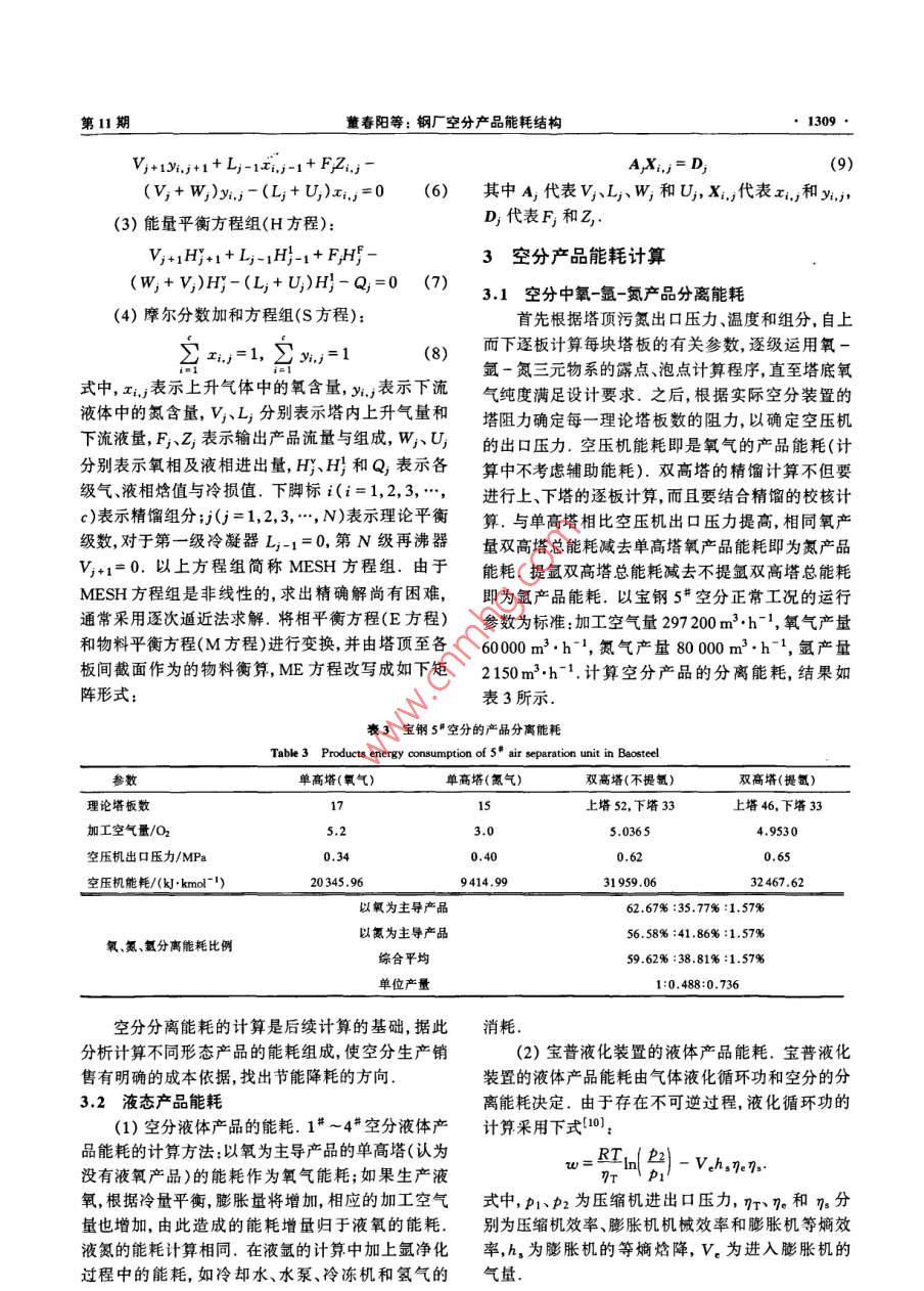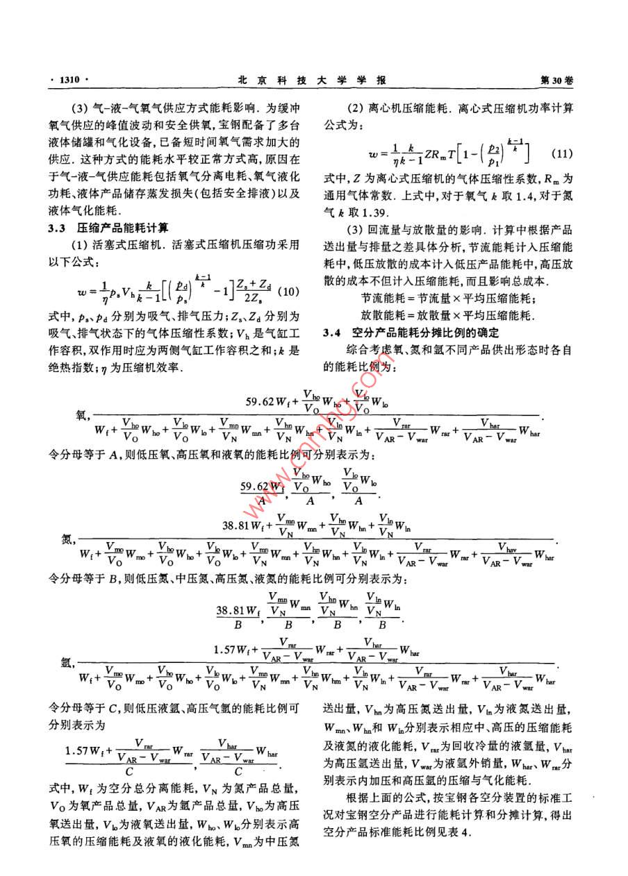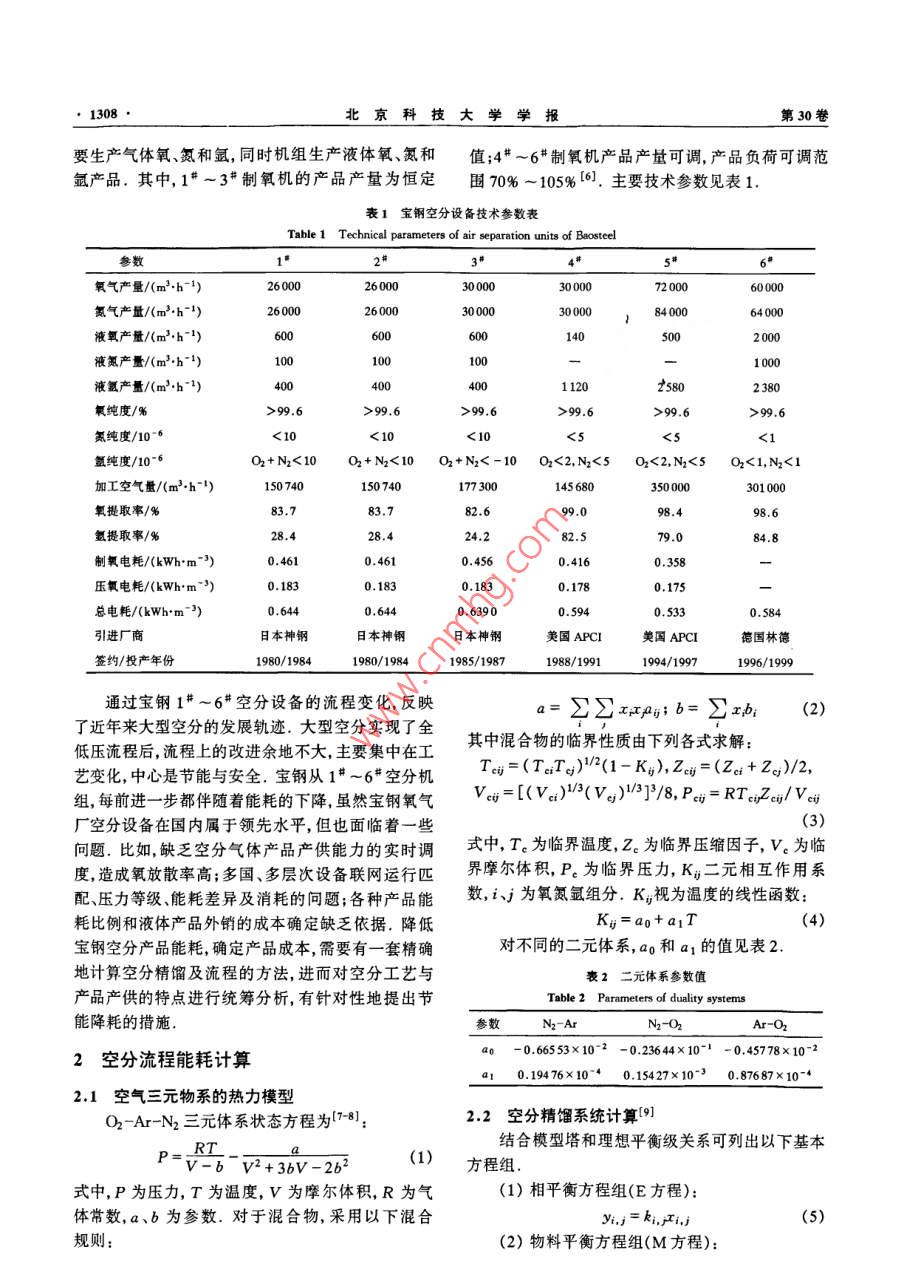 第30卷第11期北京科技大學學報vo.30No.112008年11月Journal of University of Science and Technology BeijingNov,2008鋼廠空分產(chǎn)品能耗結(jié)構(gòu)董春陽1)王立1)張延平2)1)北京科技大學機械工程學院,北京1000832)首鋼技術(shù)研究院,北京100043摘要針對鋼廠的空分現(xiàn)狀及存在的問題,從空分精餾原理出發(fā),以空分流程以及空分產(chǎn)品的能耗作為切入點,提出合理計算氧、氮和氬產(chǎn)品成本的方法,并將該方法應用于各種空分產(chǎn)品的能耗以及能耗分攤比例的計算.該方法解決了由于氧、氮和氬互為副產(chǎn)品而帶來的單個產(chǎn)品能耗無法確定的問題,消除了以往計算產(chǎn)品能耗時人為規(guī)定能耗分攤比例的缺點關(guān)鍵詞鋼廠;空氣分離;能耗;能耗結(jié)構(gòu)分類號TQ116.11Energy consumption structure of air-separation products in steel plaDONG Chunyang", WANG Li", ZHANG Yanping21)School of Mechanical Engineering, University of Science and Technology Beijing, Beijing 100083, China2)Shougang Research Institute of Technology, Beijing 100043, ChinaABSTRACT Aiming at the present situation of air separation units in a steel plant, a rational method of calculating the costs of oxy-gen, nitrogen and argon was proposed by considering the air separation process and the energy consumption of air-separation products,and was used to calculate the energy consumption and the apportioning proportion of air-separation products. The presented methodcan not only solve the problem that the energy consumption of single product cannot be accurately calculated because oxygen, nitrogenand argon are by-products one another, but also eliminate the disadvantage that the apportioning proportion is arbitrarily controlleKEY WORDS steel plant; air separation; energy consumption; energy consumption structure在鋼鐵企業(yè)中,低溫精餾空氣分離法是一個高產(chǎn)不同控制方式的空分設(shè)備的能耗有很大差別,多能耗的生產(chǎn)過程,我國大型現(xiàn)代化鋼鐵企業(yè)的空分臺機組運行有最優(yōu)化(產(chǎn)量最高能耗最低)的問題設(shè)備生產(chǎn)電耗約占整個企業(yè)電耗的1/71,尤其冶因此,準確確定氧氬和氮產(chǎn)品能耗分攤比例,對于金企業(yè)對氧氣、氮氣和氬氣的依賴程度不斷增有效降低能耗與提高經(jīng)濟效益,起著非常重要的作加2.如何降低單位制氧能耗一直是鋼鐵企業(yè)關(guān)注用S]的主要問題本文以寶鋼制氧廠的空分設(shè)備為例,提出合理能耗與空分設(shè)備的大小流程和液體的提取量計算氧、氮和氬產(chǎn)品成本的方法以及降低產(chǎn)品成本等均有關(guān),目前國內(nèi)外空分設(shè)備能耗的統(tǒng)計與計算的措施,并且定量比較了各種制氧工序的能耗,以此方法不統(tǒng)一3,長期以來空分裝置產(chǎn)品的能耗計算作為選擇制氧工藝的科學依據(jù)一直缺少準確的計算依據(jù),氧、氬和氮能耗分攤比例一般都是根據(jù)經(jīng)驗估計.對于確定的空分設(shè)備,非1寶鋼能源部氧氣分廠空分現(xiàn)狀與存在的變工況運行時能耗分攤比例相對穩(wěn)定4,不同類型問題(或流程)空分裝置的產(chǎn)品能耗比例按照相同的比例寶鋼(集團)公司在20世紀80~90年代進行的分攤,不同狀態(tài)產(chǎn)品也按照統(tǒng)一能耗計算方法計算三期工程建設(shè)中先后從國外引進了六臺大這實際上是不合理的.不同流程形式、不同廠家生型空分設(shè)備.寶鋼制氧系統(tǒng)現(xiàn)有六臺制氧機組,主收稿日期:2007-10-19修回日期:200805-28作者簡介1977-),男,助理研究員,碩士,Emal: tenshi@ustb, edu. en北京料技大學學報第30要生產(chǎn)氣體氧、氮和氬,同時機組生產(chǎn)液體氧、氮和值;4*~6#制氧機產(chǎn)品產(chǎn)量可調(diào),產(chǎn)品負荷可調(diào)范氬產(chǎn)品,其中,1#~3#制氧機的產(chǎn)品產(chǎn)量為恒定圍70%-105%6.主要技術(shù)參數(shù)見表1表1寶鋼空分設(shè)備技術(shù)參數(shù)表Table 1 Technical parameters of air separation units of Baoste氧氣產(chǎn)量/(m3h-1)26000260003000060000氮氣產(chǎn)量/(m3h-1)2600030000300008400064000液氧產(chǎn)量/(m3h1)6002000液氮產(chǎn)量/(m3h1)液氬產(chǎn)量/(m3h1)25氧純度/%>99.6>99,6>99.6>99,6氮純度/10-6<10氬純度/1O2+N2<10O2+N2<10O2+N2<-10O2<2,N2<5O2<2,N2<5O2<1,N2<1加工空氣量/(m3hb)50740145680氧提取率/%82,6氫提取率/%制氧電耗/(kWhm-3)0.4610.358壓氧電耗/(kWhm-3)0.1830.1830.175總電耗/(kWhm30.6440.5940.5330.584引進廠商日本神鋼日本神鋼日本神鋼美國APCI美國APCI德國林德簽約/投產(chǎn)年份1980/19841985/198798/19911994/19971996/1999通過寶鋼1#~6#空分設(shè)備的流程變化,反映a=∑∑xP;b=∑x1(2)了近年來大型空分的發(fā)展軌跡.大型空分實現(xiàn)了全低壓流程后,流程上的改進余地不大,主要集中在工其中混合物的臨界性質(zhì)由下列各式求解藝變化,中心是節(jié)能與安全.寶鋼從1#~6“空分機T=(TaT)2(1-K),z=(za+2)/2組,每前進一步都伴隨著能耗的下降,雖然寶鋼氧氣V=[(vci)(vci)3]/8, Pc=RTei zei/vei廠空分設(shè)備在國內(nèi)屬于領(lǐng)先水平,但也面臨著一些(3)問題.比如缺乏空分氣體產(chǎn)品產(chǎn)供能力的實時調(diào)式中,T為臨界溫度,Z。為臨界壓縮因子,V為臨度,造成氧放散率高;多國、多層次設(shè)備聯(lián)網(wǎng)運行匹界摩爾體積,P為臨界壓力K二元相互作用系配壓力等級能耗差異及消耗的問題;各種產(chǎn)品能數(shù),i為氧氮氬組分,K視為溫度的線性函數(shù):耗比例和液體產(chǎn)品外銷的成本確定缺乏依據(jù).降低Ki=ao+a
