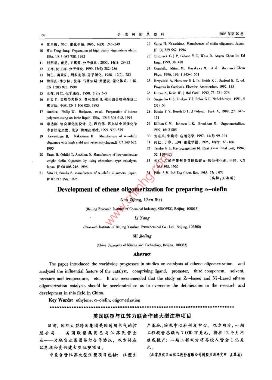 合成樹脂及塑料,2003.20(5): 61綜述CHINA SYNTH:TIC RESIN AND PLSTICS乙烯齊聚制備高級a-烯烴的研究新進(jìn)展郭子方陳偉(中國石油化工股份有限公司北京化工研究院,北京。10013)李楊糜家鈴(中國石油化I股份有限公司北京燕山分公司研究院.北京,102500)(中國礦業(yè)大學(xué),北京,10083)摘要:介紹了國內(nèi)外乙烯齊秦催化劑的研究進(jìn)展,對乙始齊粲催化體系的影響因素(配體助惱化劑第二組分、溶劑、壓力和溫度等)進(jìn)行了分析。針對我國乙烯齊豪研究的差距與不足,指出應(yīng)加快Zr系及Ni系乙烯齊聚催化刺的研究。關(guān)鍵詞:乙娣a-烯烴齊繁近年來,隨著烯烴I業(yè)和精細(xì)化工工業(yè)的發(fā)人成倍增加,各種類型的催化體系層出不窮,齊聚展,線型a-烯烴的需求迅速增加,發(fā)展成為一種技術(shù)也有了很大的發(fā)展?,F(xiàn)在已報道的催化體系重要的有機(jī)化工原料,其用途十分廣泛。通常,主要有:烷基鋁類.Ti系.Zr系、Ni系、Cr系、FeC°~C;低碳線型a-烯烴可用作低密度驟乙烯系、Co系、W系以及最近開始研究的離子液體等。(LDPE)和線型低密度聚乙烯(LDPE)的共聚單體;Ci以及部分Cg和C;可用以制備聚a-烯烴1乙烯齊聚制 備a-烯烴催化劑的分類(PAO),用于生產(chǎn)航空、耐燃燒以及在惡劣環(huán)境下1.1烷基鋁類 催化劑使用的高級潤滑油;Ci~C1i a-烯烴用于制備高烷基鋁催化乙烯齊聚制備線型高級ax-烯烴級洗滌劑、表面活性劑、化妝品、合成調(diào)味品等;的技術(shù)是最早開發(fā)出來的乙烯齊聚技術(shù),也是迄Cg及其以上的a-烯烴可直接或間接用于潤滑油今為止工業(yè)生產(chǎn)a-烯烴的主要方法之一。添加劑及鉆井液、粘合劑密封劑和涂料等;同時,用于催化乙烯齊聚的催化劑主要是三乙基線型a-烯烴還用于合成增塑劑、環(huán)氧化物、胺、直鋁,其催化理論主要是以Ziegler發(fā)明的兒種反應(yīng)鏈硫醇、脂肪酸以及各類添加劑、低粘性合成油為基礎(chǔ)。烷基鋁催化劑催化乙烯聚合時因為聚合等川。條件苛刻.催化劑產(chǎn)率低、產(chǎn)品質(zhì)量不好,逐漸被a-烯烴的生產(chǎn)方法主要有烷烴脫氫法、蠟裂新出現(xiàn)的催化劑所替代。解法、萃取分離法以及乙烯齊聚法等。目前,工業(yè)1.2 Ti 系催化劑上主要采用乙烯齊聚法制備ax ~烯烴,烷烴脫氫和Ti系催化劑是研究最早的乙烯齊聚絡(luò)合催蠟裂解等其他方法均因收率低、成本高、產(chǎn)品質(zhì)化劑。該催化體系主要包括Ti(OR)、TiClL、Cp2TiCl2量不好和工藝復(fù)雜等原因逐漸淡出。據(jù)統(tǒng)計,等同。 其中,研究最多的為Ti(OR)-AIR,催化體2000年全球a-烯烴生產(chǎn)能力為2.92 M/a,其中收稿日期: 2002-11-25。2.75 Mt/a均為乙烯齊聚法,約占總生產(chǎn)能力的修改稿收到日期: 2003-06-26。94%2l。作者簡介:郭子方,29歲,碩士,現(xiàn)從事聚烯烴茂金屬催80年代以來,乙烯齊聚的研究愈來愈得到廣化劑領(lǐng)城的研究工作,已發(fā)表學(xué)術(shù)論文多篇。聯(lián)系電話:泛重視。各國在乙烯齊聚制備a-烯烴上的科研投(010)64216131轉(zhuǎn)2604; E-mail: guor@bricisc.cno第S期郭子方等.乙烯齊察制備高級a-烯烴的研究新進(jìn)展.63.等人陶應(yīng)用原位NMR和延X射線衍射方法也表2 Zr 系乙嫣卉聚均相催化劑叫研究了Ni(COD)/Ph,PCH2C(CF)20H體系催化乙Tab.2 Zr-based ethylene oligomerization homogeneouscatalysts烯齊聚的反應(yīng)機(jī)理,鑒別了上述反應(yīng)活性物種的催化劑主產(chǎn)物結(jié)構(gòu).1.4 Zr 系催化劑Z(I/EAIClCom a-烯烴Zr系催化劑體系是匕烯齊聚的另一個研究ZrCL/Me.AlEtMlLCIlCum線璽烯烴72%, Cn及以上.為28%熱點。ZrCIJEILAICICHLC0OELCama-烯烴69%, Co及1.4.1 Kaminsky 型催化劑以上為31%茂金屬催化劑是催化烯烴高聚的--種重要體ZrCI/EIlAICIBuONaCom線型烯烴系。適當(dāng)改變反應(yīng)條件可以使其成為有效的烯烴Zr(CF,COCHCOCH)Cl/MeAICl線型婚烴齊聚催化劑。沈玉梅等人認(rèn)為,茂金屬催化劑中Zr(BuCOCHC0OC;H)C]MnpAICr C4a 線型ax-嫦烴的CpzZrCl2及其衍生物為4價Zr絡(luò)合物,這有利Z(X)CIl/R*AI(X 為0COR,OSO,R) Cr 線型烯烴Zr0(OC0R),Cl2 /EgAL.CI/R20Can線型a-烯烴于乙烯齊聚,只是水解烷基鋁的烷基化能力較弱,Zr(0P/)EsyALCL,1-已烯還原性較強(qiáng),這是它作為乙烯高聚催化劑的有利Zr(OBu)VEbAICVCH,COOEtCuma-孀烴90%, Ca及之處,也是調(diào)變成齊聚催化劑的困難所在。以上為10%用于乙烯齊聚的茂金屬催化劑主要有Z(0BU,ELAICICH,COOCH.CHs Cuo a-嫌烴21%, CaoCp2ZrCl/RjAI(IR為Me,Et,i-Bu)和Cp:ZrC12/異丁基為52%Z(0CH(H)J/EsAlLCl,Cum線型a-烯烴氯化鋁(IBA0)I,IndzZr(OCH, -3,5-Mex)2JIndZrClZ(CF2COCHCOCH)VEInAIClCou烯烴(OCH-3,5- Me)和IndZrClyRyAl體系叫, Cp:ZrCl2/([HCH{4cz0A)Lp/EILAICICroa-媚烴水解RzAl體系|調(diào),CpZr(OAr)/EAO(Ar為CHsp-(RCOO),2zCLNCHhM.線型烯烴CH,Me .m-CJHNO2sp-CjHNO2)體系凹等。(RCOO),ZrCl J(CH)ALC)...Caoa-唏烴.1.4.2鹵化鋯和烷氧基Zr類催化劑烷氧基氧化物216.6-近年來,國外化學(xué)家對ZrCl4和烷氧基Zr類TEMPO催化劑催化乙烯齊聚合成直鏈低碳a-烯烴的研* t為權(quán)丁基。兗越來越活躍,研究成果大多以專利發(fā)表,表明這有顯著的蒸氣壓,可用于高真空體系;穩(wěn)定,不易.方面的研究具有重要的工業(yè)應(yīng)用價值。此類典型分解;表現(xiàn)出Bronsted ,Lewis酸性和超酸性,且酸的催化劑體系見表2。性可調(diào);并能提供高極性不配位的環(huán)境,是解央配何仁等人網(wǎng)利用電子順磁共振譜對Zr系位金屬催化劑溶解