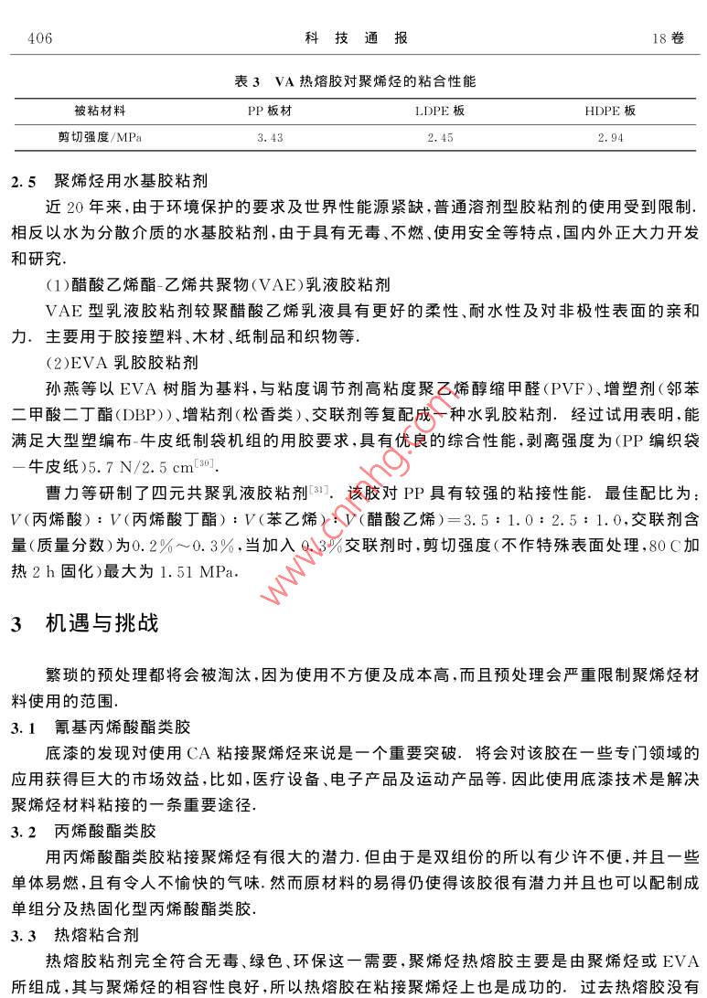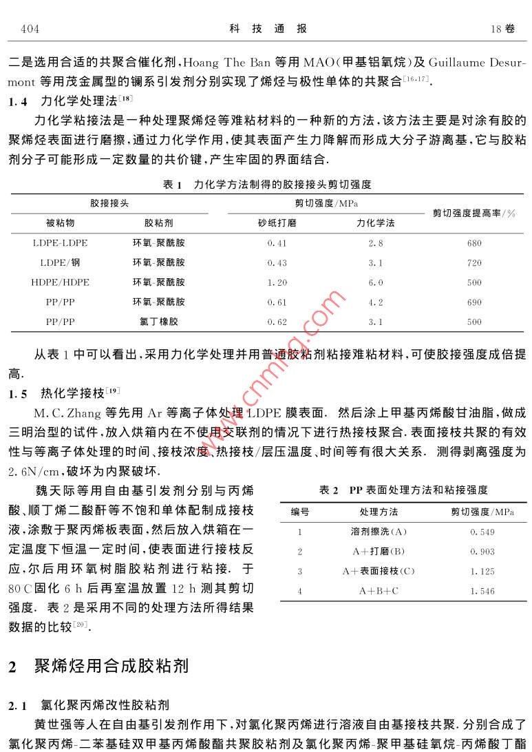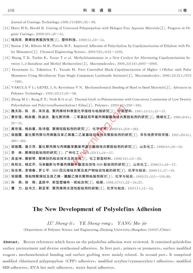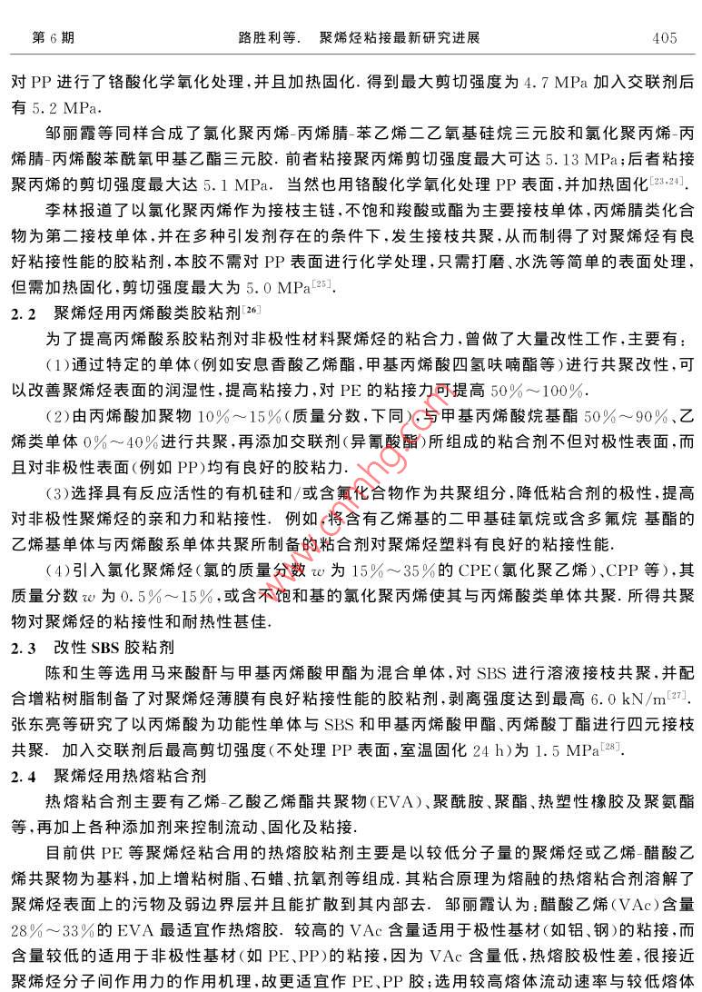 Vol.18 No.5第18卷第5期Sep.2002BULLETIN OF SCIENCE AND TECHNOLOGY2002年9月聚烯烴粘接最新研究進(jìn)展路勝利,葉勝榮,楊慕杰(浙江大學(xué)高分子科學(xué)與工程學(xué)系,浙江杭州310027)摘要:綜述了近年來關(guān)于聚烯烴粘接方面的最新文獻(xiàn),包括聚烯烴的表面預(yù)處理及各種聚烯烴用合成膠粘劑.前一 部分主要論述了底漆或促進(jìn)劑、表面改性劑、力化學(xué)粘接及表面接枝等技術(shù).后-部分則討論了氯化聚丙烯改性膠粘劑、改性丙烯酸系膠粘劑.改性SBS膠粘劑.熱熔膠粘劑及水性膠粘劑.關(guān)鍵詞:聚烯烴(PE、PP);粘接;表面預(yù)處理;合成膠粘劑.中圖分類號: TQ430. 7+7文獻(xiàn)標(biāo)識碼: A文章編號:1001-7119(2002 )06- 0402-070引言1.2]聚烯烴(主要是聚乙烯與聚丙烯)類塑料產(chǎn)量居塑料首位,由于具有機(jī)械強度高、耐熱性好、良好的化學(xué)穩(wěn)定性及成本低廉等特點,其薄膜、片材及各種制品廣泛地應(yīng)用于包裝工業(yè)、汽車工業(yè)、建筑工業(yè)等領(lǐng)域.例如美國超過80%的家用塑料及50%的玩具都是由聚烯烴制造的.在聚烯烴應(yīng)用過程中,比如與其它材料的連接、熱粘合、涂層、印刷等,常需要它具有良好的粘合性.然而聚烯烴較為惰性的化學(xué)結(jié)構(gòu)決定了這類高分子材料的表面能低、極性小其粘合只能是依靠微弱的色散力,故吸附性差;常溫下又很難被溶劑所溶脹導(dǎo)致膠粘劑難以在聚烯烴表面發(fā)生高分子鏈和鏈段的擴(kuò)散和纏結(jié);且在加工過程中經(jīng)常需要添加各種助劑及聚烯烴本身也有低分子量物質(zhì),這些物質(zhì)很容易析出在聚烯烴的表面形成弱邊界層,不利于粘接、由于聚烯烴以上不利粘合的特點,人們想出很多方法來進(jìn)行改善.例如:對其進(jìn)行表面處理來提高其極性及表面能;合成結(jié)構(gòu)相似、表面能相近的膠粘劑進(jìn)行直接粘接等、本文綜述了近年來的聚烯烴的最新表面處理方法及聚烯烴用各種合成膠粘劑的研究進(jìn)展.1聚 烯烴預(yù)處理1.1底漆及粘接促進(jìn)劑以前的-些預(yù)處理或改性方法(比如物理機(jī)械處理法[3]、化學(xué)氧化法[4]、氣體熱氧化法[5]、火焰法[6]、電暈法[7]、 等離子體法[8]等)都是不方便的、耗時且有時是昂貴的.但使用底漆盡管收稿日期:2001-09-18;修訂 日期:2001-12-20作者簡介:路勝利,男,1976年生,山東濟(jì)寧人,博士.第6期路勝利等.聚烯烴粘接最新研究進(jìn)展403有少許不方便,但卻是-個適合產(chǎn)品流水線的較佳選擇.1.1.1用于氰基丙烯酸酯類膠的底漆或促進(jìn)劑由于氰基丙烯酸酯類膠的單組分、快速固化及易用性等優(yōu)點,使得其廣泛應(yīng)用于產(chǎn)品裝配.行業(yè)、然而和其它多數(shù)膠粘劑一樣,對于聚烯烴等低能材料也無能為力.但樂泰公司(LoctiteCorp.)卻取得了重大突破.即涂上適量的底漆后能明顯提高粘接強度.例如,涂.上三烷基的羧酸銨鹽,能產(chǎn)生6.89MPa的剪切強度,破壞為材料的本體破壞.美國康涅狄格州大學(xué)JIYDEYANG等在PP和LDPE表面涂上100nm厚的TPP(三苯基膦)或質(zhì)量分?jǐn)?shù)w為0.03%~0.50%的CoAcer(乙酰丙酮化鈷)甲苯溶液,用CA(a-氰基丙烯酸乙酯膠粘劑)粘接,其粘接強度超過了聚烯烴的本體剪切強度[9]. JIYDE YANG等認(rèn)為:底漆溶解于聚合物表面里,便于聚烯烴與單體型的CA膠能更好的互穿、滲透.底漆催化CA固化并導(dǎo)致膠粘劑與被粘物鏈的纏結(jié).1.1.2氯化聚丙烯作為底漆或促進(jìn)劑的研究[10~12]先用50: 50的異丙醇與低沸點的脂(肪)族化合物的混合液擦洗PP,然后涂上氯化聚丙烯(CPP)溶液,Simon Waddington等人用XPS(X射線光電子能譜)和SIMS(二次離子質(zhì)譜)等技術(shù)較詳細(xì)地論證了粘接機(jī)理.1.1.3無鹵素水溶型的粘接促進(jìn)劑[13]Horst Hintze - Brining等報道了三種無鹵素水溶型的聚烯烴(尤其適用聚丙烯)用粘接促進(jìn)劑.-是以FeCls為催化劑,含有吡啶、乙酸、過氧化氫等組分可以在聚烯烴表面發(fā)生催化氧化的水溶型的體系;二是以疊氮基三乙氧基硅烷為相增容劑的水性溶膠,在UV光下發(fā)生化學(xué)反應(yīng),導(dǎo)致在聚烯烴表面引入相應(yīng)的含氮基團(tuán);三是聚丙烯酸在聚丙烯上的接枝物,該接枝物是在聚烯烴的烷基芳香性溶劑中,加入(甲基)丙烯酸單體共聚合而得.爾后變成相應(yīng)的水性分散液作為粘接促進(jìn)劑、前二種是化學(xué)成鍵粘接,第三種是通過擴(kuò)散進(jìn)行的物理粘接.1.2聚烯烴表面改性劑C4]聚烯烴材料表面改性劑的研究是聚烯烴材料表面處理方法中的最新動向,其改性機(jī)理同上述其它使材料表面發(fā)生化學(xué)變化的處理方法明顯不同.聚烯烴材料表面改性劑分子結(jié)構(gòu)中含有兩類基團(tuán),一類是親油墨、粘合劑的親水基團(tuán),如羥基、羧基、羰基、胺基等.另一類是親聚烯烴類樹脂的親油基團(tuán).如長鏈烷基、聚氧乙烯基等.將聚烯烴材料表面改性劑同聚烯烴樹脂用混煉機(jī)混合,在成型加工過程中,由于表面張力的作用大分子鏈上的極性基團(tuán)向樹脂表面遷移.并在制品表面富集,使聚烯烴材料表面的極性、接觸角、表面能發(fā)生很大的變化,有利于油墨的粘附和材料之間的粘接.而長鏈烷基則可能同聚烯烴樹脂形成共結(jié)晶(即物理交聯(lián)點),相當(dāng)于將遷移至表面的極性基團(tuán)“錨”在樹脂結(jié)構(gòu)當(d