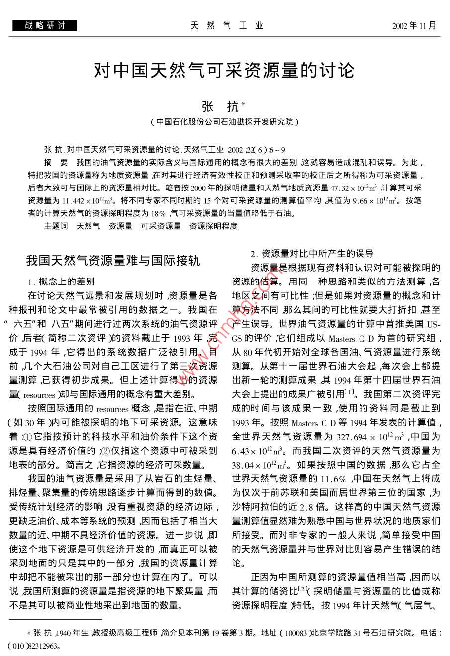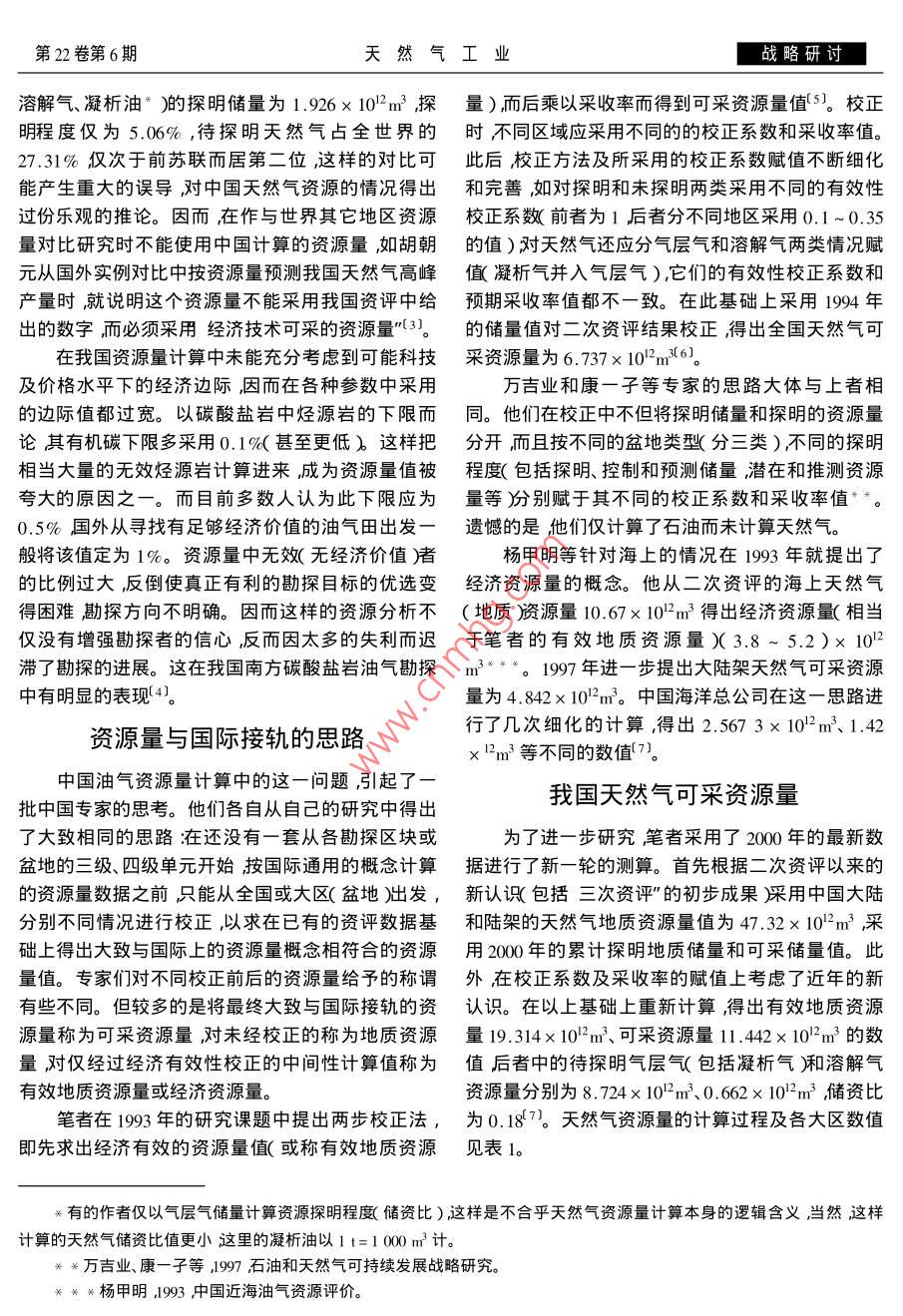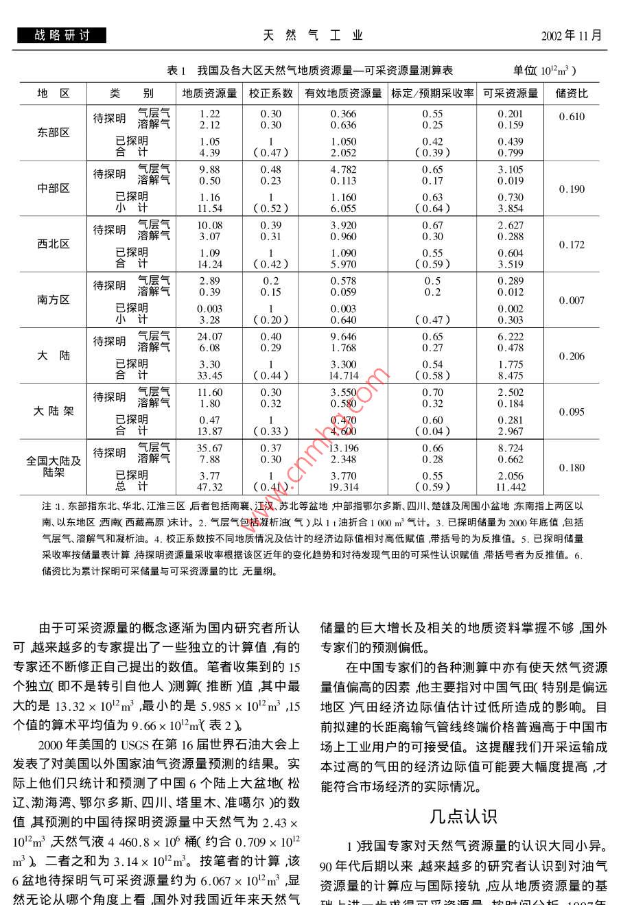 戰(zhàn)略研討天然氣工業(yè)2002年11月對中國天然氣可采資源量的討論張抗〔中國石化股份公司石油勘探開發(fā)研究院)張抗對中國天然氣可采資源量的討論天然氣工業(yè)20022x6)~9摘要我國的油氣資源量的實際含義與國際通用的概念有很大的差別這就容易造成混亂和誤導。為此,特把我國的資源量稱為地質資源量在對其進行經濟有效性校正和預測采收率的校正后之所得稱為可采資源量后者大致可與國際上的資源量相對比。筆者按2000年的探明儲量和天然氣地質資源量47.32×102m3計算其可采資源量為11.442×1032m3。將不同專家不同時期的15個對可采資源量的測算值平均其值為9.66×10}2m3。按筆者的計算天然氣的資源探明程度為18%氣可采資源量的當量值略低于石油。主題詞天然氣資源量可采資源量資源探明程度我國天然氣資源量難與國際接軌2.資源量對比中所產生的誤導資源量是根據現有資料和認識對可能被探明的1.概念上的差別資源的估算。用同一種思路和類似的方法測算,各在討論天然氣遠景和發(fā)展規(guī)劃時資源量是各地區(qū)之間有可比性:但是如果對資源量的概念和計種報刊和論文中最常被引用的數據之一。我國在算方法不同那么其間的可比性就要大打折扣甚至六五"和八五”期間進行過兩次系統(tǒng)的油氣資源評產生誤導。世界油氣資源量的計算中首推美國US價后者簡稱二次資評)的資料截止于1993年完GS的評價它們組成以 Masters l為首的研究組,成于1994年,它得出的系統(tǒng)數據廣泛被引用。目從80年代初開始對全球各國油、氣資源量進行系統(tǒng)前幾個大石油公司對自己工區(qū)進行了第三次資源測算。從第十一屆世界石油大會起每次會上都提量測算已獲得初步成果。但上述計算得岀的資源岀新一輪的測算成果其1994年第十四屆世界石油量 resources知與國際通用的概念有重大差別大會上提出的成果廣被引用1我國第二次資評完按照國際通用的 resources概念是指在近、中期成的時間與該成果一致,使用的資料同是截止到如30年肭可能被探明的地下可采資源。這意味1993年。按照 Masters C d等1994年發(fā)表的計算值,著:①它指按預計的科技水平和油價條件下這個資全世界天然氣資源量為327.694×102m3,中國為源是具有經濟價值的灣僅指這個資源中可被采到6.43×10-2m3。而我國二次資評的天然氣資源量為地表的部分。簡言之它指資源的經濟可采數量。38.04×1032m3。如果按照中國的數據,那么它占全我國的油氣資源量是采用了從巖石的生烴量、世界天然氣資源量的11.6%中國在天然氣上將成排烴量、聚集量的傳統(tǒng)思路逐步計算而得到的數值。為僅次于前蘇聯(lián)和美國而居世界第三位的國家,為受傳統(tǒng)計劃經濟的影響沒有重視資源的經濟邊際,沙特阿拉伯的近2.8倍。這樣高的中國天然氣資源更缺乏油價、成本等系統(tǒng)的預測因而包括了相當大量測算值顯然難為熟悉中國與世界狀況的地質家們數量的近、中期不具經濟價值的資源。進一步說即所接受。而對非專家的一般人來說簡單接受中國使這個地下資源是可供經濟開發(fā)的而真正可以被的天然氣資源量并與世界對比則容易產生錯誤的結采到地面的只是其中的一部分我國的資源量計算論。中卻把不能被采出的那一部分也計算在內了??梢哉驗橹袊鶞y算的資源量值相當高,因而以說我國所測算的資源量是指資源的地下聚集量而其計算的儲資比(2k探明儲量與資源量的比值或稱不是其可以被商業(yè)性地采出到地面的數量。資源探明程度)低。按1994年計天然氣氣層氣張抗940年生教授級高級工程師簡介見本刊第19卷第3期。地址(10∞0863吡京學院路31號石油硏究院。電話(01082312963第22卷第6期天然氣工業(yè)戰(zhàn)略研討溶解氣、凝析油“)的探明儲量為1.926×102m3探量)而后乘以采收率而得到可采資源量值S。校正明程度僅為5.06%,待探明天然氣占全世界的時不同區(qū)域應采用不同的的校正系數和采收率值27.31%僅次于前蘇聯(lián)而居第二位,這樣的對比可此后校正方法及所采用的校正系數賦值不斷細化能產生重大的誤導對中國天然氣資源的情況得出和完善如對探明和未探明兩類采用不同的有效性過份樂觀的推論。因而在作與世界其它地區(qū)資源校正系數前者為1后者分不同地區(qū)采用0.1~0.35量對比研究時不能使用中國計算的資源量如胡朝的值)對天然氣還應分氣層氣和溶解氣兩類情況賦元從國外實例對比中按資源量預測我國天然氣高峰值凝析氣并入氣層氣),它們的有效性校正系數和產量時就說明這個資源量不能采用我國資評中給預期采收率值都不一致。在此基礎上采用1994年出的數字而必須采用經濟技術可采的資源量(3。的儲量值對二次資評結果校正得出全國天然氣可在我國資源量計算中末能充分考慮到可能科技采資源量為6.737×102mx6)及價格水平下的經濟邊際因而在各種參數中采用萬吉業(yè)和康一子等專家的思路大體與上者相的邊際值都過寬。以碳酸鹽巖中烴源巖旳下限而同。他們在校正中不但將探眀儲量和探明的資源量論其有機碳下限多采用0.1%甚至更低)這樣把分開而且按不同的盆地類型分三類)不同的探明相當大量的無效烴源巖計算進來成為資源量值被程度(包括探眀、控制和預測儲量,潛在和推測資源夸大的原因之一。而目前多數人認為此下限應為量等玢別賦于