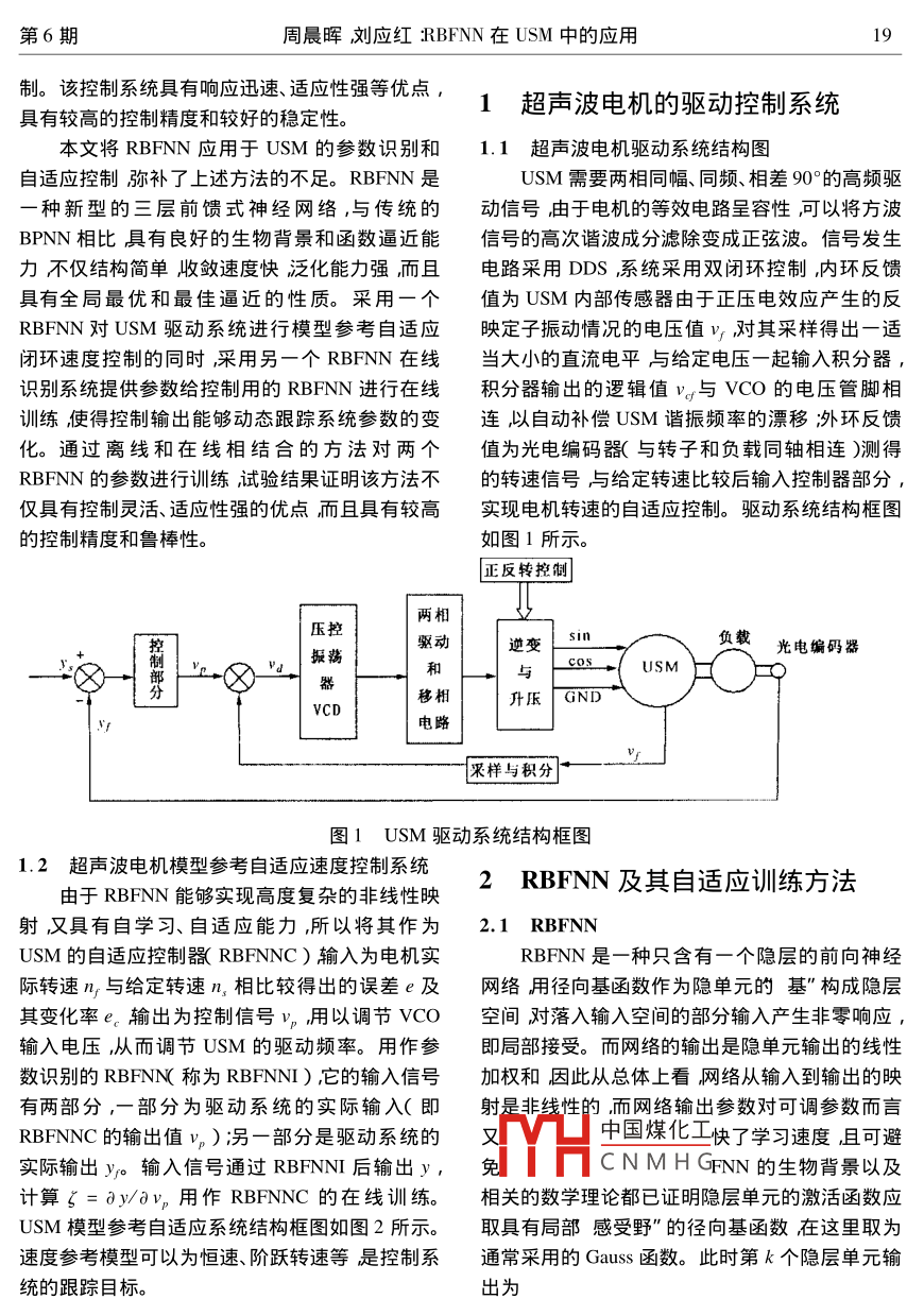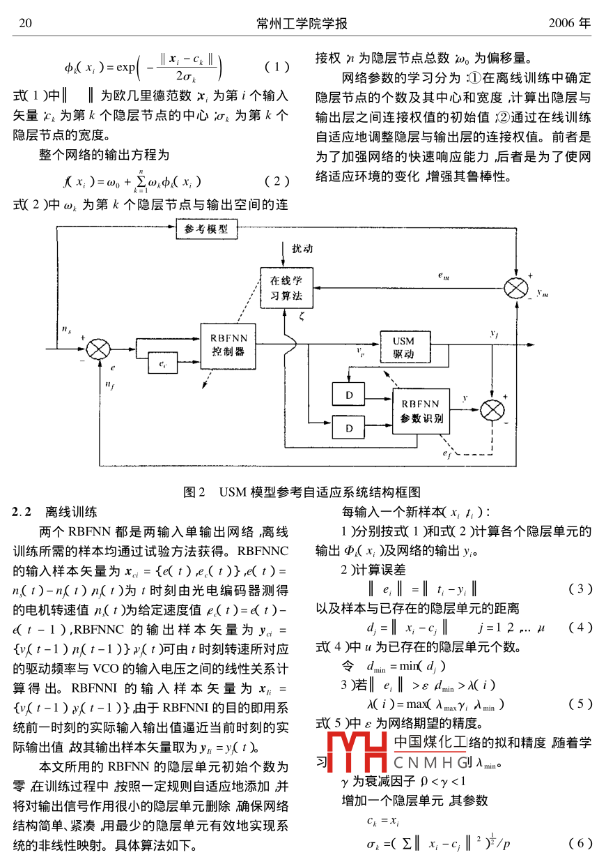 第19卷第6期常州工學院學報Vol 19 No 62006年12月Journal of Changzhou Institute of TechnologyDec.2006RBFN在USM中的應用周晨暉劉應紅福建師范大學福清分校福建福州350300)摘要油于超聲波電機運行的高度非線性在建立超聲波電機的數(shù)學模型很困難的情況下采用神經(jīng)網(wǎng)絡的方法對馬達的溫度或速度等數(shù)據(jù)采集進行訓練是比較理想的方法。文章建立了BF神經(jīng)網(wǎng)絡的方法進行離線和在線相結合的訓練用LABⅤEW7.0建立控制平臺直接調(diào)用MATLAB的神經(jīng)網(wǎng)絡工具箱。仿真表明該系統(tǒng)可以達到速度精確控制的要求。關鍵詞RBFN匯ABⅤIEW超聲波電機 MATLAB中圖分類號TM383/TP183文獻標識碼A文章編號671-0436(200606-0018-040引言性使得數(shù)學建模非常困難至今仍沒有能夠完全表達USM穩(wěn)態(tài)和動態(tài)特性的精確數(shù)學模型。而超聲波電機〔 Ultrasonic motor簡稱USM)是且USM壓電陶瓷的諧振頻率會隨著溫度、電源20世紀末期發(fā)展起來的一種新型驅(qū)動電機。它電壓、負載轉(zhuǎn)矩以及定轉(zhuǎn)子之間靜壓力等外界條的基本結構及工作完全不同于傳統(tǒng)的電磁馬達,件的變化而發(fā)生漂移。這些都增加了對USM的沒有繞組與磁路不以電磁作用傳遞能量而是控制難度。在目前已有的智能控制方式中,人工種利用超聲波振動能作為驅(qū)動源的新原理電機,神經(jīng)網(wǎng)絡控制因其可以較好地解決非線性、不確是電機制造、機械振動學、摩擦學、功能材料、電子定性控制問題所以人工神經(jīng)網(wǎng)絡在超聲波電機技術和自動控制等學科綜合交叉發(fā)展的產(chǎn)物。它的控制中得到極大的應用。如日本學者 Senjyu將電能通過壓電陶瓷轉(zhuǎn)變?yōu)闄C械振動能然后漢和Fa- Jeng lin先后將BP神經(jīng)網(wǎng)絡和模糊神經(jīng)借助摩擦力將杋械振動能轉(zhuǎn)變?yōu)橹本€運動或旋轉(zhuǎn)網(wǎng)絡應用于USM的控制取得了較好的效果。運動。由于具有其他電機所沒有的特性因此引但是BP神經(jīng)網(wǎng)絡在函數(shù)逼近方面存在學習收斂起了學術界和企業(yè)界的重視在機器人、微型機速度慢、易于陷入局部極小等缺點且在理論上與械、醫(yī)學、航空航天、儀器儀表等領域有著廣泛的生物背景不十分相符。模糊神經(jīng)網(wǎng)絡用神經(jīng)網(wǎng)絡應用前景。與法拉第電磁式電機相比超聲電機實現(xiàn)了模糊系統(tǒng)從而可以通過訓練來求得其中的優(yōu)點是泜轉(zhuǎn)速、大轉(zhuǎn)矩、無需減速機構就可直的參數(shù)。但由于要對數(shù)據(jù)進行模糊化和反模糊化接驅(qū)動負載結構簡單體積小重量輕記起動、停處理需要增加一個隱層這將增加結構的復雜程止響應快響應時間小于毫秒級不產(chǎn)生也不受電度和計算時間網(wǎng)絡的訓練速度通常比較慢且很磁干擾不怕輻射,可用于低溫的環(huán)境洧有自保持難中國煤化工力矩無齒輪間隙,精密定位不需潤滑劑運行M控制策略,系統(tǒng)采安靜、噪聲小??梢哉f超聲電機技術是處于當今用從環(huán)玩小用丁下償定子機械振動頻率世界高新技術之的漂移外環(huán)采用徑向基神經(jīng)網(wǎng)絡 RBFNN)控制但是USM的高度非線性、時變性和強耦合器調(diào)節(jié)USM的驅(qū)動頻率,實現(xiàn)速度的自適應控收稿日期2006-10-11第6期周晨暉劉應紅 cRBFNN在USM中的應用19制。該控制系統(tǒng)具有響應迅速適應性強等優(yōu)點,1超聲波電機的驅(qū)動控制系統(tǒng)具有較高的控制精度和較好的穩(wěn)定性。本文將 RBFNN應用于USM的參數(shù)識別和1.1超聲波電機驅(qū)動系統(tǒng)結構圖自適應控制彌補了上述方法的不足。 RBFNN是USM需要兩相同幅、同頻、相差90°的高頻驅(qū)種新型的三層前饋式神經(jīng)網(wǎng)絡,與傳統(tǒng)的動信號由于電機的等效電路呈容性可以將方波BPNN相比具有良好的生物背景和函數(shù)逼近能信號的高次諧波成分濾除變成正弦波。信號發(fā)生力不僅結構簡單收斂速度快泛化能力強而且電路采用DDS系統(tǒng)采用雙閉環(huán)控制內(nèi)環(huán)反饋具有全局最優(yōu)和最佳逼近的性質(zhì)。采用一個值為USM內(nèi)部傳感器由于正壓電效應產(chǎn)生的反RBFNN對USM驅(qū)動系統(tǒng)進行模型參考自適應映定子振動情況的電壓值ν對其采樣得出一適閉環(huán)速度控制的同時采用另一個 RBFNN在線當大小的直流電平與給定電壓一起輸入積分器,識別系統(tǒng)提供參數(shù)給控制用的 RBFNN進行在線積分器輸出的邏輯值ν與ⅤCO的電壓管腳相訓練使得控制輸岀能夠動態(tài)跟蹤系統(tǒng)參數(shù)的變連以自動補償υUSM諧振頻率的漂移;外環(huán)反饋化。通過離線和在線相結合的方法對兩個值為光電編碼器(與轉(zhuǎn)子和負載同軸相連)測得RBFNN的參數(shù)進行訓練試驗結果證明該方法不的轉(zhuǎn)速信號與給定轉(zhuǎn)速比較后輸入控制器部分,僅具有控制靈活、適應性強的優(yōu)點而且具有較高實現(xiàn)電機轉(zhuǎn)速的自適應控制。驅(qū)動系統(tǒng)結構框圖的控制精度和魯棒性如圖1所示。叵反轉(zhuǎn)控制兩相驅(qū)動振蕩逆變sn負載光電編碼器和USM移相升壓「GNDCD電路區(qū)樣與積分圖1USM驅(qū)動系統(tǒng)結構框圖1.2超聲波電機模型參考自適應速度控制系統(tǒng)由于 RBENN能夠?qū)崿F(xiàn)高度復雜的非線性映2 RBFNN及其自