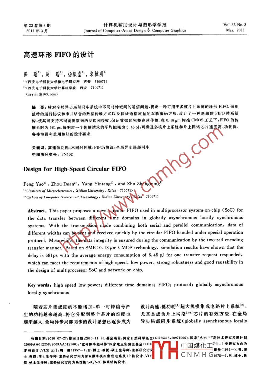 第23卷第3期計算機(jī)輔助設(shè)計與圖形學(xué)學(xué)報Vol. 23 No. 32011 年3月Journal of Computer -Aided Design &. Computer GraphicsMar. 2011高速環(huán)形FIFO的設(shè)計彭瑤”,周端”,楊銀堂”,朱樟明”"(西安電子科技大學(xué)微電子研究所安710071)2)(西安電子科技大學(xué)計算機(jī)學(xué)院西安 710071)(xyyiei@163. com)摘要:針對全局異步局部同步系統(tǒng)中不同時鐘域間的通信問題.提出一種可用于多核片上系統(tǒng)的環(huán)形FIFO.采用獨特的運行協(xié)議和串并結(jié)合的數(shù)據(jù)傳輸萬式以及保證通俏質(zhì)址的雙軌編碼方法,設(shè)計了一種新穎的FIFO體系結(jié)構(gòu),使其可支持不同寬度數(shù)據(jù)的發(fā)送和接收,保證數(shù)據(jù)的完整商速傳輸.在0. 18 pm標(biāo)準(zhǔn)CMOS工藝下,FIFO的傳輸延時為681 ps,每響應(yīng)一-個傳輸 請求的平均能耗為6. 45 pJ,可滿足多核片上系統(tǒng)和片上網(wǎng)絡(luò)芯片速度高、功耗低、魯櫸性強和重用性好的設(shè)計要求。關(guān)鍵詞:高速低功耗;不同時鐘域;FIFO;協(xié)議;全局異步局部同步中圈法分類號: TN402Design for High-Speed Circular FIFOPeng Yao" , Zhou Duan2 , Yang Yintang” ,and Zhu Zhangming"1)( lnstitute of Microeletronics , Xidian Univerity, Xi'an 710071)2)(School of Computer Science and Technology, Xidian University, Xi'an 710071)Abstract: This paper proposes a novel circular FIFO used in multiprocessor system-on-chip (SoC) forthe data transfer between different time domains in globally asynchronous locally synchronoussystems. With the transmission mode combining both serial and parallel communication, data ofdifferent widths can be sent and received quickly by the circular FIFO handled under special operationprotocol. Meanwhile, the data integrity is ensured during the communication by the two-rail encodingtransfer manner. Based on SMIC 0. 18 μm CMOS technology , simulation results have shown that thedelay is 681ps with the average energy consumption of 6.45 pJ for one transfer request responded,which can meet the requirements of high speed, low power, strong robustness and good reusability inthe design of multiprocessor SoC and network-on-chip.Key words: high-speed low power; different time domains; FIFO; protocol; globally asynchronouslocally synchronous隨著芯片集成度的不斷增加,單一時鐘信號產(chǎn)設(shè)計高速、低功耗"超大規(guī)模集成電路片上系統(tǒng)[2],生的功耗越來越高,將它分配到整個芯片的難度也尤其是成為片.上網(wǎng)絡(luò)104芯片的有效方法.在全局越來越大.全局異步局部同步的設(shè)計思想已逐步成為異步局部同步系統(tǒng)( globally asynchronous locally收稿日期:2010 07-27;修回 日期:2010-11 26. 基金項目:國家自然科學(xué)基金(60725415.60971066);國家“八六三”高技術(shù)研究發(fā)饜計劃(090A012258 20A01220)0"寬帶腺半超導(dǎo)體”國家重點實驗室基金(ZHD中國煤化工生,主要研究方向為IP核設(shè)計.VLSI設(shè)計:周端(1957-).女.博士.教授、碩士生導(dǎo)師,主要研究方向YHFi銀堂(1962- -).男.博士.教授.博士生導(dǎo)師.主要研究方向為深亞微米模擬集成電路及IP核設(shè)計.VLSCN M H G1978- -).男,博士,教 .授.碩士生導(dǎo)師,主要研究方向為高性能SocC/NoC體系結(jié)構(gòu)設(shè)計.第3期彭瑤,等;高速環(huán)形 FIFO的設(shè)計489synchronous, GALS)中,不同時鐘域間的通信是其管,讓FIFO的體系結(jié)構(gòu)建立在傳輸控制邏輯和數(shù)設(shè)計的重點和難點.據(jù)傳輸通道分離.數(shù)據(jù)同步化模塊和讀/寫指針分離FIFO是實現(xiàn)不同時鐘域間數(shù)據(jù)通信的主要方的基礎(chǔ)上,使得本文設(shè)計的FIFO支持串并結(jié)合的式[s7],通常選撣的設(shè)計方法有應(yīng)用仲裁機(jī)制、采用數(shù)據(jù)傳輸方式和不同寬度的數(shù)據(jù)傳輸模式,滿足不可停時鐘和應(yīng)用Gasp(或asp" )協(xié)議等. Cummings同傳輸可靠性的要求;最小傳輸時延為3個鎖存器SUNG公司[8]提出的FIFO利用仲裁機(jī)制和格雷碼延時,提高了數(shù)據(jù)傳輸效率,增強了FIFO 的可重用轉(zhuǎn)換器實現(xiàn),由發(fā)送端和接收端的計數(shù)器分別產(chǎn)生性,避免了傳輸亞穩(wěn)態(tài),實現(xiàn)了不同時鐘域間數(shù)據(jù)的讀/寫指針,并在數(shù)據(jù)傳輸過程中,通過比較讀/寫指完整高速傳輸.針控制數(shù)據(jù)的傳輸.雖然后續(xù)研究得出一系列優(yōu)化方案[°] ,但都是使用多個功能塊集成的方法實現(xiàn),設(shè)FIFO的體系結(jié)構(gòu)和協(xié)議計復(fù)雜度高. Apperson等(10] 將Cummings SUNG設(shè)計的FIFO和可停時鐘相結(jié)合,停止時鐘易使依環(huán)形體系結(jié)構(gòu)的FIFO解決了多核系統(tǒng)中不同賴時鐘進(jìn)行數(shù)據(jù)刷新的RAM中數(shù)據(jù)丟失,且多核時鐘域間的通信問題,使讀/寫操作并行,數(shù)據(jù)遵從芯片中-一個核的時鐘停止后,當(dāng)此核的時鐘信號被釋先人先出的順序.由于收發(fā)雙方的工作頻率不同可放時需要重新對其他核傳人的數(shù)據(jù)采樣,容易出錯. .能引起數(shù)據(jù)傳輸亞穩(wěn)態(tài),本文設(shè)計中著重考慮了這文獻(xiàn)[11-13]應(yīng)用Gasp(或asp" )協(xié)議實現(xiàn)FIFO,一問題.由特別的模塊產(chǎn)生FIFO的讀/寫信號控制FIFO的1.1環(huán)形 FIFO體系結(jié)構(gòu)讀寫.但該類方法使用捆綁數(shù)據(jù)的Gasp協(xié)議,要求圖1所示為環(huán)形FIFO的體系結(jié)構(gòu)示意圖,其傳輸控制信號必須嚴(yán)格滿足數(shù)