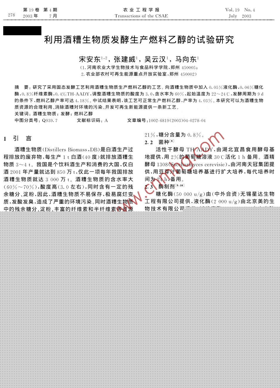 利用酒糟生物質(zhì)發(fā)酵生產(chǎn)燃料乙醇的試驗研究