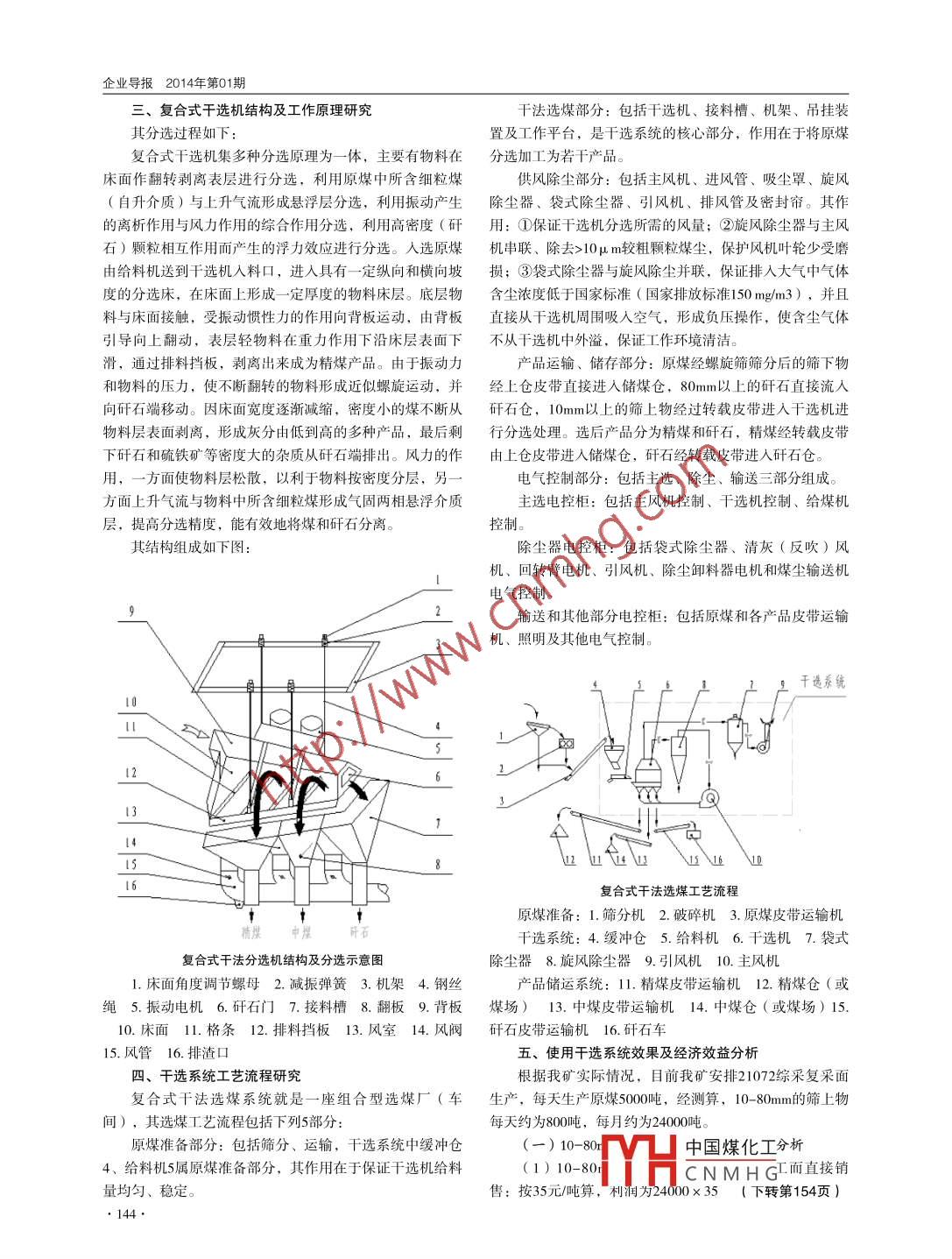 復合式干法選煤系統(tǒng)在鄭煤集團超化煤礦的應用復合式干法選煤系統(tǒng)在鄭煤集團超化煤礦的應用呂俊貽(鄭煤集團大平煤礦450000摘要:超化煤礦商品煤質(zhì)量及中煤場篩上品現(xiàn)狀,提岀提髙煤炭質(zhì)量、解決篩上品含煤建議,并粗略的經(jīng)濟分析,以實現(xiàn)煤炭企業(yè)利潤最大化關鍵詞:提高煤炭質(zhì)量篩選設備改造干法選煤選型利潤鄭煤集團超化煤礦是鄭煤集團公司的骨干礦井,全國第四級改為δσmm篩軸,從而確保提高商品煤質(zhì)量,但對煤炭行業(yè)首家發(fā)行股票—鄭州煤電的核心單位。礦井位篩子的篩軸進行改造后會造成篩上品中含煤率增大(經(jīng)測于新密市東南約15公里的超化鎮(zhèn)申溝村,始建于1983年12算在30%左右),造成篩分效率降低,并且有相當一部分月,于1993年12月8日正式投產(chǎn)。礦井原設計生產(chǎn)能力為煤打人了中煤場,對企業(yè)來說是一筆巨大損失。因此,提90萬噸/年,經(jīng)過近年來的技術改造與發(fā)展。日前礦井生產(chǎn)高煤炭質(zhì)量和解決篩上品含煤已迫在眉睫。為解決這一問能力已達200萬噸/年,礦井開拓方式是立井單水平上、下題,決定增加一套干法選煤系統(tǒng),利用現(xiàn)有煤樓的篩選設山開采,采煤方法是偽傾斜長臂釆煤放頂煤一次釆全厚,備不需要大的改動就能滿足生產(chǎn)需要,又能徹底解決篩上用全部垮落法管理頂板。品中含煤這一問題。、干法選煤系統(tǒng)的提出二、干選系統(tǒng)設備選型超化煤礦隨著工作面向下山開采的延伸,煤層賦存條復合式干法選煤技術是一種新型選煤方法,具有不用件發(fā)生變化,煤炭質(zhì)量逐步降低。2007年10月份至今商品水、工藝簡單、投資少、生產(chǎn)成本低、商品煤回收率高煤發(fā)熱量不超過5000千卡Kg,地面篩選加工系統(tǒng)使用兩能耗低、勞動生產(chǎn)率高、對環(huán)境無污染、占地面積小、設套螺旋分級篩(25πm三級、13πm四級),原煤全部使用備事故率低、建設周期短等一系列優(yōu)點。根據(jù)我礦實際情13mm篩子進行篩選,篩選后商品煤質(zhì)量仍不能滿足供貨況,決定選用FGX-1型復合式干法選煤系統(tǒng)。我礦原煤產(chǎn)合同要求影響商品煤品牌信譽和企業(yè)經(jīng)濟效益。量毎小時約400噸,經(jīng)多次實際測算,原煤經(jīng)過螺旋篩四為進一步提高商品煤質(zhì)量,確保外運商品煤能滿足用戶級篩分處理后,10-8mm篩上品約占原煤產(chǎn)量的30%,即供貨要求,根據(jù)現(xiàn)用篩選設備進行改造,在現(xiàn)有基礎上對400×30%=120噸/小時,選用FGⅩ-12型復合式干法選煤機l3mm螺旋篩篩軸進行更換,前三級篩軸改為lomm篩軸,各項性能不但滿足我礦生產(chǎn)需要,也節(jié)約了大量資金。FGX型系列復合式干選系統(tǒng)性能表項目FGX-1FGX-2FGX-3FGX-6FGX-9FGX-12FGX-24分選面入料粒度6(-060-080-080入料外在水分處理能力8-1016-225-3575-100180-255分選數(shù)量效率系統(tǒng)總功率24.1573.57142.27325.61570A6910892011204143218000外形mm83851300尺寸5950870930092009200670096001151013800150758基礎尺寸長寬高長寬75609225占地面積中國煤化工緩沖倉高度6350YHCNMHG企業(yè)導報2014年第01期三、復合式干選機結構及工作原理研究干法選煤部分:包括干選機、接料槽、機架、吊掛裝其分選過程如下置及工作平臺,是干選系統(tǒng)的核心部分,作用在于將原煤復合式干選機集多種分選原理為一體,主要有物料在分選加工為若干產(chǎn)品床面作翻轉剝離表層進行分選,利用原煤中所含細粒煤供風除塵部分:包括主風機、進風管、吸塵罩、旋風自升介質(zhì))與上升氣流形成懸浮層分選,利用振動產(chǎn)生除塵器、袋式除塵器、引風機、排風管及密封簾。其作的離析作用與風力作用的綜合作用分選,利用高密度(矸用:①保證干選機分選所需的風量;②旋風除塵器與主風石〕顆粒相互作用而產(chǎn)生的浮力效應進行分選。人選原煤機串聯(lián)、除去>10μm較粗顆粒煤塵,保護風機葉輪少受磨由給料機送到干選機入料口,進入具有一定縱向和橫向坡?lián)p;③袋式除塵器與旋風除塵并聯(lián),保證排入大氣中氣體度的分選床,在床面上形成一定厚度的物料床層。底層物含塵濃度低于國家標準(國家排放標準150mgm3),并且料與床面接觸,受振動慣性力的作用向背板運動,由背板直接從干選機周圍吸人空氣,形成負壓操作,使含塵氣體引導向上翻動,表層輕物料在重力作用下沿床層表面下不從干選機中外溢,保證工作環(huán)境清潔?;?通過排料擋板,剝離出來成為精煤產(chǎn)品。由于振動力產(chǎn)品運輸、儲存部分:原煤經(jīng)螺旋篩篩分后的篩下物和物料的壓力,使不斷翻轉的物料形成近似螺旋運動,并經(jīng)上倉皮帶直接進入儲煤倉,80mm以上的矸石直接流入向矸石端移動。因床面寬度逐漸減縮,密度小的煤不斷從矸石倉,10πm以上的篩上物經(jīng)過轉載皮帶進人干選機進物料層表面剝離,形成灰分由低到高的多種產(chǎn)品,最后剩行分選處理。選后產(chǎn)品分為精煤和矸石,精煤經(jīng)轉載皮帶下矸石和硫鐵礦等密度大的雜質(zhì)從矸石端排岀。風力的作由上倉皮帶進入儲煤倉,矸石經(jīng)轉載皮帶進亼矸石倉。用,一方面使物料層松散,以利于物料按密度分層,另電氣控制部分:包括主選、除塵、輸送三部分組成。方面上升氣流與物料中所含細粒煤形成氣固兩相懸浮介質(zhì)主選電控柜: