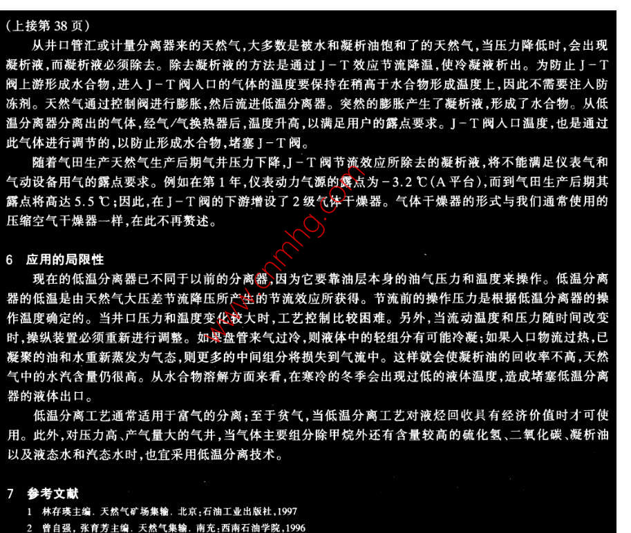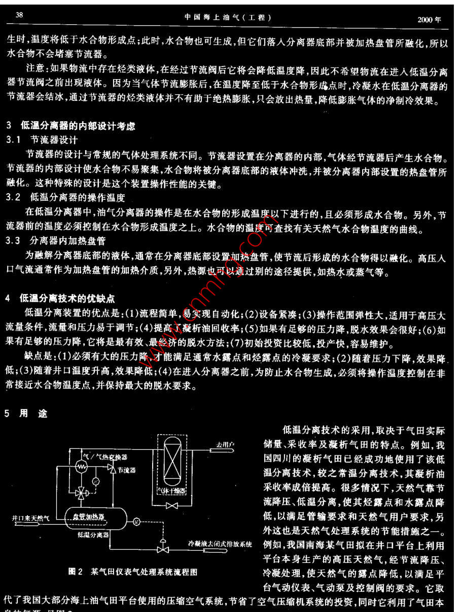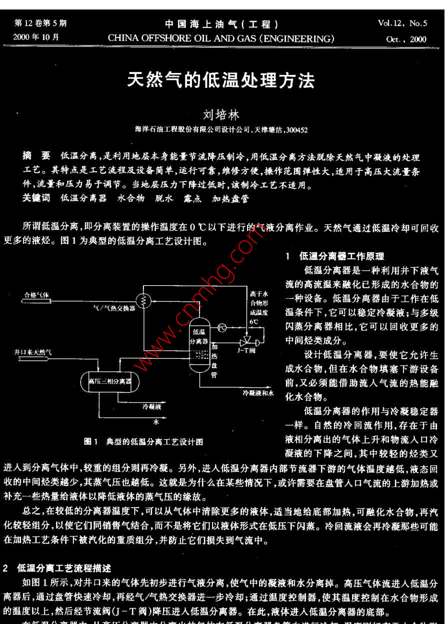 第12卷第5期中國海上油氣(工程Vol 12, No 52000年10月CHINA OFFSHORE OIL AND GAS(ENGINEERING)oet.,2000天然氣的低溫處理方法劉培林海洋石油工程股份有限公司設(shè)計公司,天津塘沽,300452摘要低溫分離,是利用地層本身能量節(jié)流降壓制冷,用低溫分離方法脫除天然氣中凝液的處理工藝。其特點是工藝流程及設(shè)備簡單,運行可靠,維修方便,操作范圍彈性大,適用于髙壓大流量條件,流量和壓力易于調(diào)節(jié)。當(dāng)?shù)貙訅毫ο陆颠^低時,該制冷工藝不適用。關(guān)鍵詞低溫分離器水合物脫水露點加熱盤管所謂低溫分離,即分離裝置的操作溫度在0℃以下進行的氣液分離作業(yè)。天然氣通過低溫冷卻可回收更多的液烴。圖1為典型的低溫分離工藝設(shè)計圖。低溫分離器工作原理低溫分離器是一種利用井下液氣流的高流溫來融化已形成的水合物的格氣體種設(shè)備。低溫分離器由于工作在低氣/氣熱交換器合物形成溫度溫條件下,它可以穩(wěn)定冷凝液;與多級閃蒸分離器相比,它可以回收更多的中間烴類成分。井口來大然氣J-T閥熱盤管設(shè)計低溫分離器,要使它允許生成水合物,但在水合物填塞下游設(shè)備前,又必須能借助流入氣流的熱能融凝液和水化水合物。冷凝液低溫分離器的作用與冷凝穩(wěn)定器樣。自然的冷回流作用,存在于由圖1典型的低溫分離工藝設(shè)計圖液相分離出的氣體上升和物流入口冷凝液的下降之間,其中較輕的烴類又進人到分離氣體中較重的組分則再冷凝。另外進入低溫分離器內(nèi)部節(jié)流器下游的氣體溫度越低,液態(tài)回收的中間烴類越少,其蒸氣壓也越低。這就是為什么在某些情況下,或許需要在盤管入口氣流的上游加熱或補充一些熱量給液體以降低液體的蒸氣壓的緣故總之,在較低的分離器溫度下,可以從氣體中清除更多的液體,適當(dāng)?shù)亟o底部加熱可融化水合物,再汽化較輕組分,以使它們同銷售氣結(jié)合,而不是將它們以液體形式在低壓下閃蒸。冷回流液會再冷凝那些可能在加熱工藝條件下被汽化的重質(zhì)組分,并防止它們損失到氣流中。2低溫分離工藝流程描述如圖1所示,對井口來的氣體先初步進行氣液分離,使氣中的凝液和水分離掉。高壓氣體流進入低溫分離器后,通過盤管快速冷卻再經(jīng)氣/汽熱交換器進一步冷卻;通過溫度控制器,使其溫度控制在水合物形成的溫度以上,然后經(jīng)節(jié)流閥(J-T閥)降壓進入低溫分離器。在此液體進入低溫分離器的底部。中國海上油氣(工程)000年生時,溫度將低于水合物形成點;此時,水合物也可生成但它們落入分離器底部并被加熱盤管所融化,所以水合物不會堵塞節(jié)流器注意:如果物流中存在烴類液體,在經(jīng)過節(jié)流閥后它將會降低溫度降,因此不希望物流在進入低溫分離器節(jié)流閥之前出現(xiàn)液體。因為當(dāng)氣體節(jié)流膨脹后,在溫度降至低于水合物形成點時,冷凝水在低溫分離器的節(jié)流器會結(jié)冰,通過節(jié)流器的烴類液體并不有助于絕熱膨脹,只會放出熱量,降低膨脹氣體的凈制冷效果。3低溫分離器的內(nèi)部設(shè)計考慮3.1節(jié)流器設(shè)計節(jié)流器的設(shè)計與常規(guī)的氣體處理系統(tǒng)不同。節(jié)流器設(shè)置在分離器的內(nèi)部,氣體經(jīng)節(jié)流器后產(chǎn)生水合物。節(jié)流器的內(nèi)部設(shè)計使水合物不易聚集,水合物將被分離器底部的液體沖洗,并被分離器內(nèi)部設(shè)置的熱盤管所融化。這種特殊的設(shè)計是這個裝置操作性能的關(guān)鍵。32低溫分離器的操作溫度在低溫分離器中,油氣分離器的操作是在水合物的形成溫度以下進行的,且必須形成水合物。另外,節(jié)流器前的溫度必須控制在水合物形成溫度之上。水合物的溫度可查找有關(guān)天然氣水合物溫度的曲線。3.3分離器內(nèi)加熱盤管為融解分離器底部的液體通常在分離器底部設(shè)置加熱盤管,使節(jié)流后形成的水合物得以融化。高壓入口氣流通常作為加熱盤管的加熱介質(zhì),另外熱源也可以通過別的途徑提供,如熱水或燕氣等。4低溫分離技術(shù)的優(yōu)缺點低溫分離裝置的優(yōu)點是:(1)流程簡單易實現(xiàn)自動化;(2)設(shè)備緊湊;(3)操作范圍彈性大,適用于高壓大流量條件,流量和壓力易于調(diào)節(jié);(4)提高了凝析油回收率;(5)如果有足夠的壓力降,脫水效果會很好;(6)如果有足夠的壓力降它將是最有效最經(jīng)濟的脫水方法;(7初始投資比較低投產(chǎn)快,容易維護。缺點是:(1)必須有大的壓力降,才能滿足通常水露點和烴露點的冷凝要求;(2)隨著壓力下降,效果降低;(3)隨著井口溫度升高效果降低;(4)在進入分離器之前,為防止水合物生成,必須將操作溫度控制在非常接近水合物溫度點,并保持最大的脫水要求。5用途低溫分離技術(shù)的采用,取決于氣田實際去用戶儲量、采收率及凝析氣田的特點。例如,我國四川的凝析氣田已經(jīng)成功地使用了該低節(jié)流器溫分離技術(shù),較之常溫分離技術(shù),其凝析油采收率成倍提高。很多情況下,天然氣靠節(jié)流降壓、低溫分離使其烴露點和水露點降井口來天然氣盤管加熱器低,以滿足管輸要求和天然氣用戶要求,另外這也是天然氣處理系統(tǒng)的節(jié)能措施之一。冷艇液太閉式排放系統(tǒng)例如,我國南海某氣田擬在井口平臺上利用平臺本身