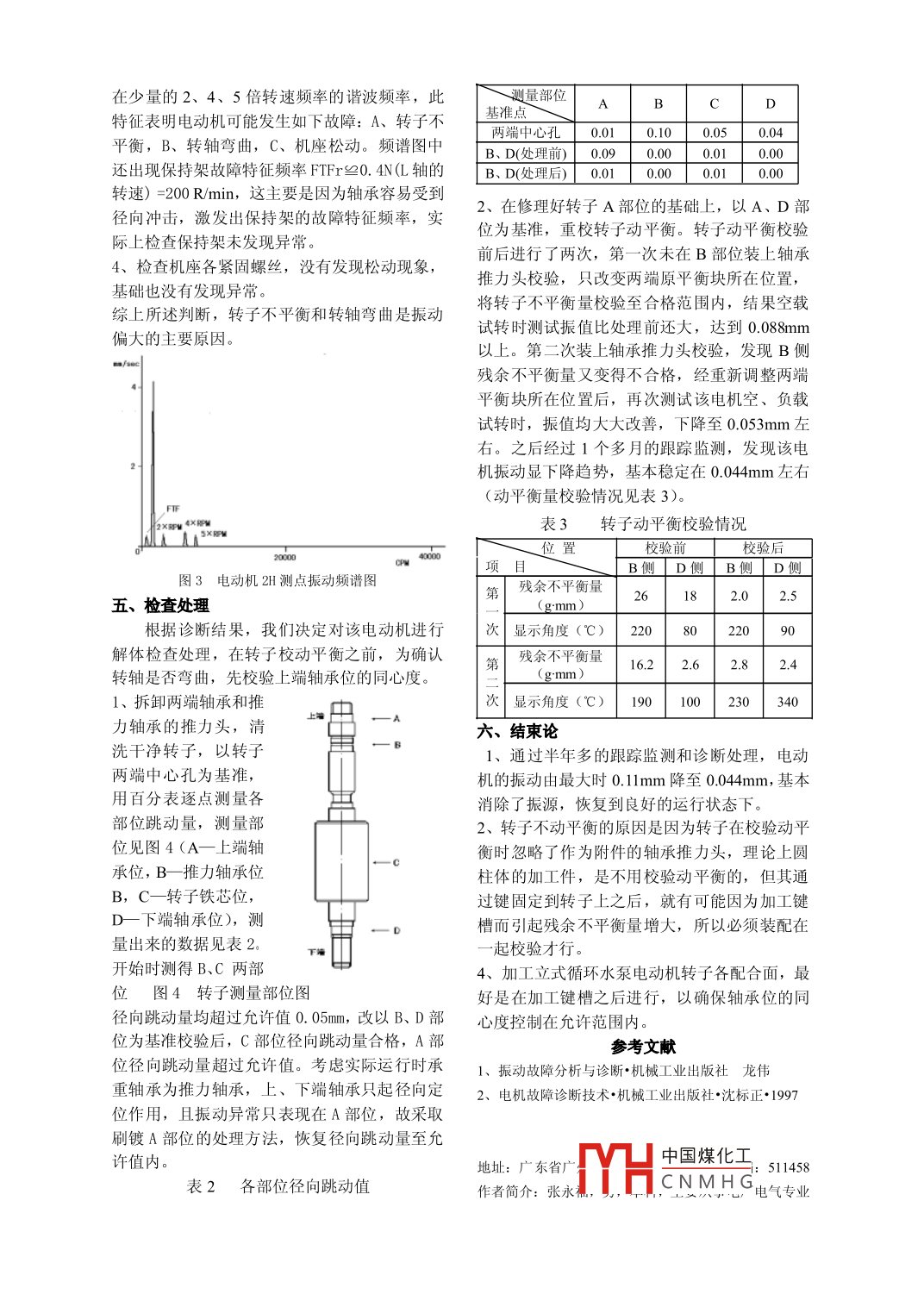 循環(huán)水泵電機振動診斷分析與處理張永福(珠江電廠廣東 廣州511400)商要:本文通過對調(diào)峰燃氣電廠-循環(huán)水泵電動機的狀態(tài)監(jiān)測、診斷分析和檢查處理,診斷出轉(zhuǎn)子不平衡和轉(zhuǎn)軸彎曲是循環(huán)水泵電動機振動偏大的主要原因,并進一-步 總結(jié)出轉(zhuǎn)子校動平衡時沒有帶上推力頭一-起進行是造成轉(zhuǎn)子不平衡的原因,從而為消除這類故障提供了技術依據(jù)。關鍵詞:循環(huán)水泵電動機;振動;狀態(tài)監(jiān)測;故障診斷;處理循環(huán)水泵電動機是發(fā)電廠的重要輔機設6.27 .408)6206.29227312備,XX廠- -期工程共4臺,其是否能夠正常運_7.636 98 9318行,直接影響到發(fā)電機組的安全穩(wěn)定運行,安9.23_26全運行意義非常重要。自投產(chǎn)以來,發(fā)現(xiàn)#1循11.20_30_3291811.2918 16 535010泵電動機的振動值一直 偏高,接近最大允許值12.0944420.08mm,并且伴有0.015mm左右的變化值。經(jīng)3、根據(jù) 跟蹤測試各測點的振動數(shù)據(jù),作出振過長時間的跟蹤監(jiān)測,運行5個月,發(fā)現(xiàn)#1循環(huán)水泵電動機的振動有較快向.上發(fā)展的趨勢,加強對該電機的振動情況進行狀態(tài)監(jiān)測和-1分析處理。一、 監(jiān)測方案#1循環(huán)水泵電動機為立式結(jié)構,通過推8.2 6.287 6.29 7.6 9.21 1.22 11.28 12力瓦承受電動機轉(zhuǎn)子和水泵轉(zhuǎn)子的重量,泵體動趨勢圖(見圖2)。與懸空支承的管道相連,故振動從下往.上呈逐圖2各測點振動趨勢圖漸變大趨勢,且容易受到相關設備的影響,所四、診斷分析以,確定采用邊跟蹤測試邊診斷處理的監(jiān)測方1、3月22日,帶負載試轉(zhuǎn)的該電動機,發(fā)現(xiàn)其法,重點放在監(jiān)測該電動機上端振動的變化。上端振值仍然偏大,在0.08mm范圍內(nèi)波動,經(jīng)二、電機技術參數(shù)和測點布置過三個月的運行后,上升至0.11mm左右,大大1、電機技術參數(shù)1↓2A地超出了廠家設定的最大允許值0.085mm。考H#1循環(huán)水泵電.2V1慮到立式電動機離地越高振動越大,上 端軸承動機型號最容易受到振動的影響,故停機檢查,發(fā)現(xiàn)其YSKL-900- 12/1430有明顯的走單邊現(xiàn)象,即一側(cè)軸承內(nèi)圈磨損。,功率900KW,閣更換該軸承后,該電動機上端振動- -度下降到定電壓6kV,額定轉(zhuǎn)0.070 mm左右,但一個月后又上升至0. 088mm速495R/min。左右,這說明轉(zhuǎn)子上端部分有可能存在彎曲現(xiàn)_1V42、測點分布電機的測點分2、9月22日,利用#1機組小修機會,空載試布見圖1。取該電機圖 1測點示意圖轉(zhuǎn)該電動機,上端振值基本 穩(wěn)定在0. 07mm,約上、下端軸承位置互相垂直的兩個方向和軸向為7月6日帶負荷運行時振值的71%,這說明振共五個點作為監(jiān)測點動主要由電動機部分引起。試轉(zhuǎn)時還發(fā)現(xiàn)上端三、振動監(jiān)測數(shù)據(jù):振值的波動變得很小,可見振值的波動主要是1、經(jīng)過近1年的監(jiān)測,測試出各個時期各測點受到管道振動的影響。的振動數(shù)值(見表1)。3、考慮小修后該電機的振動仍有向上發(fā)展的趨表1各測點振動數(shù)值表勢,11 月20日,在負載運行的狀態(tài)下,利用頻譜分析數(shù)據(jù)平集器平售運中動機的振動信振動值各測點振動幅度(μ m)號進行頻譜分中國煤化工2H 測點時間1V2H_22A3.22221714 ]的1倍轉(zhuǎn)速頻YHCNMHG同時存在少量的2、4、5倍轉(zhuǎn)速頻率的諧波頻率,此測量部位BCD特征表明電動機可能發(fā)生如下故障: A、轉(zhuǎn)子不基準點兩端中心孔0.010.100.050.04平衡,B、轉(zhuǎn)軸彎曲,C、機座松動。頻譜圖中| B、D(處理前)」 0.090.00 0.01 0.00還出現(xiàn)保持架故障特征頻率FTFr≌0.4N(L軸的B、D(處理后) 0.010.00 0.010.00轉(zhuǎn)速) =200 R/min,這主要是因為軸承容易受到2、在修理好轉(zhuǎn)子A部位的基礎上,以A、D部徑向沖擊,激發(fā)出保持架的故障特征頻率,實位為基準,重校轉(zhuǎn)子動平衡。轉(zhuǎn)子動平衡校驗際上檢查保持架未發(fā)現(xiàn)異常。4、檢查機座各緊固螺絲,沒有發(fā)現(xiàn)松動現(xiàn)象, .前后進行了兩次,第一次未在B部位裝上軸承推力頭校驗,只改變兩端原平衡塊所在位置,基礎也沒有發(fā)現(xiàn)異常。綜上所述判斷,轉(zhuǎn)子不平衡和轉(zhuǎn)軸彎曲是振動將轉(zhuǎn)子不平衡量校驗至合格范圍內(nèi),結(jié)果空載試轉(zhuǎn)時測試振值比處理前還大,達到0.088mm偏大的主要原因。以上。第二次裝上軸承推力頭校驗,發(fā)現(xiàn)B側(cè)殘余不平衡量又變得不合格,經(jīng)重新調(diào)整兩端平衡塊所在位置后,再次測試該電機空、負載試轉(zhuǎn)時,振值均大大改善,下降至0.053mm左右。之后經(jīng)過1個多月的跟蹤監(jiān)測,發(fā)現(xiàn)該電機振動顯下降趨勢,基本穩(wěn)定在0.044mm左右(動平衡量校驗情況見表3)。,F表3轉(zhuǎn)子動平衡校驗情況位置校驗前校驗后2000co 40000項目。B側(cè)D側(cè)B側(cè)D側(cè)圖3電動機 2H測點振動頻譜圖第殘余不平衡量26182.02.5五、檢查處理(g:mm)根據(jù)診斷結(jié)果,我們決定對該電動機進行次|顯示角度(°C)2208()0解體檢查處理,在轉(zhuǎn)子校動平衡之前,為確認16.22.6| 2.82.4轉(zhuǎn)軸是否彎曲,先校驗上端軸承位的同心度。(gmm )1、拆卸兩端軸承和推次顯示角度(°C)190| 100| 230340力軸承的推力頭,清六、結(jié)束論洗干凈轉(zhuǎn)子,以轉(zhuǎn)子1、通過半年多的跟