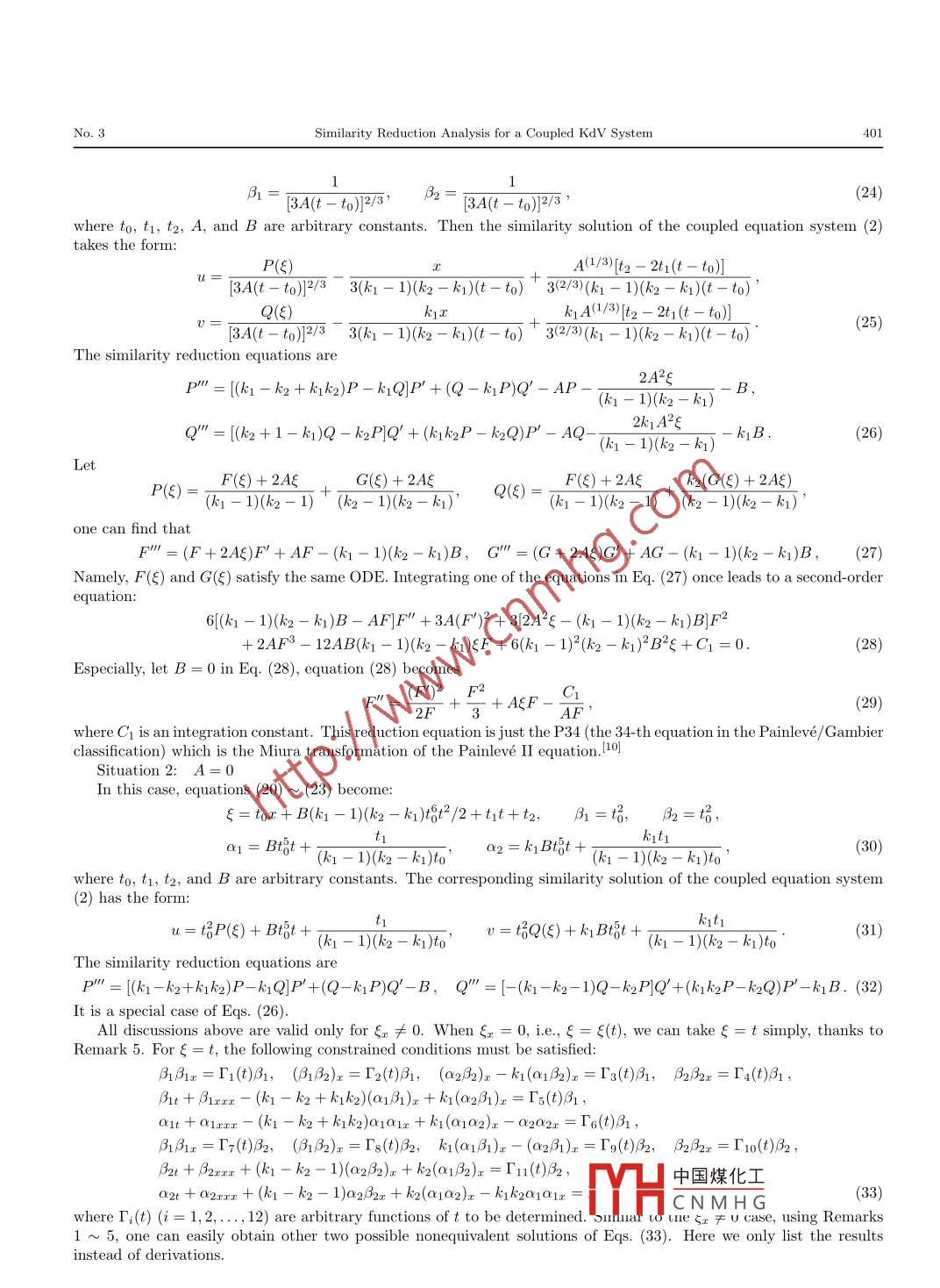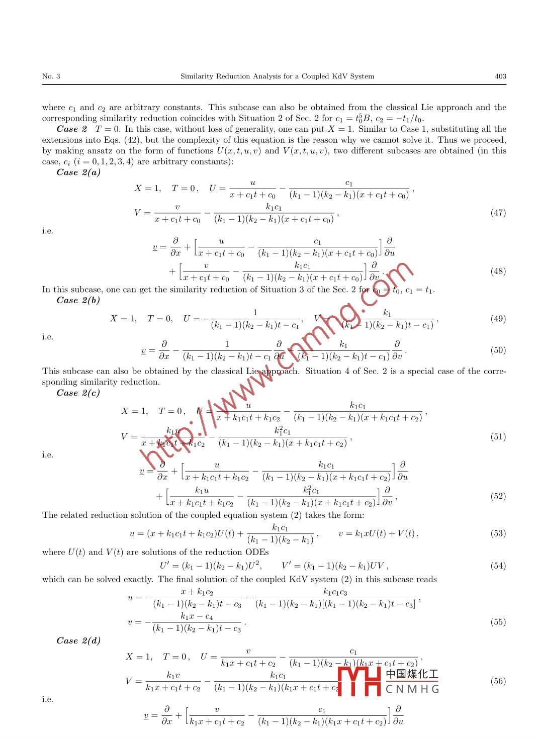 Commun. Theor. Phys. (Beijing, China) 48 (2007) pp. 399- 404@ International Academic PublishersVol. 48, No. 3, September 15, 2007Similarity Reduction Analysis for a Coupled KdV System*QIAN Su-Ping1,2,t and TIAN Li-Xin2'Department of Mathematics, Changshu Institute of Technology, Changshu 215500, China2Nonlinear Scientific Research Center, Faculty of Science, Jiangsu University, Zhenjiang 212013, China(Received September 4, 2006)A bstract Using the direct method for a coupled KdV system, six types of the similarity reductions are obtained. Thegroup explanation of the results is also given. It is pointed out that, in order to find all the results by nonclassical Lieapproach, two additional condition equations should be satisfied at the same time together with two original equations.PACS numbers: 02.30.Jr, 02.30.Ik, 05.45.Yv, 47.32.-y, 47.35.+iKey words: coupled KdV equations, direct method, nonclassical Lie approach1 IntroductionIn this paper, we study a new integrable coupled KdVequation system:tion has been widely used in various natural science fields△{})=ut +ux-(k1- k2 + k(k2)uxespecially in almost all branches of physics. Some kindsof coupled KdV equations have also been introduced in+ k1VUx + k1W0x- VUx = 0,the literature such as one describing two resonantly inter-0?)=v+Uxxr +(k1- kz- 1)vvx + k20Uxacting normal modes of internal-gravity-wave motion ina shallow stratified liquid.1 In principle, many of other+ kzUUx - k1k2Ulx = 0,(2)coupled KdV equations are introduced mathematically be-where k1 and k2 are two arbitrary constants. It is clearcause of their integrability.l2,3] In Ref. [4], by using a long-that the coupled KdV system (2) is a special case for thewave approximation, Lou et al. derived some new typesphysical systems (1). Because of the important applica-of coupled KdV equation systems with some arbitrary pa-tions of the model and because the model has not yet beenrameters from a two-layer fluid model:deeply studied, especially, there is no study on its groupUt + Q1VUx + (a202 + Q3WV + Q4Uxx + o5u2)x= 0,invariant solutions, here, we use CK's direct method toVt +δ10Ux + (δ2u2 + δ3u0 + δ4Vx +δ502)x = 0,(1reduce the partial differential equation (PDE) system toan ordinary differential equation (ODE) system. A groupoceanic phenomena such as the atmospheric blockings,theoretical explanation of the results obtained by the di-the interactions between the atmosphere and ocean,5l therect method is provided in terms of nonclassical symmetryoceanic circulations and even hurricanes or typhoons.reduction method.The study of symmetries is one of the most powerfulmethods in every branch of natural science especially in2 Similarity Reductions from Direct Methodintegrable systems because of the existence of infinitelyThe CK's direct similarity reduction method impliesmany symmetries. To find the Lie point symmetry groupthat it is possible to find full symmetry groups of the Cou-of a nonlinear system, there is a standard method thankspled KdV system by a simple direct method without usingto the famous first fundamental theorem of Lie.7] And theany group theory. All the similarity solutions of the formstandard method had been widely used to find Lie pointsymmetry algebras and groups for almost all the known in-u(x,t) = U(x,t, P(ξ(x, t)(x,))),tegrable systems. However, to find non-Lie point symme-0(x,t)= V(x,t, P(x, t),(x,)),(3)try groups is still quite difficult. Furthermore, even for thewhere U, V, P, Q, and ξ are functions of the indicatedLie point symmetry groups, the final known expressionsvariables and P(E) and Q(ξ) satisfy an ordinary differen-may be quite complicated, and difficult for real applica-tial equation, may be obtained by substituting Eqs. (3tions especially for physicists and other non-mathematicalscientists. In Ref. [8], Clarkson and Kruskal (CK) intro-into Eqs. (2). However, similar to single partial differen-duced a simple direct method to derive symmetry reduc-tial equation case, one can prove that it is sufficient totions of a nonlinear system without using any group the-seek a similarity reduction of Eqs. (2) in a special form: .ory. For many types of nonlinear systems, the method canu(x,t)= ar(x,t) + Br(x, t)P(x,)),be used to find all the possible similarity reductions. Thisv(x,t) = a2(x,t) + B2(x, t)(x,t),(4)fact hints that there is a simple method to find generalizedsymmetry groups for many types of nonlinear equations.rather than the most general forms (3). .*The project supported by National Natural Science Foundation of China under Gr中國煤化工Science Foundationof Jiangsu Province under Grant No. BK2002003, the Project of Technology InnovatiYHC N M H GJiangsu Province inYear 2006 under Grant No. 72, and the Natural Science Directed Foundation of the Jiangsu Higher Education Institutions under GrantNo. 06KJD1 10001t E-mail: qsp@cslg.edu.cn.400QIAN Su-Ping and TIAN Li-XinVol. 48Substituting Eqs. (4) into the equation△| = 0 leads toβ$3P" + 3ξx(βrξx)xP" +[β1ξt + β1ξxxx + kqa2βrξx- (k1- k2 + ki kx2)a1β1ξx+ 3(β1xξx)x]P'-(k1- k2 + kikx)βξx PP' + k;μβ2β1ξaQP' + k1β1μβ2ξx PQ'-險ξxQQ' + (kra1-a2)B2ξxQ' - (k1- k2 + k1kz2)βrβBrxP2 + k1(β1$2)x PQ+ [3rt + Birrr -(ki - k:2 + kikz)(anB1)x + k1(a2β1)x]P - B2B2xQ2 - [(a2B2)x- k1(a12)x]Q+ [ant + Q1xxx- (ki - k2 + k1k2)a1Q1x + kr(a1Q2)x - a2Q2x]=0,(5)where the primes are derivatives with respect to ξ. Equation (5) is an ODEof {P,Q} if and only if the ratios of thecofficients of different derivatives and powers of P and Q are functions ofξ . That is to say, the following constrainedconditions for ξx≠0 must be satisfied:(B132)x = T6(ξ)Br$2,(11)β1β2ξx = T1(E)βζ3,(6)(a2B2)x - k:1(a132)x = F7(ξ)Brξ2,(12)β陘ξ∞= F2(ξ)Br5,(7(B1ξx)xξx = T8(ξ)β1ξ2,(13)(k1a1 - a2)B2ξx = T3()Brs2,(8β2B2x = F4(ξ)β1rζ3 ,(9β陘ξx = Fo(ξ)Brζ3 ,(14)ββ2ξ = Ts(E)βrζ2,(10)β1βrx = Tno()B15,(15)β1ξt + Brxxx + kra2Brξμ -(ki - k2 + k1k2)ar1βnξx + 3(3x2ξx)x = Fn(E)β1ζ ,(16) .β