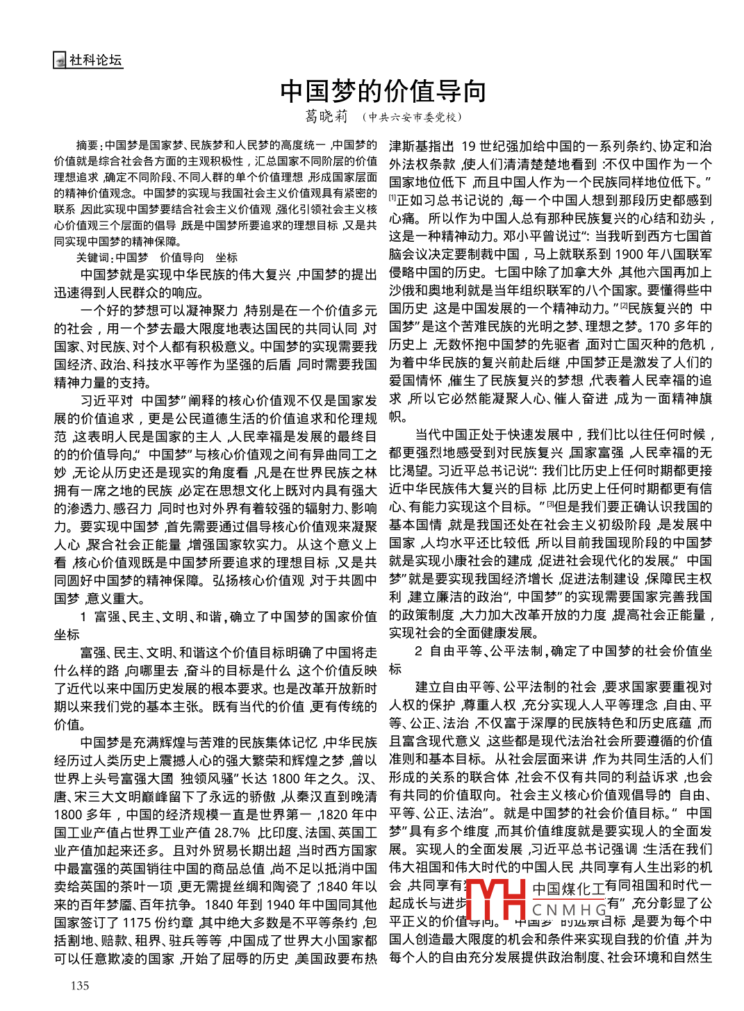 社科論壇中國夢的價值導(dǎo)向葛曉莉(中共六安市委黨校)摘要:中國夢是國家夢、民族夢和人民夢的高度統(tǒng)—中國夢的津斯基指岀19世紀強加給中國的一系列條約、協(xié)定和治價值就是綜合社會各方面的主觀積極性,匯總國家不同階層的價值外法權(quán)條款使人們清清楚楚地看到不僅中國作為一個理想追求確定不同階段不同人群的單個價值理想形成國家層面國家地位低下而且中國人作為一個民族同樣地位低下。的精神價值觀念。中國夢的實現(xiàn)與我國社會主義價值觀具有緊密的聯(lián)系因此實現(xiàn)中國夢要結(jié)合社會主義價值觀漒化引領(lǐng)社會主義核Ⅶ正如習(xí)總書記說的每一個中國人想到那段歷史都感到心價值觀三個層面的倡導(dǎo)既是中國夢所要追求的理想目標又是共心痛。所以作為中國人總有那種民族復(fù)興的心結(jié)和勁頭關(guān)鍵詞:中國夢價值導(dǎo)向坐標腦會議決定要制裁中國,馬上就聯(lián)系到1900年八國聯(lián)軍中國夢就是實現(xiàn)中華民族的偉大復(fù)興中國夢的提出侵略中國的歷史。七國中除了加拿大外其他六國再加上迅速得到人民群眾的響應(yīng)沙俄和奧地利就是當年組織聯(lián)軍的八個國家。要懂得些中個好的夢想可以凝神聚力特別是在一個價值多元國歷史這是中國發(fā)展的一個精神動力。”民族復(fù)興的中的社會,用一個夢去最大限度地表達國民的共同認同對國夢”是這個苦難民族的光明之夢、理想之夢。170多年的國家、對民族、對個人都有積極意義。中國夢的實現(xiàn)需要我歷史上無數(shù)懷抱中國夢的先驅(qū)者面對亡國滅種的危機,國經(jīng)濟、政治、科技水平等作為堅強的后盾同時需要我國為著中華民族的復(fù)興前赴后繼中國夢正是激發(fā)了人們的精神力量的支持。愛國情懷催生了民族復(fù)興的夢想代表著人民幸福的追習(xí)近平對中國夢"闡釋的核心價值觀不僅是國家發(fā)求所以它必然能凝聚人心、催人奮進成為一面精神旗展的價值追求,更是公民道德生活的價值追求和倫理規(guī)幟。范這表明人民是國家的主人民幸福是發(fā)展的最終目當代中國正處于快速發(fā)展中,我們比以往任何時候的的價值導(dǎo)向。中國夢與核心價值觀之間有異曲同工之都更強烈地感受到對民族復(fù)興國家富強人民幸福的無妙無論從歷史還是現(xiàn)實的角度看凡是在世界民族之林比渴望。習(xí)近平總書記說¨我們比歷史上任何時期都更接擁有一席之地的民族必定在思想文化上既對內(nèi)具有強大近中華民族偉大復(fù)興的目標比歷史上任何時期都更有信的滲透力、感召力同時也對外界有著較強的輻射力、影響心、有能力實現(xiàn)這個目標。"國但是我們要正確認識我國的力。要實現(xiàn)中國夢首先需要通過倡導(dǎo)核心價值觀來凝聚基本國情就是我國還處在社會主義初級階段是發(fā)展中人心聚合社會正能量增強國家軟實力。從這個意義上國家人均水平還比較低所以目前我國現(xiàn)階段的中國夢看核心價值觀既是中國夢所要追求的理想目標又是共就是實現(xiàn)小康社會的建成促進社會現(xiàn)代化的發(fā)展。中國同圓好中國夢的精神保障。弘揚核心價值觀對于共圓中夢"就是要實現(xiàn)我囯經(jīng)濟增長捉進法制建設(shè)保障民主權(quán)國夢意義重大利建立廉潔的政治",中國夢”的實現(xiàn)需要國家完善我國1富強、民主、文明、和諧,確立了中國夢的國家價值的政策制度大力加大改革開放的力度提高社會正能量坐標實現(xiàn)社會的全面健康發(fā)展富強、民主、文明、和諧這個價值目標明確了中國將走自由平等、公平法制,確定了中國夢的社會價值坐什么樣的路向哪里去奤斗的目標是什么這個價值反映標了近代以來中國歷史發(fā)展的根本要求。也是改革開放新時建立自由平等、公平法制的社會要求國家要重視對期以來我們黨的基本主張。既有當代的價值更有傳統(tǒng)的人權(quán)的保護尊重人權(quán)充分實現(xiàn)人人平等理念自由、平價值。等、公正、法治不僅富于深厚的民族特色和歷史底蘊而中國夢是充滿輝煌與苦難的民族集體記憶中華民族且富含現(xiàn)代意乂這些都是現(xiàn)代法治社會所要遵循的價值經(jīng)歷過人類歷史上震撼人心的強大繁榮和輝煌之夢曾以準則和基本目標。從社會層面來講作為共同生活的人們世界上頭號富強大國獨領(lǐng)風(fēng)騷"長達1800年之久。漢、形成的關(guān)系的聯(lián)合體社會不僅有共同的利益訴求也會唐、宋三大文明巔峰留下了永遠的驕傲從秦漢直到晩清有共同的價值取向。社會主義核心價值觀倡導(dǎo)的自由、1800多年,中國的經(jīng)濟規(guī)模一直是世界第一,1820年中平等、公正、法治”。就是中國夢的社會價值目標?!爸袊鴩I(yè)產(chǎn)值占世界工業(yè)產(chǎn)值287%比印度、法國、英國工夢具有多個維度而其價值維度就是要實現(xiàn)人的全面發(fā)業(yè)產(chǎn)值加起來還多。且對外貿(mào)易長期出超當時西方國家展。實現(xiàn)人的全面發(fā)展習(xí)近平總書記強調(diào)泩生活在我們中最富強的英國銷往中國的商品總值尚不足以抵消中國偉大祖囯和偉大時代的中國人民共同享有人生出彩的機賣給英國的茶葉一項更無需提絲綢和陶瓷了1840年以會共同享有中國煤化