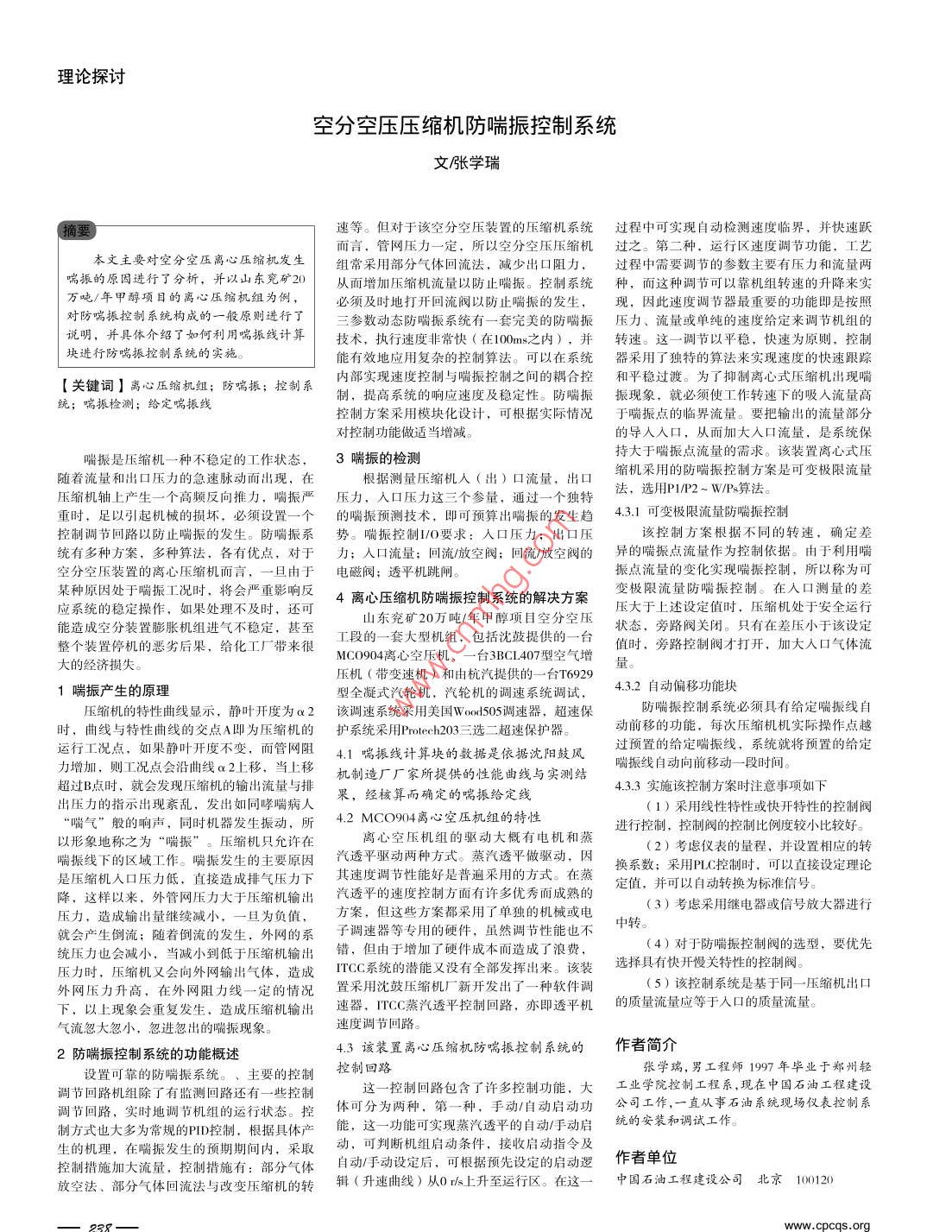 理論探討空分空壓壓縮機(jī)防喘振控制系統(tǒng)文脹張學(xué)瑞速等。但對(duì)于該空分空壓裝置的壓縮機(jī)系統(tǒng)過(guò)程中可實(shí)現(xiàn)自動(dòng)檢測(cè)速度臨界,并快速躍而言,管網(wǎng)壓力一定,所以空分空壓壓縮機(jī)過(guò)之。第二種,運(yùn)行區(qū)速度調(diào)節(jié)功能,工藝本文主要對(duì)空分空壓離心壓縮機(jī)發(fā)生常采用部分氣體回流法,減少出口阻力,過(guò)程中需要調(diào)節(jié)的參數(shù)主要有壓力和流量?jī)纱竦脑蜻M(jìn)行了分析,并以山東兗礦20從而增加壓縮機(jī)流量以防止喘振??刂葡到y(tǒng)種,而這種調(diào)節(jié)可以靠機(jī)組轉(zhuǎn)速的升降來(lái)實(shí)萬(wàn)噸/年甲醇項(xiàng)目的離心壓縮機(jī)組為例必須及時(shí)地打開(kāi)回流閥以防止喘振的發(fā)生,現(xiàn),因此速度調(diào)節(jié)器最重要的功能即是按照于防喘振控制系統(tǒng)構(gòu)成的一般原則進(jìn)行了參數(shù)動(dòng)態(tài)防喘振系統(tǒng)有一套完美的防喘振壓力、流量或單純的速度給定來(lái)調(diào)節(jié)機(jī)組說(shuō)明,并具體介紹了如何利用喘振線(xiàn)計(jì)算技術(shù),執(zhí)行速度非???在100之內(nèi)),并轉(zhuǎn)速。這一調(diào)節(jié)以平穩(wěn),快速為原則,控制塊進(jìn)行防喘振控制系統(tǒng)的實(shí)施。能有效地應(yīng)用復(fù)雜的控制算法??梢栽谙到y(tǒng)器采用了獨(dú)特的算法來(lái)實(shí)現(xiàn)速度的快速跟蹤【關(guān)鍵詞】離心壓縮機(jī)鉏;防喘振;控制系內(nèi)部實(shí)現(xiàn)速度控制與喘振控制之間的耦合控和平穩(wěn)過(guò)渡。為了抑制離心式壓縮機(jī)出現(xiàn)喘統(tǒng);喘振檢測(cè);給定喘振線(xiàn)制,提高系統(tǒng)的響應(yīng)速度及穩(wěn)定性。防喘振振現(xiàn)象,就必須使工作轉(zhuǎn)速下的吸入流量高控制方案釆用模塊化設(shè)計(jì),可根據(jù)實(shí)際情況于喘振點(diǎn)的臨界流量。要把輸出的流量部分對(duì)控制功能做適當(dāng)增減的導(dǎo)入入口,從而加大入口流量,是系統(tǒng)保喘振是壓縮機(jī)一種不穩(wěn)定的工作狀態(tài),3喘振的檢測(cè)持大于喘振點(diǎn)流量的需求。該裝置離心式壓隨著流量和出口壓力的急速脈動(dòng)而出現(xiàn),在根據(jù)測(cè)量壓縮機(jī)入(出)口流量,出口縮機(jī)采用的防喘振控制方案是可變極限流量壓縮機(jī)軸上產(chǎn)生一個(gè)高頻反向推力,喘振嚴(yán)壓力,入口壓力這三個(gè)參量,通過(guò)一個(gè)獨(dú)特法,選用PP2~W/P算法。重時(shí),足以引起機(jī)械的損壞,必須設(shè)置一個(gè)的喘振預(yù)測(cè)技術(shù),即可預(yù)算出喘振的發(fā)生趨431可變極限流量防喘振控制控制調(diào)節(jié)回路以防止喘振的發(fā)生。防喘振系勢(shì)。喘振控制ⅣO要求:人口壓力;出口壓該控制方案根據(jù)不同的轉(zhuǎn)速,確定差統(tǒng)有多種方案,多種算法,各有優(yōu)點(diǎn),對(duì)于力;人口流量;回流放空閥;回流放空閥的異的喘振點(diǎn)流量作為控制依據(jù)。由于利用喘空分空壓裝置的離心壓縮機(jī)而言,一旦由于電磁閥;透平機(jī)跳閘。振點(diǎn)流量的變化實(shí)現(xiàn)喘振控制,所以稱(chēng)為可某種原因處于喘振工況時(shí),將會(huì)嚴(yán)重影響反4離心壓縮機(jī)防喘振控制系統(tǒng)的解決方案變極限流量防振控制。在人口調(diào)量的差能造成空分裝置膨脹機(jī)組進(jìn)氣不穩(wěn)定,甚至山東充礦20萬(wàn)噸/年甲醇項(xiàng)目空分空壓狀態(tài),旁路閥關(guān)閉。只有在差壓小于該設(shè)定整個(gè)裝置停機(jī)的惡劣后果,給化工廠(chǎng)帶來(lái)很工段的一套大型機(jī)組,包括沈鼓提供的一臺(tái)值時(shí),旁路控制閥才打開(kāi),加大入口氣體流大的經(jīng)濟(jì)損失。MCO904離心空壓機(jī)、一臺(tái)3BCL407型空氣增壓機(jī)(帶變速機(jī))和由杭汽提供的一臺(tái)T69291喘振產(chǎn)生的原理型全凝式汽輪機(jī),汽輪機(jī)的調(diào)速系統(tǒng)調(diào)試,432自動(dòng)偏移功能塊壓縮機(jī)的特性曲線(xiàn)顯示,靜葉開(kāi)度為α2該調(diào)速系統(tǒng)采用美國(guó)Wood505調(diào)速器,超速保防喘振控制系統(tǒng)必須具有給定喘振線(xiàn)自時(shí),曲線(xiàn)與特性曲線(xiàn)的交點(diǎn)A即為壓縮機(jī)的護(hù)系統(tǒng)采用 Protech203三選二超速保護(hù)器。動(dòng)前移的功能,每次壓縮機(jī)機(jī)實(shí)際操作點(diǎn)越運(yùn)行工況點(diǎn),如果靜葉開(kāi)度不變,而管網(wǎng)阻41喘振線(xiàn)計(jì)算塊的數(shù)據(jù)是依據(jù)沈陽(yáng)鼓風(fēng)過(guò)預(yù)置的給定喘振線(xiàn),系統(tǒng)就將預(yù)置的給定力增加,則工況點(diǎn)會(huì)沿曲線(xiàn)a2上移,當(dāng)上移機(jī)制造廠(chǎng)廠(chǎng)家所提供的性能曲線(xiàn)與實(shí)測(cè)結(jié)喘振線(xiàn)自動(dòng)向前移動(dòng)一段時(shí)間。超過(guò)B點(diǎn)時(shí),就會(huì)發(fā)現(xiàn)壓縮機(jī)的輸出流量與排出壓力的指示出現(xiàn)紊亂,發(fā)出如同哮嗬病人果,經(jīng)核算而確定的喘振給定線(xiàn)433實(shí)施該控制方案時(shí)注意事項(xiàng)如下“喘氣”般的響聲,同時(shí)機(jī)器發(fā)生振動(dòng),所42MCO94離心空壓機(jī)組的特性(1)采用線(xiàn)性特性或快開(kāi)特性的控制閥進(jìn)行控制,控制閥的控制比例度