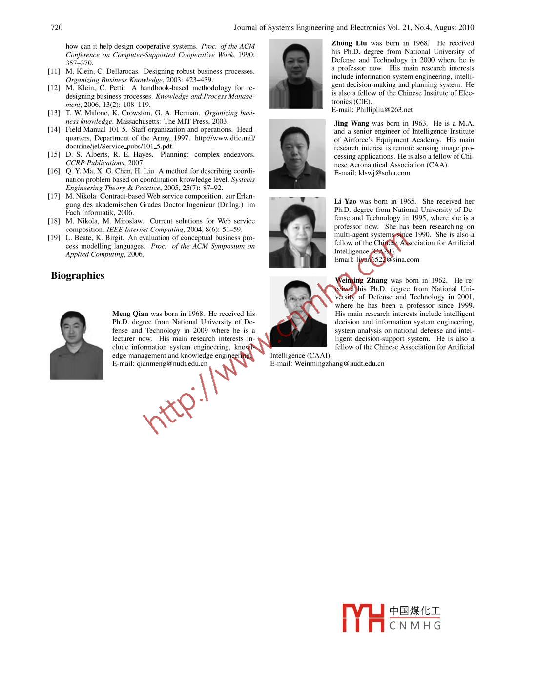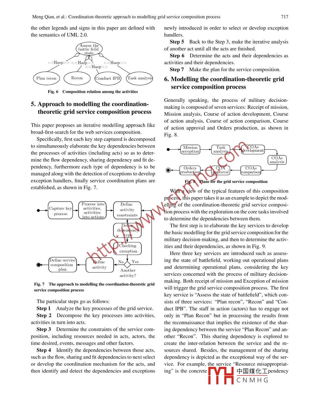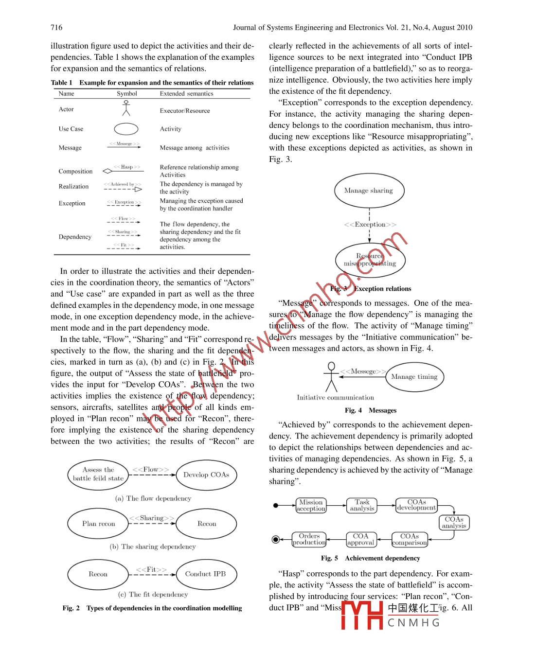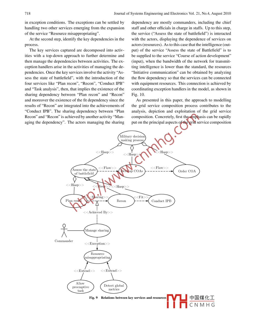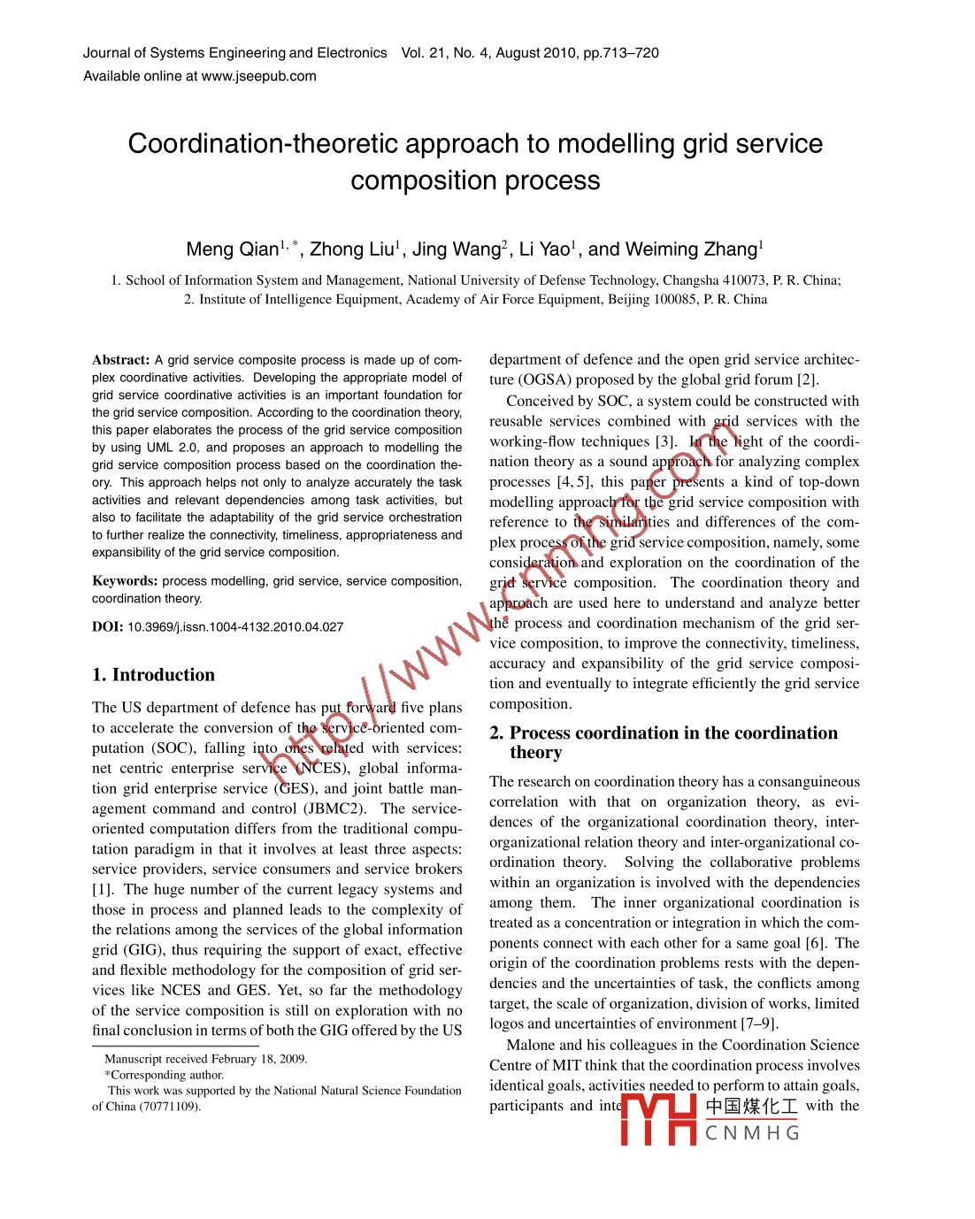 Journal of Systems Engineering and Electronics Vol. 21, No.4, August 2010, pp.713-720Available online at www.jseepub.comCoordination-theoretic approach to modelling grid servicecomposition processMeng Qianl.*, Zhong Liul , Jing Wang', Li Yao' , and Weiming Zhang'1. School of Information System and Management, National University of Defense Technology, Changsha 410073, P. R. China;2. Institute of Inelligence Equipment, Academy of Air Force Equipment, Beijing 100085, P. R. ChinaAbstract: A grid service composite process is made up of com-department of defence and the open grid service architec-plex coordinative activities. Developing the appopriate model ofture (OGSA) proposed by the global grid forum [2].grid service coordinative activities is an important foundation forConceived by SOC, a system could be constructed withthe grid service composition. According to the coordination theory,reusable services combined with grid services with thethis paper elaborates the process of the grid service compositionby using UML 2.0, and proposes an approach to modelling thegrid service composition process based on the coordination the-nation theory as a sound approach for analyzing complexory. This approach helps not only to analyze accurately the taskprocesses [4,5], this paper presents a kind of top-downactivities and relevant dependencies among task activities, bmodelling approach for the grid service composition withalso to facilitate the adaptability of the grid service orchestrationreference to the similarities and differences of the com-to further realize the conectivity, timeliness, appropriateness andplex process of the grid service composition, namely, someexpansibility of the grid service composition.consideration and exploration on the coordination of theKeywords: process modelling, grid service, service composition,coordination theoapproach are used here to understand and analyze betterDOI: 10.3969/.issn. 1004-4132.2010.04.027the process and coordination mechanism of the grid ser-vice composition, to improve the conectivity, timeliness,accuracy and expansibility of the grid service composi-1. Introductiontion and eventually to integrate efficiently the grid serviceThe US department of defence has put forward five planscomposition.to accelerate the conversion of the service-oriented com-2. Process coordination in the coordinationputation (SOC), falling into ones related with services:theorynet centric enterprise service (NCES), global informa-The research on coordination theory has a consanguineousagement command and control (JBMC2). The service-correlation with that on organization theory, as evi-oriented computation differs from the traditional compu-dences of the organizational coordination theory, inter-tation paradigm in that it involves at least three aspects:organizational relation theory and inter-organizational CO-service providers, service consumers and service brokersordination theory. Solving the collaborative problems[1]. The huge number of the current legacy systems andwithin an organization is involved with the dependenciesthose in process and planned leads to the complexity ofamong them. The inner organizational coordination isthe relations among the services of the global informationtreated as a concentration or integration in which the com-grid (GIG), thus requiring the support of exact, effectiveponents connect with each other for a same goal [6]. Theand fexible methodology for the composition of grid ser-origin of the coordination problems rests with the depen-vices like NCES and GES. Yet, so far the methodologydencies and the uncertainties of task, the conficts amongof the service composition is still on exploration with notarget, the scale of organization, division of works, limitedfinal conclusion in terms of both the GIG offered by the USlogos and uncertainties of environment[7-9].Malone and his colleagues in the Coordination ScienceManuscript received February 18, 2009.Centre of MIT think that the coordination process involves*Corresponding author.This work was supported by the National Natural Science Foundationidentical goals, activities needed to perform to attain goals,of China (70771 109).participants and int中國煤化工with the .YHCNM HG714Journal of Systems Engineering and Electronics Vol. 21, No.4, August 2010focus on how to manage the inter-relations among activ- accomplish the depiction of the generic process and itsities as well as define three types of dependencies: thestandards and on this basis set up the sub-steps for the CO-flow, sharing and ft dependencies [10]. The flow depen-ordination mechanism [15, 16]. The exceptions occurringdency implies demand relations between two coordinative with the coordination mechanism can be treated with ex-sides, with one supplying the desired products to another,ception handlers.e.g., the intelligence production supplying intelligence ap-3. Depiction of the composition based onplication with resources. The sharing dependency repre-coordination theorysents the relation between tasks and desired and dividedresources. For example, the sharing dependency exists be-The grid service system takes the service composition as itstween labour and a task to the coordinative sides in a task.core [17, 18], as shown in Fig. 2. In this system, one ser-The fit dependency indicates the products produced by twovice composition consists of multi-simple services and re-or more coordinative sides and the need to merge those lations between services. Each simple service is composedproducts. Take the activities of reorganizing combat intel- of multi-operations, while those operations are connectedligence, among which exists a fit dependency.through multi-messages. Every operation encompasses theIn accordance with a top-down approach to modellingequipment operation, the operation with people engage-complex activities based on coordination theory developedment and the computable resource operation, in whichby Malone and his colleagues,