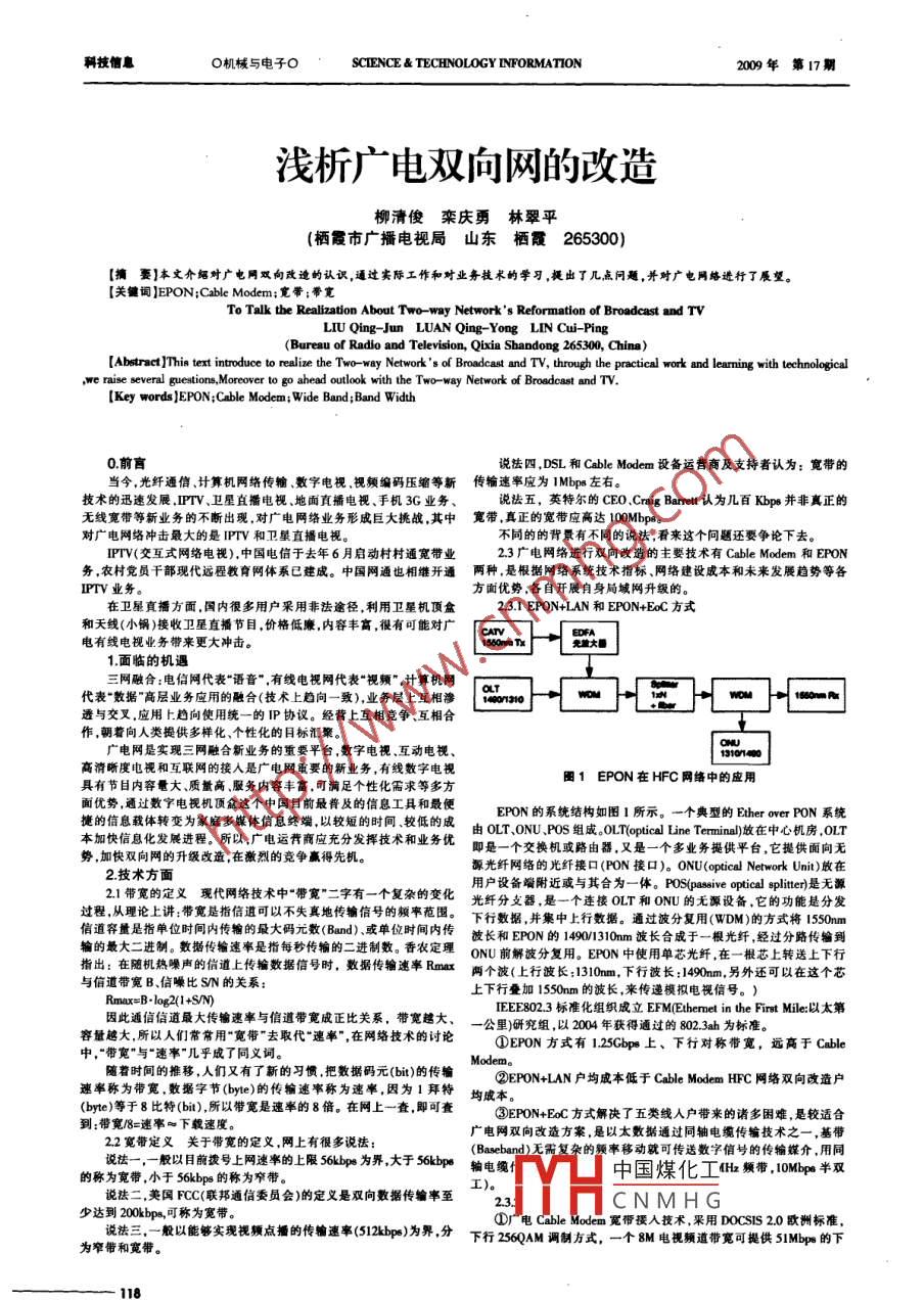 科技信息O機(jī)械與電子OSCIENCE TECHNOLOGY INFORMATION200年第17期淺析廣電雙向網(wǎng)的改造柳清俊欒慶勇林翠平(犧霞市廣播電視局山東棲霞265300)【搞要】本文介紹對廣電網(wǎng)雙向改造的認(rèn)識,遁過實(shí)際工作和對業(yè)務(wù)技術(shù)的學(xué)習(xí),提出了幾點(diǎn)問題,并對廣電網(wǎng)絡(luò)進(jìn)行了展望【關(guān)鍵詞】EPON; Cable Moden;寬帶;帶寬To Talk the Realization About Two-way Network's Reformation of Broadcast and TVLIU Qing-Jun LUAN Qing-Yong LIN Cui-Ping(Bureau of Radio and Television, Qixia Shandong 265300, China)[Abstract)This text introduce to realize the two-way Network's of Broadcast and tV, through the practical work and learning with technologicale raise several guestions, Moreover to go ahead outlook with the Two-way Network of Broadcast and TV[Key words]EPON: Cable Modem; Wide Band; Band Width0前言說法四,DSL和 Cable Modem設(shè)備運(yùn)營商及支持者認(rèn)為:寬帶的當(dāng)今,光纖通信、計(jì)算機(jī)網(wǎng)絡(luò)傳輸視視頻編碼壓縮等新傳輸速率應(yīng)為IMbp左右。技術(shù)的迅速發(fā)展Tv、衛(wèi)星直播電視、地面直播電視、手機(jī)3G業(yè)務(wù)說法五,英特爾的CEo、 Craig Barrett認(rèn)為幾百Kbp并非離正的無線寬帶等新業(yè)務(wù)的不斷出現(xiàn)對廣電網(wǎng)絡(luò)業(yè)務(wù)形成巨大挑戰(zhàn),其中寬帶,真正的寬帶應(yīng)高達(dá)100Mbp對廣電網(wǎng)絡(luò)沖擊最大的是PV和衛(wèi)星直播電視。不同的的背景有不同的說法,看來這個問題還要爭論下去Pv(交互式網(wǎng)絡(luò)電視),中國電信于去年6月啟動村村通寬帶業(yè)23廣電網(wǎng)絡(luò)進(jìn)行雙向改造的主要技術(shù)有 Cable modem和EPON務(wù),農(nóng)村黨員干部現(xiàn)代遠(yuǎn)程教育網(wǎng)體系已建成。中國網(wǎng)通也相繼開通兩種是根據(jù)網(wǎng)絡(luò)系統(tǒng)技術(shù)指標(biāo)、網(wǎng)絡(luò)建設(shè)成本和未來發(fā)展趨勢等各IPTv業(yè)務(wù)。方面優(yōu)勢各自開展自身局域網(wǎng)升級的。在衛(wèi)星真播方面,國內(nèi)很多用戶采用非法途徑,利用衛(wèi)星機(jī)頂盒231EPON+LAN和EPON+EoC方式和天線(小鍋)接收衛(wèi)星直播節(jié)目,價格低廉,內(nèi)容豐富,很有可能對廣「cxy電有線電視業(yè)務(wù)帶來更大沖擊1501面臨的機(jī)遇三網(wǎng)融合:電信網(wǎng)代表“語音”有線電視網(wǎng)代表“視頻代表“數(shù)據(jù)高層業(yè)務(wù)應(yīng)用的融合(技術(shù)上趨向一致),業(yè)務(wù)層140031透與交叉,應(yīng)用上趨向使用統(tǒng)一的IP協(xié)議。經(jīng)營上互相競爭作,朝著向人類提供多樣化、個性化的目標(biāo)匯聚廣電網(wǎng)是實(shí)現(xiàn)三網(wǎng)融合新業(yè)務(wù)的重要平臺,數(shù)字電視、互動電視高清晰度電視和互聯(lián)網(wǎng)的接入是廣電網(wǎng)重要的新業(yè)務(wù),有線數(shù)字電視具有節(jié)日內(nèi)容量大、質(zhì)量高服務(wù)內(nèi)容豐富,可滿足個性化需求等多方國1EPoN在HFc網(wǎng)絡(luò)中的應(yīng)用面優(yōu)勢,通過數(shù)字電視機(jī)頂盒這個中國目前最普及的信息工具和最便EPON的系統(tǒng)結(jié)構(gòu)如圖1所示。一個典型的 Ether over p0N系統(tǒng)捷的信息載體轉(zhuǎn)變?yōu)榧彝ザ嗝襟w信息終端以較短的時間較低的成由OLT、ONUP0S組咸 oLtoptical Line Termin)放在中心機(jī)房,OLT本加快信息化發(fā)展進(jìn)程。所以,廣電運(yùn)背商應(yīng)充分發(fā)擇技術(shù)和業(yè)務(wù)優(yōu)即是一個交換機(jī)或路由器,又是一個多業(yè)務(wù)提供平臺,它提供面向無2技術(shù)方面源光纖網(wǎng)絡(luò)的光纖接口(PON接口)。ONU( (optical Network Unit)放在用戶設(shè)備端附近或與其合為一體。POS( passive optical splitter)是無源2帶寬的定義現(xiàn)代網(wǎng)絡(luò)技術(shù)中“帶寬”二字有一個復(fù)雜的變化光纖分支器,是一個連接OLT和ONU的無源設(shè)備,它的功能是分發(fā)過程,從理論上講:帶寬是指信道可以不失真地傳輸信號的頻率范國。下行數(shù)據(jù),并集中上行數(shù)據(jù)。通過波分復(fù)用(WDM)的方式將1550m信道容量是指單位時間內(nèi)傳輸?shù)淖畲蟠a元數(shù)(Band)、或單位時間內(nèi)傳波長和EPON的14901310m波長合成于一根光纖,經(jīng)過分路傳輸?shù)捷數(shù)淖畲蠖M(jìn)制。數(shù)據(jù)傳輸速率是指每秒傳輸?shù)亩M(jìn)制數(shù)。香農(nóng)定理oNU前解波分復(fù)用。EON中使用單芯光纖,在一根芯上轉(zhuǎn)送上下行指出:在隨機(jī)熱嗓聲的信道上傳輸數(shù)據(jù)信號時,數(shù)據(jù)傳輸速率Bmx兩個波(上行波長:1310m,下行波長:1490m,另外還可以在這個芯與信道帶寬B、信噪比SN的關(guān)系Rmax=B 2(I+S/N)上下行疊加1550mm的波長,來傳遞模擬電視信號。)IEEE8023標(biāo)準(zhǔn)化組織成立EFM( Ethernet in the first Mile以太第因此通信信道最大傳輸速率與信道帶寬成正比關(guān)系,帶寬越大、一公里)研究組,以2004年獲得通過的8023為標(biāo)準(zhǔn)。容量越大所以人們常常用“寬帶”去取代“速率”,在網(wǎng)絡(luò)技術(shù)的討論EPoN方式有12cb上、下行對稱帶寬,遠(yuǎn)高于Ce中,帶寬”與“速率”幾乎成了同義詞隨著時間的推移,人們又有了新的習(xí)慣,把數(shù)據(jù)碼元bi)的傳輸② EPON+LAN戶均成本低于 Cable Modem HFC網(wǎng)絡(luò)雙向改造戶速率稱為帶寬,數(shù)據(jù)字節(jié)(bye)的傳輸速率