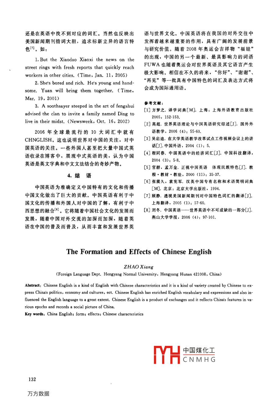 第32卷第2期衡陽師范學院學報No 2VoL. 322011年4月Journal of Hengyang Normal UniversityApr.2011中國英語的形成及影響趙湘(衡陽師范學院外語系,湖南衡陽421008)摘要:中國英語是具有中國特色的英語,它是由中國人根據(jù)自己的思維方式創(chuàng)的用以表達中國的政治、經(jīng)濟、社會文化等領城的事物與現(xiàn)象的一種英語變體。中國英語不僅豐富了英語詞匯及英語表達,也對英語產(chǎn)生了不可忽視的影響,已成為世界英語的一部分。中國英語是中外交流的產(chǎn)物,折射出中國不同時期的時代特征記載了中國改革開放后的社會圖景關鍵詞:中國英語;形成;影響;中國特色中圖分類號:H315文獻標識碼:A文章編號:1673-0313(2011)02-012904根據(jù)美國“全球語言監(jiān)督”( Global Language世界宣傳中國,傳播中華悠久而燦爛的文化,還Monitor)機構的報告,英語正在經(jīng)歷其歷史上前所未真的離不開中國英語。中國英語在我國對外宜傳有的變革,她正在加速吸收全球性詞匯,已逐漸成為方面所起的作用是巨大的,其影響也是十分深世界混合語言,全球化趨勢加速了其同化速率,而中遠的。國對其影響最大。從1994年加入世界英語行列的詞1.關于中國英語匯來看,5%至20%來自中國英語,超過任何其他的來源,而這些新詞和詞組,不用向母語為英語的人士中國英語,顧名思義,是具有中國特色的英特別解釋,都能被理解。這種中國趨勢改變了英語的語,它是由中國人(主要是中國的翻譯工作者)味道,也正在改變人們對英語語言的認知,使人們的根據(jù)自己的思維方式創(chuàng)造的用以表達中國的政治、思維方式更加色彩斑斕。該機構主席帕亞克( Paul Jj經(jīng)濟、社會文化等領域的事物與現(xiàn)象的一種英語Payack)指出(www.languagemonitor.com),中國有變體。我們在用英語描述中國特有的事物時經(jīng)常2.5億人在學習英語,幾乎相當于60年代全世界找不到對應詞,或有時勉強有對應詞但又找不到說英語人數(shù)的總和,由于中國增長的影響,它現(xiàn)恰當?shù)谋磉_方式,所以中國英語的詞匯和表達方在對世界英語( Global English)的沖擊比英語國式往往最富中國文化個性。中國英語既不同于中家還大。中國人每天都在制造新的英語詞匯,英式英語也不同于洋涇濱英語。中式英語(Ch語詞匯庫也隨著這些新詞匯的流通而迅速擴大 inglish)指口頭或書面表達的不地道的英語。不符languagemon合或不完全符合英語的規(guī)律和習慣。說者的思維這也許是我們中國人在語言方面太有想象力方式、表達方式以及詞匯的選擇和搭配都是中國和創(chuàng)造力的緣故。隨著中國經(jīng)濟的增長和國際地式的。出于受過一定的英語教育的人之口,常用位的提高,中國在全球的影響力不斷上升,在對來應付書面或口頭的日常交際。如,我們每天都外宣傳方面,我們根據(jù)自己特有的思想、語言和看書。( We see books every day.)這里的動詞應文化不斷地改變著英語的表達方式,從而形成具用read。洋涇濱英語( Pidgin english)是指硬扣有中國特色的中國英語( China english)。中國英漢語字眼,套用漢語詞序或語法的不倫不類的英語既是一種客觀存在,也是一種普遍現(xiàn)象,要向語H中國煤化工與之交往的一些CNMHG收稿日期:2010-1209者簡介:趙湘(1957—),男,河北邢臺人,教授,從事翻譯、語言與文化研究。沒有機會接受正規(guī)外語教育的中國人所說的英語。進入新世紀,特別是隨著我國加人WTO以及般指口語,輔以身勢語和當時情境,只能作最北京申奧、上海申博成功,標志著中國更加開放簡單的交際。它的特點是:詞匯主要取自外語,與外部世界的聯(lián)系更為密切。在這樣的歷史背景數(shù)量不多;語音夾雜當?shù)卣Z言的語音;語法簡化;下和社會環(huán)境中,掌握了英語,就能使我們更加多形象、直觀的表達。如, You see right no有效地參與國際競爭。德國語言學家、哲學家洪right.(你看對不對。)洋涇濱英語是中國特定時期堡特認為,語言是“一個民族進行思維和感知的的特定產(chǎn)物,對于中國的對外宣傳、英語教學及工具”,每一種語言都包含了一種獨特的世界觀。國際交流具有消極意義。但在英美人士看來,中語言習得的完成,是某種思維方式形成的標志。國英語同中式英語并沒有本質的區(qū)別,如,Long個人一旦首先習得了漢語,形成了中國式的思time no see.中國人自己不敢用,英美人士倒是用維方式,他將不可避免地在其英語使用中夾帶中得很自在;對中國特色的 Spring Festival Trans-國特點。由于漢英文化的差異,在用英語表示中portation他們也能理解并照用不誤,在他們的眼國社會文化中某些特有的事物與現(xiàn)象時,經(jīng)常發(fā)中這些都是 Chinglish,因為是中國人根據(jù)自己的現(xiàn)詞匯空缺,出現(xiàn)表達真空。這時人們常通過譯國情創(chuàng)造出來的。中國英語不是偶然現(xiàn)象,而是借、逐詞對譯、混合語等手段,使?jié)h語的詞匯進經(jīng)過了長期的使用和發(fā)展起來的現(xiàn)實,中國英語人英語交際。一切的語言都有其成長的過程,中可以用來介紹和表述獨特的中國文化2。雖說中國國英語由于長期的發(fā)展,已有許多開始被認可。英語不同于中式英語和洋涇濱英語,但后者對中另外,海外華裔作家在推動中國英語方面發(fā)揮了國英語的形成也是起了相當?shù)淖饔玫摹UZ言是文重要作用,他們用英語介紹中國文化或當代