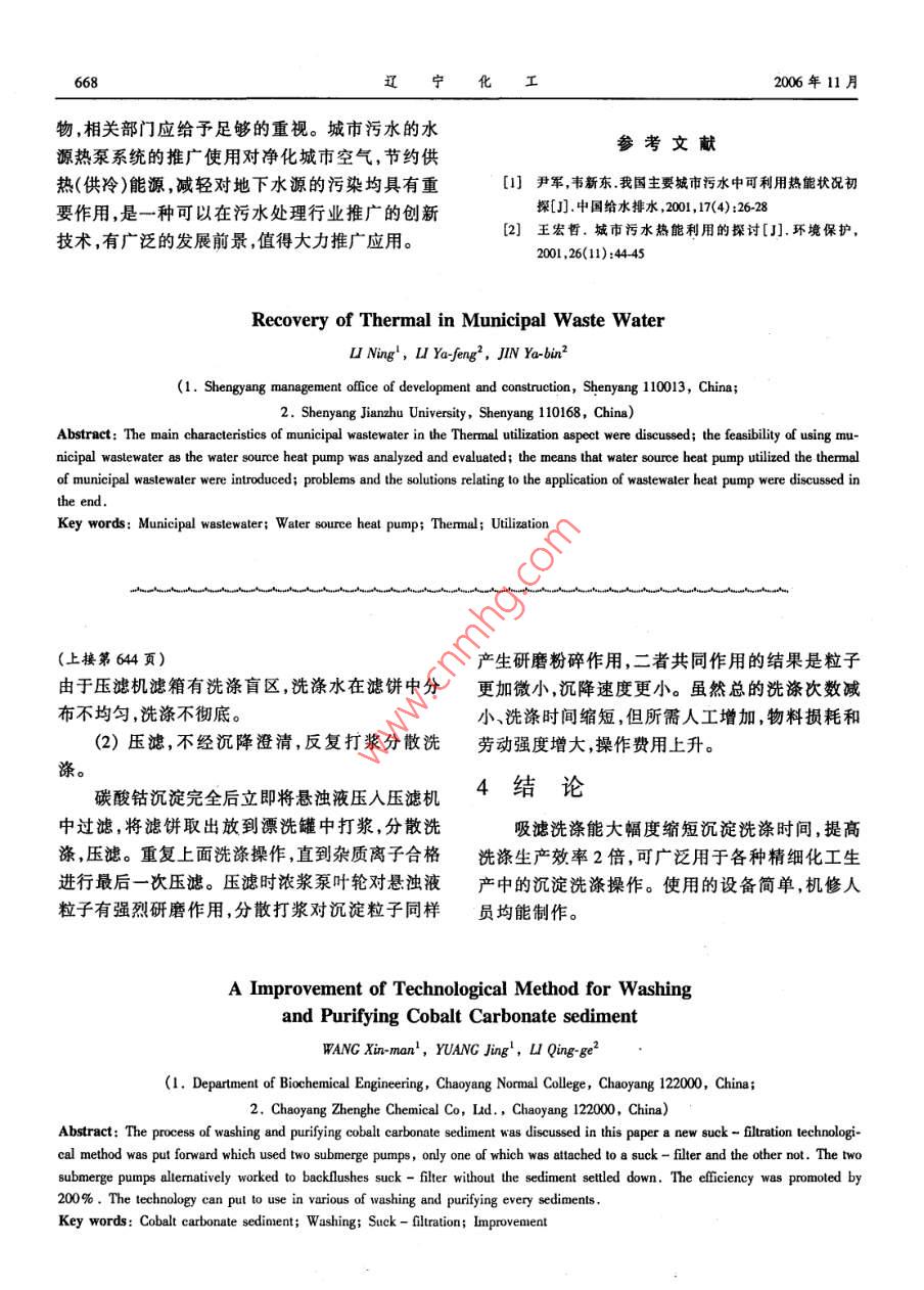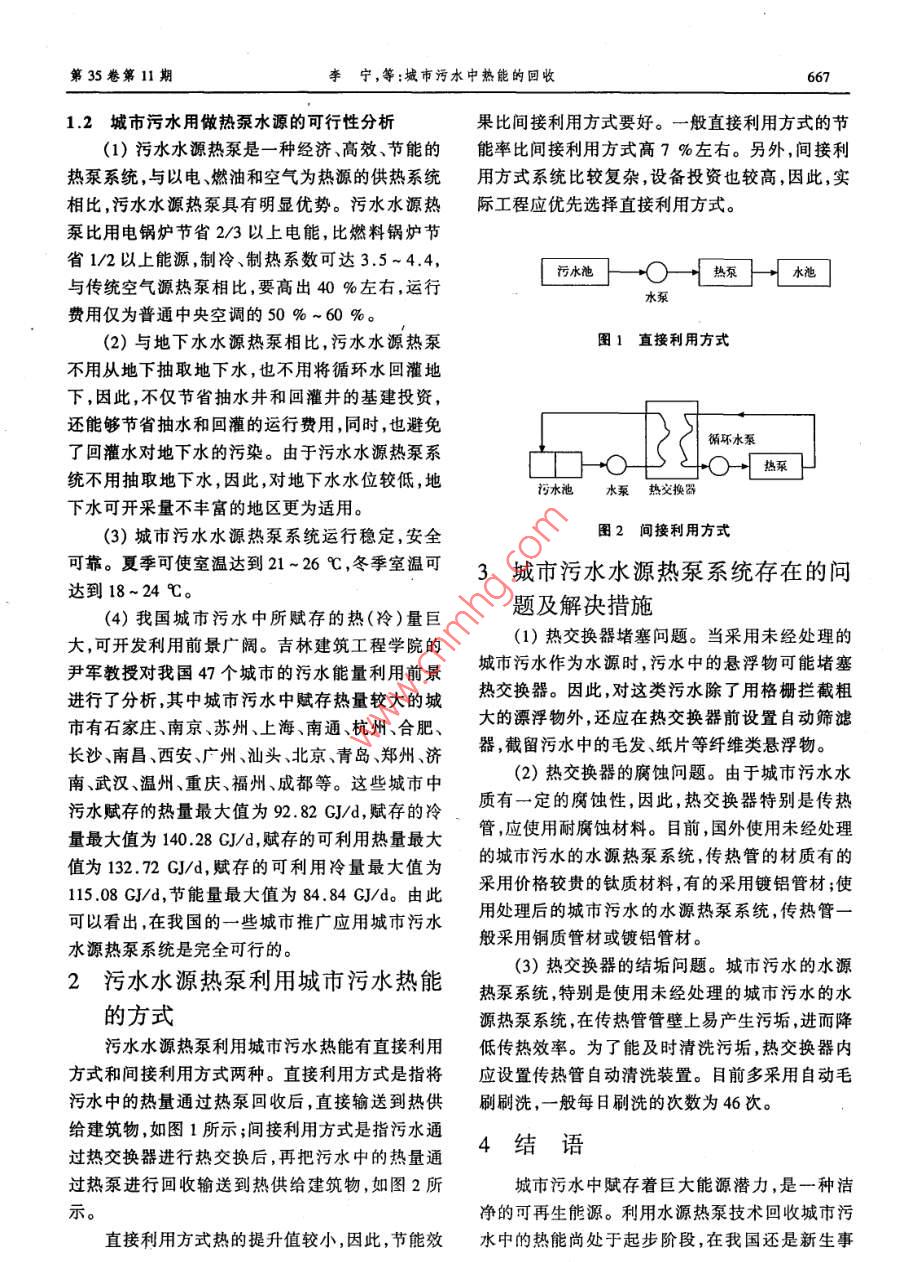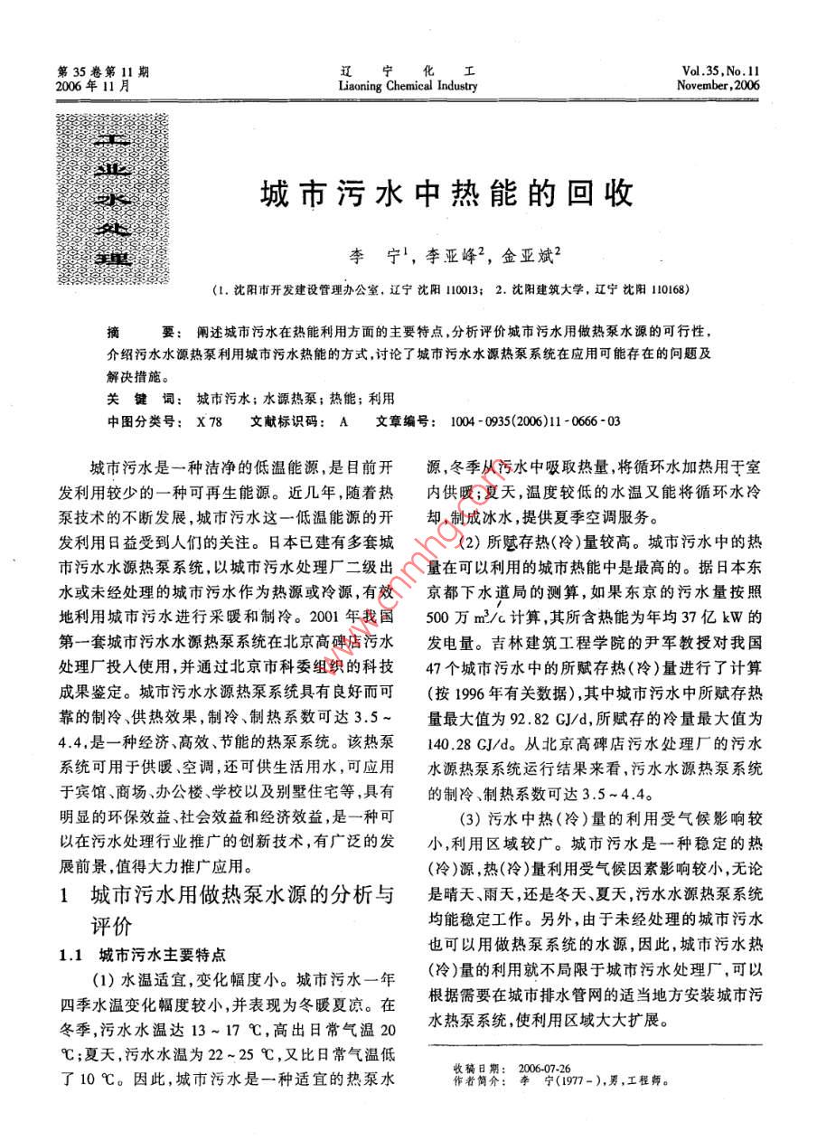 第35卷第11期遼寧化工Vol 35, No 112006年11月Liaoning Chemical IndustryNovember, 2006城市污水中熱能的回收李寧,李亞峰2,金亞斌2(1.沈陽市開發(fā)建設(shè)管理辦公室,遼寧沈陽113;2.沈陽建筑大學(xué),遼寧沈陽10168)要:闡述城市污水在熱能利用方面的主要特點,分析評價城市污水用做熱泵水源的可行性介紹污水水源熱泵利用城市污水熱能的方式,討論了城市污水水源熱泵系統(tǒng)在應(yīng)用可能存在的問題及解決措施。關(guān)鍵詞:城市污水;水源熱泵;熱能;利用中圖分類號:X78文獻標識碼:A文章編號:1004-0935(2006)11-0666-03城市污水是一種潔凈的低溫能源,是目前開源,冬季從污水中吸取熱量,將循環(huán)水加熱用于室發(fā)利用較少的一種可再生能源。近幾年,隨著熱內(nèi)供暖;夏天,溫度較低的水溫又能將循環(huán)水冷泵技術(shù)的不斷發(fā)展,城市污水這一低溫能源的開卻,制成冰水,提供夏季空調(diào)服務(wù)。發(fā)利用日益受到人們的關(guān)注。日本已建有多套城(2)所賦存熱(冷)量較高。城市污水中的熱市污水水源熱泵系統(tǒng),以城市污水處理廠二級出量在可以利用的城市熱能中是最高的。據(jù)日本東水或未經(jīng)處理的城市污水作為熱源或冷源,有效京都下水道局的測算,如果東京的污水量按照地利用城市污水進行采暖和制冷。2001年我國500萬m3/c計算,其所含熱能為年均37億kW的第一套城市污水水源熱泵系統(tǒng)在北京高碑店污水發(fā)電量。吉林建筑工程學(xué)院的尹軍教授對我國處理廠投人使用,并通過北京市科委組織的科技47個城市污水中的所賦存熱(冷)量進行了計算成果鑒定。城市污水水源熱泵系統(tǒng)具有良好而可(按1996年有關(guān)數(shù)據(jù)),其中城市污水中所賦存熱靠的制冷、供熱效果,制冷、制熱系數(shù)可達3.5~量最大值為92.82GJ/d,所賦存的冷量最大值為44,是一種經(jīng)濟、高效、節(jié)能的熱泵系統(tǒng)。該熱泵140.28GJ/d。從北京高碑店污水處理廠的污水系統(tǒng)可用于供暖、空調(diào),還可供生活用水,可應(yīng)用水源熱泵系統(tǒng)運行結(jié)果來看,污水水源熱泵系統(tǒng)于賓館、商場辦公樓、學(xué)校以及別墅住宅等,具有的制冷制熱系數(shù)可達3.5-44。明顯的環(huán)保效益、社會效益和經(jīng)濟效益,是一種可(3)污水中熱(冷)量的利用受氣候影響較以在污水處理行業(yè)推廣的創(chuàng)新技術(shù),有廣泛的發(fā)小,利用區(qū)域較廣。城市污水是一種穩(wěn)定的熱展前景,值得大力推廣應(yīng)用。(冷)源,熱(冷)量利用受氣候因素影響較小,無論1城市污水用做熱泵水源的分析與是晴天、雨天,還是冬天、夏天,污水水源熱泵系統(tǒng)評價均能穩(wěn)定工作。另外,由于未經(jīng)處理的城市污水1.1城市污水主要特點也可以用做熱泵系統(tǒng)的水源,因此,城市污水熱(1)水溫適宜變化幅度小。城市污水一年(冷)量的利用就不局限于城市污水處理廠可以四季水溫變化幅度較小,并表現(xiàn)為冬暖夏涼。在根據(jù)需要在城市排水管網(wǎng)的適當(dāng)?shù)胤桨惭b城市污冬季,污水水溫達13~17℃,高出日常氣溫20水熱泵系統(tǒng),使利用區(qū)域大大擴展?!?夏天,污水水溫為22~25℃,又比日常氣溫低了10℃。因此,城市污水是一種適宜的熱泵水著銅費:2F(1m-),男,工程師。第35卷第11期李寧,等;城市污水中熱能的回收12城市污水用做熱泵水源的可行性分析果比間接利用方式要好。一般直接利用方式的節(jié)(1)污水水源熱泵是一種經(jīng)濟、高效、節(jié)能的能率比間接利用方式高7%左右。另外,間接利熱泵系統(tǒng),與以電、燃油和空氣為熱源的供熱系統(tǒng)用方式系統(tǒng)比較復(fù)雜,設(shè)備投資也較高,因此,實相比,污水水源熱泵具有明顯優(yōu)勢。污水水源熱際工程應(yīng)優(yōu)先選擇直接利用方式。泵比用電鍋爐節(jié)省2/3以上電能,比燃料鍋爐節(jié)省1/2以上能源,制冷、制熱系數(shù)可達3.5~4.4與傳統(tǒng)空氣源熱泵相比,要高出40%左右,運行污水池}熱系」一水池水泵費用僅為普通中央空調(diào)的50%~60%。(2)與地下水水源熱泵相比,污水水源熱泵圖1直接利用方式不用從地下抽取地下水,也不用將循環(huán)水回灌地下,因此,不僅節(jié)省抽水井和回灌井的基建投資,還能夠節(jié)省抽水和回灌的運行費用,同時,也避免循環(huán)水泵了回灌水對地下水的污染。由于污水水源熱泵系統(tǒng)不用抽取地下水,因此,對地下水水位較低,地污水池水泵熱交換器下水可開采量不豐富的地區(qū)更為適用。(3)城市污水水源熱泵系統(tǒng)運行穩(wěn)定,安全圖2間接利用方式可靠。夏季可使室溫達到21-26℃,冬季室溫可3城市污水水源熱泵系統(tǒng)存在的問達到18~24℃。(4)我國城市污水中所賦存的熱(冷)量巨題及解決措施大,可開發(fā)利用前景廣闊。吉林建筑工程學(xué)院的(1)熱交換器堵塞問題。當(dāng)采用未經(jīng)處理的尹軍教授對我國47個城市的污水能量利用前景城市污水作為水源時,污水中的懸浮物可能堵塞進行了分析,其中城市污水中賦存熱量較大的城熱交換器。因此,對這類污水除了用格柵攔截粗市有石家莊、南京、蘇州、上海、南通、杭州、合肥、大的漂浮物外,還應(yīng)在熱交換器前設(shè)置自動篩濾長沙、南昌西安廣州、汕頭、北京、青島、鄭州濟器,截留污水中的毛發(fā)紙片等纖維類懸浮物。南、武