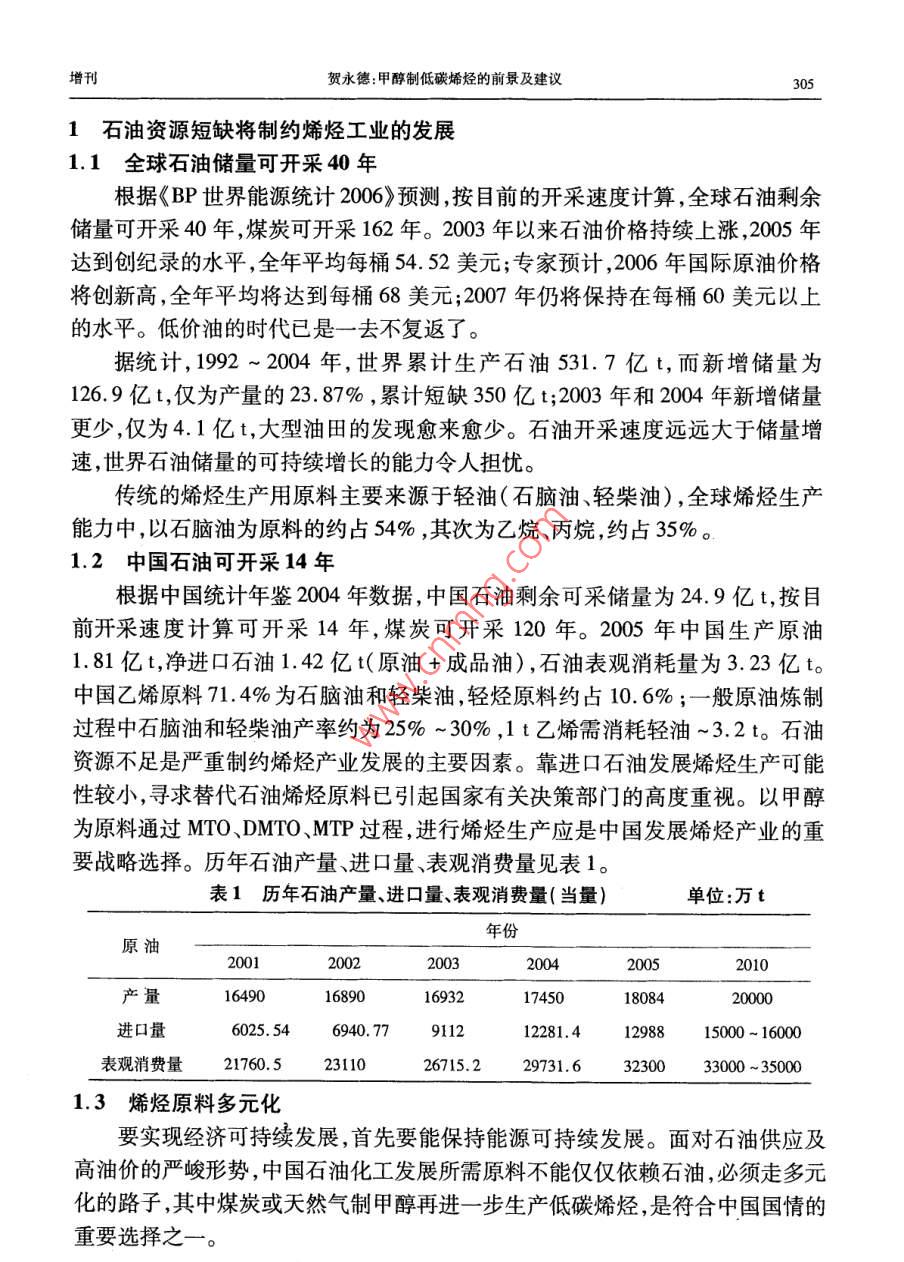 第35卷增刊應(yīng)用化工Vol. 35 Supplement2006年10月Aplied Chemical IndustryOct.2006甲醇制低碳烯烴的前景及建議賀永德(陜西省化工學(xué)會(huì)理事長(zhǎng),陜西西安710054)摘要:以甲 醇替代石腦油作原料。通過(guò)MTO、DMTO、MTP過(guò)程生產(chǎn)低碳烯烴(乙烯、丙烯)的技術(shù)開(kāi)發(fā)取得突破性進(jìn)展。國(guó)內(nèi)完成了DMTO技術(shù)規(guī)模為1.5萬(wàn)Va的工業(yè)性實(shí)驗(yàn),并通過(guò)了國(guó)家鑒定。甲醇轉(zhuǎn)化率99.42% ,乙烯+丙烯選擇性79. 21% ,每噸烯烴消耗甲醇2.62 t。該技術(shù)基本建設(shè)大型工業(yè)裝置的條件,其發(fā)展前景看好。關(guān)鍵詞:甲醇制烯烴技術(shù);經(jīng)濟(jì)分析;發(fā)展前景中圖分類號(hào):TQ 223.1文獻(xiàn)標(biāo)識(shí)碼:A .Prospect and suggestion of methanolto low carbon olefinHE Yong-de( Board Chair Person of Shaanxi Chemical Engineering Academy ,Xi' an 710054 ,China)Abstract: Methanol is in place of naphtha as the raw material ,in the process of MTO , DM-TO,MTP producing low caron olefins ( ethylene and propylene) , and the thchnology has achieved the breaking-out development. DMTO technology of 1.5 x 104 t/a industry test has .been finished in our country , getting the identification of China. Conversion of methanol is99. 42% . Meanwhile the selectivity of ethylene plus propylene is 79. 21 % . And per ton olefinis consumption of 2. 62 ton methanol. So the technology possesses the condition of construc-tion large industry installation. Its development prospect is very well.Key words: technolgy of methanol to olefin; economy analysis ; development prospect甲醇制烯烴技術(shù)已成為國(guó)內(nèi)外研究開(kāi)發(fā)的熱門(mén)課題,美國(guó)、德國(guó)、中國(guó)等在技術(shù)開(kāi)發(fā)的基礎(chǔ)上加快了工業(yè)化的進(jìn)程。隨著世界石油資源日益短缺和石油價(jià)格持續(xù)上漲,使這一進(jìn)程正以前所未有的速度向前推進(jìn),甲醇制烯烴的大型工業(yè)化裝置建設(shè)指日可待。近10年來(lái),中國(guó)石油和烯烴產(chǎn)品進(jìn)口量快速增長(zhǎng),對(duì)外依存分別接近45%和50%左右,如此發(fā)展下去,到2015年對(duì)外依存度有可能達(dá)到60%左右。因此,在中國(guó)加快發(fā)展石油替代產(chǎn)品,尋求非石油原料生產(chǎn)烯烴,減少石油對(duì)外依存度,同時(shí)減少烯烴產(chǎn)品對(duì)進(jìn)口的依賴,已成為中國(guó)石油化工可持續(xù)發(fā)展的當(dāng)務(wù)之急。增刊賀永德:甲醇制低碳烯烴的前景及建議3051石油資源短缺將制約烯烴工業(yè)的發(fā)展1.1全球石油儲(chǔ)量可開(kāi)采40年根據(jù)《BP世界能源統(tǒng)計(jì)2006》預(yù)測(cè),按目前的開(kāi)采速度計(jì)算,全球石油剩余儲(chǔ)量可開(kāi)采40年,煤炭可開(kāi)采162年。2003年以來(lái)石油價(jià)格持續(xù)上漲,2005年達(dá)到創(chuàng)紀(jì)錄的水平,全年平均每桶54.52美元;專家預(yù)計(jì),2006年國(guó)際原油價(jià)格將創(chuàng)新高,全年平均將達(dá)到每桶68美元;2007年仍將保持在每桶60美元以上的水平。低價(jià)油的時(shí)代已是一去不復(fù)返了。據(jù)統(tǒng)計(jì),1992 ~ 2004年,世界累計(jì)生產(chǎn)石油531.7億t,而新增儲(chǔ)量為126.9億t,僅為產(chǎn)量的23.87%,累計(jì)短缺350億t;2003年和2004年新增儲(chǔ)量更少,僅為4.1億t,大型油田的發(fā)現(xiàn)愈來(lái)愈少。石油開(kāi)采速度遠(yuǎn)遠(yuǎn)大于儲(chǔ)量增速,世界石油儲(chǔ)量的可持續(xù)增長(zhǎng)的能力令人擔(dān)憂。傳統(tǒng)的烯烴生產(chǎn)用原料主要來(lái)源于輕油(石腦油、輕柴油),全球烯烴生產(chǎn)能力中,以石腦油為原料的約占54%,其次為乙烷、丙烷,約占35%。1.2中國(guó)石油可開(kāi)采14 年根據(jù)中國(guó)統(tǒng)計(jì)年鑒2004年數(shù)據(jù),中國(guó)石油剩余可采儲(chǔ)量為24.9億t,按目.前開(kāi)采速度計(jì)算可開(kāi)采14 年,煤炭可開(kāi)采120年。2005 年中國(guó)生產(chǎn)原油1. 81億t,凈進(jìn)口石油1.42億t(原油+成品油) ,石油表觀消耗量為3.23億t。中國(guó)乙烯原料71.4%為石腦油和輕柴油,輕烴原料約占10.6%;-般原油煉制過(guò)程中石腦油和輕柴油產(chǎn)率約為25% ~30%,1 t乙烯需消耗輕油~3.2t。石油資源不足是嚴(yán)重制約烯烴產(chǎn)業(yè)發(fā)展的主要因素??窟M(jìn)口石油發(fā)展烯烴生產(chǎn)可能性較小,尋求替代石油烯烴原料已引起國(guó)家有關(guān)決策部門(mén)的高度重視。以甲醇為原料通過(guò)MTO、DMTO、MTP過(guò)程,進(jìn)行烯烴生產(chǎn)應(yīng)是中國(guó)發(fā)展烯烴產(chǎn)業(yè)的重要戰(zhàn)略選擇。歷年石油產(chǎn)量、進(jìn)口量、表觀消費(fèi)量見(jiàn)表1。表1歷年石油產(chǎn)量、 進(jìn)口量、表觀消費(fèi)量(當(dāng)量)單位:萬(wàn)t年份原油200120022003200420052010產(chǎn)量164901689016932174501808420000進(jìn)口量6025. 546940.77911212281.4 .1298815000 ~ 16000表觀消費(fèi)量21760. 52311026715.229731. 63230033000 ~ 350001.3烯烴 原料多元化要實(shí)現(xiàn)經(jīng)濟(jì)可持續(xù)發(fā)展,首先要能保持能源可持續(xù)發(fā)展。面對(duì)石油供應(yīng)及高油價(jià)的嚴(yán)峻形勢(shì),中國(guó)石油化工發(fā)展所需原料不能僅僅依賴石油,必須走多元化的路子,其中煤炭或天然氣制甲醇再進(jìn)--步生產(chǎn)低碳烯烴,是符合中國(guó)國(guó)情的重要選擇之一。306應(yīng)用化工2006年第35卷增