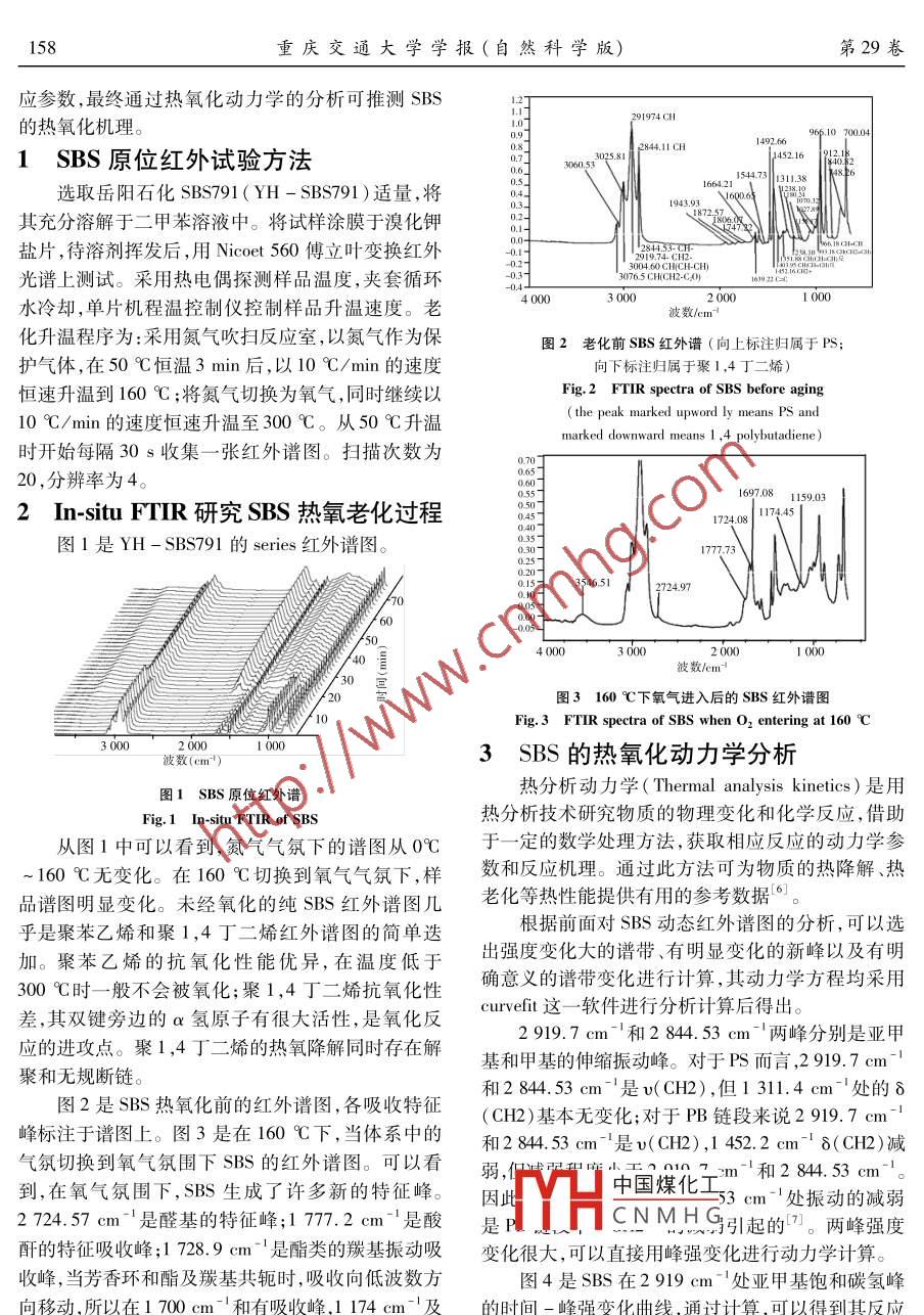 第29卷第1期重慶交通大學(xué)學(xué)報(bào)(自然科學(xué)版)Vol 29 Ne2010年2月JOURNAL OF CHONGQING JIAOTONG UNIVERSITY(NATURAL SCIENCE)Feb.2010SBS熱氧老化動(dòng)力學(xué)研究曹雪娟',雷運(yùn)波2(1.重慶交通大學(xué)土木建筑學(xué)院,重慶400074;2.后勤工程學(xué)院軍事建筑工程系,重慶4000411摘要:采用原位紅外技術(shù)跟蹤SBsS熱氧化過(guò)程,同時(shí)通過(guò)熱分析動(dòng)力學(xué)技術(shù)計(jì)算了SBS的氧化動(dòng)力學(xué)反應(yīng)參數(shù)。研究表明,160℃以下時(shí),氮?dú)夥諊械腟BS無(wú)降解斷鏈現(xiàn)象發(fā)生。在氧氣氛圍下,SBS中的PB段發(fā)生熱氧化降及無(wú)規(guī)則斷鏈。在300℃以下時(shí),SBS中的PS段抗氧性能優(yōu)異,無(wú)氧化發(fā)生;PB段中雙鍵旁的α氫原子有很大性,是氧化反應(yīng)的進(jìn)攻點(diǎn),其熱氧化降解同時(shí)存在解聚和無(wú)規(guī)斷鏈,自動(dòng)氧化反應(yīng)是SBS熱氧老化的主要特征,應(yīng)機(jī)理為自由鏈?zhǔn)?反應(yīng)過(guò)程包括鏈引發(fā)、鏈增長(zhǎng)和鏈終止,反應(yīng)經(jīng)過(guò)初始自由基的誘導(dǎo)期后,SBS迅速被氧化并發(fā)生嚴(yán)重降解。關(guān)鍵詞:SBS熱氧化;原位紅外;熱分析動(dòng)力學(xué);自動(dòng)氧化中圖分類(lèi)號(hào):TQ334.3;TQ031.7文獻(xiàn)標(biāo)志碼:A文章編號(hào):1674-0696(2010)01-0157-05Study on Thermal Oxidative Aging Kinetics of SBSCAO Xue-juan, LEI Yun-bo2(1. Shool of Civil Engineering Architecture, Chongqing Jiaotong University, Chongqing 400074, China2 Department of Architecture Martial Engineering, Chongqing Institute of Logistics Engineering of PLAChongqing 400041, China)Abstract: The thermal oxidation process of SBs is tracked by in-situ FTIR; meanwhile, the reaction parameters of SBS oxdation kinetics are calculated by thermal analysis kinetics. The results show that there is no chain scission and degradationoccurred in nitrogen atmosphere below 160C; while, in oxygen atmosphere, thermal oxidative degradation and randomchain scission occur in PB segment of SBS; PS segment of SBs has excellent anti-oxidation performance and it cant be oxidized when temperature is below 300C. The a-H beside the double-bond has great activity, which is easy to be oxidizedThe results also show that both of chain scission and de-polymerization occur in the thermal oxidation reaction. Auto-oxida-tion is the main feature of SBs thermal aging oxidation process. The mechanism of the reaction is freely-chained reactionwhich includes chain initiation, chain growth and chain termination. After the reaction experiences the induction period ofinitial free radical, SBS is oxidized rapidly and degraded severelyKey words: thermal oxidation of SBS; in-situ FTIR thermal analysis kinetics; auto-oxidation苯乙烯-丁二烯-苯乙烯嵌段共聚物(SBS)鏈結(jié)構(gòu)的變化。周立新等4將SBS樣條置于熱氧是目前世界上產(chǎn)量最大的熱塑性彈性體之一,因其老化箱中,測(cè)試了不同抗氧體系下的SBS氧化前后優(yōu)良的拉伸性能、良好的耐低溫性、加工性、溶解性的力學(xué)性能。 SINGHR P.等用動(dòng)態(tài)接觸角和紅外及獨(dú)特的抗滑性而被大量應(yīng)用于橡膠制品、黏合劑光譜以及掃描電鏡硏究SBS在紫外輻照后的變化,及瀝青和樹(shù)脂的改性劑等領(lǐng)域,SBS已成為了世上并提出了SBS的光氧化老化機(jī)理。 WISHWA PRAS目前消費(fèi)量最大的熱塑性彈性體2。但是由于ADA.等分析了不同溶劑溶解SBS的老化情況SBS分子結(jié)構(gòu)中的丁二烯段(PB)不飽和雙鍵的存目前關(guān)于SBS老化的研究多局限于老化前后性能在,使其對(duì)光、熱敏感性增強(qiáng),SBS的老化會(huì)大大降的評(píng)價(jià)機(jī)理研究較少因出,筆者結(jié)合原位動(dòng)態(tài)紅低其使用性能。因此,對(duì)于SBS老化性能的研究具外中國(guó)煤化工了SBS的熱氧老化過(guò)有重要意義。四川大學(xué)葉榮根等3采用紫外光加程,CNMH可溫度變化的分子結(jié)構(gòu)速老化研究了老化前后的力學(xué)性能、特性黏度、分子改變情況,同時(shí)可以得到熱降解、熱老化的動(dòng)力學(xué)反收稿日期:2009-09-08基金項(xiàng)目:國(guó)家高技術(shù)研究發(fā)展計(jì)劃項(xiàng)目(863計(jì)劃)(2003AA333020)乍者簡(jiǎn)介:曹雪娟(1979-),女,四川鄰水人,博土研究生,研究方向?yàn)橹凡牧霞捌涓男约夹g(shù)。E-mail:caoxuejuan@tom.com。158重慶交通大學(xué)學(xué)報(bào)(自然科學(xué)版)第29卷應(yīng)參數(shù),最終通過(guò)熱氧化動(dòng)力學(xué)的分析可推測(cè)SBS的熱氧化機(jī)理。1SBS原位紅外試驗(yàn)方法544.73選取岳陽(yáng)石化SBS791(YH-SBS791)適量,將其充分溶解于二甲苯溶液中。將試樣涂膜于溴化鉀鹽片,待溶劑揮發(fā)后,用 Nicolet560傅立葉變換紅外光譜上測(cè)試。采用熱電偶探測(cè)樣品溫度,夾套循環(huán)水冷卻,單片機(jī)程溫控制儀控制樣品升溫速度。老3000波數(shù)/cm化升溫程序?yàn)?采用氮?dú)獯祾叻磻?yīng)室,以氮?dú)庾鳛楸D2老化前SBS紅外譜(向上標(biāo)注歸屬于PS護(hù)氣體,在50℃恒溫3min后,以10℃/min的速度向下標(biāo)注歸屬于聚1,4丁二烯恒速升溫到160℃;將氮?dú)馇袚Q為氧氣,同時(shí)繼續(xù)以Fig 2 FTIR spectra of SBs before aging10℃/min的速度恒速升溫至300℃。從50℃升溫marked downward means 1, 4 polybutadiene時(shí)開(kāi)始每隔30s收集一張紅外譜圖。掃描次數(shù)為20,分辨率為41159032In- situ ftir研究SBS熱氧老化過(guò)程圖1是YH-SBS791的 serles紅外譜圖。1777732000