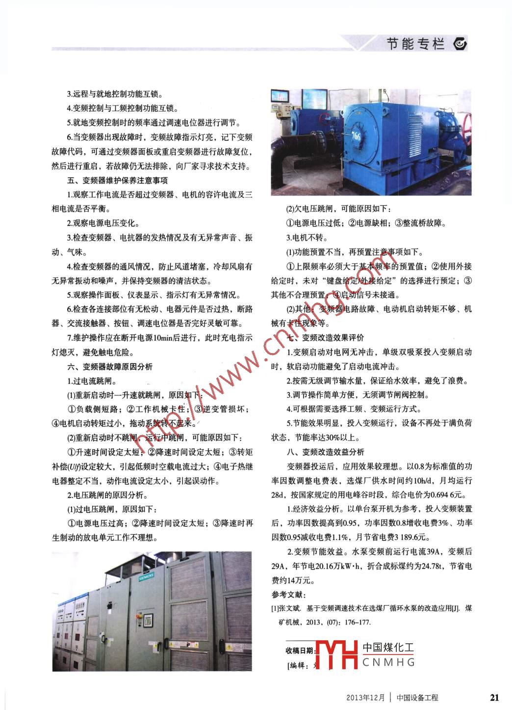 @節(jié)能專欄文章編號:1671-0711(2013)12-0020-02污水站水泵變頻改造張文斌(龍宇能源股份有限公司車集選煤廠,河南永城476600)摘要:介紹了車集選煤廠污水站單級雙吸泵變頻調(diào)速技術(shù)的應(yīng)用情況,通過應(yīng)用變頻器,大大提高了設(shè)備效率,達到了節(jié)能目的。關(guān)鍵詞:水泵;變頻調(diào)速;節(jié)能中圖分類號:TU992.25文獻標(biāo)識碼:B河南龍宇能源股份有限公司車集選煤廠設(shè)計入洗能力、變頻調(diào)速原理和變頻器的結(jié)構(gòu)180萬t年,采用“跳汰+浮選”聯(lián)合工藝流程,經(jīng)技術(shù)改造從異步電動機轉(zhuǎn)速公式n=60可知:保持極對數(shù)不變,后現(xiàn)入洗量300萬t年。其中污水站用電回路屬于中壓系統(tǒng),把電網(wǎng)50Hz恒定頻率的交流電變成可調(diào)頻率交流電,供給部分凈化水由2臺單級雙吸泵輸給煤化工企業(yè),每臺額定功普通的交流異步電動機作電源用。變頻器主電路包括整流率400kW,年耗電量約80萬kWh。由于水泵負載多是根據(jù)單元、高容量電容、逆變器和控制器等,其中整流單元將滿負荷工作需要選型,實際應(yīng)用功率裕量較大,耗能嚴(yán)重。交流電變換成直流電。高容量電容儲存轉(zhuǎn)換后的電能。逆為節(jié)能降耗,選煤廠對單機雙吸泵進行了變頻調(diào)速改造。變器是由大功率開關(guān)晶體管陣列組成的電子開關(guān)把直流電變頻調(diào)速的效果轉(zhuǎn)換成不同頻率、寬度、幅度的方波??刂破靼丛O(shè)定的程水泵的轉(zhuǎn)矩和轉(zhuǎn)速平方成正比,功率和轉(zhuǎn)速立方成正序工作,控制輸出方波的幅度和脈寬,使疊加為近似正弦。所以,只要平均轉(zhuǎn)速稍微降一點,負載功率就下降很波的交流電驅(qū)動電機工作。多,從而達到節(jié)能效果。單機雙吸泵由電機直接帶動,轉(zhuǎn)實施方法速恒定,靠閘閥調(diào)節(jié)水量,造成能源浪費,且啟動電流沖單機雙吸泵主要技術(shù)參數(shù):流量Q=1792m孫,揚程擊電網(wǎng),設(shè)備振動及水泵有“水錘”現(xiàn)象。采用變頻調(diào)速,63m,轉(zhuǎn)速1480rmin,氣蝕余量5.8m,匹配電機功率可根據(jù)需要方便的控制速度,節(jié)能效率接近40%,且變頻器400kW,電機型號Y4002-4,額定電壓6000V,頻率50Hz可實現(xiàn)電機的軟啟軟停,避免了啟動時對電網(wǎng)的沖擊,減額定電流4761A,轉(zhuǎn)速1485r/min,功率因數(shù)080少了電機故障率,延長使用壽命,降低了對電網(wǎng)的容量要對2臺泵變頻調(diào)速改造采用 SIEMENS變頻系統(tǒng),其中核求和無功損耗,消除了水泵驟停產(chǎn)生的“水錘效應(yīng)”。心部件變頻器,選用了羅賓康完美無諧波6SR3502-6(450kW,70A,6kv/6kV,IP31)變頻器柜及U功率單元旁路,配套國產(chǎn)高壓全自動工頻旁路柜和高壓全自動斷路器柜。2臺泵由1臺變頻器以“一拖二方式進行控制,通過轉(zhuǎn)換控制設(shè)備和旁路設(shè)備,實現(xiàn)開停機、調(diào)速、變頻和工頻切換等操作。變頻器魚催出現(xiàn)故障時可采用工頻運行方式,保證不停產(chǎn)。四、6SR3502-6變頻控制柜操作方式該變頻控制柜具有就地和遠程2種操作方式,同i畫時為了防止因變頻器故障而造成電機停止,備有工頻旁路H中國煤化工CNMHG頻轉(zhuǎn)秧廾天。中國設(shè)備工程2013年12月節(jié)能專欄@3遠程與就地控制功能互鎖。4變頻控制與工頻控制功能互鎖。5就地變頻控制時的頻率通過調(diào)速電位器進行調(diào)節(jié)。6當(dāng)變頻器出現(xiàn)故障時,變頻故障指示燈亮,記下變頻故障代碼,可通過變頻器面板或重啟變頻器進行故障復(fù)位然后進行重啟,若故障仍無法排除,向廠家尋求技術(shù)支持。五、變頻器維護保養(yǎng)注意事項1觀察工作電流是否超過變頻器、電機的容許電流及三相電流是否平衡。(2)欠電壓跳閘,可能原因如下:2觀察電源電壓變化①電源電壓過低;②電源缺相;③整流橋故障。3檢查變頻器、電抗器的發(fā)熱情況及有無異常聲音、振電機不轉(zhuǎn)動、氣味。(1)功能預(yù)置不當(dāng),再預(yù)置注意事項如下。4檢查變頻器的通風(fēng)情況,防止風(fēng)道堵塞,冷卻風(fēng)扇有①上限頻率必須大于基本頻率的預(yù)置值;②使用外接無異常振動和噪聲,并保持變頻器的清潔狀態(tài)。給定時,未對“鍵盤給定/外接給定”的選擇進行預(yù)定;③5觀察操作面板、儀表顯示、指示燈有無異常情況。其他不合理預(yù)置;④啟動信號未接通6檢查各連接部位有無松動、電器元件是否過熱,斷路(2)其他:變頻器電路故障、電動機啟動轉(zhuǎn)矩不夠、機器、交流接觸器、按鈕、調(diào)速電位器是否完好靈敏可靠。械有卡住現(xiàn)象等7維護操作應(yīng)在斷開電源10min后進行,此時充電指示七、變頻改造效果評價燈熄滅,避免觸電危險。1變頻啟動對電網(wǎng)無沖擊,單級雙吸泵投入變頻啟動六、變頻器故障原因分析時,軟啟動功能避免了啟動電流沖擊。1過電流跳閘。2按需無級調(diào)節(jié)輸水量,保證給水效率,避免了浪費。(1)重新啟動時一升速就跳閘,原因如下:3.調(diào)節(jié)操作簡單方便,無須調(diào)節(jié)閘閥控制。①負載側(cè)短路;②工作機械卡住;③逆變管損壞4可根據(jù)需要選擇工頻、變頻運行方式。④電機啟動轉(zhuǎn)矩過小,拖動系統(tǒng)轉(zhuǎn)不起來。5節(jié)能效果明顯,投入變頻運行,設(shè)備不再處于滿負荷(2)重新啟動