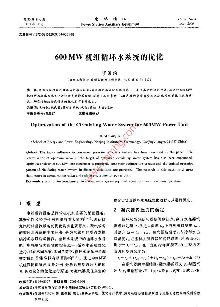 600 MW機(jī)組循環(huán)水系統(tǒng)的優(yōu)化
