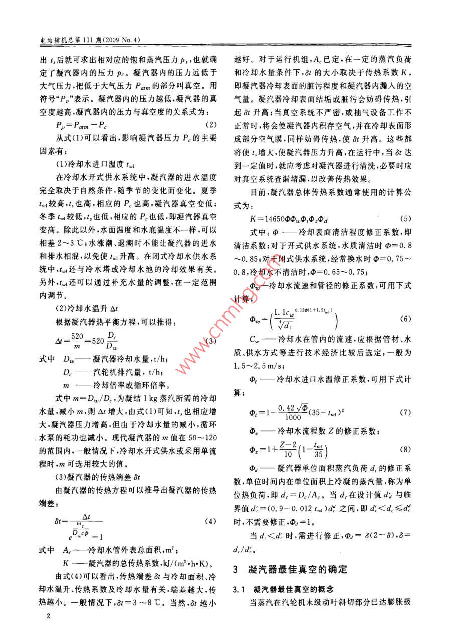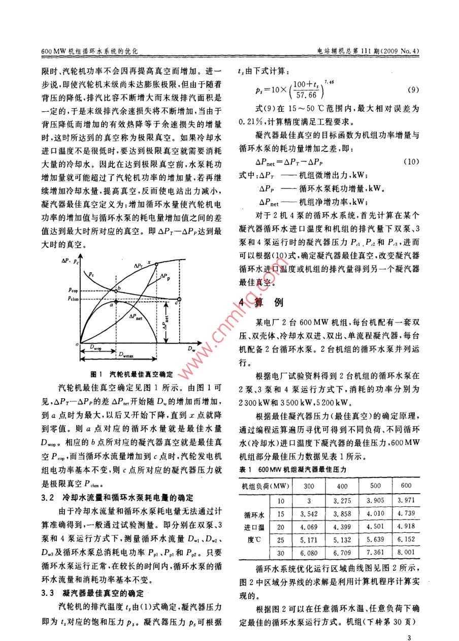 第30卷第4期電站輔機(jī)Vol 30 No, 42009年12月Power Station Auxiliary EquipmentDec.2009文拿編號:672020(2000130600MW機(jī)組循環(huán)水系統(tǒng)的優(yōu)化繆國釣(南京工程學(xué)院能源與動力工程學(xué)院,江蘇南京211167)摘要:介紹汽輪機(jī)凝汽器壓力的彩響因素,闡逑循環(huán)水系統(tǒng)優(yōu)化目標(biāo)——最佳真空的確定方法,通過對600MW機(jī)組的循環(huán)水系統(tǒng)優(yōu)化運(yùn)行方式的計(jì)算分析,得到了不同條件下,凝汽器的最佳真空及循環(huán)水系統(tǒng)的優(yōu)化運(yùn)行方式。研究汽輪機(jī)凝汽設(shè)備的優(yōu)化具有重要意義。關(guān)鍵詞:汽輪機(jī);凝汽器;循環(huán)水系統(tǒng);優(yōu)化;最佳;真空;運(yùn)行中圖分類號:TM627文獻(xiàn)標(biāo)識碼:AOptimization of the Circulating Water System for 600MW Power Unit(School of Energy and Power Engineering, Nanjing Institute of Technology, Nanjing, Jiangsu 211167 China)Abstract: The factor influence to condenser pressure of steam turbine has been described in the paper. Thedetermination of optimum vacuumthe target of optimized circulating water system has also been expounded.Optimum analysis of 600 MW unit condenser is proposed, condenser optimization vacuum and the optimal operationpattern of circulating water system in different conditions are presented. The research in this paper is of greatignificance in energy conservation and reducing consume for power plantKey words: steam turbine: condenser; circulating water system: optimal target; optimum; vacuum: operation1概述確定方法及循環(huán)水系統(tǒng)優(yōu)化運(yùn)行方式進(jìn)行研究。2凝汽器內(nèi)壓力的確定電站凝汽設(shè)備是汽輪機(jī)機(jī)組重要的輔助設(shè)備其安全性和經(jīng)濟(jì)性對機(jī)組有重大影響2,因此研循環(huán)水泵為凝汽器提供冷卻水冷卻水在凝汽究汽輪機(jī)凝汽設(shè)備的優(yōu)化具有重要意義。凝汽設(shè)備器吸熱過程中,從進(jìn)口溫度lm上升到出口溫度ls的循環(huán)水系統(tǒng)的主要任務(wù),是為汽輪機(jī)的凝汽器提其溫升△t=t2-ta。蒸汽凝結(jié)溫度t3與冷卻水出供冷卻水以冷卻排汽。循環(huán)水系統(tǒng)中的循環(huán)水泵是口溫度t之差稱為凝汽器的傳熱端差,用bt表示,電廠中耗電較大的輔助設(shè)備之一,循環(huán)水系統(tǒng)優(yōu)化即t=t1-t。在一定的冷卻面積下,在主凝結(jié)區(qū)運(yùn)行即在不同季節(jié)、不同負(fù)荷下循環(huán)水泵運(yùn)行的調(diào)蒸汽的凝結(jié)溫度為:整對機(jī)組節(jié)能降耗有顯著影響?,F(xiàn)以600MWt,=tm+(tn-tu)+(-tan)=lu+△t+8t(1)機(jī)組汽輪機(jī)凝汽設(shè)備為例,分析影響凝汽壓力的因在凝汽器的主凝結(jié)區(qū),凝汽器的壓力p與蒸汽素闡述設(shè)備的優(yōu)化運(yùn)行原理對凝汽器最佳真空的壓力p,相差甚微可用p代替pc,這樣,由式(1)算收稿日期:200908-07修回日期:200911-09基金項(xiàng)目:江蘇省教育廳自然科學(xué)基礎(chǔ)研究項(xiàng)目(07KJD480080)作者簡介:繆國鈞(1965-)男副教授,碩士,主要從事電廠優(yōu)化運(yùn)行技術(shù)熱力系統(tǒng)經(jīng)濟(jì)性診斷理論及熱工過程自動控制的教學(xué)和研究電站輔機(jī)總第111期(2009No.4)出L3后就可求出相對應(yīng)的飽和蒸汽壓力p,也就確越好。對于運(yùn)行機(jī)組,A已定,在一定的蒸汽負(fù)荷定了凝汽器內(nèi)的壓力p。凝汽器內(nèi)的壓力遠(yuǎn)低于和冷卻水量條件下,8t的大小取決于傳熱系數(shù)K大氣壓力,把低于大氣壓力Pam的部分叫真空。用即凝汽器冷卻表面的臟污程度和凝汽器內(nèi)漏入的空符號“P”表示。凝汽器內(nèi)的壓力越低凝汽器的真氣量。凝汽器冷卻表面結(jié)垢或臟污會妨礙傳熱,引空度越高,凝汽器內(nèi)的壓力與真空度的關(guān)系式為:起8t升高;當(dāng)真空系統(tǒng)不嚴(yán)密,或抽氣設(shè)備工作不P=Pom-P(2)正常時(shí),將會使凝汽器內(nèi)積存空氣,并在冷卻表面形從式(1)可以看出,影響凝汽器壓力P的主要成部分空氣膜,同樣妨礙傳熱,使bt升高。這些都因素有:將使t增大,使凝汽器壓力升高,在運(yùn)行中,當(dāng)bt達(dá)(1)冷卻水進(jìn)口溫度tu到一定值時(shí),就應(yīng)考慮對凝汽器進(jìn)行清洗,必要時(shí)應(yīng)在冷卻水開式供水系統(tǒng)中凝汽器的進(jìn)水溫度對真空系統(tǒng)查漏堵漏,以改善傳熱效果。完全取決于自然條件,隨季節(jié)的變化而變化。夏季目前,凝汽器總體傳熱系數(shù)通常使用的計(jì)算公tm較高,t也高,相應(yīng)的P也高,凝汽器真空變低;式為:冬季tm較低,t3也低,相應(yīng)的P也低,即凝汽器真空K=14650φφa變高。除此以外,水面溫度和水底溫度不一樣,可以式中:φ——冷卻表面清潔程度修正系數(shù),即相差2~3℃;水漲潮、退潮時(shí)不能讓凝汽器的進(jìn)水清潔系數(shù);對于開式供水系統(tǒng),水質(zhì)清潔時(shí)φ=0.8和排水相混,以免使t升高。在閉式冷卻水供水系0.85;對于閉式供水系統(tǒng),經(jīng)常換水時(shí)φ=0.75~統(tǒng)中,山還與冷水塔或冷卻水池的冷卻效果有關(guān)。0.8,冷卻水不清潔時(shí),p=0.65~0.75;另外,tu還可以通過補(bǔ)充水量的調(diào)整,在一定范圍φu-冷卻水流速和管徑的修正系數(shù),可用下式內(nèi)調(diào)節(jié)。計(jì)算;(2)冷卻水溫升1.1cu1261+.5根據(jù)凝汽器熱平衡方程,可以推得:D=520(3)Cu—冷卻水在管內(nèi)的流速,應(yīng)根據(jù)管材、水式中Du—凝汽器冷卻水
