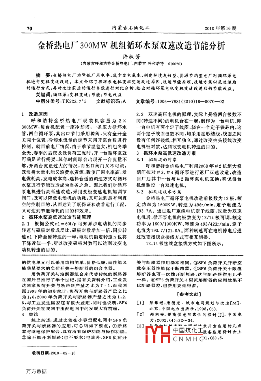 70內(nèi)蒙古石油化工2010年第16期金橋熱電廠300MW機組循環(huán)水泵雙速改造節(jié)能分析許淑芳(內(nèi)蒙古呼和浩特金橋熱電廠,內(nèi)蒙古呼和浩特010070)摘要:金橋熱電廠為降低廠用電率,減少發(fā)電成本,創(chuàng)建環(huán)境友好型、資源節(jié)約型電廠對循環(huán)泵電機進行變極變速改造。本文介紹了循環(huán)泵電機變極變速改造原因、改造節(jié)能原理、改造方案以及改造后的運行方式,并對改造前后的運行參數(shù)進行對比分析,給出對循環(huán)泵電機變極變速改造后的節(jié)能效益。關(guān)鍵詞:循環(huán)泵;變極變速;節(jié)能;節(jié)電效益中圖分類號:TK223.7+5文獻標識碼:A文章編號:1006-7981(2010)16-0070- -021改造原因2.2雙速高壓電機的原理,實際上是將兩臺極數(shù)不呼和浩特金橋熱電廠現(xiàn)裝機容量為2X同(轉(zhuǎn)速不同)的電機合在- -起,制作為-臺電機。即300MW,每臺機配置一座冷卻塔,一條壓力循環(huán)水一臺電機有兩個定子線圈,繞在一個定子鐵芯內(nèi),這管,兩臺循環(huán)泵,其出口節(jié)門采用蝶閥,只有全開全兩個定子線圈極數(shù)不同,均采用星形結(jié)線,線圈之間關(guān)兩個位置,冷卻水流量的調(diào)節(jié)采用開泵臺數(shù)進行沒有任何連接線,相互獨立。通過改變抽頭接線改變控制。就目前電廠情況,由于季節(jié)溫差大,機組冬季電機極對數(shù),達到改變電機轉(zhuǎn)速的目的。全天、春季的后夜及低負荷工況時,開一臺循環(huán)泵就3循環(huán)水 泵高低速改造方案可滿足運行需要,其他時間即會出現(xiàn)開一臺流量不3.1 擬改造的對象夠,開兩臺流量過大的情況,而出口閥門又不可調(diào),呼和浩特金橋熱電廠利用2008年#2機組大修既浪費大量電能又浪費水資源,致使廠用電率高,發(fā)期間擬對#3、#4循環(huán)泵進行返廠雙速改造,改造電煤耗高,發(fā)電成本高,選擇合適的調(diào)速方式對循環(huán)回廠后其中一臺與#2循環(huán)泵電機互換,確保每臺水泵進行節(jié)能改造成為當務之急。因此我們對循環(huán)機組裝設--臺雙速電機。泵電機進行高低速改造,采用變極變速電機加調(diào)節(jié)3.2擬改造技術(shù)方案閥門,既可以降低電動機的功耗,又可達到最有利真金橋熱電廠循環(huán)泵電機改造前極數(shù)為12極,額空的控制目的,從而達到了既保證和改善運行工況,定功率為1600KW、轉(zhuǎn)速為496r/min、定子電流為又可達到節(jié)能降耗的目的和效果。193. 7A.通過返廠“重繞電機定子線圈,改造為雙速2循環(huán)水泵高 低速改造節(jié)能原理電機后,循環(huán)泵電機的極數(shù)變?yōu)?2/14極可調(diào),額定2. 1根據(jù)公式n1= 60f/p可知異步電動機的同步功率為1600/1000KW.轉(zhuǎn)速為493/423r/min.定子轉(zhuǎn)速與磁極對數(shù)成反比,磁極對數(shù)增加一-倍,同步轉(zhuǎn)電流為193.7/121.8A。兩種轉(zhuǎn)速可在電機停電后通速nl下降至原轉(zhuǎn)速的一半,電動機額定轉(zhuǎn)速n也將過改變接線盒接線方式而相互切換。下降近似一半,所以改變磁極對數(shù)可以達到改變電12、14極接線盒接線方式如下圖所示:動機轉(zhuǎn)速的目的。的供電單元可以采用結(jié)構(gòu)簡單、價格低廉、而性能又關(guān)與斷路器作用基本相同。③SF6負荷開關(guān)開斷空能滿足要求的負荷開關(guān)+熔斷器的組合電器。載變壓器性能優(yōu)于斷路器。④SF6負荷開關(guān)+限流用負荷開關(guān)與熔斷器組合來代替?zhèn)鹘y(tǒng)的斷路器熔斷器也可一次性開斷短路,這與斷路器作用幾乎在國外已推行了半個世紀,據(jù)有關(guān)資料介紹,工業(yè)發(fā)一樣。⑤SF6負荷開關(guān)+限流熔斷器的應用效果不達國家負荷開關(guān)與斷路器產(chǎn)武之比為7:1,而我國比斷路器差,但費用要低得多。據(jù)1993年的初步統(tǒng)計,負荷開關(guān)與斷路器產(chǎn)量之比[參考文獻]為1:6,2000年負荷開關(guān)與斷路器產(chǎn)量之比為1:2.5,與工業(yè)發(fā)達國家還有很大差距,同時也說明,SF6[1] 陳章潮,唐德光。城市電網(wǎng)規(guī)劃與改造[M].負荷開關(guān)在我國中壓配電網(wǎng)中的發(fā)展大有前途。北京:中國電力出版社,1998,(5).4結(jié)論[2]鄭宗安.提高供電可靠性 的探討[J].中國電綜上所述,通過比較在小容量配電網(wǎng)中SF6負力,2002,(4):32~34.荷開關(guān)與斷路器的應用,可總結(jié)如下要點:①斷路[3]術(shù)開發(fā)應用的幾點器與繼電保護配合,具有所有保護功能與操作功能.中國煤化工設備應用研討會上②除不能開斷短路(也不要求)電流外,SF6負荷開FYHC N M H G1.(8).6.收稿日期:2010-05-102010年第16期許淑芳金橋 熱電廠300MW機組循環(huán)水泵雙速改造節(jié)能分析71#12根高速運行揆線( 2Y接線)#14極低速運行(O)換線1i9 189只品o-08?899g-g2?。z°2. )4改造后的運行方式5改造后的節(jié)能效果對比金橋熱電廠每臺機組有兩臺循環(huán)水泵,故我們5.1改造前運行情況:單臺循環(huán)泵運行時電流值約選用每臺機組改造一臺循環(huán)泵電機為雙速電機的方為159A,兩臺循環(huán)泵運行時電流值各約為171士2A。案。為此金橋熱電廠利用2008年#2機組大修期間5.2改造后運行情況 :兩臺高速泵運行時電流值各將#2機組兩臺循環(huán)泵電機返廠改造,改造回來后,為171士2A;一高- -低速泵運行時,低速泵電流值約將其中- -臺電機與#1機#2循環(huán)泵電機互換,使得為118士1A,高
