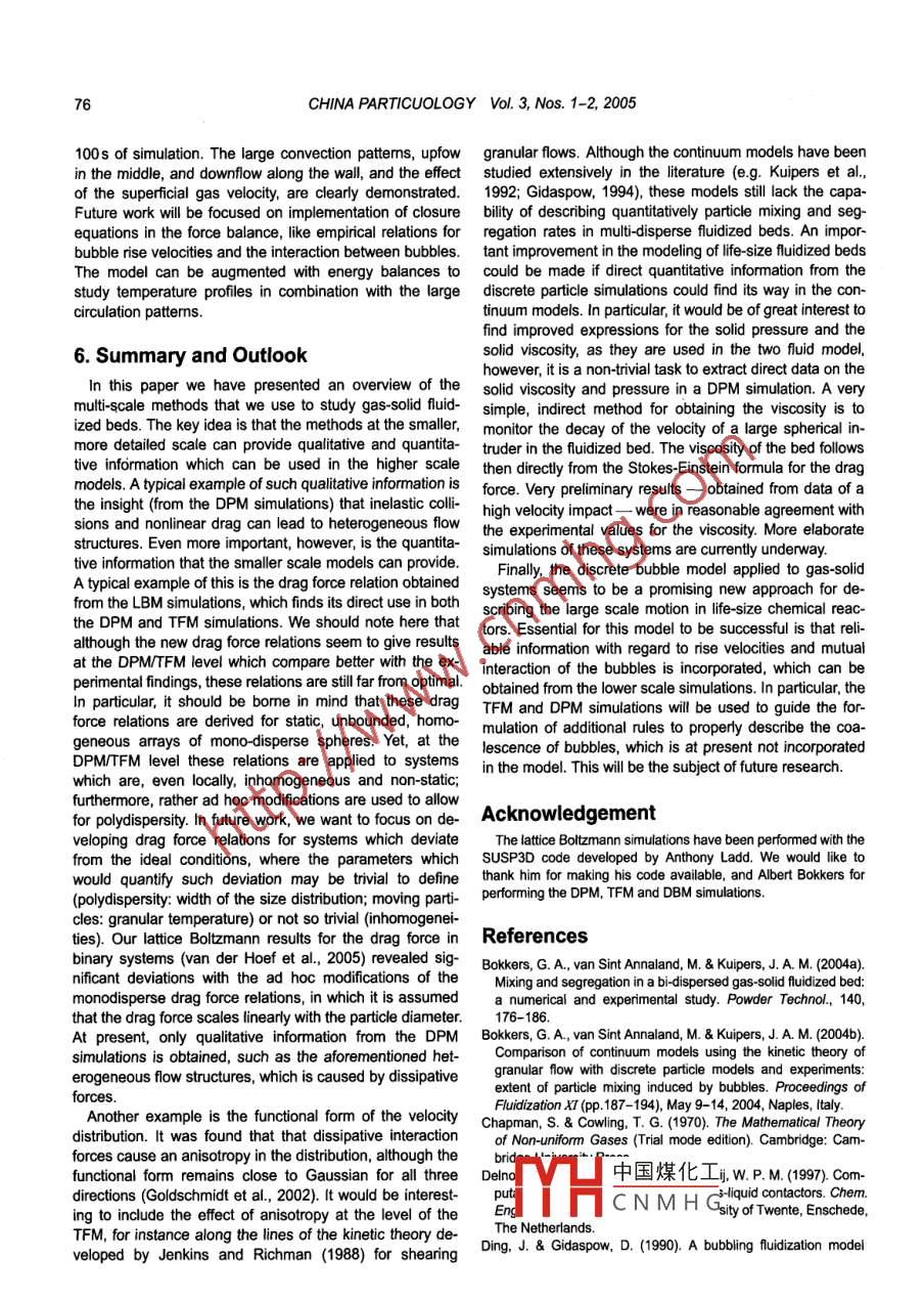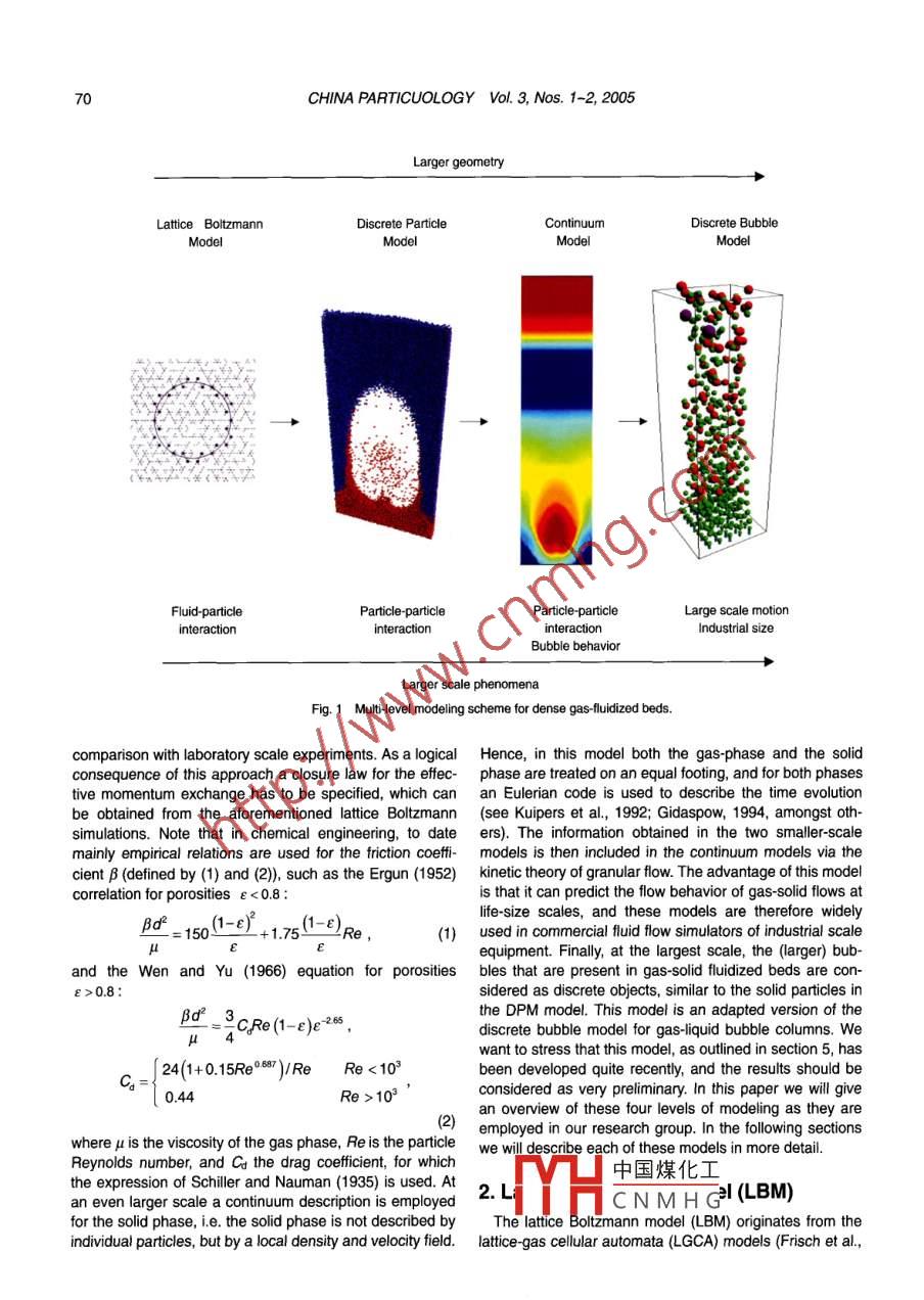 CHINA PARTICUOLOGY Vol. 3, Nos. 1- -2, 69-77, 2005COMPUTATIONAL FLUID DYNAMICS FOR DENSE GAS-SOLIDFLUIDIZED BEDS: A MULTI-SCALE MODELING STRATEGYM. A. van der Hoef, M. van Sint Annaland and J. A. M. Kuipers*Department of Science & Technology, University of Twente, 7500 AE Enschede, The Netherands"Author to whom correspondence should be addressed. E-mail: j.a.m.kuipers@utwente.nlproduction of fuels, frilizers and base chemicals. The scale-up of these processes is often problematic and is related tothe intrinsic complexities of these flows which are unfortunately not yet flly understood despite signifcant efrts made inboth academic and industial research laboratories. In dense gas-particle flows both (fectve) fuid-paricle and (issipative) paricle-particle interactions need to be accounted for because these phenomena to a large extent govern theprevailing flow phenomena, i.e. the formation and evolution of heterogeneous structures. These structures have signif-cant impact on the quality of the gas solid contact and as a direct consequence thereof strongly affect the performance ofthe process. Due to the inherent complexity of dense gas particles flows, we have adopted a multi-scale modeling ap-proach in which both fuid-particle and particle-particle interactions can be properly accounted for. The idea is essentiallythat fundamental models, taking into account the relevant details of fluid-particle (attice Boltzmann model) and parti-cle- particle (discrete particle model) interactions, are used to develop closurelaws to feed continum models which canbe used to compute the flow structures on a much larger (industrial) scale. Our multi-scale approach (see Fig. 1) involvesthe lttie Boltzmann model, the discrete particle model, the continuum model based on the kinetic theory of granular flow,and the discrete bubble model. In this paper we give an overview of the multi-scale modeling strategy, accompanied byilustrative computational results for bubble formatin. In aditin, areas which need substantial further atetion will behighlighted.Keywords dense gas- solid flow, gas-luidized beds, multi-scale modelling1. Introductionelementary physical principles such as drag, friction andDense gas-particle flows are frequently encountered in adissipation (i) based on this insight, develop models withvariety of industrially important gas-solid contactors, ofpredictive capabilties for dense gas-particle flows en-countered in engineering scale equipment. To this end, wewhich the gas-fuidized bed can be mentioned as a veryconsider gas solid flows at four distinctive levels of mod-important example. Due to their favorable mass and heattransfer characteristics, gas-fluidized beds are often ap-At the most detailed level of description the gas flow fieldplied in the chemical, petrochemical, metallurgical, envi-is modeled at scales smaller than the size of the solid par-ronmental and energy industries in large scale operations tcles. The iteraction of the gas phase with the solid phaseinvoling i.e. coating, granulation, drying, and synthesis of is incorporated by imposing "stick* boundary conditins atfuels and base chemicals (Kuni & Levenspiel, 1991). Lackthe surface of the solid particles. This model thus alows usof understanding of the fundamentals of dense gas-particleto measure the effective momentum exchange betweenflows, and in particular of the effects of gas-particle dragthe two phases, which can be used in the higher scaleand particle-particle interations (Kuipers et al, 1998;models. In our model, the flow field between sphericalKuipers & van Swaaij, 1998), has led to severe dificultiesparticles is solved by the latice Bolzmann model (Succi,in the scaleup of these nustily important gas-soid 2001; Ladd & Verberg, 200) although in principle othercontactors (van Swaij, 1990). To arrive at a better under-methods (such as standard computational fluid dynamics)standing of these complicated systems in which bothcould be used as well. At the intermediate level of descrip-gas-particle and priclpartcle iteractions play a domi- tion the Aow feld is modeled at a scale larger than the sizenant role, computer models have become an indispensa-of the particles, where a grid cell typically containsble tool. However, the prime difculty with modeling0(10)~0(10) particles, which are assumed to be perfectgas-fluidized beds is the large separation of scales: thespheres (diameter d), This model consists of two parts: alargest flow structures can be of the order of meters; yetLagrangian code for updating the positions and velocitiesthese structures are found to be directly infuenced byof the solid particles from Newton's law, and a Euleriandetails of the particle-particle collisions, which take placecode for Jndatina the local aas densitv and velocity fromon the scale of millimeters or less. Therefore, we havethe Navi中國(guó)煤化工et al, 1996). The :adopted a muti-level modeling strategy (see Fig. 1), withadvantag_Jel (DPM) is that itthe prime goal to () obtain a fundamental insight in thecan accMHCN M H Gie-partitle itera-complex dynamic behavior of dense gas-particle fluidized tions in a realistic manner, for system sizes of about 0(10")suspensions; that is, to gain an understanding based on particles, which is sufcienty large to llow for a direct70CHINA PARTICUOLOGY Vol. 3, Nos. 1-2, 2005Larger geometryLattice BoltzmannDiscrete ParticleContinuumDiscrete BubbleModelFluid-particleParticle-particleLarge scale motioninteractionIndustrial sizeBubble behavior→Larger scale phenomenaFig. 1 Mutilevel modeling scheme for dense gas-fluidized beds.comparison with laboratory scale experiments. As a logicalHence, in this model both the gas-phase and the solidconsequence of this approach a closure law for the effec-phase are treated on an equal footing, and for both phasestive momentum exchange has to be specified, which canan Eulerian code is used to describe the time evolutionbe obtained from the aforementioned lttice Boltzmann (see