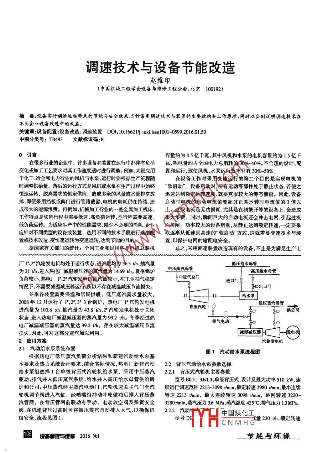 調(diào)速技術(shù)與設(shè)備節(jié)能改造趙維印(中國機械工程學(xué)會設(shè)備與維修工程分會,北京100192)摘要:設(shè)備實行調(diào)速運轉(zhuǎn)帶來的節(jié)能與安全效果,5種常用調(diào)速技術(shù)與裝置的主要結(jié)構(gòu)和工作原理,同時以實例說明調(diào)速技術(shù)在不同企業(yè)設(shè)備改造中的效益關(guān)鍵詞:設(shè)備配置;設(shè)備改造;調(diào)速裝置DO:10.1662 1/j- cnki. issn1001-0599.201601.50中圖分類號:TB493文獻標(biāo)識碼:B0引言容量約為45億千瓦,其中風(fēng)機和水泵的電機容量約為15億千在很多行業(yè)的企業(yè)中,許多設(shè)備和裝置在運行中都伴有負(fù)荷瓦耗電量約占全國電力總消耗的30%40%。不合理的設(shè)計、配變化或加工工藝要求對其工作速度適時進行調(diào)整。例如大量應(yīng)用置和運行,致使風(fēng)機、水泵運行效率只有30%-50%。于化工冶金和電力行業(yè)的風(fēng)機與水泵,運行時要根據(jù)生產(chǎn)流程隨在設(shè)備工作時采用變速運行的第二個目的是實現(xiàn)電機的時調(diào)整供給量。落后的運行方式是風(fēng)機或水泵在生產(chǎn)過程中始終“軟啟動”。設(shè)備啟動時所有運動零部件處于靜止?fàn)顟B(tài),若使之恒速運轉(zhuǎn),脫離需求的恒定供應(yīng),造成多余的風(fēng)量或水量排空放迅速達到額定運轉(zhuǎn)速度就要克服較大的靜態(tài)慣量。因此,設(shè)備掉即便采用擋板或閥門進行管路截留電機的電耗仍在持續(xù)造啟動時電機的啟動電流值要超過正常運轉(zhuǎn)時電流值的3倍以成很大的能源浪費。再例如機械加工行業(yè)的一些金屬加工機床,上。這股電流是無功損耗,尤其是在頻繁開停的設(shè)備上,會造成作特點是切削行程中需要低速高負(fù)荷運轉(zhuǎn)空行程需要高速、很大浪費。同時瞬間巨大的啟動電流還會沖擊電網(wǎng)引起過流低負(fù)荷運轉(zhuǎn)。為適應(yīng)生產(chǎn)中的性能需求減少不必要的消耗,企業(yè)而掉閘。功率較大的設(shè)備啟動從靜止達到額定轉(zhuǎn)速,一定要采應(yīng)針對不同類型的設(shè)備或裝置,選用不同的技術(shù)手段進行選型配取逐漸從低速到高速的“軟啟動”方式,這就需要變速技術(shù)與裝置或技術(shù)改造變恒速運轉(zhuǎn)為變速運轉(zhuǎn)達到節(jié)能的目的。置,以保護電網(wǎng)的輸配電安全。據(jù)國家有關(guān)部門的統(tǒng)計:全國工業(yè)和民用各類電機總裝機總之,采用調(diào)速裝置改造現(xiàn)有的設(shè)備,不止是為滿足生產(chǎn)工廠1、2*汽輪發(fā)電機均處于運行狀態(tài),進汽量均為563h,抽汽量低壓給水母管為21h,進入熱電廠減溫減壓器的蒸汽量為1469th。夏季鍋爐中壓蒸汽母管高壓給水母管負(fù)荷較小,熱電廠1·2"汽輪發(fā)電機抽汽量較小,在工業(yè)抽氣穩(wěn)定這口進氣總門進口門情況下,不需要減溫減壓器運行,所以不存在減溫減壓節(jié)流損失。出口門冬季各裝置需要保溫和居民供暖,低壓蒸汽需求量較大。給水泵2008年12月運行了1°,2,3°3臺鍋爐,熱電廠1·汽輪發(fā)電機進汽量為1038th,抽汽量為438th,2"汽輪發(fā)電機處于關(guān)閉背壓汽輪p低壓蒸汽母管狀態(tài),進入熱電廠減溫減壓器的蒸汽量為992Uh。冬季經(jīng)過熱排氣電動電廠減溫減壓器的蒸汽量達992th,存在較大減溫減壓節(jié)流損失,因此,可對這部分蒸汽加以利用。減濕減壓電2應(yīng)用方案汽輪發(fā)電機21汽動給水泵系統(tǒng)布置圖1汽動給水泵流程圖根據(jù)熱電廠低壓蒸汽負(fù)荷分析結(jié)果和新建汽動給水泵基本要求及熱力系統(tǒng)設(shè)計要求,結(jié)合實際情況,熱電廠新建汽動22背壓汽動給水泵參數(shù)選擇給水泵組選擇1臺單級背壓式汽輪機給水泵,采用中壓蒸汽221背壓式汽輪機主要參數(shù)驅(qū)動,排氣并人低壓蒸汽系統(tǒng),給水并人高壓給水母管供給鍋型號B051-3613,單級背壓式,設(shè)計及最大功率510kW,連爐和公司;中壓蒸汽經(jīng)主蒸汽電動門、汽輪機速關(guān)主氣門至汽續(xù)運行調(diào)速范圍2213-3098mmin,額定轉(zhuǎn)速2980dmin,最小連續(xù)輪機調(diào)節(jié)閥進入汽缸,經(jīng)噴嘴組沖動葉輪做功后排入背壓蒸轉(zhuǎn)速2213咖min,最大連續(xù)轉(zhuǎn)速3098mmin,跳閘轉(zhuǎn)速3220汽管網(wǎng),在背壓管網(wǎng)前聯(lián)動有手動、電動放空閥及彈簧安全3280min,蒸汽壓力36MPa,蒸汽溫度435℃,排氣壓力13MPa閥,在機組背壓過高時可將被壓蒸汽自動排入大氣,以確保機222汽動組安全,流程見圖1。型號YHa中國煤化工量230th,額定轉(zhuǎn)速CNMH設(shè)理與維督2016№1節(jié)與環(huán)繰藝的要求和達到節(jié)電的目的,還能起到保障安全用電的作用。運轉(zhuǎn)仍有其優(yōu)勢,性價比也較高1常用的設(shè)備調(diào)速方式12串級調(diào)速技術(shù)1.1液力耦合調(diào)速裝置串級調(diào)速技術(shù)最早出現(xiàn)在20世紀(jì)30年代,但因調(diào)速性能在工業(yè)發(fā)展較早的國家,液力耦合器的應(yīng)用有80年以上的不穩(wěn)定應(yīng)用較少。至20世紀(jì)70年代,晶體管電路被引入串級調(diào)歷史,它具有的傳動與變速的兩項基本功能,至今并沒有隨著工速系統(tǒng)使其在化工、建材、煤炭和紡織等行業(yè)得到廣泛推廣。業(yè)技術(shù)進步而失去作為設(shè)備調(diào)速裝置的使用價值。12.1工作原理11.1結(jié)構(gò