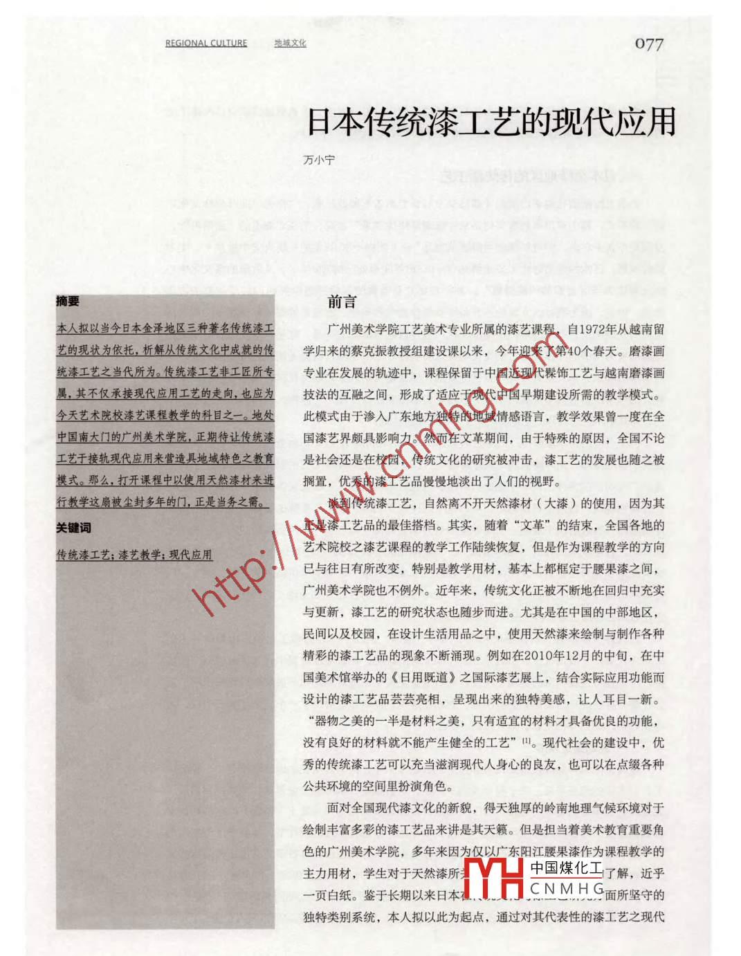 077日本傳統(tǒng)漆工藝的現(xiàn)代應(yīng)用萬小寧摘要前言本人擬以當(dāng)今日本金澤地區(qū)三種著名傳統(tǒng)漆工廣州美術(shù)學(xué)院工藝美術(shù)專業(yè)所屬的漆藝課程,自1972年從越南留藝的現(xiàn)狀為依托,析解叢傳統(tǒng)文化中成就的傳學(xué)歸來的蔡克振教授組建設(shè)課以來,今年迎來了第40個(gè)春天。磨漆畫統(tǒng)漆工藝之當(dāng)代所為。傳統(tǒng)漆工藝非工匠所專專業(yè)在發(fā)展的軌跡中,課程保留于中國近現(xiàn)代髹飾工藝與越南磨漆畫屬,其不僅承接現(xiàn)代應(yīng)用工藝的走向,也應(yīng)為技法的互融之間,形成了適應(yīng)于現(xiàn)代中國早期建設(shè)所需的教學(xué)模式。今天藝術(shù)院校漆藝課程教學(xué)的科目之一。地處此模式由于滲入廣東地方獨(dú)特的地域情感語言,教學(xué)效果曾一度在全中國南大門的廣州美術(shù)學(xué)院,正期待讓傳統(tǒng)漆國漆藝界頗具影響力。然而在文革期間,由于特殊的原因,全國不論工藝于接軌現(xiàn)代應(yīng)用來營造具地域特色之教育是社會(huì)還是在校園,傳統(tǒng)文化的研究被沖擊,漆工藝的發(fā)展也隨之被模式。那么,打開課程中以使用天然漆材來進(jìn)擱置,優(yōu)秀的漆工藝品慢慢地淡出了人們的視野。行教學(xué)這扇被塵封多年的門,正是當(dāng)務(wù)之需談到傳統(tǒng)漆工藝,自然離不開天然漆材(大漆)的使用,因?yàn)槠潢P(guān)鍵詞正是漆工藝品的最佳搭檔。其實(shí),隨著“文革”的結(jié)東,全國各地的傳統(tǒng)漆工藝;漆藝教學(xué);現(xiàn)代應(yīng)用藝術(shù)院校之漆藝課程的教學(xué)工作陸續(xù)恢復(fù),但是作為課程教學(xué)的方向已與往日有所改變,特別是教學(xué)用材,基本上都框定于腰果漆之間,廣州美術(shù)學(xué)院也不例外。近年來,傳統(tǒng)文化正被不斷地在回歸中充實(shí)與更新,漆工藝的研究狀態(tài)也隨步而進(jìn)。尤其是在中國的中部地區(qū),民間以及校園,在設(shè)計(jì)生活用品之中,使用天然漆來繪制與制作各種精彩的漆工藝品的現(xiàn)象不斷涌現(xiàn)。例如在2010年12月的中旬,在中國美術(shù)館舉辦的《日用既道》之國際漆藝展上,結(jié)合實(shí)際應(yīng)用功能而設(shè)計(jì)的漆工藝品蕓蕓亮相,呈現(xiàn)出來的獨(dú)特美感,讓人耳目一新?!捌魑镏赖囊话胧遣牧现?只有適宜的材料才具備優(yōu)良的功能,沒有良好的材料就不能產(chǎn)生健全的工藝”田?,F(xiàn)代社會(huì)的建設(shè)中,優(yōu)秀的傳統(tǒng)漆工藝可以充當(dāng)滋潤現(xiàn)代人身心的良友,也可以在點(diǎn)綴各種公共環(huán)境的空間里扮演角色。面對(duì)全國現(xiàn)代漆文化的新貌,得天獨(dú)厚的嶺南地理氣候環(huán)境對(duì)于繪制豐富多彩的漆工藝品來講是其天籟。但是擔(dān)當(dāng)著美術(shù)教育重要角色的廣州美術(shù)學(xué)院,多年來因?yàn)閮H以廣東陽江腰果漆作為課程教學(xué)的主力用材,學(xué)生對(duì)于天然漆所中國煤化工了解,近乎一頁白紙。鑒于長期以來日本CNMHG幾面所堅(jiān)守的獨(dú)特類別系統(tǒng),本人擬以此為起點(diǎn),通過對(duì)其代表性的漆工藝之現(xiàn)代天本字報(bào) ARIJOURNA應(yīng)用實(shí)況的調(diào)研,期望收獲借它山之石來鋪路的效應(yīng)。另一方面,也希望通過研究日本漆工藝的現(xiàn)狀,為本學(xué)院的漆藝課程教學(xué)改革提供可參考與借鑒的第一手資料。、日本金澤地區(qū)的傳統(tǒng)漆工藝日本北國新聞社編著出版的《漆{汐八冫τ石》如此記載,“作為‘照葉樹林文化的一種形式,其中有日本的漆文化是從中國南部流傳過來”之說,但在北海道的“函館附近,發(fā)現(xiàn)距今九千年前,曾有紅漆使用痕跡的物品”2(此物于2002年的一場火災(zāi)中被損)。文中同時(shí)談到,日本的繩文時(shí)代(公元前8000-9000年間至公元前300年),從北陸的漆文化中心到北海道為當(dāng)時(shí)日本的“漆街道”,并稱在福井縣若狹的烏浜遺跡中找到1萬1千年前的古漆木等。但是,因?yàn)楹涞谋焙5啦痪邆淦崞髦谱鞯臍夂驐l件,此觀點(diǎn)的提出存疑頗多。然而從相對(duì)的立場來說,那個(gè)時(shí)期的中國漆文化,通過跨越日本海的途徑,登陸日本北岸后逐步延伸發(fā)展而成為所謂的“漆街道”的文化現(xiàn)象之真實(shí)性,書中也稱目前尚無法找到釋解的力證。面對(duì)諸多的觀點(diǎn),本人認(rèn)為僅有一點(diǎn)是無疑的,那就是長期以來對(duì)漆文化有著偏愛情結(jié)的日本民族,歷年來保留著眾多優(yōu)秀而豐富的以使用天然漆來制作的漆工藝器物,包括其技術(shù)與傳承工藝,而其中不乏之部分,正是我們?cè)谖母锲陂g所丟失的。關(guān)于目前的日本漆領(lǐng)域,如果進(jìn)入http://ja.wikipediaorg/wiki中查找,漆器資料從青森縣的“津輕漆器”到?jīng)_繩縣的“琉球漆器”,28個(gè)產(chǎn)地之39種漆工藝的器物都有詳細(xì)記錄,范圍之廣與類別的多樣,從一個(gè)側(cè)面折射出,當(dāng)代日本傳統(tǒng)漆工藝在民眾生活中所占有的位置與受青睞的現(xiàn)狀。特別是日本的石川縣,這個(gè)以傳統(tǒng)工藝與產(chǎn)業(yè)工藝著稱的重鎮(zhèn),以縣中心所在地的金澤市為放射狀來展觀,云集著全國最為豐富的傳統(tǒng)特色工藝,包括現(xiàn)代應(yīng)用工藝的產(chǎn)業(