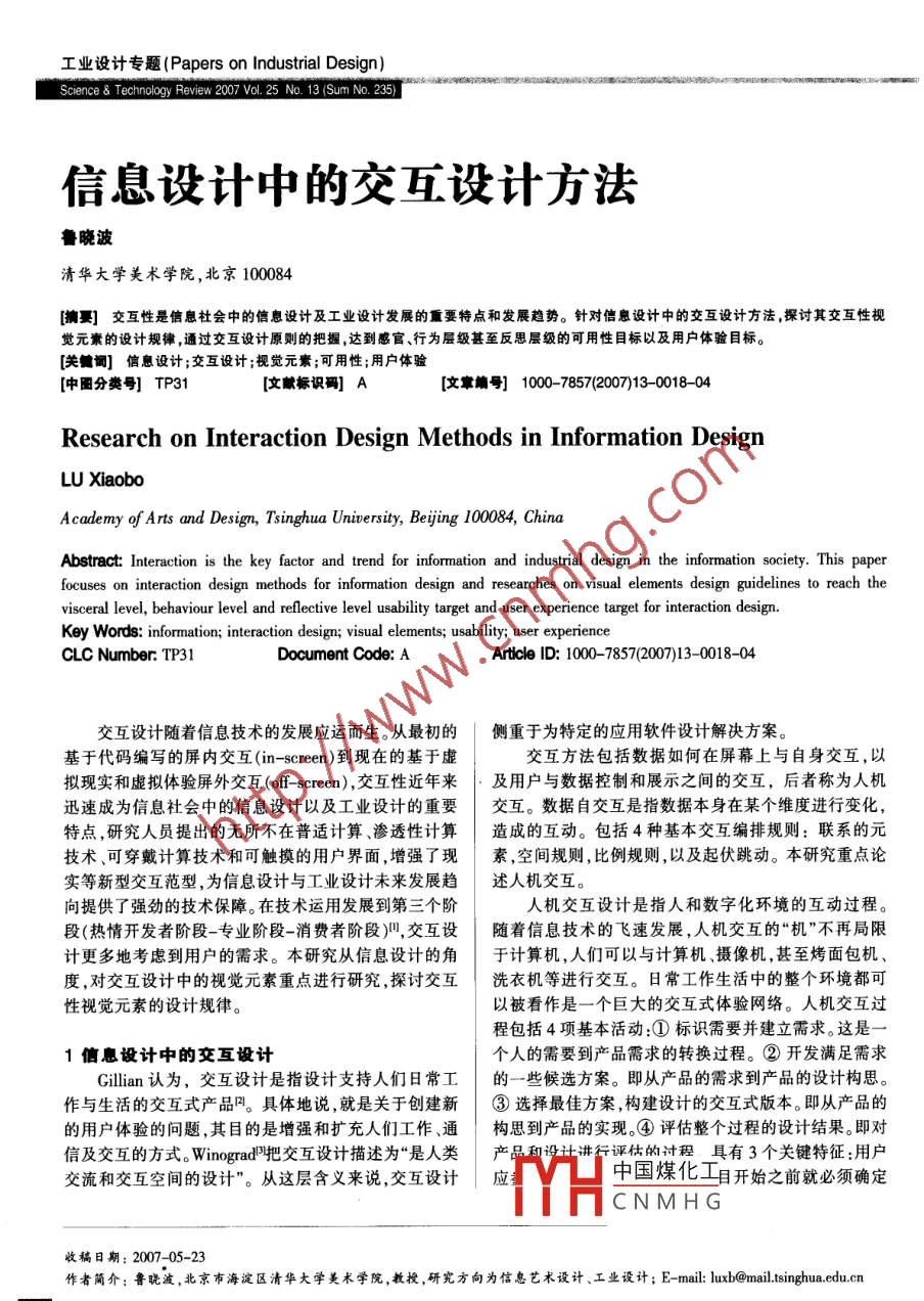 工業(yè)設(shè)計(jì)專題(Papers on Industrial Design)Science & Technology Review 2007 Vol. 25 No. 13 (Sum No. 235)信息設(shè)計(jì)中的交互設(shè)計(jì)方法魯曉波清華大學(xué)美術(shù)學(xué)院,北京100084[猜蜀]交互性是信息杜會中的信息設(shè)計(jì)及工業(yè)設(shè)計(jì)發(fā)展的重要特點(diǎn)和發(fā)展趨勢。針對僧息設(shè)計(jì)中的交互設(shè)計(jì)方法,探討其交互性視覺元素的設(shè)計(jì)規(guī)律,通過交互設(shè)計(jì)原則的把握,達(dá)到感官、行為層級甚至反思層級的可用性目標(biāo)以及用戶體驗(yàn)?zāi)繕?biāo)。[關(guān)鍵詞]信息設(shè)計(jì);交互設(shè)計(jì);視覺元素;可用性;用戶體驗(yàn)[中圈分類號] TP31[文獻(xiàn)標(biāo)識碼] A[文章編號] 100-7857(2007)13 -0018- 04Research on Interaction Design Methods in Information DesignLU XiaoboAcademy of Arts and Design, Tsinghua University, Beijing 100084, ChinaAbstract: Interaction is the key factor and trend for information and industrial design in the information society. This paperfocuses on interaction design methods for information design and researches on visual elements design guidelines to reach thevisceral level, behaviour level and relective level usability target and user experience target for interaction design.Key Words: information; interaction design; visual elements; usability; user experienceCLC Number. TP31Document Code: AArticle ID: 1000-7857(2007)13- -0018-04交互設(shè)計(jì)隨著信息技術(shù)的發(fā)展應(yīng)運(yùn)而生。從最初的側(cè)重于為特定的應(yīng)用軟件設(shè)計(jì)解決方案?;诖a編寫的屏內(nèi)交互(in-screen)到現(xiàn)在的基于虛交互方法包括數(shù)據(jù)如何在屏幕上與自身交互,以擬現(xiàn)實(shí)和虛擬體驗(yàn)屏外交互(ofF- screen) ,交互性近年來及用戶與數(shù)據(jù)控制和展示之間的交互,后者稱為人機(jī)迅速成為信息社會中的信息設(shè)計(jì)以及工業(yè)設(shè)計(jì)的重要交互。數(shù)據(jù)自交互是指數(shù)據(jù)本身在某個(gè)維度進(jìn)行變化,特點(diǎn),研究人員提出的無所不在普適計(jì)算.滲透性計(jì)算造成的互動(dòng)。包括4種基本交互編排規(guī)則:聯(lián)系的元技術(shù)、可穿戴計(jì)算技術(shù)和可觸摸的用戶界面,增強(qiáng)了現(xiàn)素,空間規(guī)則,比例規(guī)則,以及起伏跳動(dòng)。本研究重點(diǎn)論實(shí)等新型交互范型,為信息設(shè)計(jì)與工業(yè)設(shè)計(jì)未來發(fā)展趨述人機(jī)交互。向提供了強(qiáng)勁的技術(shù)保障。在技術(shù)運(yùn)用發(fā)展到第三個(gè)階人機(jī)交互設(shè)計(jì)是指人和數(shù)字化環(huán)境的互動(dòng)過程。段(熱情開發(fā)者階段-專業(yè)階段-消費(fèi)者階段)凹",交互設(shè)隨著信息技術(shù)的飛速發(fā)展,人機(jī)交互的“機(jī)”不再局限計(jì)更多地考慮到用戶的需求。本研究從信息設(shè)計(jì)的角于計(jì)算機(jī),人們可以與計(jì)算機(jī)、攝像機(jī),甚至烤面包機(jī)、度,對交互設(shè)計(jì)中的視覺元素重點(diǎn)進(jìn)行研究,探討交互洗衣機(jī)等進(jìn)行交互。日常工作生活中的整個(gè)環(huán)境都可性視覺元素的設(shè)計(jì)規(guī)律。以被看作是-一個(gè)巨大的交互式體驗(yàn)網(wǎng)絡(luò)。人機(jī)交互過程包括4項(xiàng)基本活動(dòng):①標(biāo)識需要并建立需求。這是一. 1信息設(shè)計(jì)中的交互設(shè)計(jì)個(gè)人的需要到產(chǎn)品需求的轉(zhuǎn)換過程。②開發(fā)滿足需求Gillian認(rèn)為,交互設(shè)計(jì)是指設(shè)計(jì)支持人們?nèi)粘9さ囊恍┖蜻x方案。即從產(chǎn)品的需求到產(chǎn)品的設(shè)計(jì)構(gòu)思。作與生活的交互式產(chǎn)品吧。具體地說,就是關(guān)于創(chuàng)建新③選擇最佳方案,構(gòu)建設(shè)計(jì)的交互式版本。即從產(chǎn)品的的用戶體驗(yàn)的問題,其目的是增強(qiáng)和擴(kuò)充人們工作、通構(gòu)思到產(chǎn)品的實(shí)現(xiàn)。④評估整個(gè)過程的設(shè)計(jì)結(jié)果。即對信及交互的方式。Winograd把交互設(shè)計(jì)描述為“是人類產(chǎn)品和設(shè)計(jì)講行評估的過程。具有 3個(gè)關(guān)鍵特征:用戶交流和交互空間的設(shè)計(jì)”。從這層含義來說,交互設(shè)計(jì)中國煤化工目開始之前就必須確定YHCNMHG收稿日期: 2007-05-23作者簡介:魯曉波.北京市海淀區(qū)清華大學(xué)美術(shù)學(xué)院,教授,研究方向?yàn)樾畔⑺囆g(shù)設(shè)計(jì)、工業(yè)設(shè)計(jì); E- mail: luxb@mail.tsinghua.edu.cn18工業(yè)設(shè)計(jì)專題(Papers on Industrial Design)科技導(dǎo)報(bào)2007年第25卷第13期(總第235期)具體的可用性和用戶體驗(yàn)?zāi)繕?biāo),以及必須迭代進(jìn)行4感知各運(yùn)動(dòng)反思的項(xiàng)基本活動(dòng)。控制人機(jī)交互設(shè)計(jì)的目標(biāo)包括用戶體驗(yàn)?zāi)繕?biāo)和可用性目標(biāo)?!坝脩趔w驗(yàn)”指的是用戶在與系統(tǒng)交互時(shí)的情緒行為的體驗(yàn)??捎眯阅繕?biāo)是交互設(shè)計(jì)的核心??捎眯阅繕?biāo)可以細(xì)分為以下一些目標(biāo):可行性、高效性、安全性、通用本能的性、易學(xué)性和易記性??捎眯阅繕?biāo)與用戶體驗(yàn)?zāi)繕?biāo)之間存在著權(quán)衡的問題。交互設(shè)計(jì)師需要考慮產(chǎn)品使用的圄2信息加工的3種水平環(huán)境、具體的任務(wù)以及用戶本身的