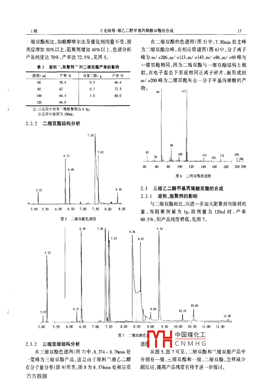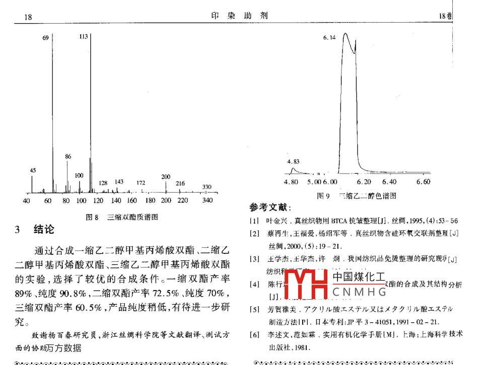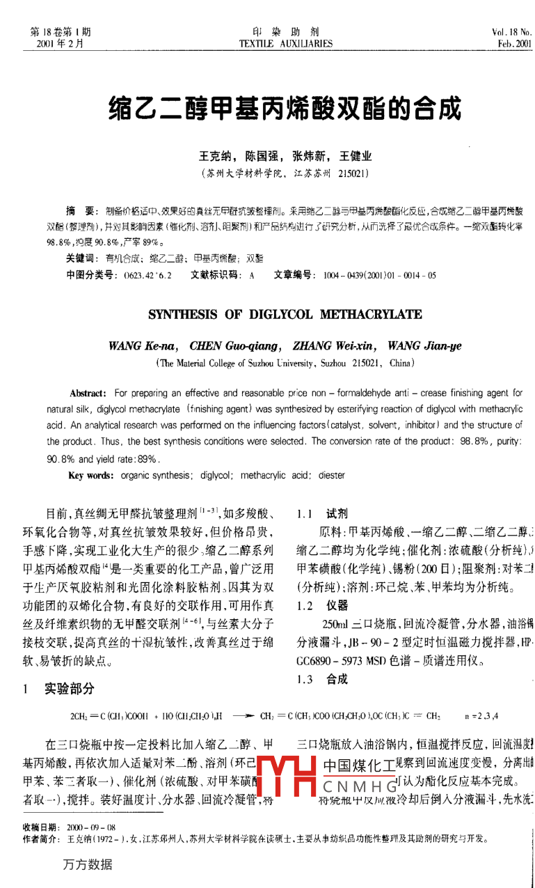 笫18卷第1期年2月TEXTILE AUXILIARIESFeb.2001縮乙二醇甲基丙烯酸雙酯的合成王克納,陳國強(qiáng),張煒新,王健業(yè)(蘇州大學(xué)材料學(xué)院,江蘇蘇州215021摘要:制價(jià)格話口、效果好的真絲無年登抗皺整劑。采用緗乙二驂與甲墨丙簫酸酯化反,合成縮乙二醪甲墨丙惴酸雙酹(怒理劑),井燜貝因素{崔化劑、溶劑陽聚劑)和嚴(yán)品結(jié)逝行了e究分析,從而溉擇了最優(yōu)合成條。一縮雙酯轉(zhuǎn)化率98.8%,度90.8%,產(chǎn)宰8%。關(guān)鍵詞:有機(jī)合成;縮乙二醇;甲基丙酸;雙至中圖分類號:0623.42“6.2文獻(xiàn)標(biāo)識碼:A文章編號:104-0439(00)01-0014-05SYNTHESIS OF DIGLYCOL METHACRYLATEWANG Re-na, CHEN Guo-qiang, ZHANG Wei-rin, WANG Jian-ye(The Material College of Suzhou University, Suzhou 215021, China)Abstract: For preparing an effective and reasonable pr ice non-formaldehyde anti-crease finishing agent fornatural silk, diglycol methacrylate (finishing agent ) was synthesized by esterifying reaction of diglycol with methacrylicacid. An analytical research was performed on the influencing factors( catalyst, solvent, inhibitor) and the structure ofthe product. Thus, the best synthesis conditions were selected. The conversion rate of the product: 98. 8%, purity90. 8% and yield rate: 89Key words: organic synthesis; diglycol; methacrylic acid: diester目前,真絲綢無甲醛抗皺整理劑-3,如多羧酸、1.1試劑環(huán)氧化合物等,對真絲抗皺效果較好,但價(jià)格昂貴原料:甲基丙烯酸、一縮乙二醇、二縮乙二醇手感下降,實(shí)現(xiàn)工業(yè)化大生產(chǎn)的很少縮乙二醇系列縮乙二醇均為化學(xué)純;催化劑:濃硫酸(分析純)甲基丙烯酸雙酯“是一類重要的化工產(chǎn)品,曾廣泛用甲苯磺酸(化學(xué)純)、錫粉(20日);阻聚劑:對苯于生產(chǎn)厭氧膠粘劑和光固化涂料膠粘劑因其為雙(分析純):溶劑:環(huán)己烷苯、甲苯均為分析純。功能團(tuán)的雙烯化合物,有良好的交聯(lián)作用,可用作真1.2儀器絲及纖維素織物的無甲醛交聯(lián)劑-6,與絲素大分子250m三口燒瓶,回流冷凝管,分水器,油浴鍋接枝交聯(lián),提高真絲的十濕抗皺性,改善真絲過于綿分液漏斗,B-90-2型定時(shí)恒溫磁力攪拌器,F軟、易皺折的缺點(diǎn)。CC6890-5973MSD色譜-質(zhì)譜連用儀1.3合成1實(shí)驗(yàn)部分CH,=C(CH, Cooll+ II0(CIICHI-O ,HCH,=C(CH; )CO0 (CH CH,0 1OC(CH,C-CH-在三口燒瓶中按一定投料比加入縮乙二醇、甲三口燒瓶放入油浴鍋內(nèi),恒溫?cái)嚢璺磻?yīng),回流溫度基丙烯酸,再依次加入適量對苯二酚、溶劑(環(huán)己中國煤化工見察到回流速度變慢,分離出甲苯、苯三者取一)、催化劑(濃硫酸、對甲苯磺CNMHG認(rèn)為化反應(yīng)基本完成者取-),攪拌。裝好溫度計(jì)、分水器、回流冷凝管,得燒瓶中反加冷卻后倒入分液漏斗,先水洗收稿日期:20-09-08作者簡介:王克納(1叨72-).女,江蘇邱州人,蘇州大學(xué)材料學(xué)院在讀碩士,主要從事紡織品功能性整理及其助劑的研究與開發(fā)。王克納等:縮醇甲基丙烯酸雙酯的合成次,再用10%NaOH溶液洗滌以除去阻聚劑,并進(jìn)一步中和過量酸,洗至反應(yīng)液呈無色,團(tuán)>10后再水洗2結(jié)果與討論至中性。最后減壓蒸餾除去溶劑,得到無色透明或淡2.1一縮乙二醇甲基丙烯酸雙酯的合成黃色液狀產(chǎn)品。2.1.1投料比的選擇表1投料比對一縮雙酯轉(zhuǎn)化率的影響坩基丙烯酸:縮二醇甲基丙烯酸乙二醇反成時(shí)間理論出水量實(shí)際出水量轉(zhuǎn)化率摩爾比A mol2.2:10.2752.4:12,6:10.3253.54.5:反中溶劑環(huán)已烷6m,借化劑濃硫酸1.47g,阻聚劑對苯二酚0.5g反應(yīng)中酸和醇摩爾比的理論投入量為2:1,酯烈,且有一定的脫水作用,一縮乙二醇先縮合成二縮化反應(yīng)中·方適當(dāng)過量有利于反應(yīng)的進(jìn)行,考慮到價(jià)乙二醇再進(jìn)行酯化反應(yīng)而用對甲苯磺酸作催化劑的格等因素,采用甲基內(nèi)烯酸過量。若酸過量太多,不產(chǎn)品純度較好,達(dá)到90.8%色諧譜分析見圖1圖2僅造成原料的浪費(fèi),而且在后道L序堿洗時(shí)消耗大量的堿,對產(chǎn)品提純帶來困難。因此摩爾比初步定為22~26:1實(shí)驗(yàn)結(jié)果見表1當(dāng)摩爾比為22:1時(shí),反應(yīng)不完全并且速度較慢:摩爾比為24:1時(shí)反應(yīng)較好;摩爾比為2.6:15.075.22時(shí)反應(yīng)快,反應(yīng)完全,但浪費(fèi)原料,給后道提純T序增加負(fù)擔(dān)。選用摩爾比為2.4:1較為合適2.1.2催化劑種類的選擇在酸和醇摩爾比2.4:1、環(huán)已烷60nl、對苯二酚0.5g條件下,分別用相同量(約為酸的5%)的對甲苯8158.7磺酸與濃硫酸催化,轉(zhuǎn)化率均達(dá)到98.8%但濃硫酸50∞56.∞6.507.00-175-8.0°860°腐蝕性較強(qiáng),對設(shè)備不利且操作中危險(xiǎn)性大,故選用圖2濃硫酸催化合成的一雙酯色譜圖對甲苯磺酸作催化劑。實(shí)驗(yàn)屮曾根據(jù)文獻(xiàn)B采用200目錫粉作為固體催化劑但由于反應(yīng)所需溫度較高,達(dá)120℃左右,反應(yīng)過程不易控制,在燒瓶壁上有大量棕褐色高聚物沉淀析出,產(chǎn)率較低,故不宜采用。2.1.3溶劑的選擇實(shí)驗(yàn)屮溶劑主要是與酯化反應(yīng)生成的水形成共沸,使沸點(diǎn)降低,回流時(shí)通過分水器將水分出,有利于反應(yīng)向酯化方向進(jìn)行,使反應(yīng)完全。表2溶劑對一縮雙酯轉(zhuǎn)化率的影響5.005.506.006.507.007國+號,,你片戒水量轉(zhuǎn)化率圖1對甲苯蟥酸催化合成的一縮雙色譜圖中國煤化工CNMHG從
