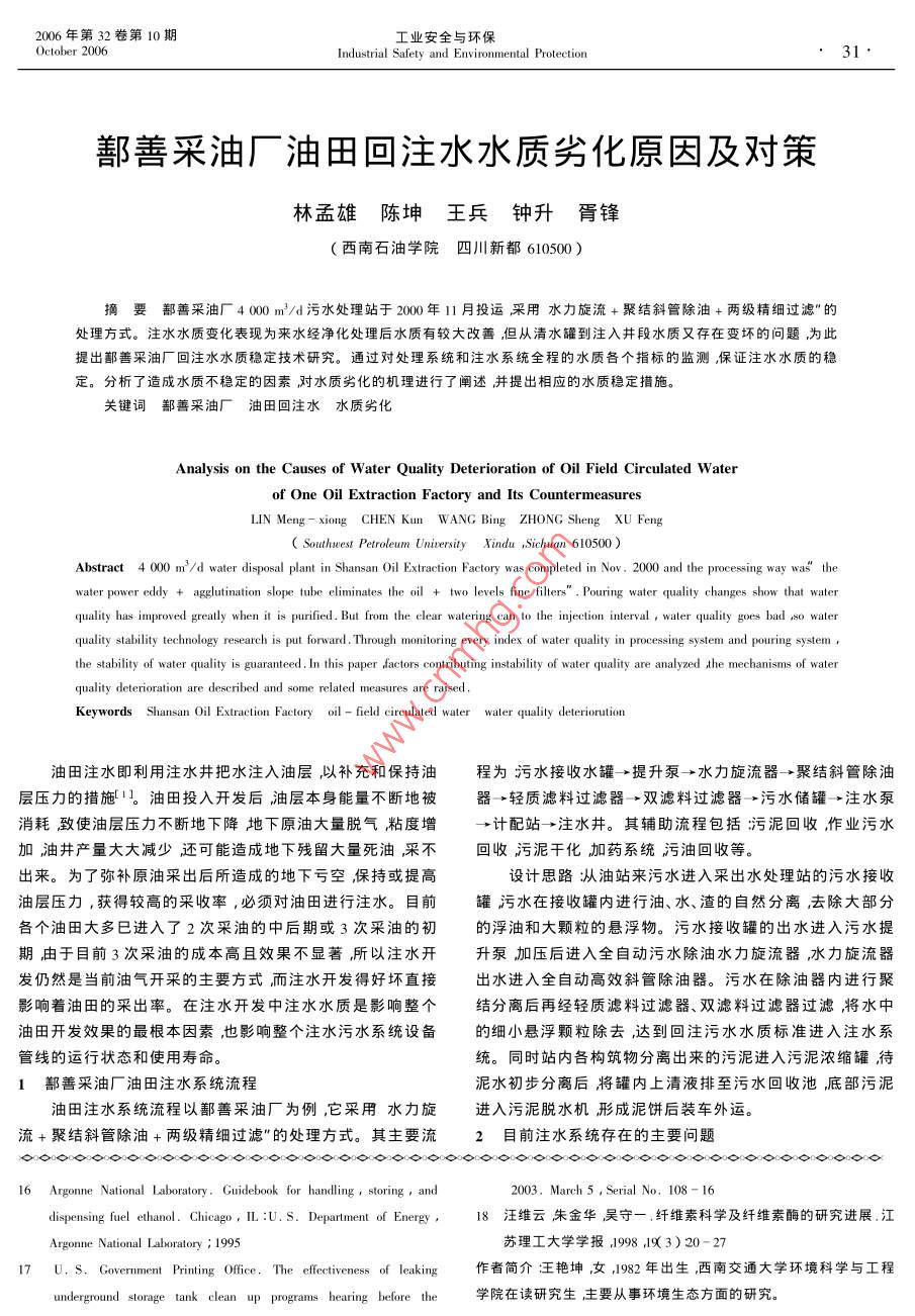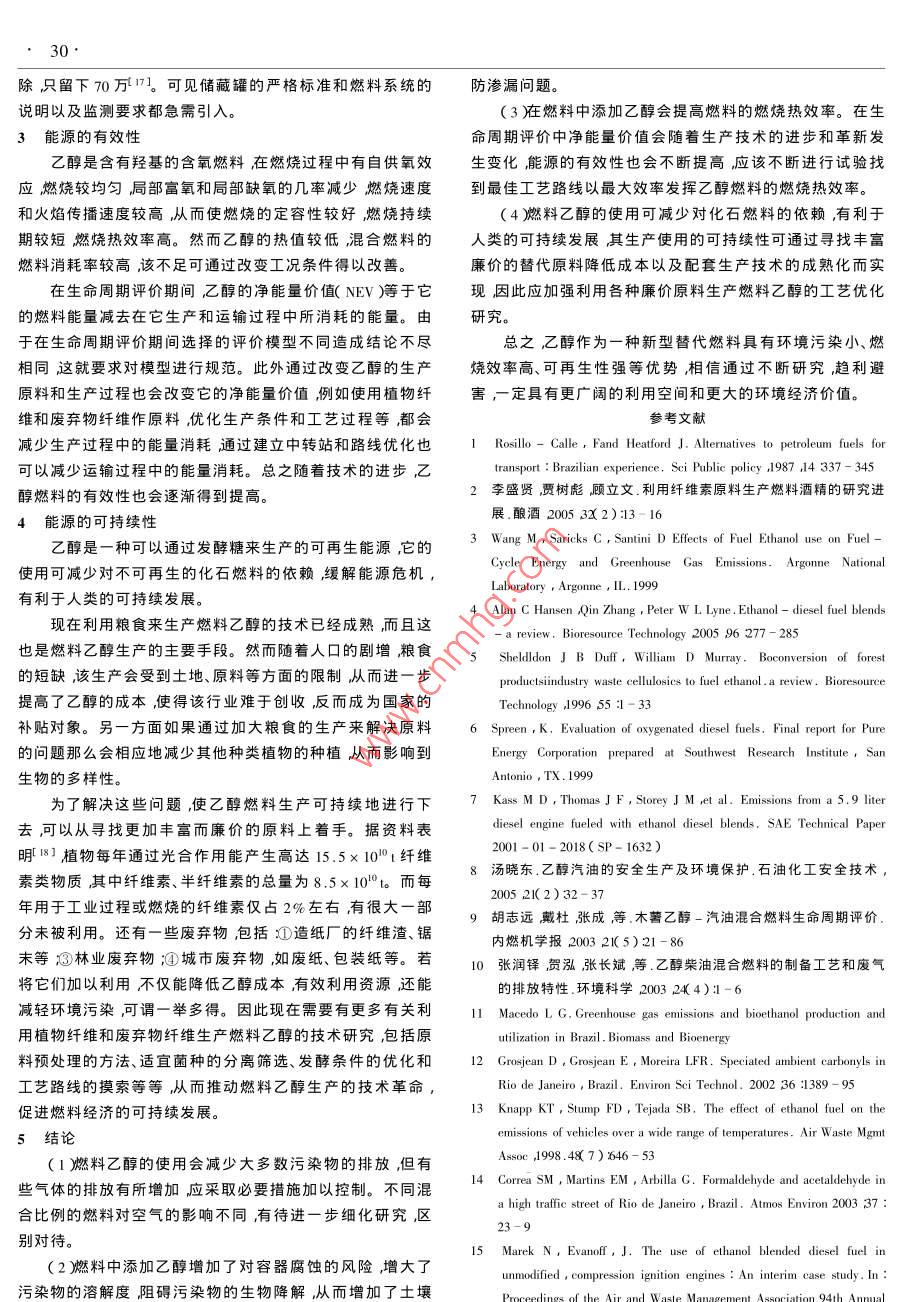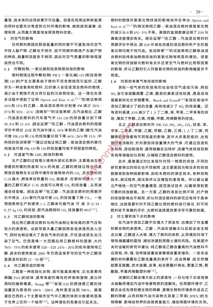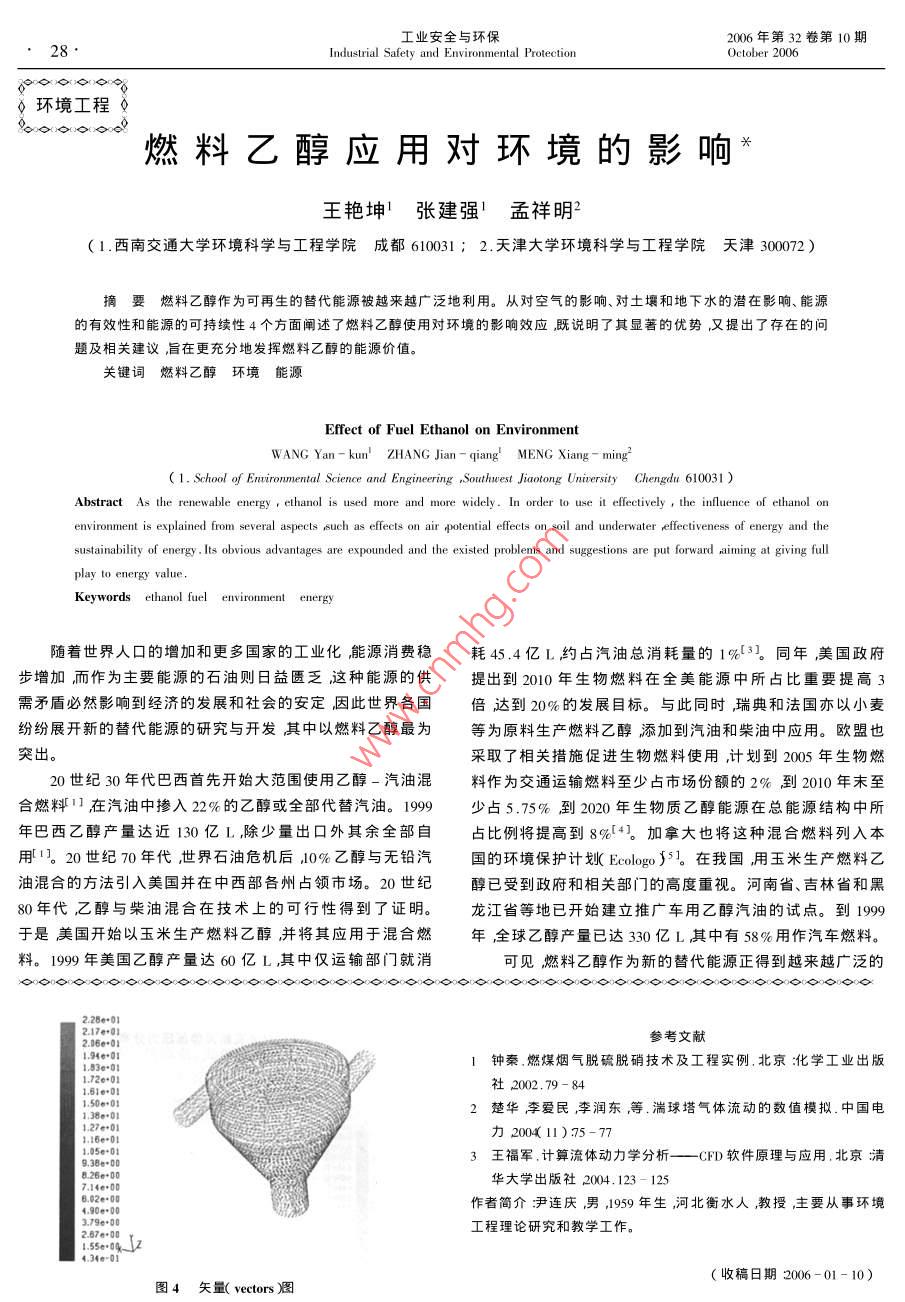 28 Industil Satery安全與環(huán)保p2006年第32卷第10期 October 2006環(huán)境工程燃料乙醇應(yīng)用對環(huán)境的影響王艷坤張建強(qiáng)孟祥明2(1.西南交通大學(xué)環(huán)境科學(xué)與工程學(xué)院成都6100312.天津大學(xué)環(huán)境科學(xué)與工程學(xué)院天津300072摘要燃料乙醇作為可再生的替代能源被越來越廣泛地利用。從對空氣的影響、對土壤和地下水的潛在影響能源的有效性和能源的可持續(xù)性4個(gè)方面闡述了燃料乙醇使用對環(huán)境的影響效應(yīng),既說明了其顯著的優(yōu)勢又提出了存在的問題及相關(guān)建議旨在更充分地發(fā)揮燃料乙醇的能源價(jià)值。關(guān)鍵詞燃料乙醇環(huán)境能源 Effect of Fuel Ethanol on Environment WANG Yan-kun' ZHANG Jian-qiang' MENG Xiang-ming? (1. School of Enxironmental Science and Engineering Southwest Jiaotong University Chengdu 610031) Abstract As the renewable energy ethanol is used more and more widely. In order to use it effectively the influence of ethanol on environment is explained from several aspects such as effects on air potential effects on soil and underwater effectiveness of energy and the sustainability of energy. Its obvious advantages are expounded and the existed problems and suggestions are put forward saiming at giving full play to energy value. Keywords ethanol fuel environment energy隨著世界人口的增加和更多國家的工業(yè)化能源消費(fèi)穩(wěn)耗45.4億L約占汽油總消耗量的1%同年美國政府步增加而作為主要能源的石油則日益匱乏這種能源的供提出到2010年生物燃料在全美能源中所占比重要提高3需矛盾必然影響到經(jīng)濟(jì)的發(fā)展和社會(huì)的安定因此世界各國倍達(dá)到20%的發(fā)展目標(biāo)。與此同時(shí)瑞典和法國亦以小麥紛紛展開新的替代能源的研究與開發(fā)其中以燃料乙醇最為等為原料生產(chǎn)燃料乙醇添加到汽油和柴油中應(yīng)用。歐盟也突出。采取了相關(guān)措施促進(jìn)生物燃料使用,計(jì)劃到2005年生物燃20世紀(jì)30年代巴西首先開始大范圍使用乙醇-汽油混料作為交通運(yùn)輸燃料至少占市場份額的2%到2010年末至合燃料在汽油中摻入22%的乙醇或全部代替汽油。1999少占5.75%到2020年生物質(zhì)乙醇能源在總能源結(jié)構(gòu)中所年巴西乙醇產(chǎn)量達(dá)近130億L除少量出口外其余全部自占比例將提高到8%4加拿大也將這種混合燃料列入本用。20世紀(jì)70年代世界石油危機(jī)后10%乙醇與無鉛汽國的環(huán)境保護(hù)計(jì)劃( Ecologo在我國用玉米生產(chǎn)燃料乙油混合的方法引入美國并在中西部各州占領(lǐng)市場。20世紀(jì)醇已受到政府和相關(guān)部門的高度重視。河南省吉林省和黑80年代乙醇與柴油混合在技術(shù)上的可行性得到了證明。龍江省等地已開始建立推廣車用乙醇汽油的試點(diǎn)。到1999于是美國開始以玉米生產(chǎn)燃料乙醇并將其應(yīng)用于混合燃年全球乙醇產(chǎn)量已達(dá)330億其中有58%用作汽車燃料。料。1999年美國乙醇產(chǎn)量達(dá)60億L其中僅運(yùn)輸部門就消可見燃料乙醇作為新的替代能源正得到越來越廣泛的2.28012.17012.06e0參考文獻(xiàn)1.94e011.3-011鐘秦,燃煤煙氣脫硫脫硝技術(shù)及工程實(shí)例北京化學(xué)工業(yè)出版1.72011.61+01社2002.79-841.50+011.38012楚華李愛民李潤東等.湍球塔氣體流動(dòng)的數(shù)值模擬.中國電1.271.16e+01力200411)75-771.05019.38003王福軍,計(jì)算流體動(dòng)力學(xué)分析—CFD軟件原理與應(yīng)用,北京清.26007.1400華大學(xué)出版社2004.123-1256.02004.9000作者簡介尹連慶,男1959年生,河北衡水人教授主要從事環(huán)境3.79002.6700工程理論研究和教學(xué)工作。1.5504.34-01圖4矢 vectors量)圖(收稿日期2006-01-10)29重視其未來的應(yīng)用前景不可估量。但是在利用這種新能源燃料的燃燒對氮氧化物排放的影響尚存在爭議Spreen and的同時(shí)也要充分考慮到它對環(huán)境的影響,到趨利避害,合Kass et al67的測試表明乙醇-柴油混合燃料使氮氧化物理利用從而最大限度地發(fā)揮其燃料優(yōu)勢。的減少從0到4%-5%不等。美國的監(jiān)測數(shù)據(jù)證明了E10與1對空氣的影響臭氧濃度增加有關(guān)。胡志遠(yuǎn)等91在乙醇-汽油混合燃料的任何燃料燃燒在釋放能量的同時(shí)都不可避免地向空氣周期評價(jià)中得出除E1外其他濃度的混合燃料所產(chǎn)生的氮中排入副產(chǎn)物,乙醇也不例外,但不同燃料燃燒產(chǎn)生副產(chǎn)物氧化物均高于純汽油。張潤鐸等的試驗(yàn)表明乙醇柴油混的種類、數(shù)量和濃度各不相同因此對空氣質(zhì)量的影響程度合燃料較純柴油燃燒排放的氮氧化物有明顯的增加。但氮自然也不同。氧化物的排放除與燃料有關(guān)外還受空氣與燃料比例等因素1.1對顆粒物、一氧化碳和烴類物質(zhì)排放的影響的影響所以乙醇的引入對氮氧化物的排放的影響幅度并不燃料燃燒過程中顆粒物(PM)一氧化碳(CO)和烴類物明顯。質(zhì)(CH)的產(chǎn)生主要是由于燃料不完全燃燒而引起的,乙醇1.6對其他有害氣體排放的影響作為一種含氧有機(jī)燃料它的摻入會(huì)促進(jìn)混合燃料的燃燒,其他一些氣體的排放有的也會(huì)給空氣造成污染,例如減少由于燃燒不充分而引起的污染物排放。這一理論在很SO2會(huì)引發(fā)硫酸煙霧乙烯醛類的臭氧活性較高易造成地多試驗(yàn)中得到了證明Spreen and Kass et al.7的測試