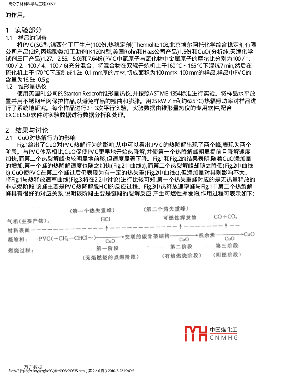 高分子材料科學(xué)與工程90535高分子材料科學(xué)與工程舊萬巧數(shù)據(jù)資源系統(tǒng)POLYMER MATERIALS SCIenCEWANFANG DATA ( CHINAINFO)ENGINEERING數(shù)字化期刊1999年第15卷第5期Vol.15No.51999CuO對(duì)硬質(zhì)門∨C熱解、阻燃和抑煙的錐形量熱儀(CONE)研究李斌王建祺丁養(yǎng)兵摘要通過利用錐形量熱儀(CONE實(shí)驗(yàn)獲得的熱失重速率(MLR)、熱釋放速率(HRR)、有效燃燒熱EHC)、煙釋放速率(SPR)和點(diǎn)燃時(shí)間(TT等參數(shù)研究了氧化銅對(duì)PVC熱降解行為、阻燃和抑煙的影響。研究表明,氧化銅促進(jìn)了門C早而快地脫HC并且明顯降低了鏈段的裂解速度促進(jìn)了成炭量的增加。因此,Cυo明顯降低了HRR和SPR,說明它具有良好的阻燃性和抑煙性。氧化銅使PC的點(diǎn)燃時(shí)間縮短并使揮發(fā)物有利于氣相燃燒反應(yīng)。由于CuO促進(jìn)陰燃,從而導(dǎo)致總熱釋放量增加。關(guān)鍵詞錐形量熱儀,聚氯乙烯,阻燃,抑煙,氧化銅中圖分類號(hào):O631.2+2文獻(xiàn)標(biāo)識(shí)碼:A文章編號(hào):10007555(199905012404INVESTIGATION OF THERMAL DEGRADATION. FLAME RETARDANCE ANDSMOKE SUPPRESSION OF RIGID PVC BY USING CONE CALORIMETERLi Bin, Wang Jianqi, Ding Yangbing(National flame retarded Materials Laboratory, Beijing Institute of Technology, Beijing)AbSTRACT The effects of copper oxide on the thermal degradation, flame retardance, and smokesuppression of poly (vinyl chloride)(PVC)were investigated through various parameters such as MLR, HRREHC. SPRand TTI etc which were measured at an irradiance of 25 kW/ m2 from Cone calorimeter. Theinfluence of Cuo on PVC can be shown as follows: (1) promote the reaction of HCl-elimination earlierand more quickly, and decrease the rate of segment pyrolysis; (2) enhance the amount of charformed; 3)decrease HRR, SPR and total smoke production significantly, compared with rigid PVC, and ability offlame retardance and smoke suppression increases with increasing add-on of copper oxide; (4)shorten TTIof PVC; (5)volatiles produced by heating are easier to burn in the gas phase (6) increase total heat releasebecause copper oxide makes char afterglowKeywords cone calorimeter, poly (vinyl chloride), flame retardance, smoke suppression, copper oxide許多過渡金屬化合物特別是銅的化合物對(duì)PVC都有良好的扣煙和阻燃效果[1],這些金屬化合物對(duì)PVC的作用主要表現(xiàn)為:使PνC在熱降解時(shí)揮發(fā)物中芳香族產(chǎn)物的含量明顯減少,使PVC更早更快地脫HCL減少了門VC在燃燒時(shí)的煙釋放、促進(jìn)了殘余炭的形成[2-4]。為促進(jìn)PVC的廣泛應(yīng)用和發(fā)展,目前人們十分重視它的阻燃和抑煙機(jī)理以及應(yīng)用性研究。而對(duì)其在實(shí)際中燃燒和抑煙行為過程的研究則更有意義。錐形量熱儀是阻燃領(lǐng)域中研究和評(píng)價(jià)聚合物材料燃燒和煙釋放行為的理想儀器之-。錐形量熱儀的實(shí)驗(yàn)條件是在空氣中和一定的熱輻照功率其試驗(yàn)結(jié)果更切合實(shí)際中國(guó)煤化工形量熱儀對(duì)PvC的阻燃和扣煙進(jìn)行了探索研究[67。本文利用在25kW/mCNMHG實(shí)驗(yàn)獲得的熱失重速率(MLR)、熱釋放速率(HRR、有效燃燒熱(EH)、煙釋放速率(SPR和點(diǎn)燃時(shí)間(TTI等參數(shù)綜合研究了氧化銅對(duì)PC熱降解行為、阻燃和抑煙的影響從而能更好的理解氧化銅在實(shí)際中fle∥/ Eyak/gfzclkxygdgfzc'9ygzc90590535hm(第1/6頁(yè))20103221949.51高分子材料科學(xué)與工程990535的作用。實(shí)驗(yàn)部分1.1樣品的制備將PνC(SG型,錦西化工廠生產(chǎn))10份,熱穩(wěn)定劑( Thermolite108北京埃爾阿托化學(xué)綜合穩(wěn)定劑有限公司產(chǎn)品)2份丙烯酸類加工助劑(K120N型美國(guó)Rohn和Ha公司產(chǎn)品)15份和CuO(分析純天津化學(xué)試劑三廠產(chǎn)品)1.27、2.55509和764份(PVC中氯原子與氧化物中金屬原子的摩爾比分別為100/1、100/2、100/4100/6充分混合。將混合物在雙輥開煉機(jī)上于160%-165℃下混煉7min然后在硫化機(jī)上于170℃下壓制成1.2±0.1mm厚的片材切成面積為100mmx100mm的樣品樣品中PVC的含量為165±0.5g1.2錐形量熱儀使用英國(guó)PL公司的 Stanton redcro錐形量熱儀并按照 ASTME1354標(biāo)準(zhǔn)進(jìn)行實(shí)驗(yàn)。將樣品水平放置并用不銹鋼絲網(wǎng)保護(hù)樣品,以避免樣品的翹曲和膨脹。用25kWN/m(約625%C)熱輻照功率對(duì)樣品進(jìn)行了系統(tǒng)地研究。每個(gè)樣品進(jìn)行2~3次平行實(shí)驗(yàn)。實(shí)驗(yàn)數(shù)據(jù)由錐形量熱儀的專用軟件,配合EXCEL5.0軟件對(duì)實(shí)驗(yàn)數(shù)據(jù)進(jìn)行數(shù)據(jù)分析和處理。2結(jié)果與討論21CuO對(duì)熱解行為的影響Fg1給岀了CuO對(duì)PvC熱解行為的影響,從中可以看岀,PVC的熱降解出現(xiàn)了兩個(gè)峰表現(xiàn)為兩個(gè)階段。與PνC體系相比υo促使PC更早地開始熱降解,并使第一個(gè)熱降解峰明顯提前且降解速度加快而第二個(gè)熱裂解峰也較明顯地前移但速度顯著下降。Fg1和Fg2的結(jié)果表明,隨著CuO添加量的增加第一個(gè)峰的熱降解速度也隨之加快(Fig2中曲線a,而第二個(gè)熱裂解峰卻隨之降低(Fig2中曲線b),Cu使PVC在第二個(gè)峰過后仍表現(xiàn)為有一定的熱失重(Fg2中曲線C,但添加量對(duì)其則影響不大。將Fg1與熱釋放速率曲線(Fg3將在2,2中討論)進(jìn)行比較可知,第一個(gè)熱失重峰對(duì)應(yīng)的是無熱量釋放的非點(diǎn)燃階段該峰主要是PVC熱降解脫HC的反應(yīng)過程。Fg3熱釋放速率峰