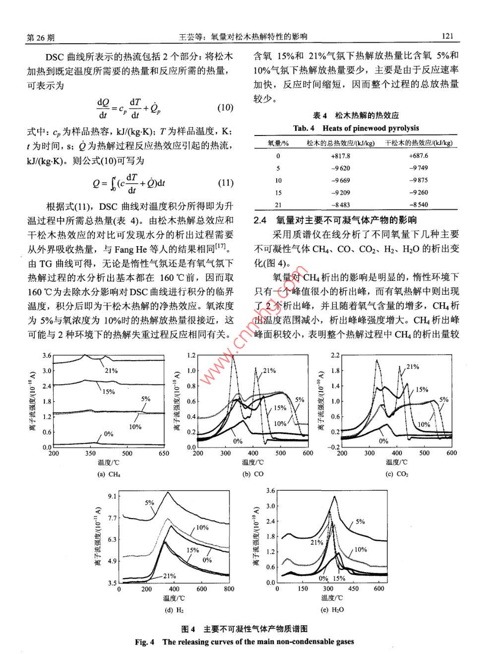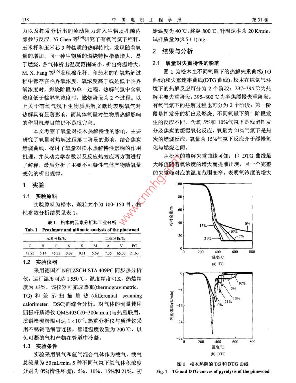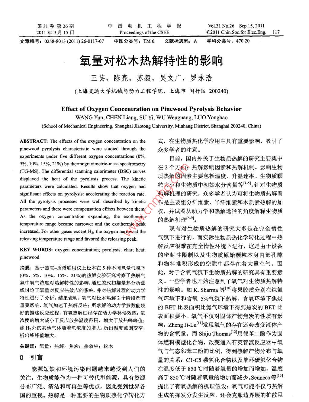 第31卷第26期中國電機(jī)工程學(xué)報(bào)VoL 31 No 26 Sep 15, 20112011年9月15日Proceedings of the CSEeC2011 Chin. Soc. for Elec Eng. 117文章編號:0258-8013(2011)260117-07中圖分類號:TM6文獻(xiàn)標(biāo)志碼:A學(xué)科分類號:47020氧量對松木熱解特性的影響王蕓,陳亮,蘇毅,吳文廣,羅永浩(上海交通大學(xué)機(jī)械與動(dòng)力工程學(xué)院,上海市閔行區(qū)200240)Effect of Oxygen Concentration on Pinewood pyrolysis BehaviorWANG Yun, CHEN Liang, SU Yi, WU Wenguang, LUO Yonghao(School of Mechanical Engineering, Shanghai Jiaotong University, Minhang District, Shanghai 200240, China)ABSTRACT: The effects of the oxygen concentration on the式,在生物質(zhì)熱化學(xué)應(yīng)用中具有重要影響,吸引了pinewood pyrolysis characteristic were studied through the眾多學(xué)者的注意。experiments under five different oxygen concentrations(0%,目前,國內(nèi)外關(guān)于生物質(zhì)熱解的研究主要集中5%109419%,21) by thermogravimetric-mass spectrometry在2個(gè)方面:熱解影響因素和熱解機(jī)制。影響生物displayed the heat of the pyrolysis process. The kinetic質(zhì)熱解的因素主要包括溫度、升溫速率、生物質(zhì)顆parameters were calculated. Results show that oxygen had粒大小和生物質(zhì)中初始水分含量等”針對生物質(zhì)significant effects on pyrolysis: accelerating the reaction rate.熱解機(jī)理的研究,眾多學(xué)者認(rèn)為可將生物質(zhì)熱解看All the pyrolysis processes were well described by kinetic作是主要組分纖維素、半纖維素和木質(zhì)素?zé)峤獾募觩arameters and there were compensation effects between them.權(quán),并試圖從動(dòng)力學(xué)和熱解途徑的角度解釋生物質(zhì)的熱解機(jī)理69temperature range became narrower and the exothermic pealincreased. For other gases except H2, the oxygen narrowed the現(xiàn)有對生物質(zhì)熱解的研究大多是在完全惰性leasing temperature range and favored the releasing peak氣氛下進(jìn)行的,而實(shí)際生物質(zhì)熱化學(xué)轉(zhuǎn)化過程中熱KEY WORDS: oxygen concentration; pyrolysis; char; heat;解反應(yīng)很難在完全惰性環(huán)境下進(jìn)行,這是由于設(shè)備的密封性限制以及生物質(zhì)原始顆粒本身內(nèi)部孔隙摘要:基于熱重質(zhì)譜聯(lián)用儀上松木在5種不同氧量氣氛下和物料堆積形成的空隙中都存在著大量空氣。因0%、%、10%、15%、21%)的熱解實(shí)驗(yàn)研究考察了熱解氣此,對于含氧氣氛下生物質(zhì)熱解的研究具有重要意氛中氧氣濃度對熱解特性的影響,通過差式掃描量熱分析曲義。一些學(xué)者也開始注意到了氧氣對生物質(zhì)熱解特線討論了氧量對反應(yīng)熱效應(yīng)的影響并對熱解過程的動(dòng)力學(xué)性的影響。如K. Sharma等將果膠質(zhì)分別在純氦特性進(jìn)行了分析。結(jié)果表明:氧氣對松木熱解2個(gè)階段都有氣環(huán)境下和含氧5%氣氛下熱解,含氧環(huán)境下焦炭重要影響,氧氣加速了熱解反應(yīng);所求解的動(dòng)力學(xué)參數(shù)能較的BET比表面積比氦氣環(huán)境下得到焦炭的BET比好的描述反應(yīng)過程,有氧熱解過程存在動(dòng)力學(xué)補(bǔ)償效應(yīng):氧表面積要小。氧氣不僅對固體產(chǎn)物焦炭的性質(zhì)有影濃度的增大減小了反應(yīng)放熱溫度范圍,增大了放熱峰峰值除H2外的其他氣體隨著氧濃度的增大,析出溫度范圍變窄,響, Zheng Ji-Lu'發(fā)現(xiàn)氧氣的存在還會(huì)改變液體產(chǎn)析出峰峰值增大。物的含氧量。而 Shiju Thomas)鄰苯二酚作為固關(guān)鍵詞:氧量;熱解;焦炭;熱效應(yīng);松木體燃料模型化合物,改變通入石英管流反應(yīng)器中氧氣與氣態(tài)鄰苯二酚的比例,得到熱解產(chǎn)物分布與氧0引言量的關(guān)系:C1-C5碳?xì)浠衔镆约皢苇h(huán)碳?xì)浠衔锬茉炊倘焙铜h(huán)境污染問題越來越受到人們的在溫度低于850℃時(shí)隨著氧量的增加而增加,溫度關(guān)注,生物質(zhì)能作為一種可替代型能源,具有資源高于850℃時(shí)隨著氧量的增加而減少。 Senneca等13分布廣泛、清潔和可再生等優(yōu)點(diǎn),因此受到世界各提出了有氧熱解的機(jī)理假設(shè):氧氣可能不僅與熱解國的重視。熱解是一種重要的生物質(zhì)熱化學(xué)轉(zhuǎn)化方生成的揮發(fā)分發(fā)生反應(yīng),還會(huì)克服邊界層的擴(kuò)散阻118中國電機(jī)工程學(xué)報(bào)第31卷力以及揮發(fā)分析出的流動(dòng)阻力進(jìn)入生物質(zhì)孔隙內(nèi)始溫度為40℃,終溫800℃,升溫速率為20Kmin,部參與反應(yīng)。 Yi Chen等4研究了有氧氣氛下稻稈、試樣質(zhì)量為(85±1)mg玉米桿和玉米芯3種物質(zhì)的熱解特性,發(fā)現(xiàn)隨著氧2結(jié)果與分析量的增加,同一種生物質(zhì)的燃燒特性指數(shù)增大,易于燃燒,各氣體析出溫度范圍減小,析出終溫增大。21氧量對失重特性的影響M. X. Fang等5發(fā)現(xiàn)棉花稈、印茄木的有氧熱解過圖1為松木在不同氧量下的熱解失重曲線(TG程中都存在臨界氧濃度,氧濃度高于或是低于臨界曲線)和失重速率曲線DTG曲線)。松木在純氬氣環(huán)氧濃度時(shí),燃燒階段為單一過程,熱解氣氛中含氧境下的熱解反應(yīng)可分為2個(gè)階段:237-394℃為熱濃度低于臨界氧濃度時(shí),燃燒階段為2個(gè)過程。以解主要失重階段,395-800℃為半焦緩慢失重階段。上關(guān)于有氧氣氛下生物質(zhì)熱解文獻(xiàn)均表明氧氣對有氧氣氛下的熱解過程也可分為2