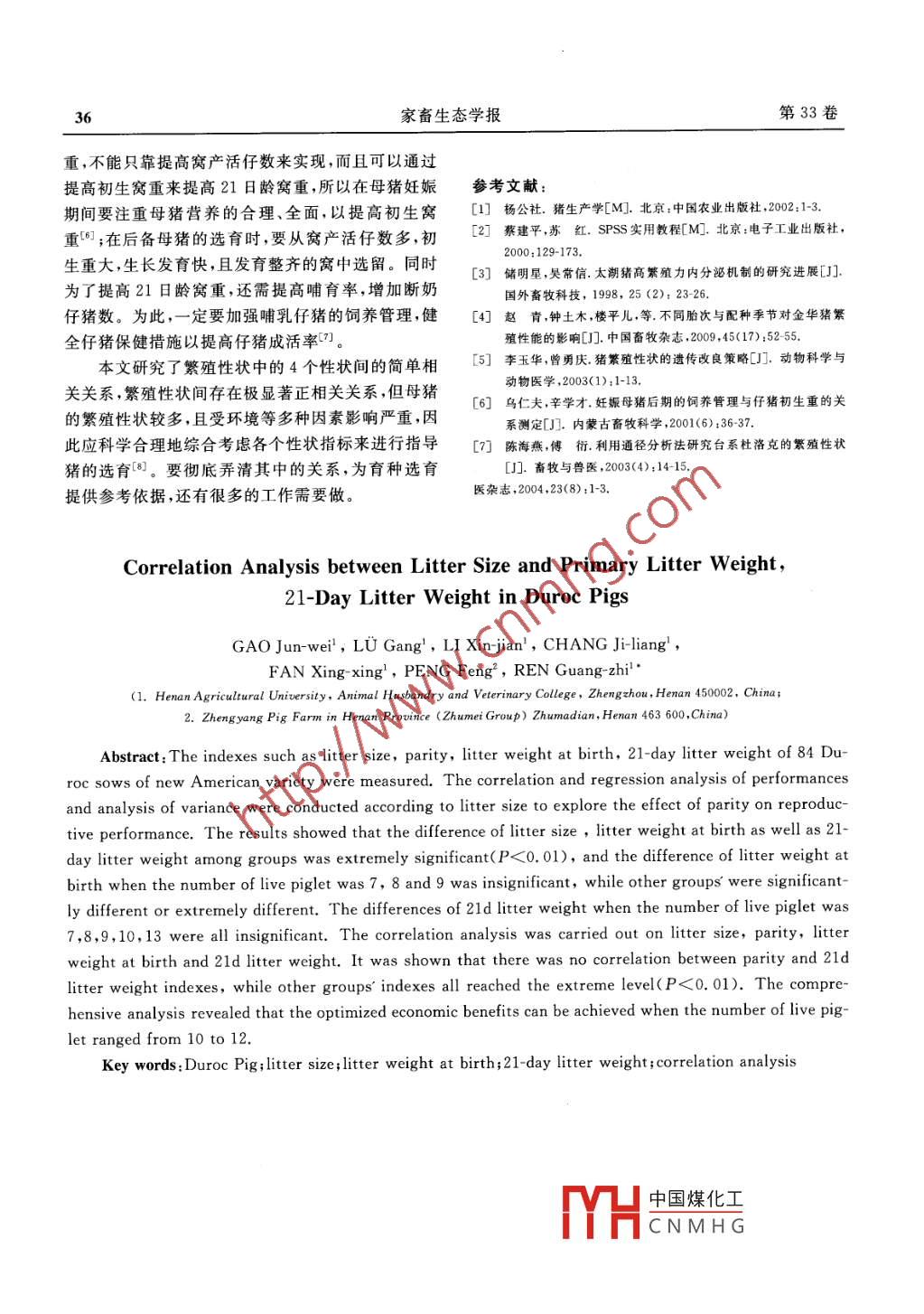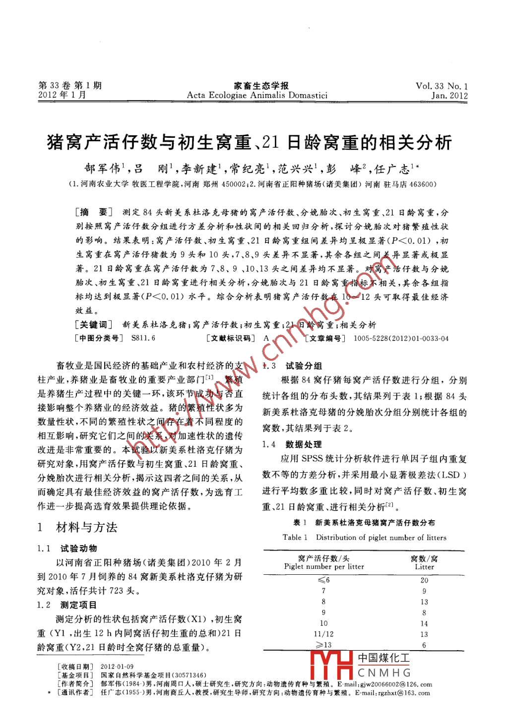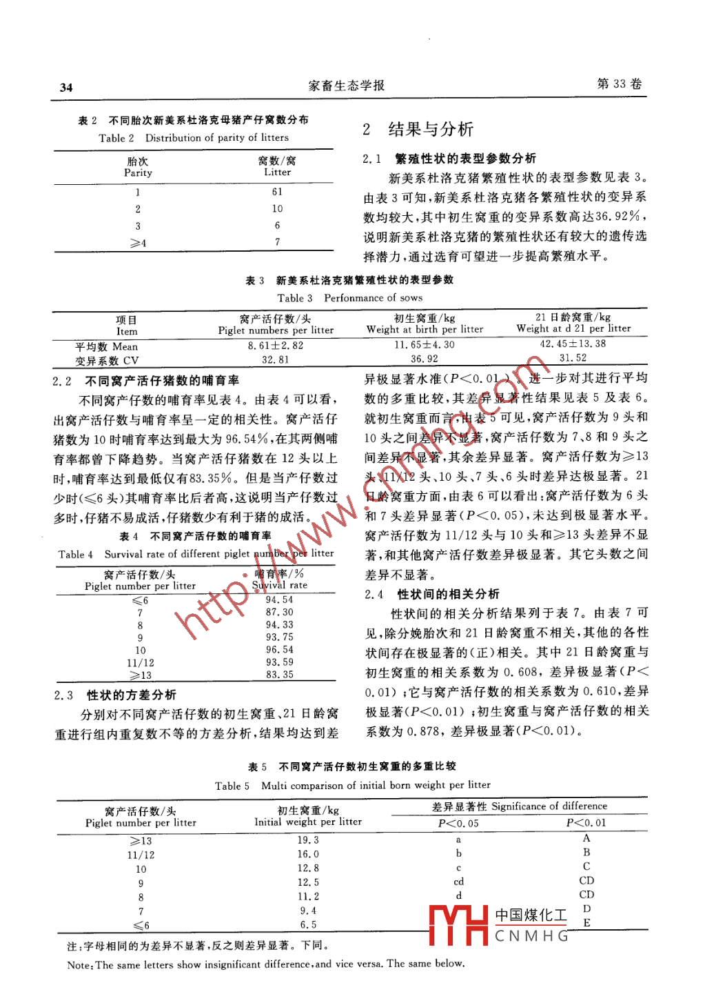 第33卷第1期家畜生態(tài)學(xué)報2012年1月Acta Ecologiae Animalis domasticJan.2012豬窩產(chǎn)活仔數(shù)與初生窩重、21日齡窩重的相關(guān)分析郜軍偉',呂剛,李新建1,常紀(jì)亮1,范興興1,彭峰2,任廣志1(1,河南農(nóng)業(yè)大學(xué)牧醫(yī)工程學(xué)院河南鄭州450002;2.河南省正陽種豬場(諸美集團(tuán))河南駐馬店463600)[摘要]測定84頭新美系杜洛克母豬的窩產(chǎn)活仔數(shù)、分娩胎次、初生窩重、21日齡窩重,分別按照窩產(chǎn)活仔數(shù)分組進(jìn)行方差分析和性狀間的相關(guān)回歸分析,探討分娩胎次對豬繁殖性狀的影響。結(jié)果表明:窩產(chǎn)活仔數(shù)、初生窩重、21日齡窩重組間差異均呈極顯著(P<0.01),初生窩重在窩產(chǎn)活仔豬數(shù)為9頭和10頭,7、8、9頭差異不顯著,其余各組之間差異顯著或極顯著。21日齡窩重在窩產(chǎn)活仔數(shù)為η、8、9、10、13頭之間差異均不顯著。對窩產(chǎn)活仔數(shù)與分娩胎次、初生窩重、21日齡窩重進(jìn)行相關(guān)分析,分娩胎次與21日齡窩重指標(biāo)不相關(guān),其余各組指標(biāo)均達(dá)到極顯著(P<0.01)水平。綜合分析表明豬窩產(chǎn)活仔數(shù)在10~12頭可取得最佳經(jīng)濟(jì)效益。[關(guān)鍵詞]新美系杜洛克豬;窩產(chǎn)活仔數(shù);初生窩重;21日齡窩重;相關(guān)分析中圖分類號]S811.6[文獻(xiàn)標(biāo)識碼]A文章編號]1005-5228(2012)01-0033-04畜牧業(yè)是國民經(jīng)濟(jì)的基礎(chǔ)產(chǎn)業(yè)和農(nóng)村經(jīng)濟(jì)的支1.3試驗分組柱產(chǎn)業(yè),養(yǎng)豬業(yè)是畜牧業(yè)的重要產(chǎn)業(yè)部門1。繁殖根據(jù)84窩仔豬每窩產(chǎn)活仔數(shù)進(jìn)行分組,分別是養(yǎng)豬生產(chǎn)過程中的關(guān)鍵一環(huán),該環(huán)節(jié)成功與否直統(tǒng)計各組的分布頭數(shù),其結(jié)果列于表1;根據(jù)84頭接影響整個養(yǎng)豬業(yè)的經(jīng)濟(jì)效益。豬的繁殖性狀多為新美系杜洛克母豬的分娩胎次分組分別統(tǒng)計各組的數(shù)量性狀,不同的繁殖性狀之間存在著不同程度的窩數(shù),其結(jié)果列于表2。相互影響,研究它們之間的關(guān)系,對加速性狀的遺傳改進(jìn)是非常重要的。本試驗以新美系杜洛克仔豬為1.4數(shù)據(jù)處理研究對象,用窩產(chǎn)活仔數(shù)與初生窩重、21日齡窩重應(yīng)用SPSS統(tǒng)計分析軟件進(jìn)行單因子組內(nèi)重復(fù)分娩胎次進(jìn)行相關(guān)分析揭示這四者之間的關(guān)系,從數(shù)不等的方差分析,并采用最小顯著極差法(LSD)而確定具有最佳經(jīng)濟(jì)效益的窩產(chǎn)活仔數(shù),為選育工進(jìn)行平均數(shù)多重比較,同時對窩產(chǎn)活仔數(shù)、初生窩作進(jìn)一步提高選育效果提供理論依據(jù)。重、21日齡窩重、進(jìn)行相關(guān)分析2。1材料與方法表1新美系杜洛克母豬窩產(chǎn)活仔數(shù)分布Table 1 Distribution of piglet number of litters1.1試驗動物以河南省正陽種豬場(諸美集團(tuán))2010年2月窩產(chǎn)活仔數(shù)/頭窩數(shù)/窩Piglet number per litter到2010年7月飼養(yǎng)的84窩新美系杜洛克仔豬為研≤6究對象,活仔共計723頭1.2測定項目測定分析的性狀包括窩產(chǎn)活仔數(shù)(X1),初生窩重(Y1,出生12h內(nèi)同窩活仔初生重的總和)21日11/12齡窩重(Y2,21日齡時全窩仔豬的總重量)。中國煤化工[收稿日期]201201-09基金項目]國家自然科學(xué)基金項目(30571346)CNMHG[作者簡介]郜軍偉(1984-)男,河南周口人,碩士研究生,研究方向:動物遺傳育種與繁殖。 E-mail: gjw20066002@126.cm[通訊作者]任廣志(1955-)男河南商丘人,教授,研究生導(dǎo)師,研究方向:動物遺傳育種與繁殖。E-mail2gzhat@163.com家畜生態(tài)學(xué)報第33卷表2不同胎次新美系杜洛克母豬產(chǎn)仔窩數(shù)分布Table 2 Distribution of parity of litters2結(jié)果與分析胎次窩數(shù)/窩2.1繁殖性狀的表型參數(shù)分析ParityLitter新美系杜洛克豬繁殖性狀的表型參數(shù)見表3。由表3可知,新美系杜洛克豬各繁殖性狀的變異系數(shù)均較大,其中初生窩重的變異系數(shù)高達(dá)36.92%≥4說明新美系杜洛克豬的繁殖性狀還有較大的遺傳選擇潛力,通過選育可望進(jìn)一步提高繁殖水平。表3新美系杜洛克豬繁殖性狀的表型參數(shù)Table3 Perfonmance of sows項目一夜產(chǎn)話仔數(shù)塊u初生窩重/k21日齡窩重/kWeight at birth per litterWeight at d 21 per litter平均數(shù)Mean8.61士2.8211.65±4.3042.45±13.38變異系數(shù)CⅤ36.9231.522不同窩產(chǎn)活仔豬數(shù)的哺育率異極顯著水準(zhǔn)(P<0.01)。進(jìn)一步對其進(jìn)行平均不同窩產(chǎn)仔數(shù)的哺育率見表4。由表4可以看,數(shù)的多重比較,其差異顯著性結(jié)果見表5及表6。出窩產(chǎn)活仔數(shù)與哺育率呈一定的相關(guān)性。窩產(chǎn)活仔就初生窩重而言,由表5可見,窩產(chǎn)活仔數(shù)為9頭和豬數(shù)為10時哺育率達(dá)到最大為96.54%在其兩側(cè)哺10頭之間差異不顯著,窩產(chǎn)活仔數(shù)為7、8和9頭之育率都曾下降趨勢。當(dāng)窩產(chǎn)活仔豬數(shù)在12頭以上間差異不顯著,其余差異顯著。窩產(chǎn)活仔數(shù)為≥13時,哺育率達(dá)到最低僅有83.35%。但是當(dāng)產(chǎn)仔數(shù)過頭、11/12頭、10頭、7頭、6頭時差異達(dá)極顯著。21少時(≤6頭)其哺育率比后者高這說明當(dāng)產(chǎn)仔數(shù)過日齡窩重方面,由表6可以看出窩產(chǎn)活仔數(sh