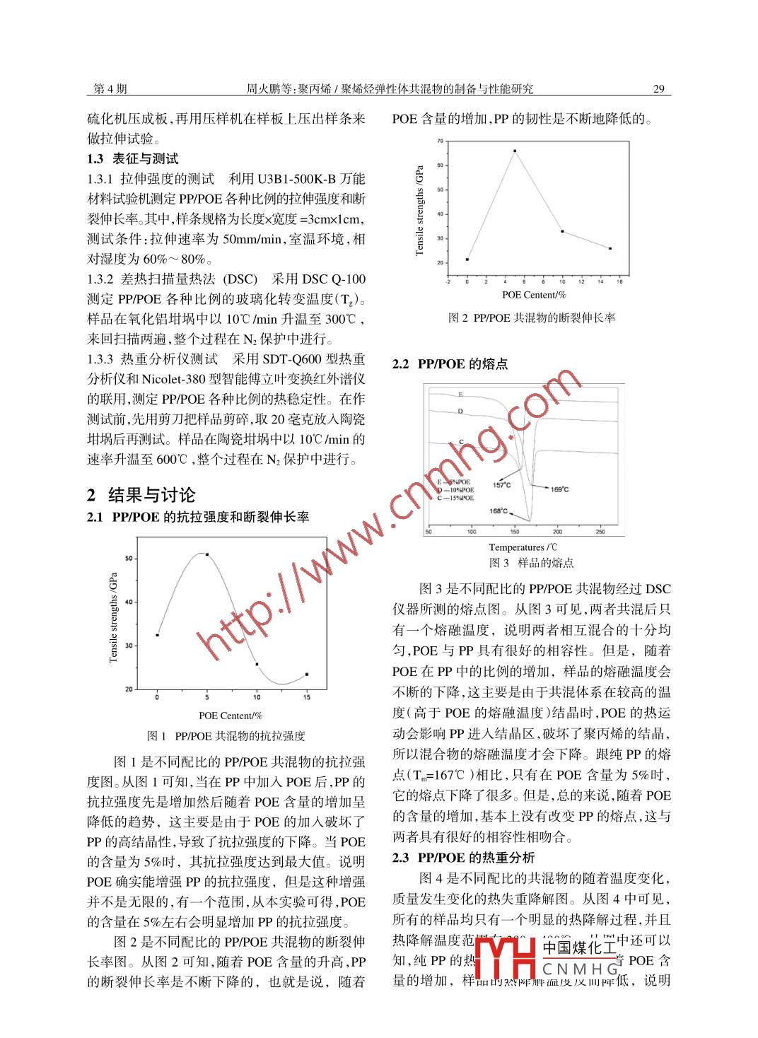第27卷第4期膠體與聚合物VoL 27 No 42009年12月Chinese Journal of Colloid polymerDec.2009聚丙烯/聚烯烴彈性體共混物的制備與性能研究周火鵬楊莉閆禮成周勤朱傳龍邱亮湖北大學材料科學與工程學院湖北武漢430062)摘要通過熔融共混法制備了一系列聚丙烯(P)聚烯烴彈性體(POE)共混物,采用熱重分析、示差掃描量熱分析和拉伸測試對所得樣品進行了熱性能及力學性能的表征。結(jié)果表明,隨著POE含量的增加,PP的抗拉強度和斷裂伸長率均呈現(xiàn)先增加后減小的趨勢。而當POE的含量低于5%時,樣品的熔融溫度明顯低于純PP的熔融溫度;而當其含量超過5%時,樣品的熔融溫度與純樣基本一致。另外,POE的引亼導(dǎo)致PP的熱降解溫降低關(guān)鍵詞聚丙烯;聚烯烴彈性體;熔融共混PP是由丙烯聚合而制得的一種熱塑性樹脂。示掃描量熱儀,美國TA公司;U3B1-500KB萬有等規(guī)物、無規(guī)物和間規(guī)物三種構(gòu)型,工業(yè)產(chǎn)品能材料試驗機;臺灣弘達儀器。以等規(guī)物為主要成分。聚丙烯也包括丙烯與少量1.2 PP/POE共混樣品的制備乙烯的共聚物在內(nèi)。通常為半透明無色固體,無稱取一定量的PP和POE,分別按照100%和臭無毒。由于結(jié)構(gòu)規(guī)整而高度結(jié)晶化,故熔點高0,95%和5%,9%和10%,85%和15%混合均勻,達167℃,耐熱,制品可用于蒸汽消毒是其突出優(yōu)具體比例見表1。點。密度0.90g/cm3,是最輕的通用塑料。耐腐蝕表1PP/POE的質(zhì)量配比抗張強度30MPa,在強度、剛性和透明性上,都比樣品編號POE聚乙烯好改性。缺點是耐低溫沖擊性差,較易老化,但可分別通過改性和添加抗氧劑予以克服10POE是一種飽和乙烯-辛烯共聚物。它的特點是共聚物序列分布均勻,分子量分布很窄,結(jié)晶度較混合均勻后加入雙螺杄式擠出機料斗,加熱低,與聚烯烴相容性好;玻璃化溫度非常低,最低擠出后,經(jīng)過水槽冷卻后牽引至SQ型塑料切粒者接近40℃,斷裂伸長率很大,適合作PP的增韌機切成顆粒,切粒機轉(zhuǎn)速一般設(shè)定在400R/min改性劑,改善PP的低溫沖擊韌性;沒有不飽和雙這個速度要和螺桿的轉(zhuǎn)速相匹配,速度過快使拉鍵,具有更高的熱穩(wěn)定性、耐候性;辛烯的柔軟鏈出的絲過細,從而使得擠出料不容易切斷甚至斷卷曲結(jié)構(gòu)和結(jié)晶的乙烯鏈作為物理交聯(lián)點,使它條;速度過慢,使擠出料條過粗而不易冷卻造粒具有優(yōu)異的韌性和良好的加工性;較強的剪切敏亦可能影響實驗過程的連續(xù)性感性和熔體強度,可實現(xiàn)髙擠岀,提高產(chǎn)量。本文其中擠出機機頭部分溫度稍低約為200℃,通過在PP中加入POE來增加PP的韌性4。其余各部分溫度依次為210℃,215℃,215℃,1實驗200℃。熔融接枝母粒的制備中,溫度過高容易導(dǎo)致PP的大量降解等問題,因此此時加工溫度要11實驗原料與儀器比較低,依次設(shè)定為:180℃,185℃,185℃,190℃,聚丙烯(PP),中國石油化工股份有限公司;乙180℃。并且螺桿的轉(zhuǎn)速略大,使其停留時間較烯/辛烯共聚物(POE),韓國LG公司。小。擠出機的螺桿轉(zhuǎn)速設(shè)定在90~100r/min,電流DFOB型分析天平,浙江省樂清市樂成電強度設(shè)定在13mA,給料螺桿速度為45R/min。經(jīng)器廠;6405y900雙螺桿擠出機,南京杰恩特;25過切粒機切粒后的樣品放入烘箱內(nèi)烘干,以除去型液壓平板硫化機,上?;C械四廠:CP25型造粒過程中帶r中國煤化工子用平板沖片機,上?;C械四廠;SDTQ900型熱重分析儀,美國 Thermal Analysis公司;DSCQ100差收稿日期:200YHCNMHG第4期周火鵬等:聚丙烯/聚烯烴彈性體共混物的制備與性能研究硫化機壓成板,再用壓樣機在樣板上壓出樣條來POE含量的增加,PP的韌性是不斷地降低的。做拉伸試驗1.3表征與測試1.3.1拉伸強度的測試利用U3B1-500K-B萬能材料試驗機測定 PP/POE各種比例的拉伸強度和斷裂伸長率。其中,樣條規(guī)格為長度x寬度=3cm×lcm,測試條件:拉伸速率為50mm/min,室溫環(huán)境,相對濕度為60%~80%。1.3.2差熱掃描量熱法(DSC)采用DSCQ100測定 PP/POE各種比例的玻璃化轉(zhuǎn)變溫度(T)。POE Centent/%0樣品在氧化鋁坩堝中以10℃/min升溫至300℃,圖2 PP/POE共混物的斷裂伸長率來回掃描兩遍,整個過程在N2保護中進行。133熱重分析儀測試采用SDTQ600型熱重22PP/POE的熔點分析儀和 Nicolet-380型智能傅立葉變換紅外譜儀的聯(lián)用,測定 PP/POE各種比例的熱穩(wěn)定性。在作測試前,先用剪刀把樣品剪碎,取20毫克放入陶瓷坩堝后再測試。樣品在陶瓷坩堝中以10℃/min的速率升溫至600℃,整個過程在N2保護中進行。2結(jié)果與討論21 PP/POF的抗拉強度和斷裂伸長率168°c圖3樣品的熔點圖3是不同配比的 PP/POE共混物經(jīng)過DSC儀器所測的熔點圖。從圖3可見,兩者共混后只有一個熔融溫度,說明兩者相互混合的十分均勻,POE與PP具有很好的相容性。但是,隨著POE在PP中的比例的增加,樣品的熔融溫度會不斷的下降,這主要是由于共混體系在較高的溫POE Centent/%o度(高于POE的熔融溫度)結(jié)晶時,POE的熱運圖1PP/POE共混物的抗拉強度動會影響PP進入結(jié)晶區(qū),破壞了聚丙烯的結(jié)晶,圖1是不同配比的 PP/POE共混物的抗拉強所以混合物的熔融溫度才會下降。跟純P的熔度圖。從圖1可知,當在P中加人POE后P的點(T=167℃)相比,只有在POE含量為5%時,抗拉強度先是增加然后隨著POE含量的增加呈它的熔點下降了很多。但是,總的來說,隨著POE降低的趨勢,這主要是由于POE的加入破壞了的含量的增加,