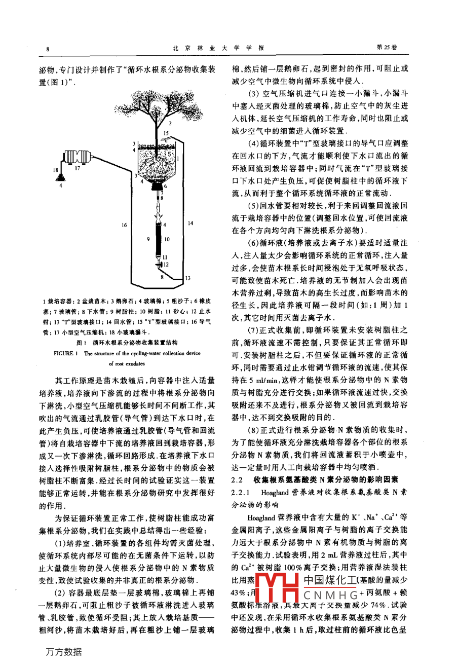 第25卷第6期北京林業(yè)大學學報Vol 25. No 600年11月JOURNAL OF BEIJING FORESTRY UNIVERSITY循環(huán)水根系分泌物收集技術(shù)的研究及應(yīng)用賈黎明馮菊芬文學軍孫焱北京林業(yè)大學資源與環(huán)境學院)(山東省濫博市園林管理處)摘要該文作者于200年設(shè)計并應(yīng)用循環(huán)水根系分泌物收集裝置,結(jié)合D061型樹脂柱收集了純栽和混栽條件下楊樹與刺槐氨基酸類N素根系分泌物,并對其物質(zhì)形態(tài)進行了初步研究結(jié)果表明:循環(huán)水根系分泌物收集裝置夠正常運轉(zhuǎn),真正實現(xiàn)了在現(xiàn)實栽培條件下無損根系、實時、連續(xù)、富集、定量、準確收集和研究根系分泌物僅僅7d時間即可收集到根系分泌物中的多種氨基酸,并達到可檢出的量精氨酸和甘氨酸是純栽刺槐根系分泌物中的主要氨基酸,占游離氨基酸總量的432%;而精氨酸和賴氨酸是純裁楊樹以及混裁苗木根系分泌物中的主要氨基酸循環(huán)水根系分泌物收集技術(shù)為根系分泌物的深入研究提供了方法上的保障關(guān)鍵詞根系分泌物,收集裝置,楊樹,刺槐,混交林,種間關(guān)系中圖分類號S71843Jia Liming; Feng Jufen; Wen Xuejun; Sun Yan. Cycling-water collection technique on root exudates andits application. Journal of Beiying Forestry University( 2003)25(6)6-10 [ Ch, 9 ref. School of Resourcesand Environment, Beijing For. Univ, 100083, P R ChinaAmino acids in nitrogen root exudates of pure and mixed planted black locust and poplar seedlings werecollected and identified by the designed cycling-water collection device of root exudates and Do61 ion-exchange-resin in this paper. It shows that: the cycling-water collection device of root exudates could be operatednormally. The certain amounts of root exudates are enriched in the device that makes the materials collectionsuccessful without damaging the roots in time and continuously as well. Only by geven days, many kinds ofamino acids in nitrogen oot exudates were collected and detected quantitatively. Arginine and glycin were themain kinds of amino acids in root exudates of pure planted black locust seedlings and reached 43. 2% in disgo-ative amino acids. Arginine and lysine were the main kinds of amino acids in root exudates of pure plantedpoplar seedlings and mixed planted poplar and black locust seedlings. It is concluded that the cycling-watercollection technique is much better than other methods to conduct the study on root exudatesKey words root exudates, collection device, poplar, black locust, mixed forest, interspecific relationship我國對混交群落樹種間關(guān)系的研究經(jīng)歷了約主導作用的是養(yǎng)分關(guān)系這種關(guān)系不僅表現(xiàn)為對土50年,從對樹種間關(guān)系現(xiàn)象的簡單描述逐步上升到壤的改良,而且也表現(xiàn)為樹種間N、P養(yǎng)分的互補轉(zhuǎn)對樹種間關(guān)系機理的深入研究上,取得了一大批研移,即通過根際微區(qū)楊樹可以轉(zhuǎn)移磷給刺槐而刺槐究成果.尤其是進入20世紀90年代,在國家自然科可將固定的氮轉(zhuǎn)移給楊樹2,這種轉(zhuǎn)移主要通過根學基金的多次重點資助下,對樹種間相互作用機制系的相互接觸來完成.本文則欲通過研究兩樹種的了解越來越深入,在化感作用、以養(yǎng)分關(guān)系為主的的根系分泌物組成,進一步探索兩樹種養(yǎng)分轉(zhuǎn)移的生理生態(tài)相互作用機制等多方面都取得了重要突物質(zhì)形態(tài),從而為揭示樹種間養(yǎng)分轉(zhuǎn)移的生態(tài)學意破這一時期,北京林業(yè)大學“混交林及樹種間相義奠定基礎(chǔ),并為今后的研究進行方法上的探索互作用機制”課題組以楊樹、刺槐混交林為模式群落對根系分泌物的研究是植物營養(yǎng)、化感作用、根對樹種間相互作用機制進行了深入研究.前期研究際微生態(tài)研究的重要內(nèi)容,受到國內(nèi)外的普遍重視發(fā)現(xiàn),在楊樹刺槐混交林樹種間復雜相互關(guān)系中起因為植物根分泌物不僅是根-土界面的潤濕劑、微2003-04-16收稿中國煤化工http://國家自然科學基金重點項目(39230280)和國家自然科學基金項目(39870643CNMHG第一作者:賈孳明,男,1968年生,博士,副教授主要研究方向:森林培育、城市林業(yè)電話:010-62338194E-mil:jm@b,,cm地址;10003北京林業(yè)大學資源與環(huán)境學院第6期賈黎明等:循環(huán)水根系分泌物收集技術(shù)的研究及應(yīng)用生物的能源物質(zhì),更重要的是植物營養(yǎng)效率基因型定期噴酒福爾馬林溶液滅菌;配制好的 Hoagland全差異的標記物及植物間相互作用的紐帶根系分泌背養(yǎng)液高溫高壓滅菌(溫度121℃,壓力0.1MPa條物的收集、分離和鑒定是一個國際性的難題尤其是件下,滅菌1個h);培養(yǎng)基質(zhì)處理和滅菌:將粗沙、如何能夠收集到足夠量不受微生物污染的根系原始鵝卵石、玻璃棉放在稀釋濃度為01%~02%的鹽分泌物更為困難目前根系分泌物的收集方法主要酸中浸泡一晝夜,第2天用自來水沖洗至pH值為有出土根系淋洗法、營養(yǎng)液培養(yǎng)法、沙培法、瓊脂固7,然后將它們高溫高壓滅菌(條件同上).自然冷卻定定位培養(yǎng)收集法等根系淋洗法不可取,因是后作為栽培基質(zhì);將盆栽容器、乳膠管玻璃器皿浸泡將根系挖出后淋洗,根系已受損傷收集的根系分泌于稀釋濃度為015%福爾馬林溶液中1晝夜滅菌物中更多的是根系本身的內(nèi)含物和傷流液;營養(yǎng)液1.4收集根系分泌物中氨基酸類N素物質(zhì)樹脂和培養(yǎng)法則使根系基本處于