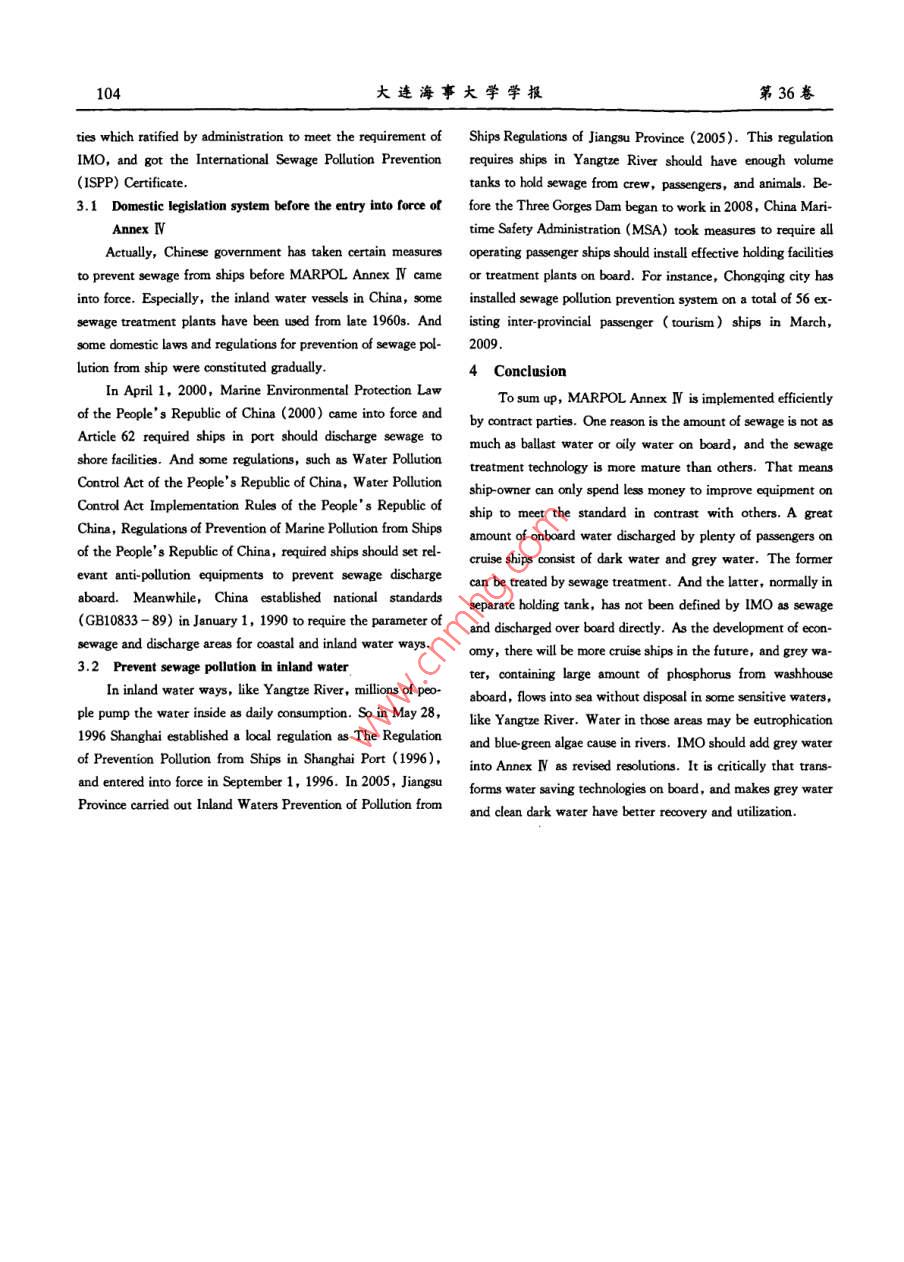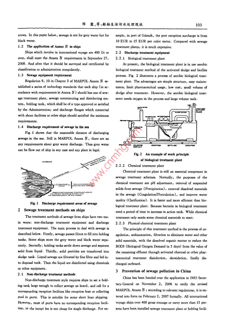 第36卷大連海事大學學報vL.362010年6月Journal of Dalian Maritime UniversityJun.2010文章編號:1006-7736(2010)S1010203船舶生活污水處理現(xiàn)狀鄧露,李萌(江陰海事局a辦公室;b.VTS中心,江蘇江陰214431)摘要:通過對 MARPOL AnnexⅣ適用船舶、處理設(shè)備和排放 stituted International Convention for the Prevention of pollution要求等方面的概述對現(xiàn)階段船舶主要采取的幾種生活污水 from Ships, as modified by the Protocol of 1978 relating thereto處理方式和我國船舶生活污水處理及排放的國內(nèi)立法等方( MARPOL73/78), the Protocol amending them in Annex w of面進行介紹,為IMO在船舶生活污水處理方面提出建議,Regulations for the Prevention of Pollution by Sewage from關(guān)鍵詞:船舶;生活污水;處理現(xiàn)狀Ships. As the technology development, more and more countries中圖分類號:U664.92;X327文獻標志碼:Awith the conditions of entry into force of this annex. UntilOverview of ship sewage treatment statusMarch 13, 2000 Environmental Council in IMO adoptedMARPOL Annex I by the MEPC. 88(44)73/78, acceleratedDENG Lu, LI Mengentry into force of this annex. Finally, in September 26, 2002(a. General office: b. VTS center, Jiangyin MaritimeNorway accepted this annex, and the total reached 88 countriesSafety Administration, Jiangyin 214431, China;the total tonnage of the fleet meet 51% all over the world. Ac-cording to MAROL73/78 Article 15, Annex I came into forceAbstract: This paper mainly describes requirements of sewage in September 27, 2003. Then, MARPOL Annex N became atreatment on ships, equipment and discharge requirement fromthe aspects of MARPOL Annex N and introduces both severalompulsory annex. This paper mainly describes requirements ofsewage onboard treatment ways and legislative drafts in domestisewage treatment on ships from the aspects of MARPOL Anneships treatment of sewage disposal and discharge standardN, the main principle andLast, there are some recommendations for IMO in sewage trboard, and an overview of sewage treatment in China. At lastment on boardhere are some conclusions and recommendations for IMoKey words: ship; sewage; treatment status1 Requirements of MARPOL Annex i to sewage1.1 The definition of sewage by Annex N0 IntroductionMARPOL 73/78 Annex N regulation 1 of chapter 1 deNowadays, as the development of economic globalizationfines"Sewage"as: drainage and other wastes from any form oftoilets and urinals; drainage from medical premises( dispensaryserious pollution to marine environment at the same timesick bay, etc. )via wash basins, wash tubs and scuppers locatedage pollution problems from ships attracted people's attention in such premises: drainage from spaces containing living angradually. Sewage onboard which contains a lot of pathogens mab; other waste waters when mixed with the drainages de-and bacteria from washrooms and toilets flow into sea directlfined abovemay have great damage to people who have activities in theFrom the definition of Annex N, sewage on board shipnearest sea, or cause the eutrophication of water bodies, and mainly comes from the daily lives of the crew drainage.Fromlead to a sharp increase in plankton that may make a largethe definition, waste waters on board from different sources areber of fish dead or relocate to other places. How to reduce sew. divided into two kinds, one is black water, mainly from bath-age discharge from ships is a hot issue to shipping industry for room, clinic, or living place of live animals; another is grey wa-ter, which includes waste water and waste from the kitchenIn 1973, International Maritime Organization(IMO)con- laundry room, basins and bathrooms in accommodation of收稿日期:201003-24作者簡介:鄧露(1983-),男,重慶大足人,助理工程師,Emal:denglu@163.com鄧露,等:船舶生活污水處理現(xiàn)狀103crews. In this paper below, sewage is not for grey water but for ample, in port of Gdansk, the port reception surcharge is fromblack water10 EUR to 15 EUR per cubic meter. Compared with sewage1.2 The application of Annex l to shipstreatment plants, it is much expensiveShips which involve in international voyage are 400 Gt or 2.2 Discharge treatment equipmenover, shall meet the Annex N requirements in September 27, 2.2.1 Biological treatment plant2008. And after that it should be surveyed and certificated byAt present, the biological treatment plant is in use aerobicclassification or administration compulsorilybiological treatment method of the activated sludge and biofilm1.3 Sewage equipment reqnirementprocess. Fig. 2 illustrates a process of aerobic biological treat-Regulation 9, 10 in Chapter 3 of MARPOL Annex N es- ment plant. The advantages are simple structure, easy mainte-tablished a series of technology standards that each ship (in ac- nance, limit pharmaceutical usage, low cost, small volume ofcordance with requirements in Annex N)should has one of sew. sludge after treatment. However, the aerobic biological treat-age treatment plant, sewage comminuting and disinfecting sys- ment needs oxygen in the process and large volume tanktem, holding tank, which shall be of a type approved or satisfiedby the administration; and discharge flanges which connectedith shore facilities or other ships should satisfied the minimum1.4 Discharge requirement of sewage in the seFig. 1 shows that the reasonable distance of dischargingrage in the sea. Still in MARPOL Annex I, there are nony requirements about grey water discharge. Thus grey watercan be flow out of shipcase and any place in legalFig. 2 An example of work principleOCEAN2.2.2 Chemical treatment plantChemical treatment plant is still an essential component invage treatment schemes. Normally, the purposes of thechemical treatment are pH adjustment, removal of suspendedsolids from sewage( Precipitation), removal dissolved materialsin the sewage( Coagulation/ Flocculation), and improve waterquality(Clarification