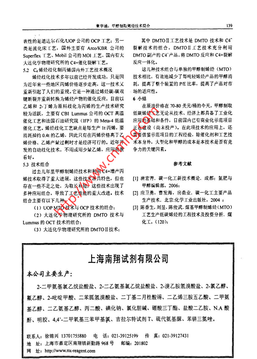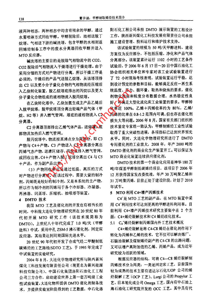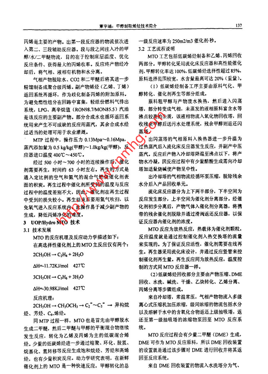 化學工程與裝備Eouiment2010年第3期136Chenical Engineering & Equipo ent2010年3月甲醇制取烯烴技術簡介董宇涵(中國神華煤制油化工有限公司北京工程分公司,北京10011)摘要: 我國富煤少油,石油供需矛盾已經十分突出,為應對目前高價位石油時代的到來, MTP. MTO成為最有希望替代石腦油路線制烯烴的工藝。這-技術的廣泛運用在我國有著重要的現實意義。關鍵詞: MTP; MTO;技術1甲醇制取烯烴技術概述100t/h級商業(yè)化MTP生產系統(tǒng)的能力,甲 醇制備甲醇制取烯烴主要有MTP、MTO.烯烴的反應器通常有固定床和流化床兩類結構形MTP (Methanol-to-Propylene)是以煤或天然氣式.甲醇轉化烯烴的反應為強放熱反應,因此流化為原料經由甲醇制丙烯的工藝過程,床反應器有自身的優(yōu)勢,例如,較容易地將多余熱MTO(Methanol-to-Olefin)則是- 一個廣義的概念, 產量移出反應器,從而實現對床層溫度的均衡控制。物通常為乙烯、丙烯等低碳烯烴的混合物。為應對但缺點也十分突出,如規(guī)模放大較困難、催化劑的目前高價位石油時代的來臨,MTP、MTO成為最穩(wěn)定性(耐磨性、壽命)要求高等。另外,流化床有希望替代石腦油路線制烯烴的工藝。反應器中催化劑的失活速率高,催化劑需要持續(xù)再MTP、MTO反應歷程通常認為可分成三個步生。尤其是,再生溫度比反應溫度高,因而對催化驟:劑的壽命構成嚴重影響。(1)甲醇首先脫掉-分子水生成二甲醚,甲對于固定床反應器(特指絕熱操作),其溫度的醇和二甲醚迅速形成平衡混合物.甲醇/二甲醚分子控制要比流化床反應器困難些,通常,為了限制絕與分子篩上酸性位作用生成甲氧基。熱床層溫度的升高,要將原料和蒸汽分配在多個反(2)甲氧基中一個C-H質子化生成C-H*,與應管中。固定床反應器的優(yōu)勢在于:較容易地放大甲醇分子中-OH-作用形成氫鍵,然后生成已基氧反應器的生產規(guī)模、顯著降低投資,由于停留時間錯,進而生成C=C鍵.較統(tǒng)- -,可以明顯提高產物的選擇性。另外,Lurgji(3) C=C鍵繼續(xù)發(fā)生鏈增長生成(CH2) 。選用的選擇性非常高的固定床催化劑(沸石)已在反應過程以分子篩作催化劑時,產物分布比較市場上常規(guī)出售,這種催化劑的結炭率非常低,丙簡單,以C2~C4 (特別是乙烯、丙烯)為主. MTP、.烷和其它副產物生成量也極少,這些特點可使下游MTO過程的關鍵技術是催化劑,由于反應過程中的丙烯凈化系統(tǒng)簡單化。有大量的水存在,且催化劑運行中需要在較高溫度Lungi MTP是- -種建 立在Lungi專門固定床管下頻繁再生燒炭,因而催化劑的熱穩(wěn)定性及水熱穩(wěn)殼式反應器及與之相配的、性能優(yōu)越的催化劑基礎,定性是影響化學壽命的決定因素。之.上的專利技術。神華寧煤52萬噸煤基烯烴項目2 Lurgi MTP技術采用的就是Lungi MTP技術,項目預計于2010年2.1技術發(fā)展投產。Lurgi公司的MTP專利技術先后經過0.3kg/h2.2工藝流程說明實驗室單管反應器、1.2kg/h連續(xù)小試裝置及l(fā)5kgh從甲醇生產線米的粗甲醇進入預反應器,先合連續(xù)中試裝置等三個發(fā)展階段,完成了8000 小時成二甲醚和水,該反應的轉化率兒乎達到熱力學平催化劑壽命試驗,打通了整套工藝,取得中試裝置衡程度。甲醇/水/二甲醚物流繼續(xù)進入三段反應器至生產裝置的全部放大參數,目前已具備開發(fā)的第- -段反應器,甲醇/二甲醚的轉化率達到99%,董字涵:甲醇制取烯烴技術簡介137丙烯是主要的產物。出第一段反應器的物流依次進一級反應速率為250m2/m3催化劑秒。入第二、三段輔助反應器。段與段之間注入冷的甲3.2工藝流程說明醇/水/二甲醚物流,目的在于控制床層溫度、優(yōu)化MTO工藝包括低碳烯烴制備和乙烯、丙烯回收反應條件、獲得最大的丙烯收率。反應終產物經冷兩部分。甲醇轉化采用流化床反應器和高性能催化卻后,將氣相、液相有機物和水分離。劑,甲醇轉化率達100%,低碳烯烴選擇性超過85%,氣相產物脫除水、cO2和二甲醚后將其進一步原料選抒范圍較寬,水含量最高可達20% (重量)。精餾制備成聚合級丙烯。副產物烯烴(乙烯、丁烯)(1)低碳烯烴制備工序主要由原料氣化、甲返回系統(tǒng)再循環(huán),作為歧化制備丙烯的附加原料。醇轉化、催化劑再生等部分組成。為避免惰性組分在回路中富集,輕組份燃料氣排出原料粗甲醇與產物廢水換熱,然后進入閃蒸系統(tǒng),LPG、高辛烷值(RON98.7MON85.5)汽油塔,部分轉變成氣相,未蒸發(fā)的液相原料富含水等是該反應的主要副產物。部分合成水也循環(huán)返回系沸點較高的雜質,該液相物流入氧化物回收塔,回統(tǒng)用來產生不可或缺的反應用蒸汽,其余合成水經收殘余甲醇后送污水處理系統(tǒng),殘余甲醇則返還閃過適當的處理可用于農業(yè)灌溉。蒸塔。MTP過程中,操作壓力0.13Mpa~0.16Mpa,出閃蒸塔的氣相原料入換熱器進一步 升溫為蒸汽添加量為0.5 kg/kg(甲醇)~ 1.0kgkg(甲醇),反過熱蒸汽后入流化床反應器發(fā)生反應,并副產中壓應器進口溫度400C ~450C.蒸汽。反應后產物入冷卻塔降溫至沸點以下,將產經過500小時~ 700小時的連續(xù)操作后,催化物水冷凝。因反應過程中有少量酷酸生成需向冷卻劑需要再生,時間約63小時左右。再生的方式是塔加適最燒堿使產物呈中性。通入定比例的空氣和氮氣的混合氣燃燒催化劑表出冷卻塔的氣相物流經循環(huán)泵壓縮,脫除殘余面的積炭。再生過程中催化劑所受到